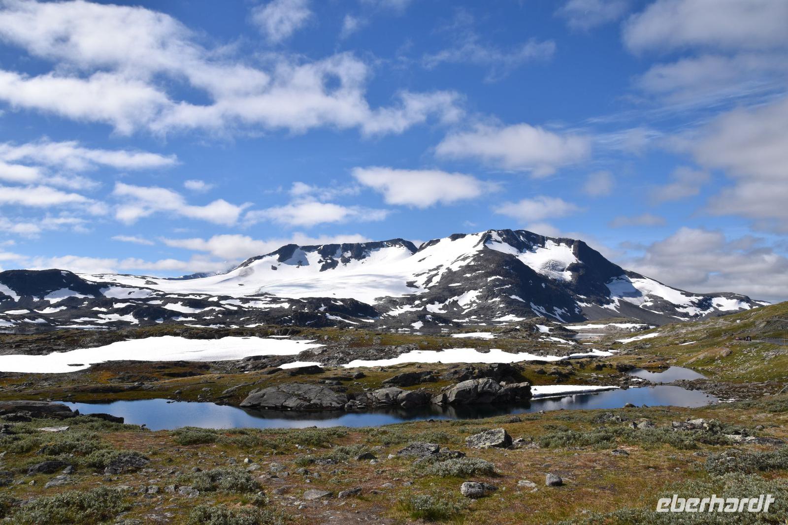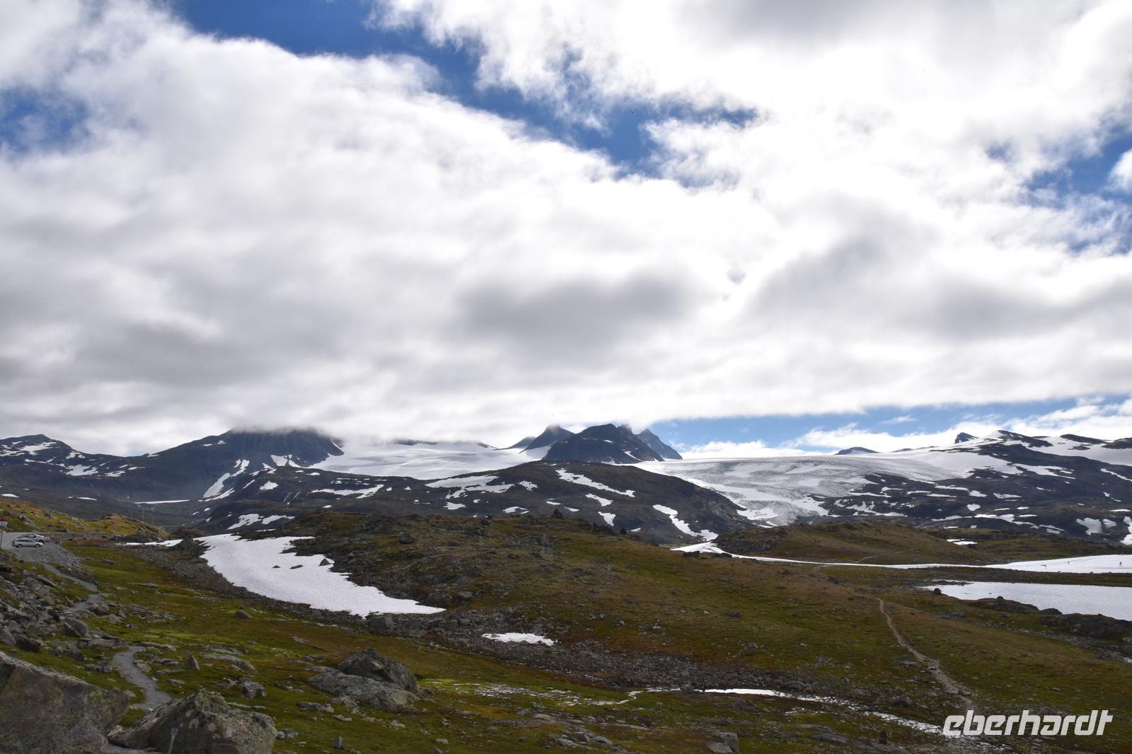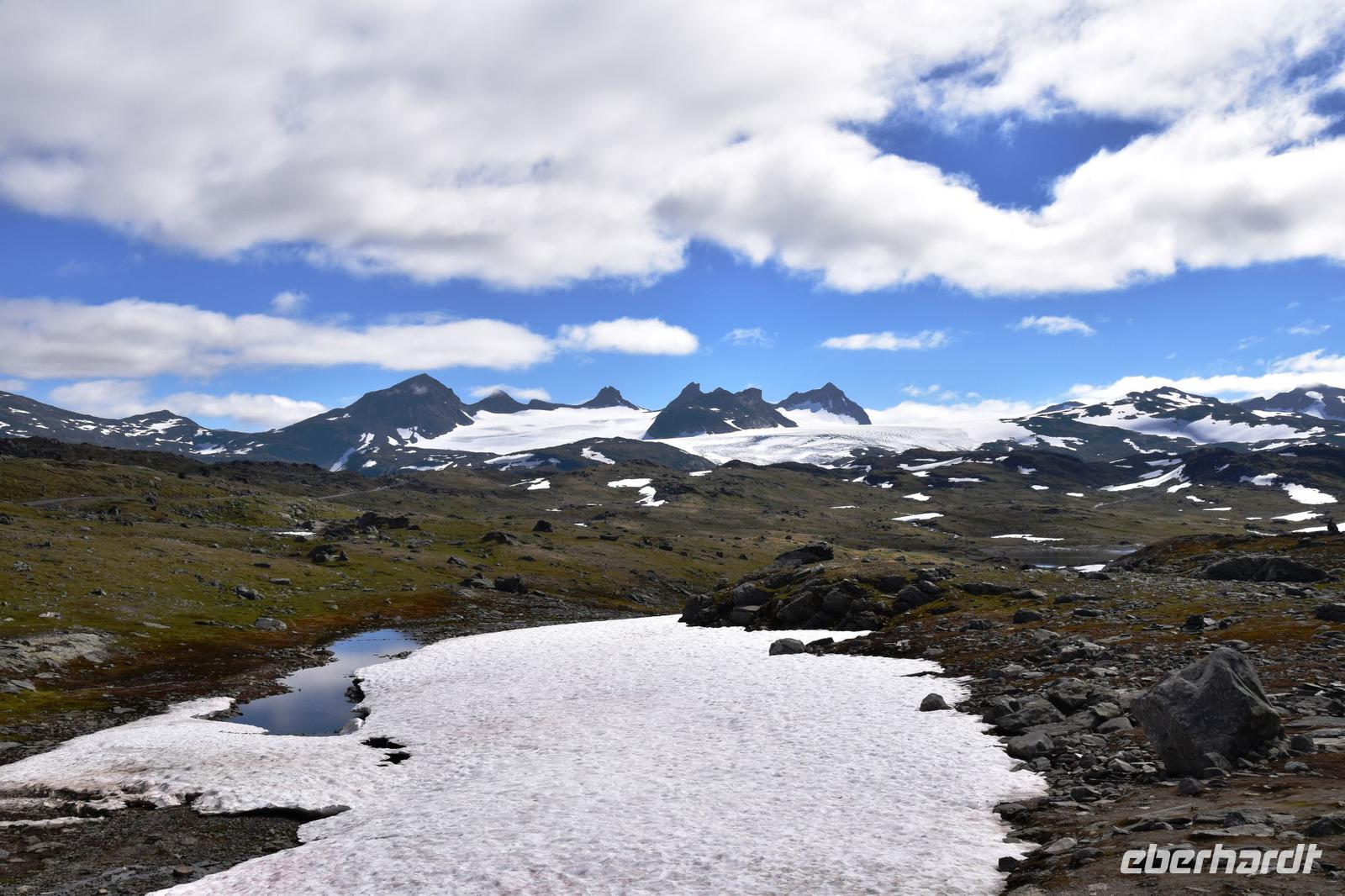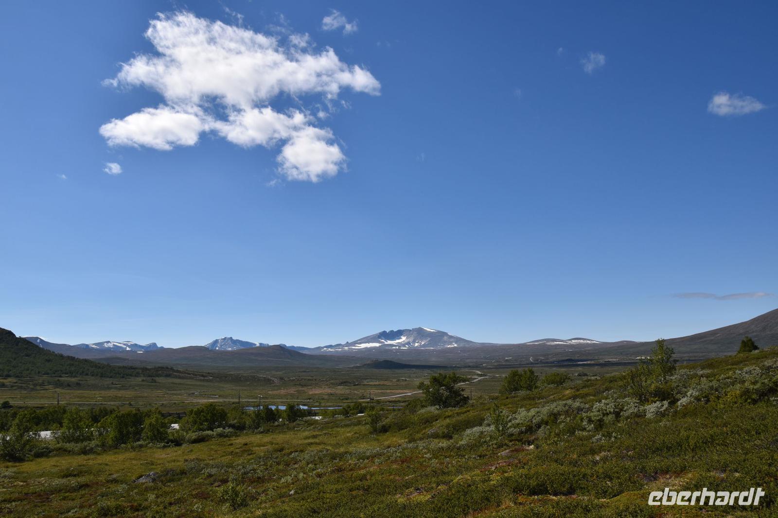 Oben, an einer Aussicht in den Weiten der Harddangervidda, machen wir nochmals Halt und schauen über diese tundraähnliche Landschaft zu den Gletscherbergen im Norden.