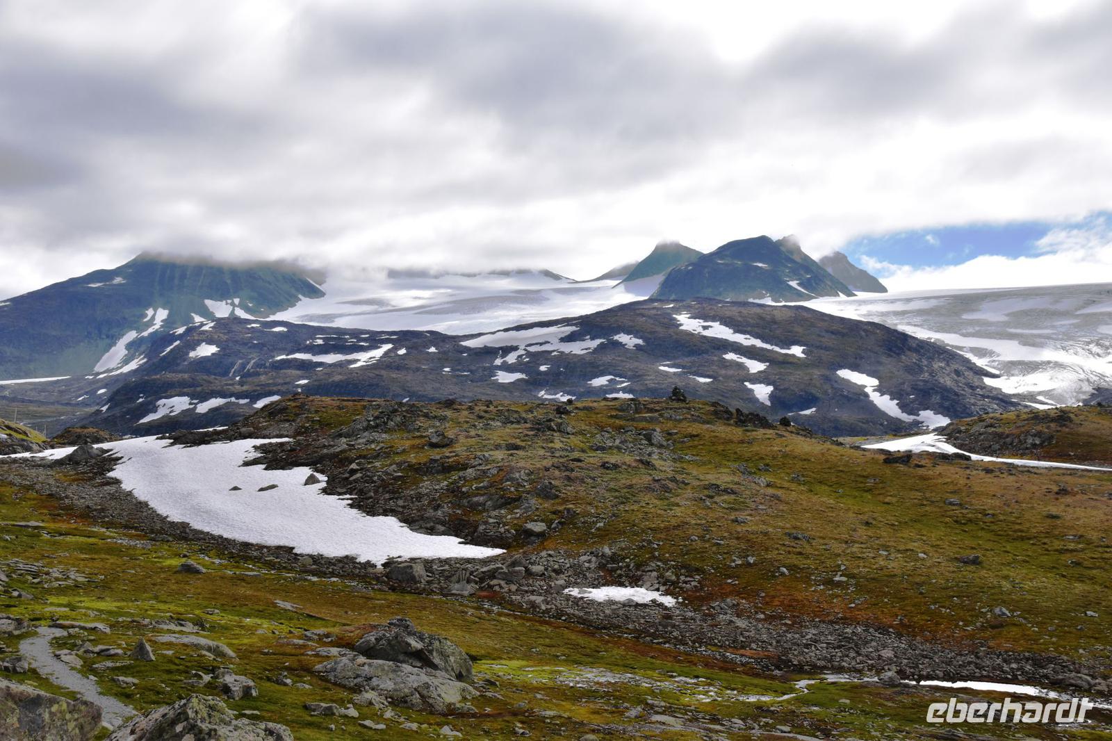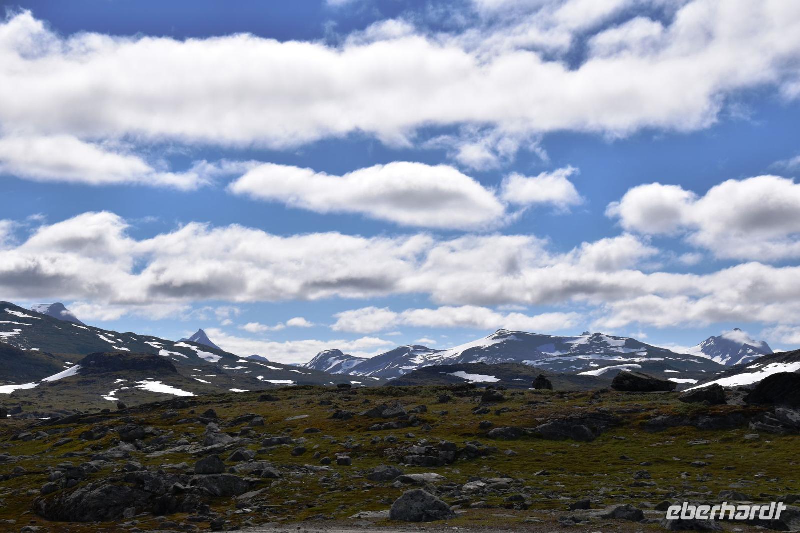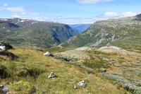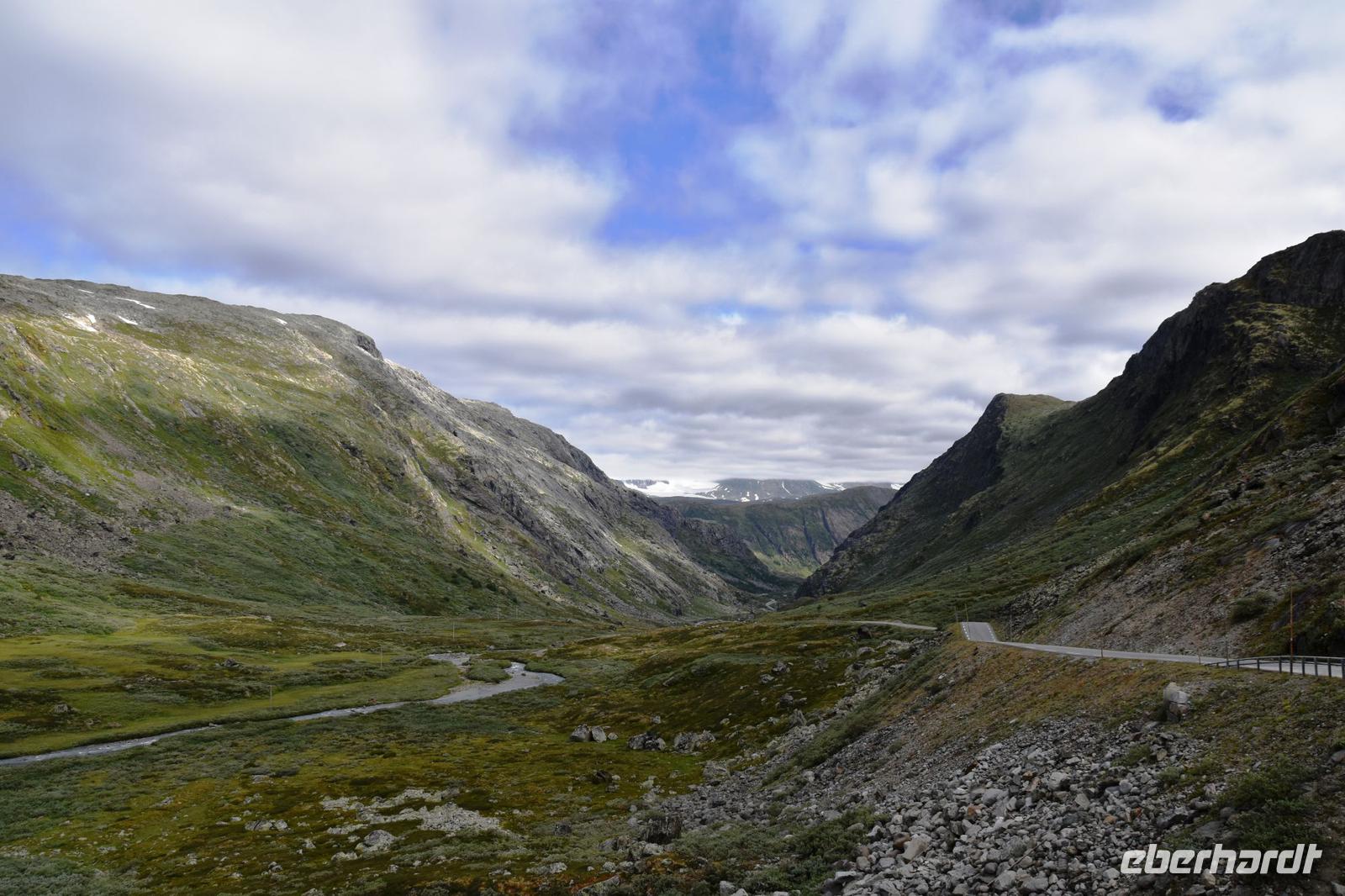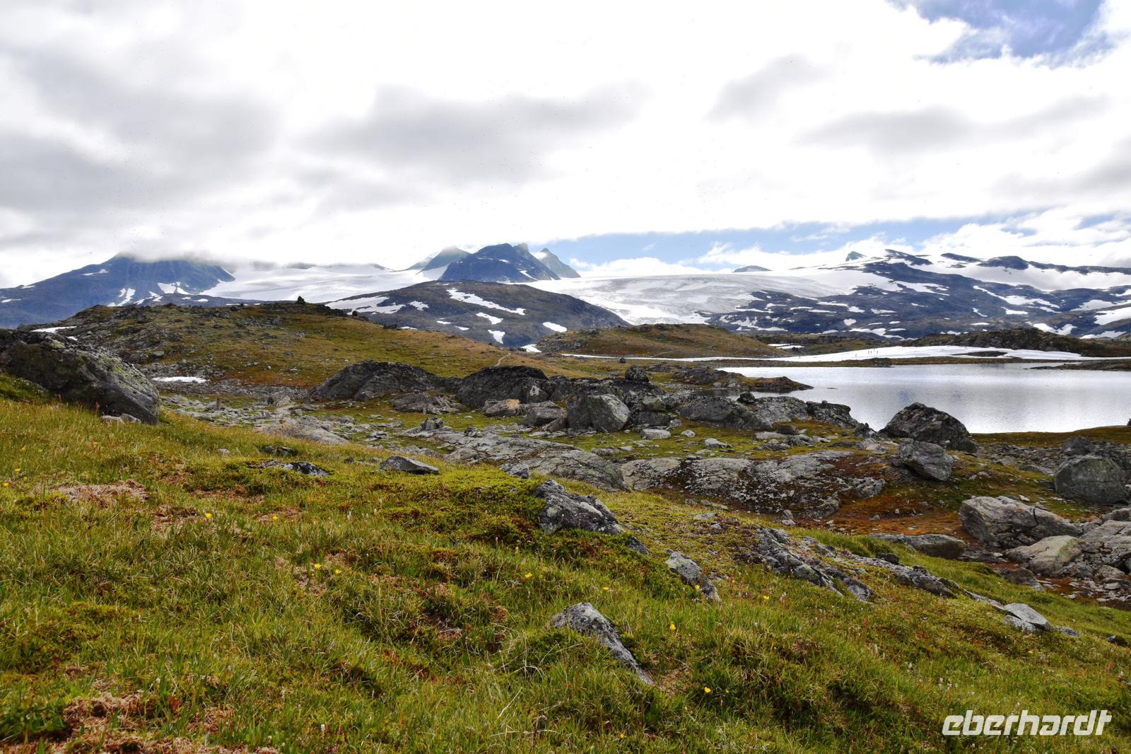 Oben, an einer Aussicht in den Weiten der Harddangervidda, machen wir nochmals Halt und schauen über diese tundraähnliche Landschaft zu den Gletscherbergen im Norden.