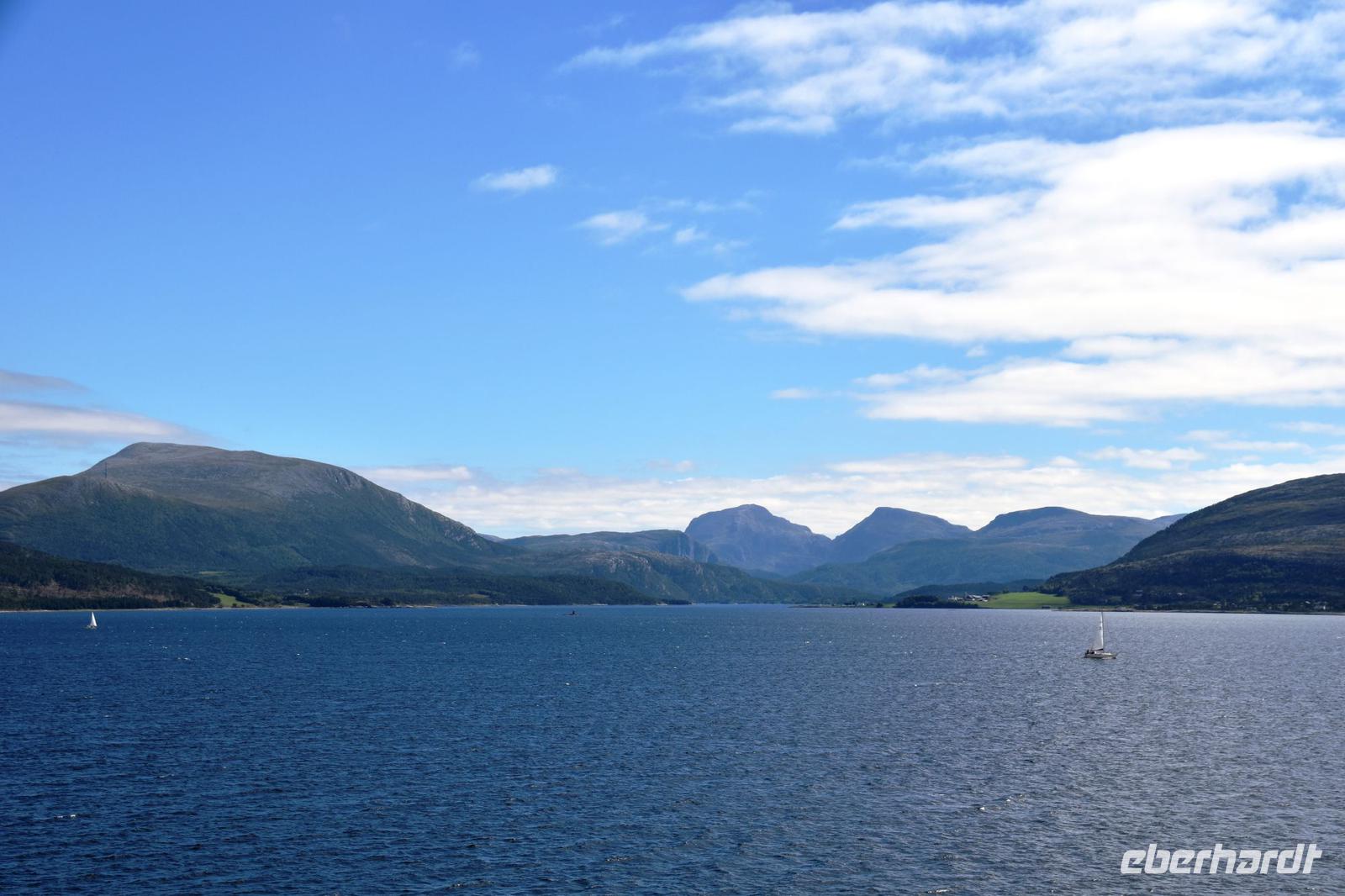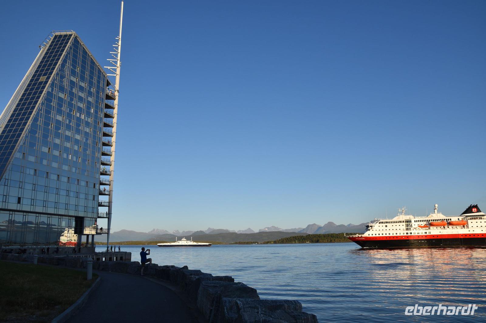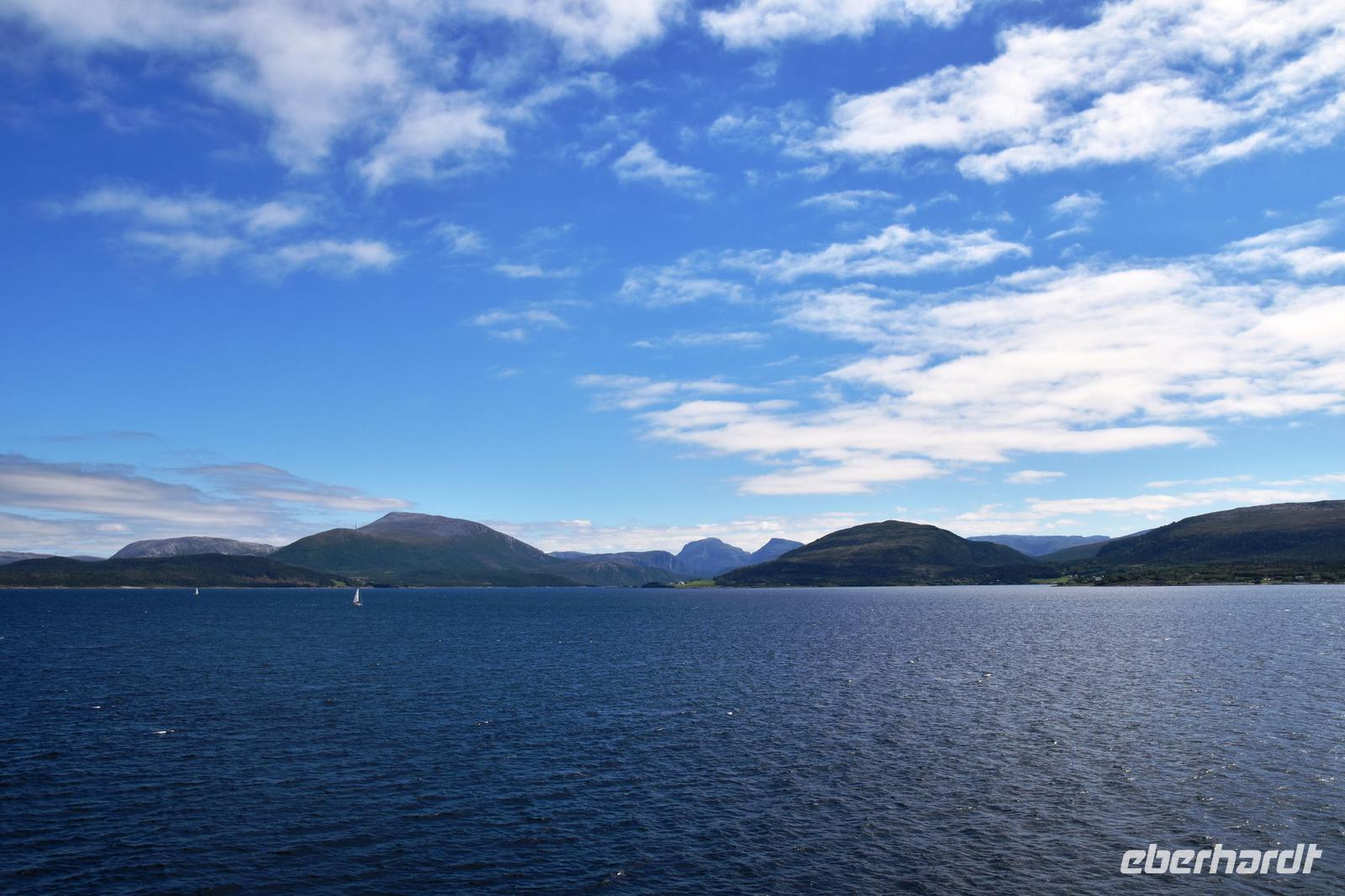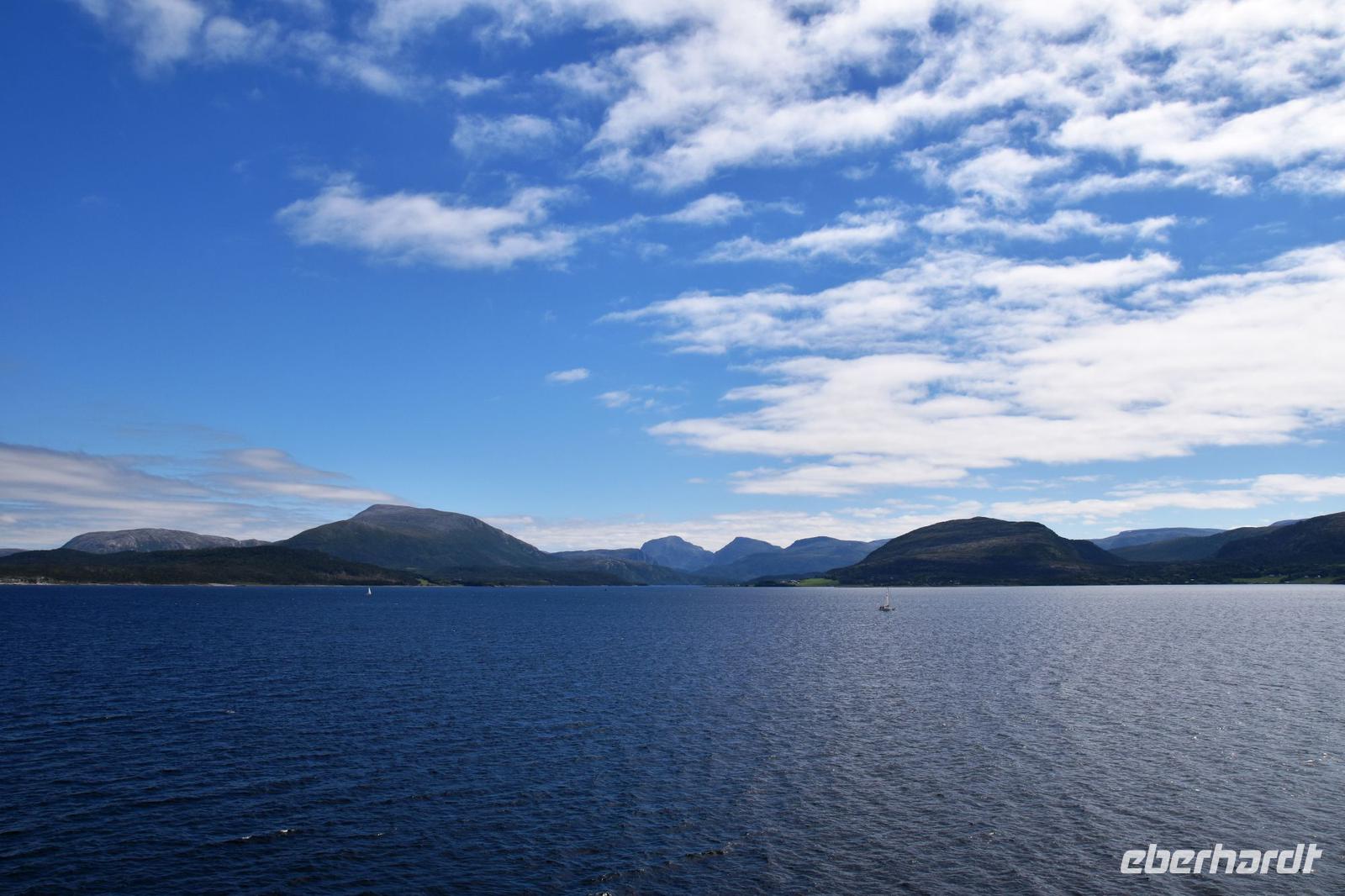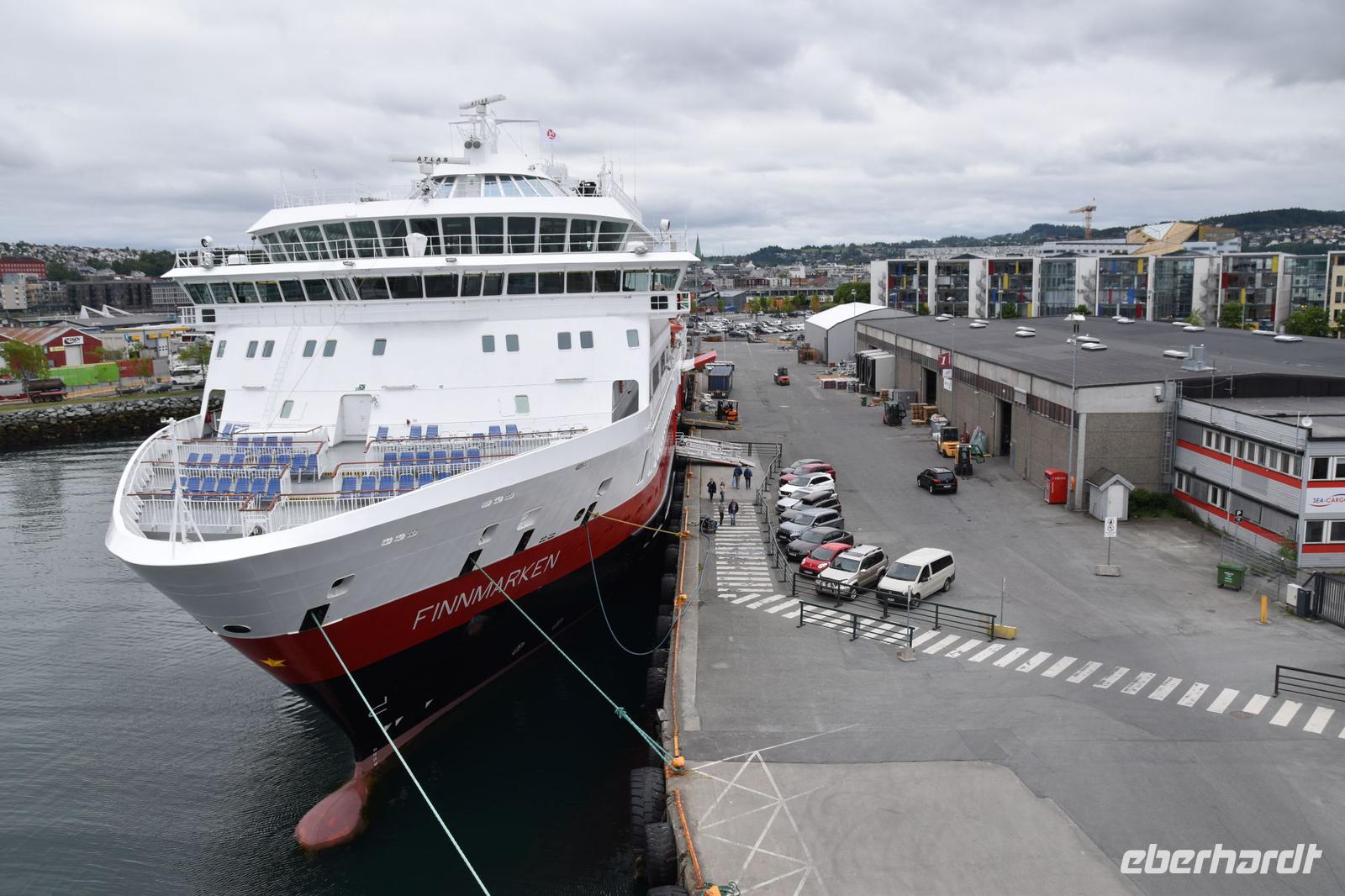 Wieder schönes Wetter, wenn auch etwas mehr Wolken und wir fahren nach dem Frühstück zum Hafen der Stadt. Hier am Hurtigruten-Kai gehen wir an Bord der MS "Richard With", um mit ihr über den Trondheimfjord und durch die Trondheimleia nach Kristiansund überzusetzen.
