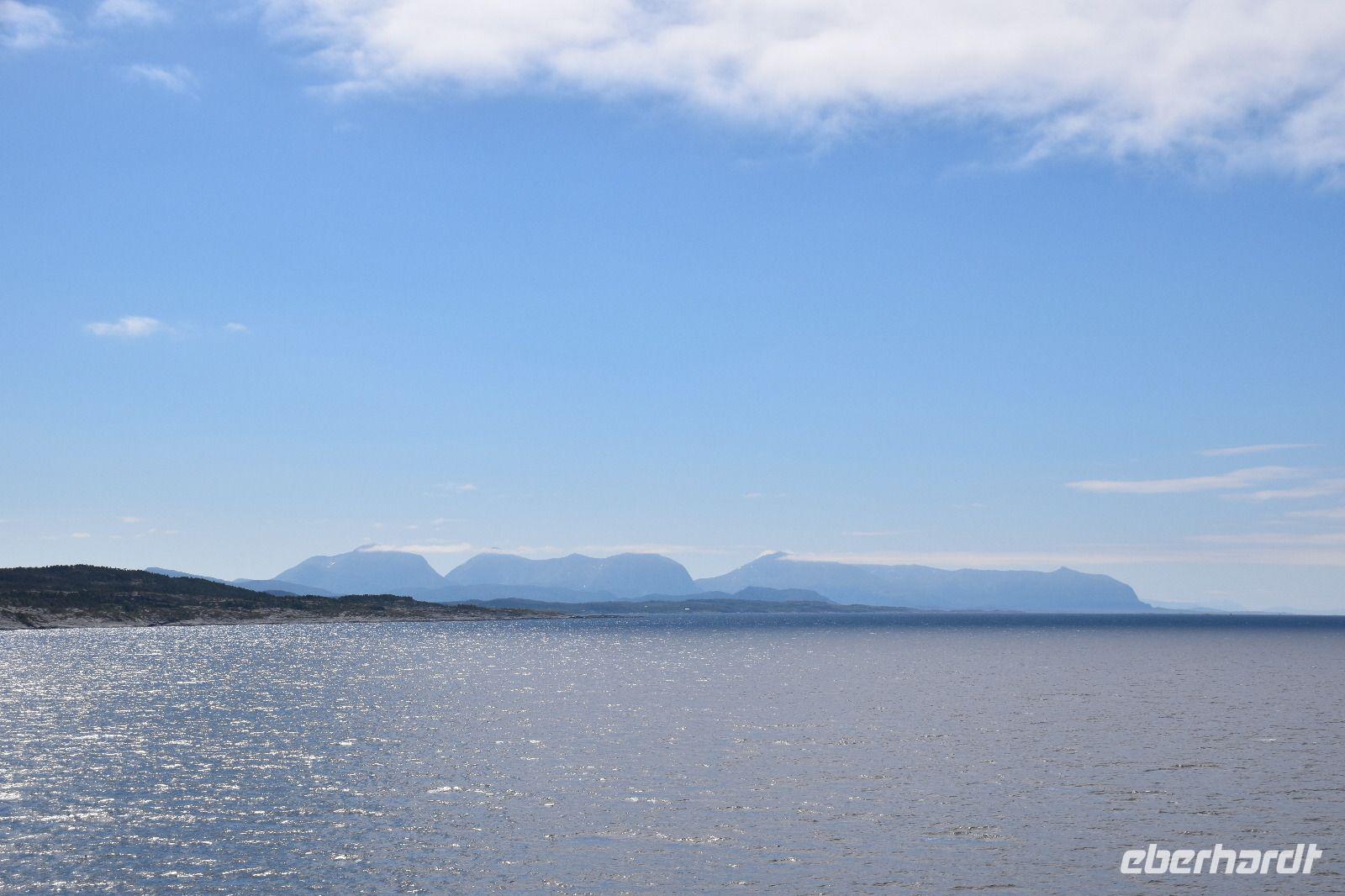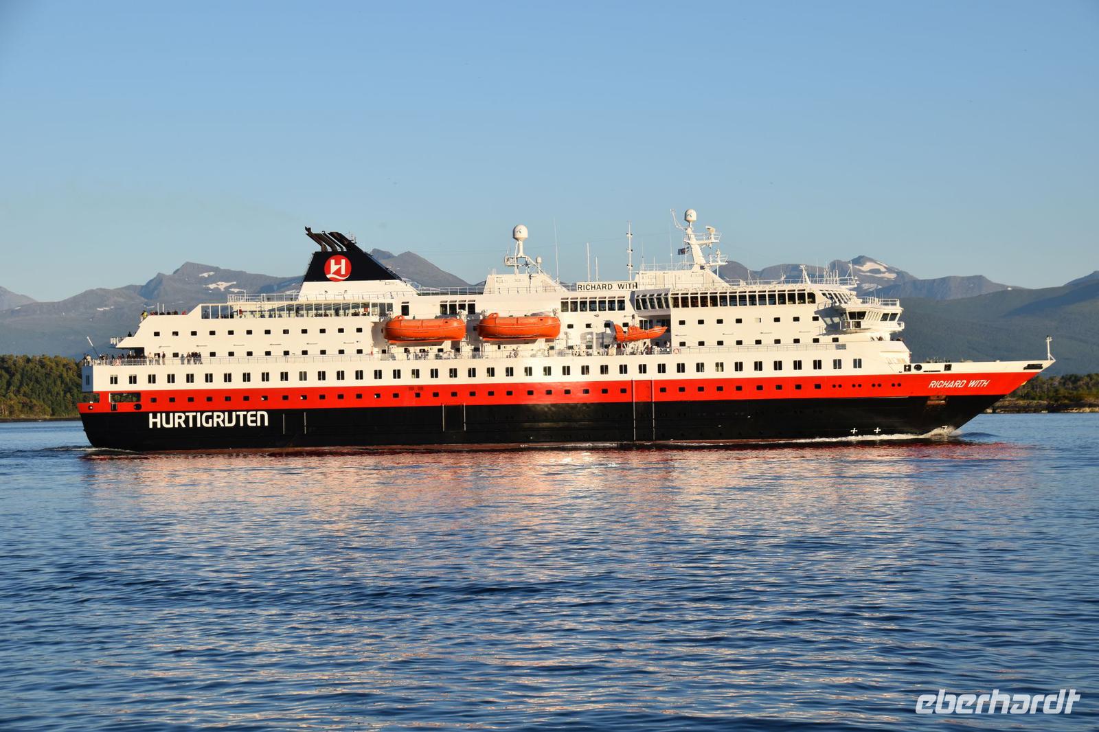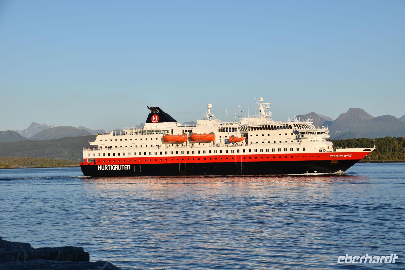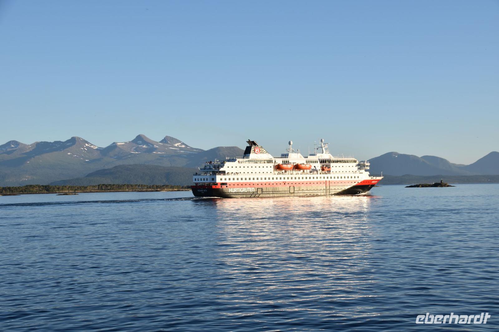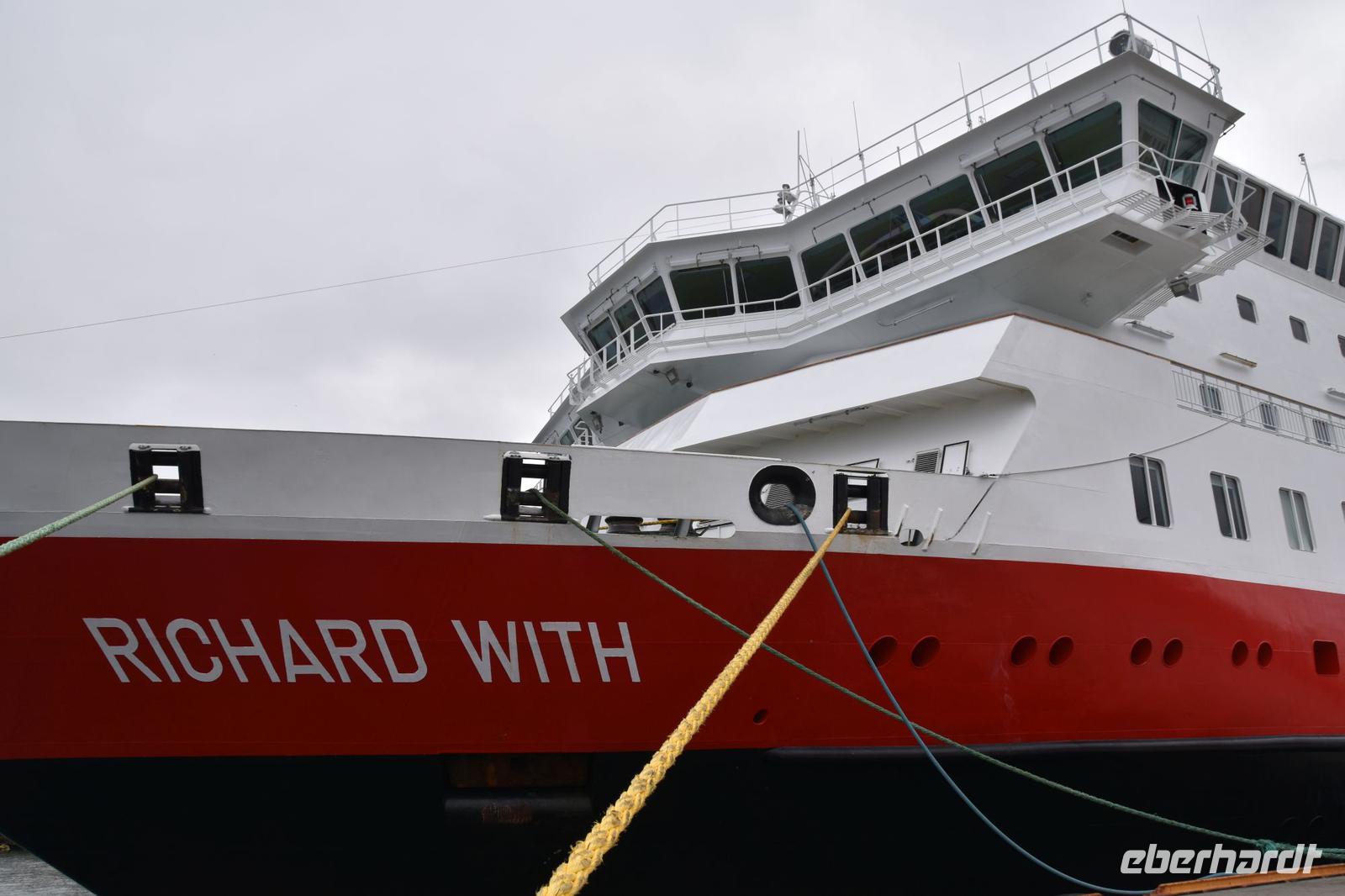 Wieder schönes Wetter, wenn auch etwas mehr Wolken und wir fahren nach dem Frühstück zum Hafen der Stadt. Hier am Hurtigruten-Kai gehen wir an Bord der MS "Richard With", um mit ihr über den Trondheimfjord und durch die Trondheimleia nach Kristiansund überzusetzen.