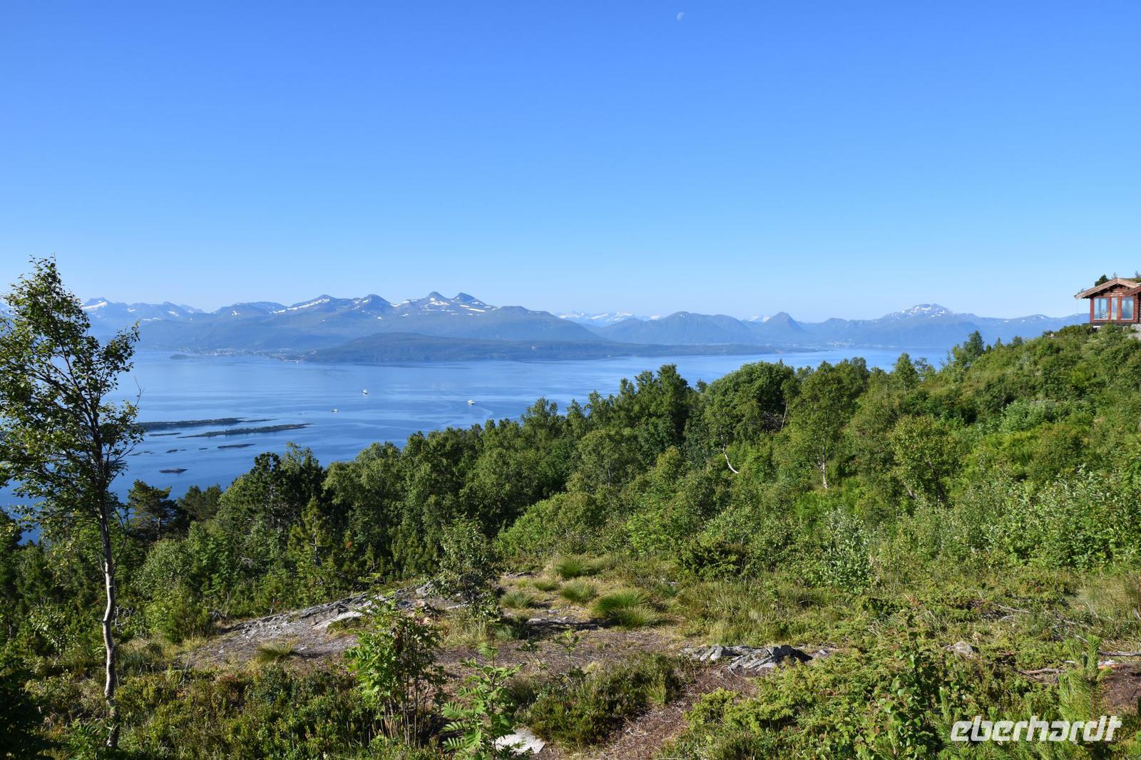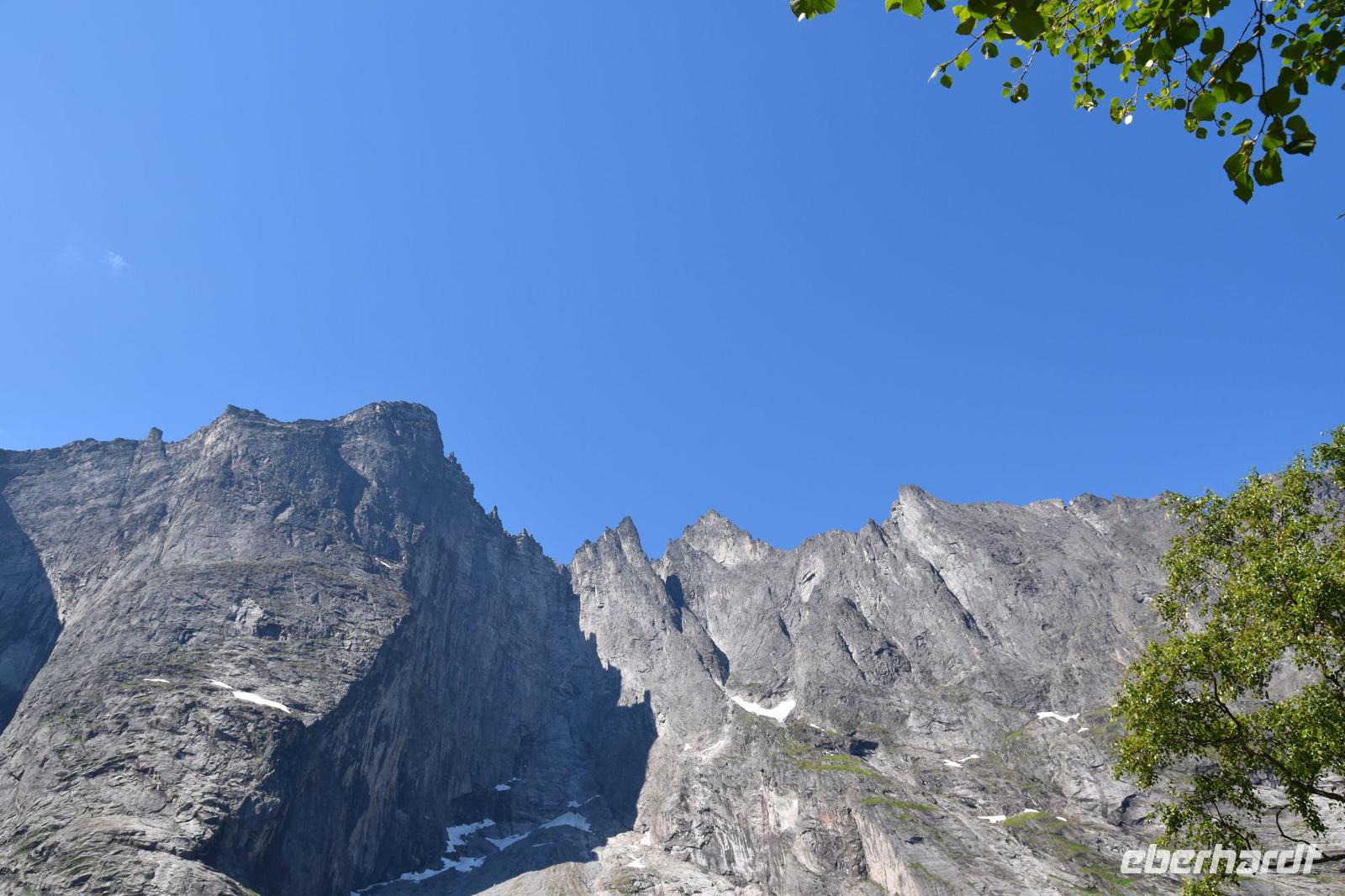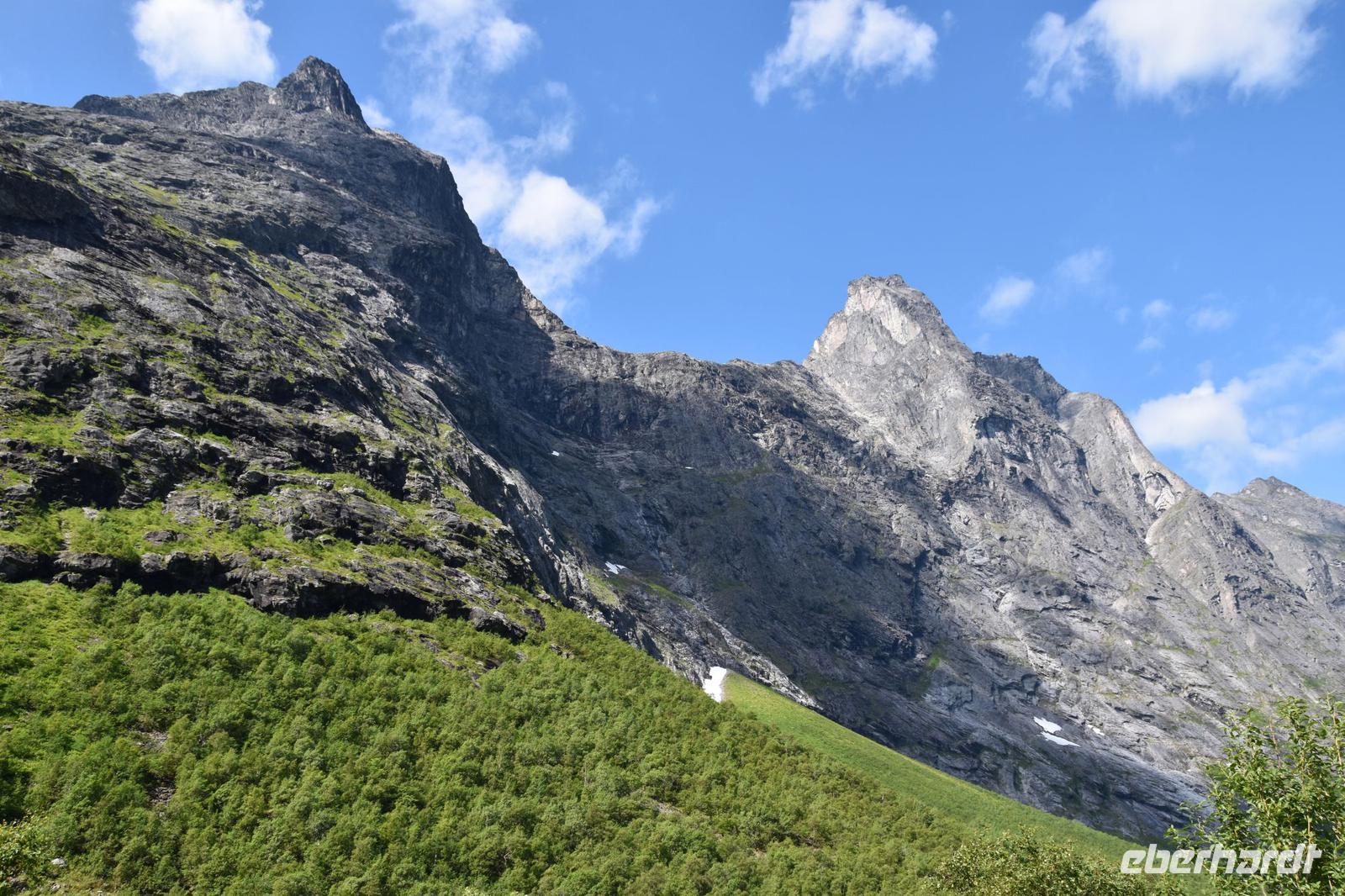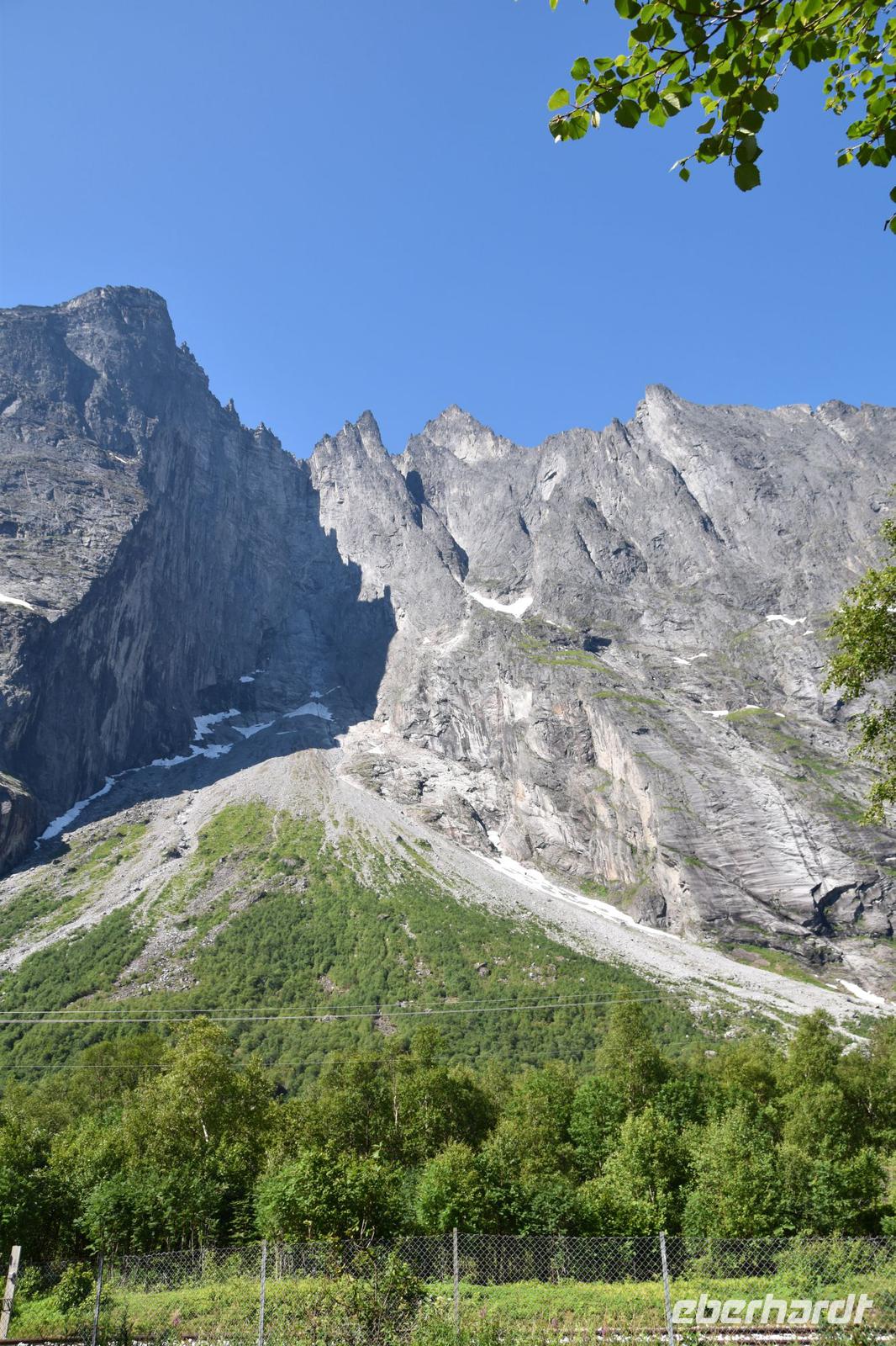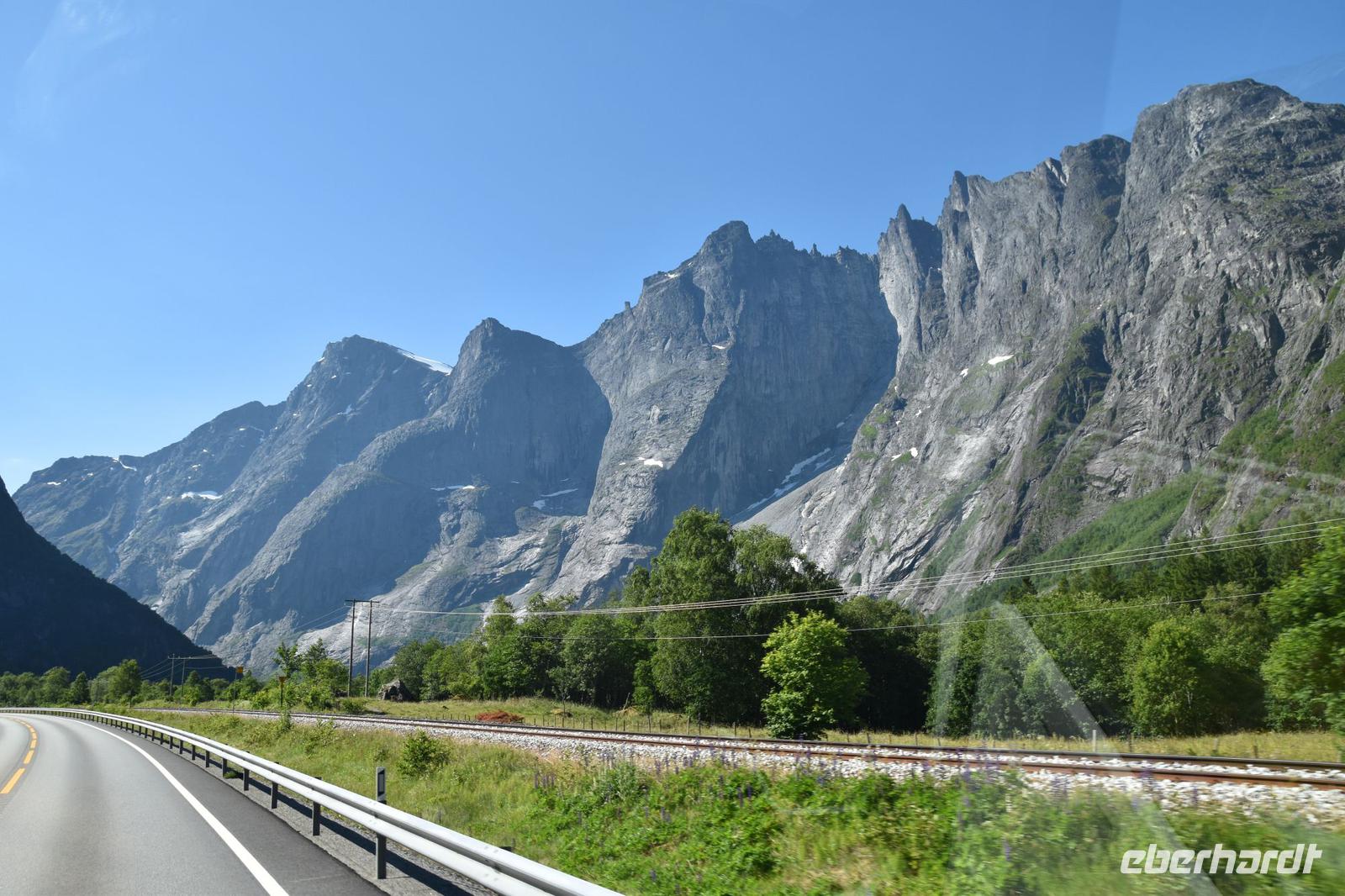 Erstes Ziel am Morgen die Auffahrt und der Aufenthalt auf dem Aussichtsberg Varden, oberhalb von Molde. Herrliche Aussicht über den Fjord, hinunter zur Stadt und hinüber zu den Romsdaler Alpen. Dann fahren wir zum Fannefjord weiter, unterqueren ihn mit dem 2,7 km langen Unterwassertunnel zur Insel Bolsøy. Weiter auf der Küstenstrasse erreichen wir Solsnes, setzen mit der Fähre über nach Afarnes, kommen nach Andalsnes, am Romsdalfjord, und fahren von hier zur Trollwand im Romsdal. Auch hier ist der Himmel wolkenlos und so können wir die höchste Steilwand Europas in Ruhe betrachten.