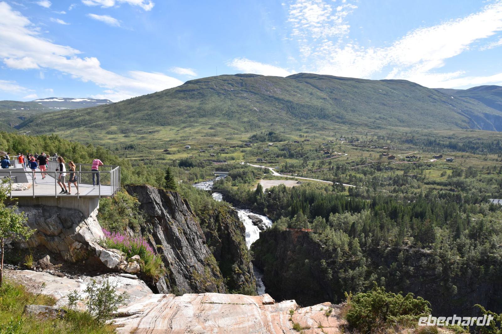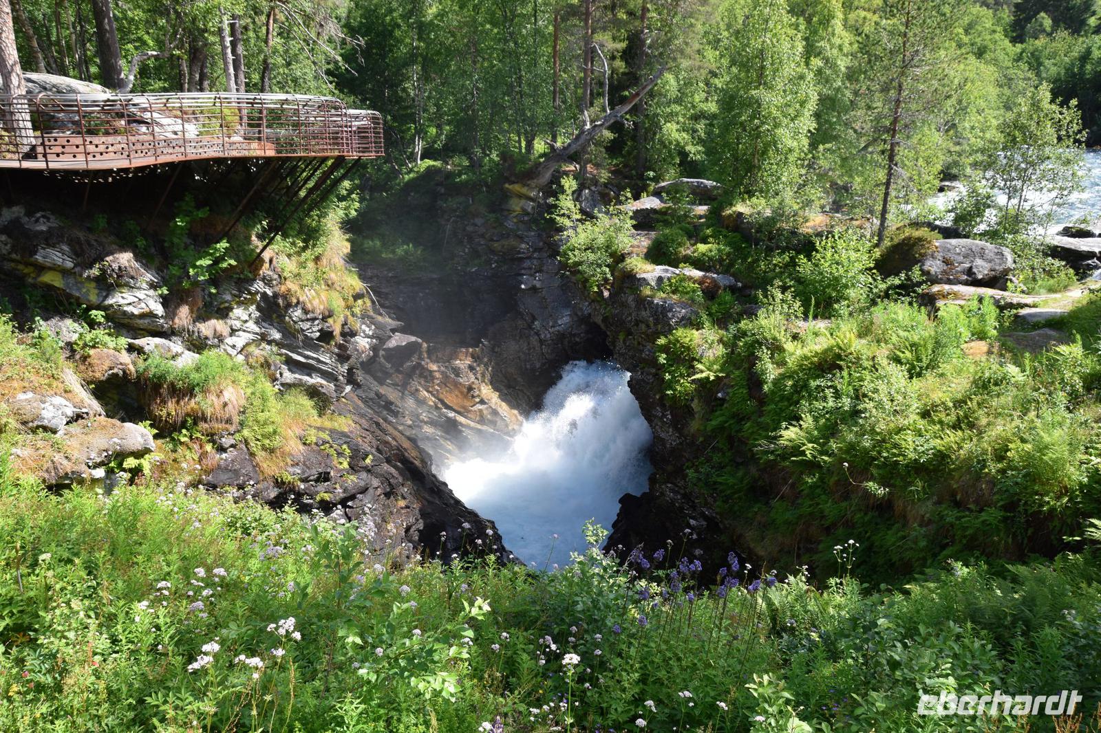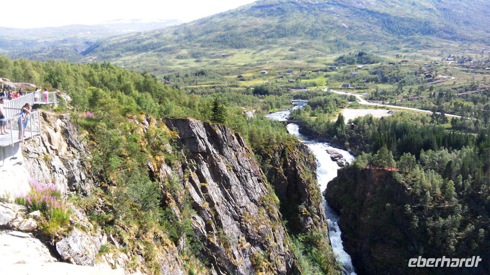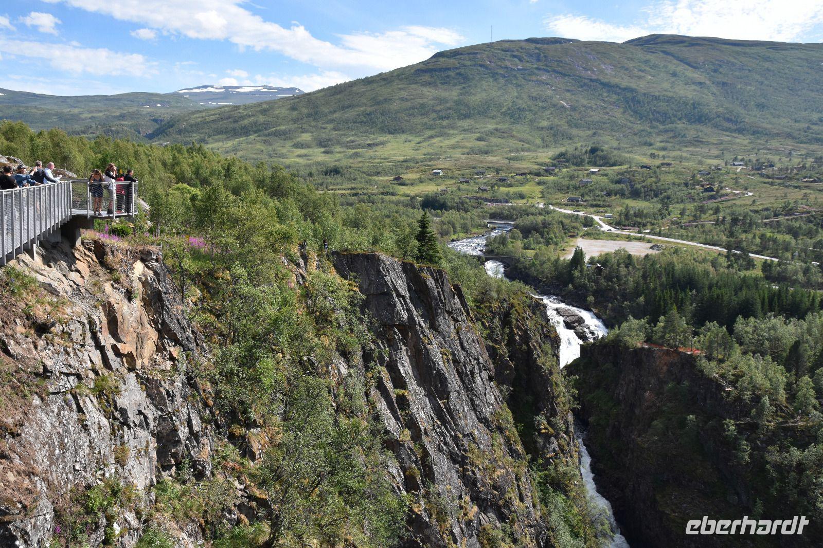 Vom unteren Aussichtspunkt sehen wir den 230 m herabstürzenden Stigfossen. Oben stehen wir auf waghalsigen Aussichtsplattformen, zu denen wir spazieren können.