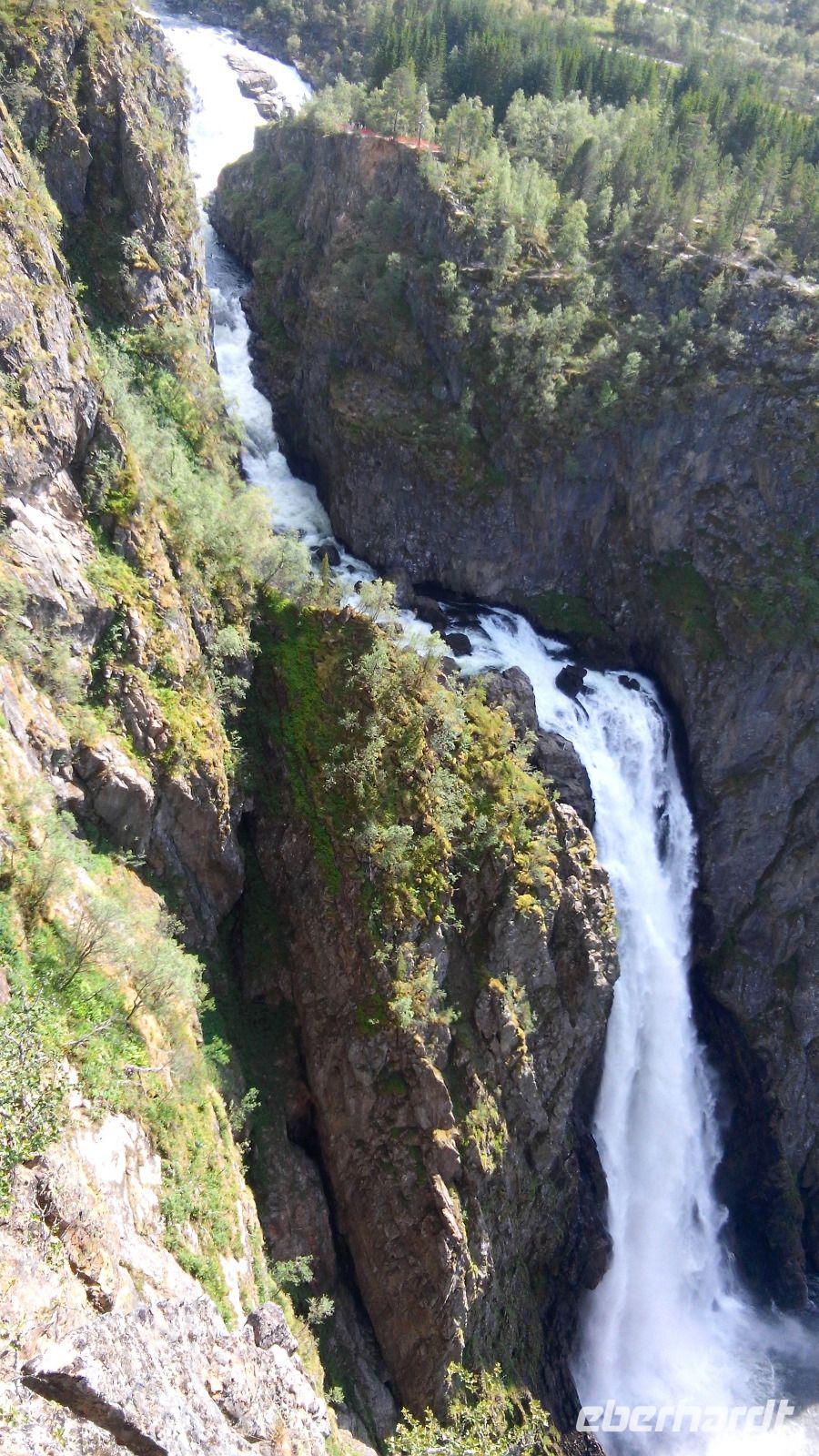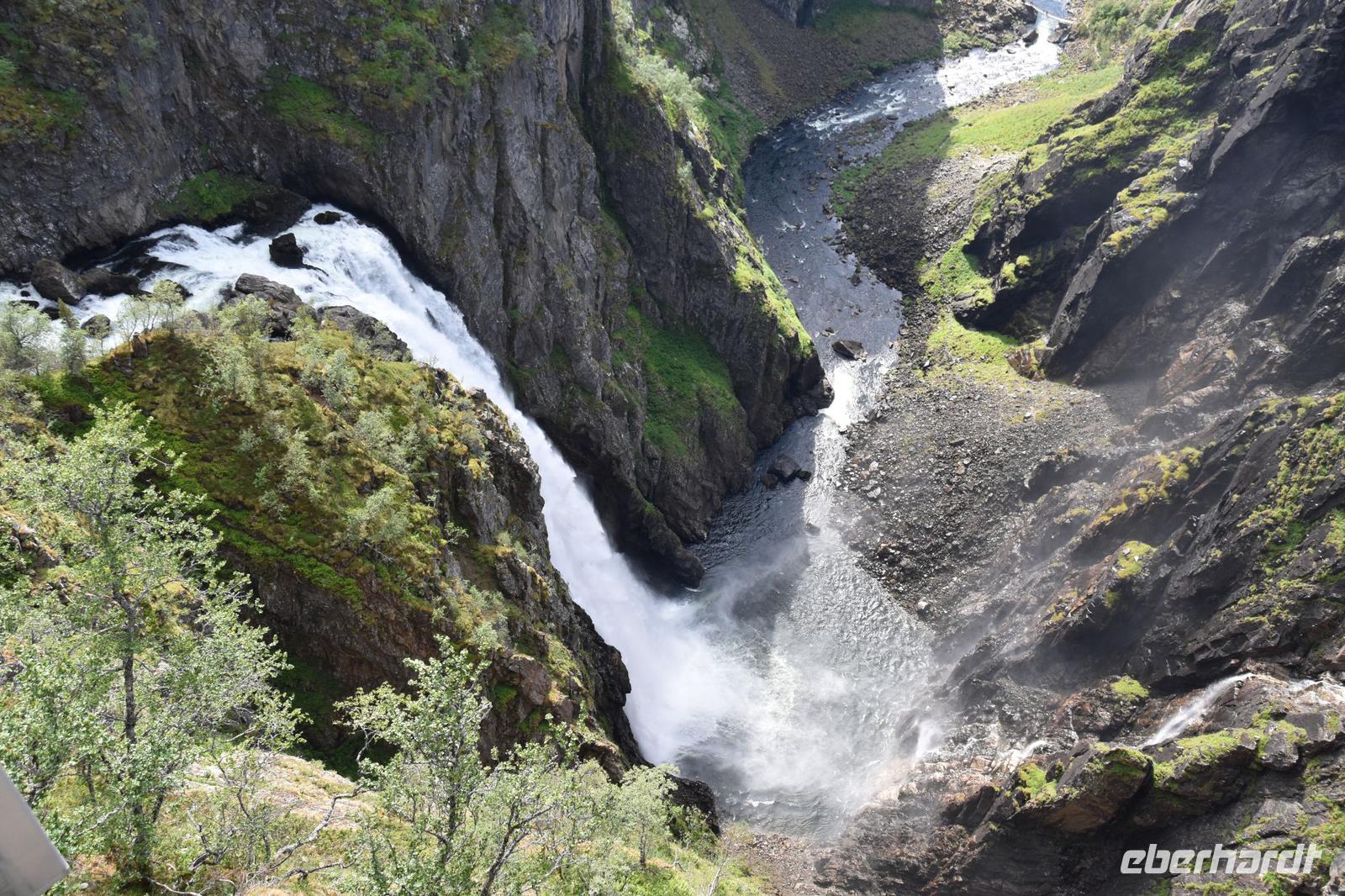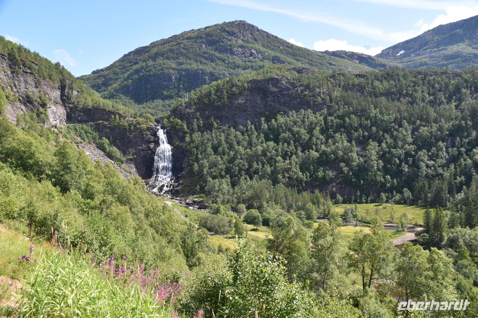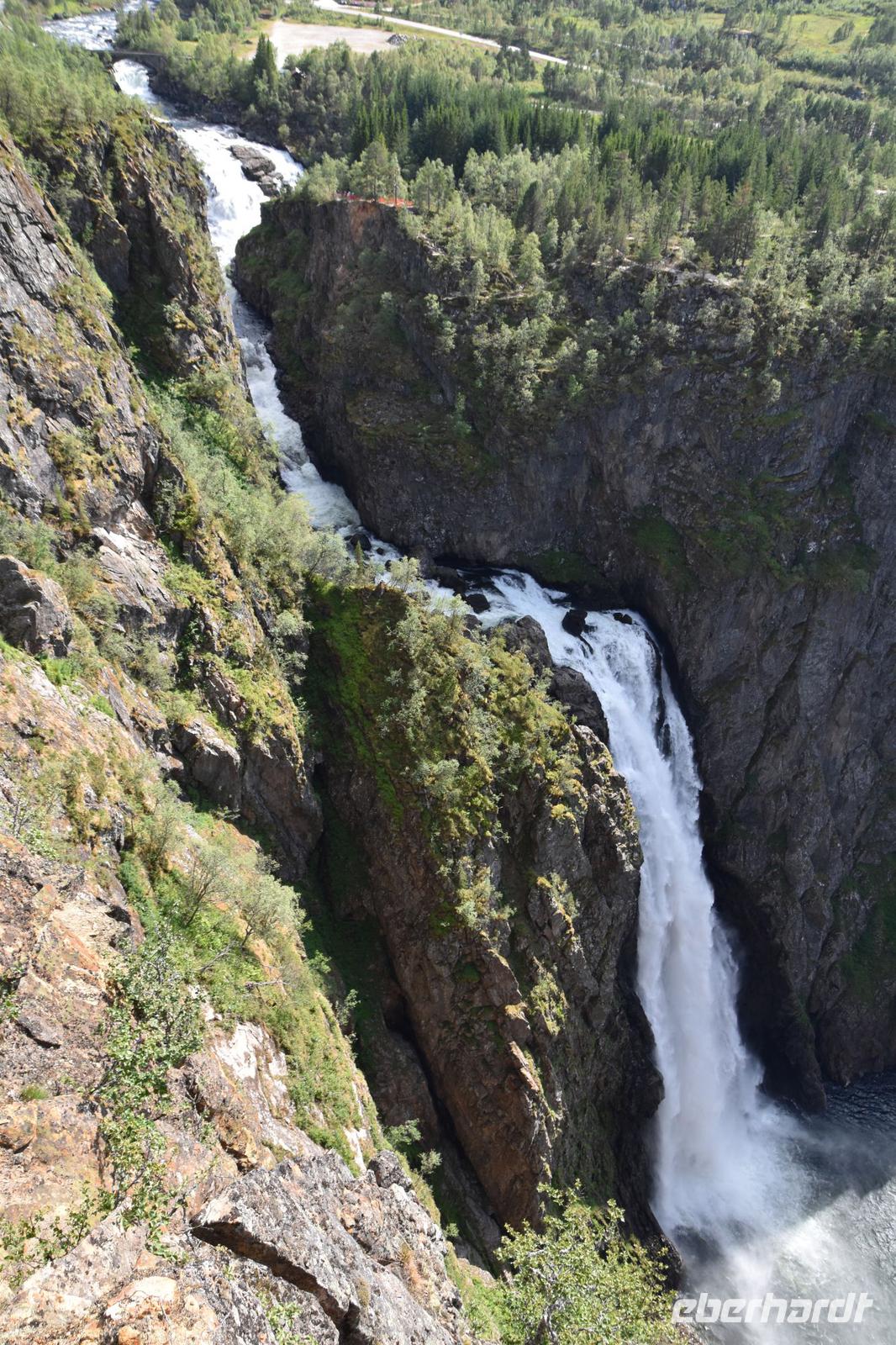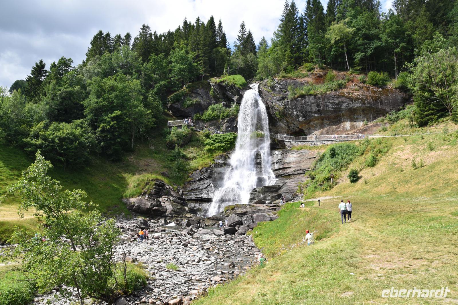 Vom unteren Aussichtspunkt sehen wir den 230 m herabstürzenden Stigfossen. Oben stehen wir auf waghalsigen Aussichtsplattformen, zu denen wir spazieren können.