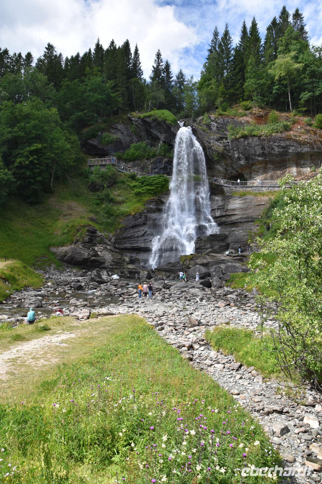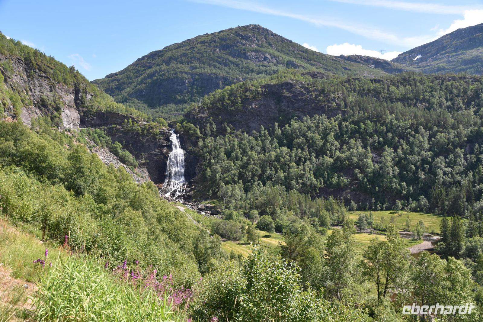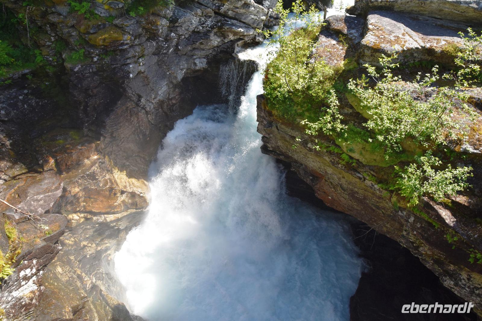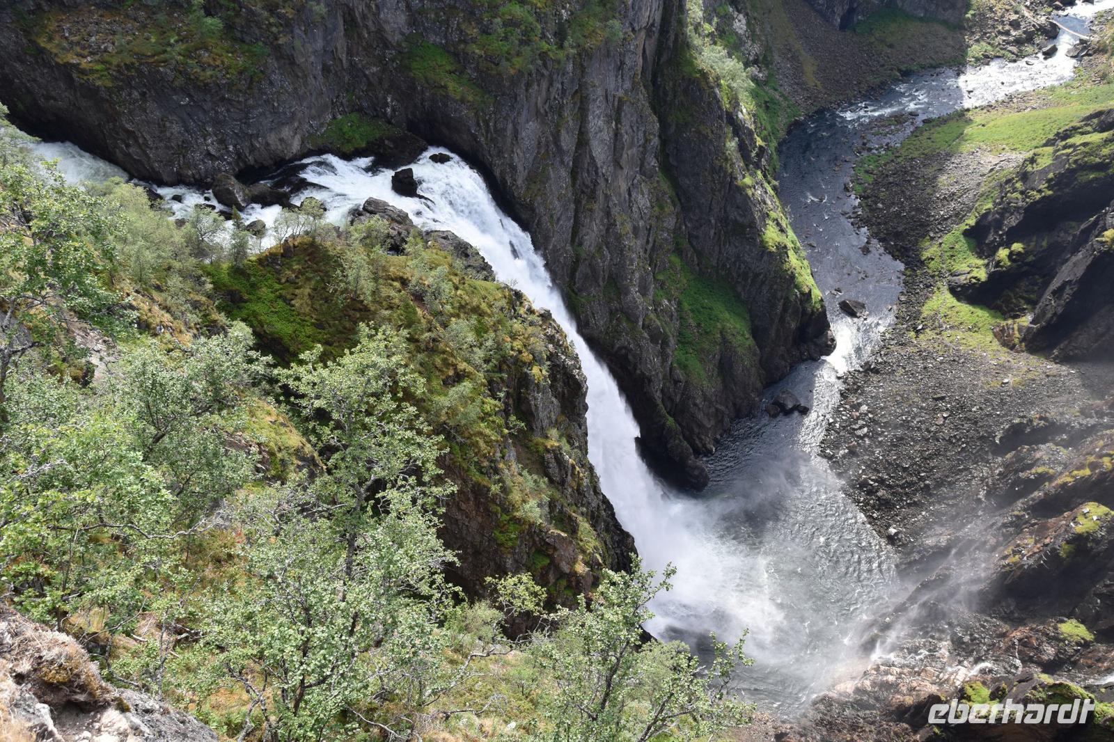 Vom unteren Aussichtspunkt sehen wir den 230 m herabstürzenden Stigfossen. Oben stehen wir auf waghalsigen Aussichtsplattformen, zu denen wir spazieren können.