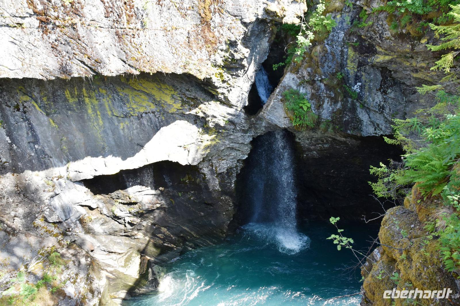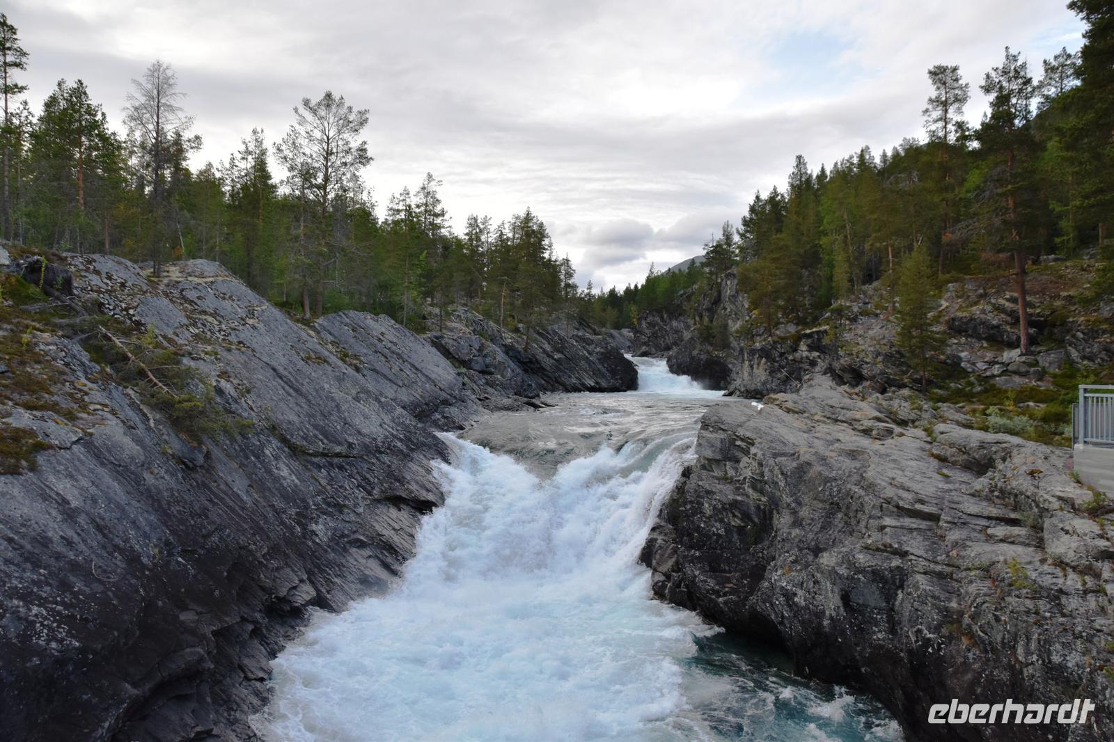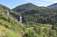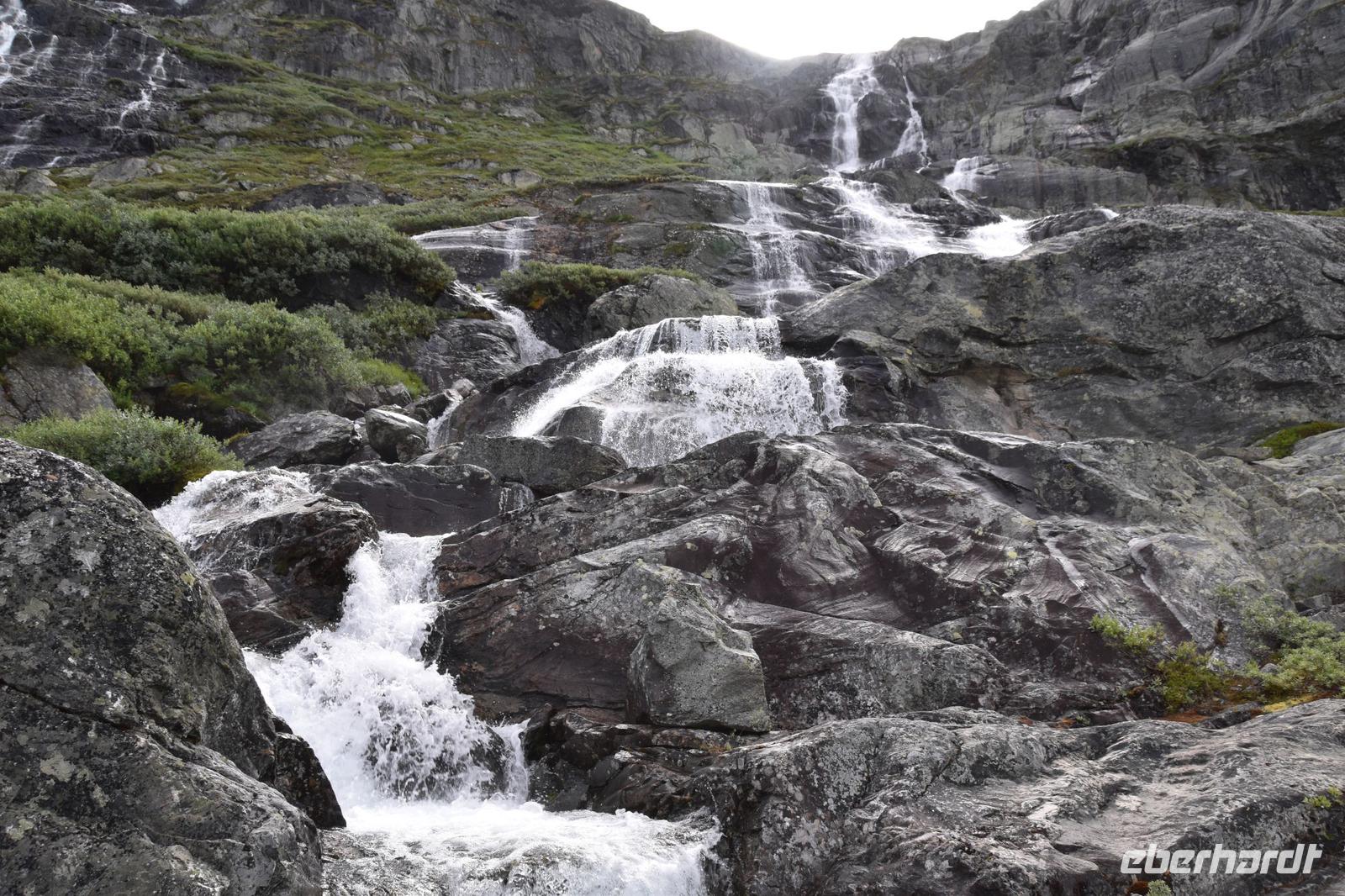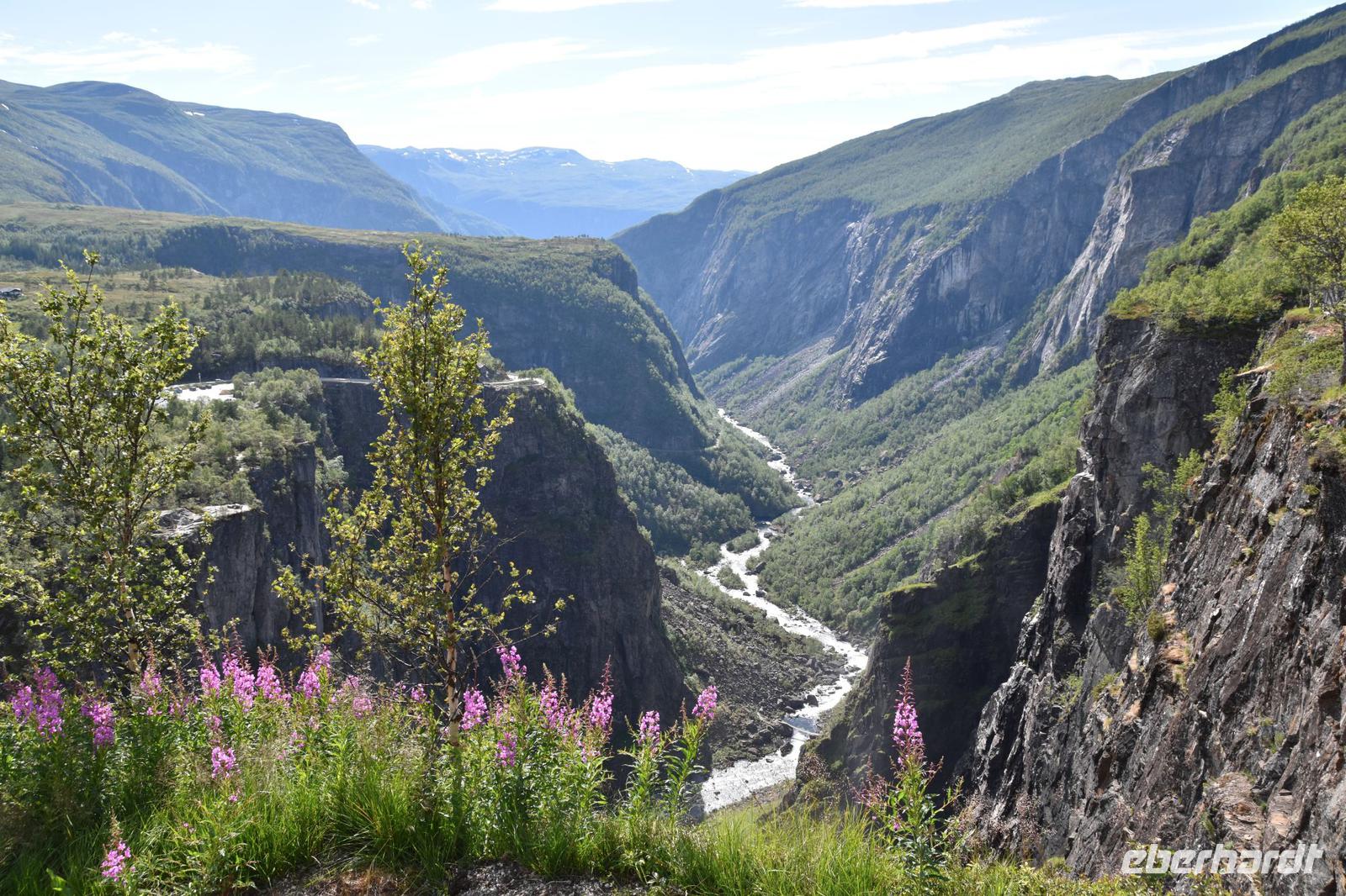 Vom unteren Aussichtspunkt sehen wir den 230 m herabstürzenden Stigfossen. Oben stehen wir auf waghalsigen Aussichtsplattformen, zu denen wir spazieren können.