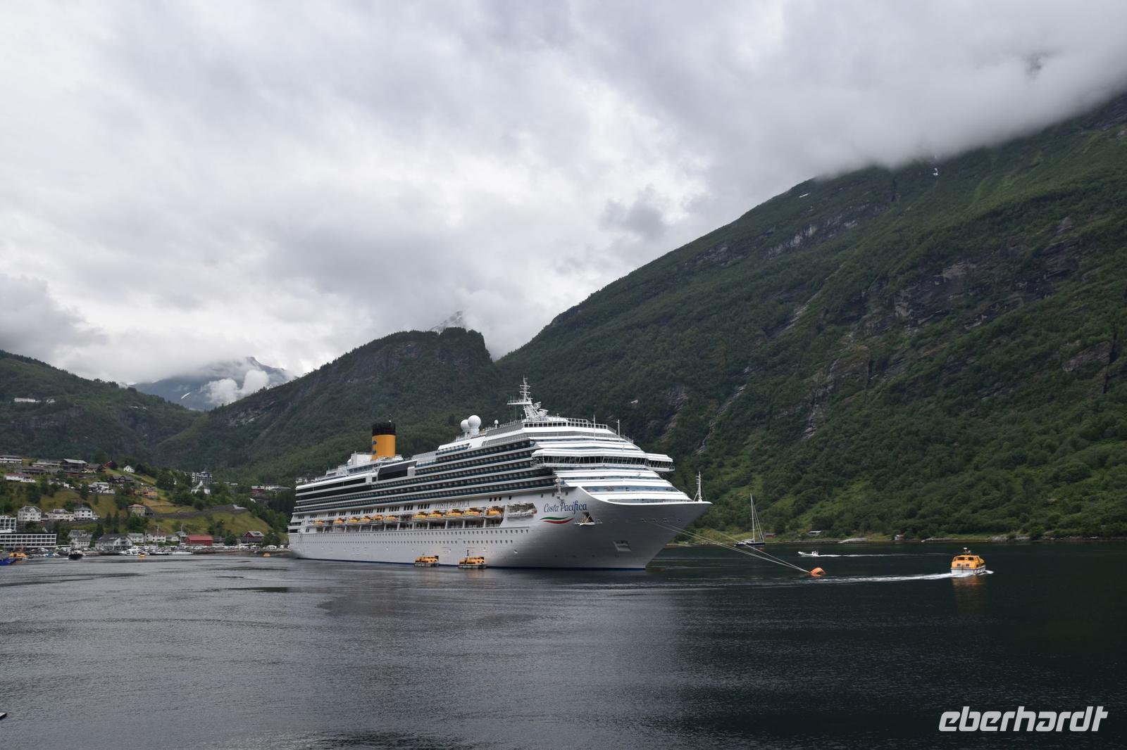 In Geiranger fahren wir zum Aussichtspunkt Dalsnibba hinauf, der weit oberhalb des Geirangerfjordes liegt (1474 m) und uns auf die Fähre und ein Costa-Kreuzfahrtschiff zurückblicken lässt.