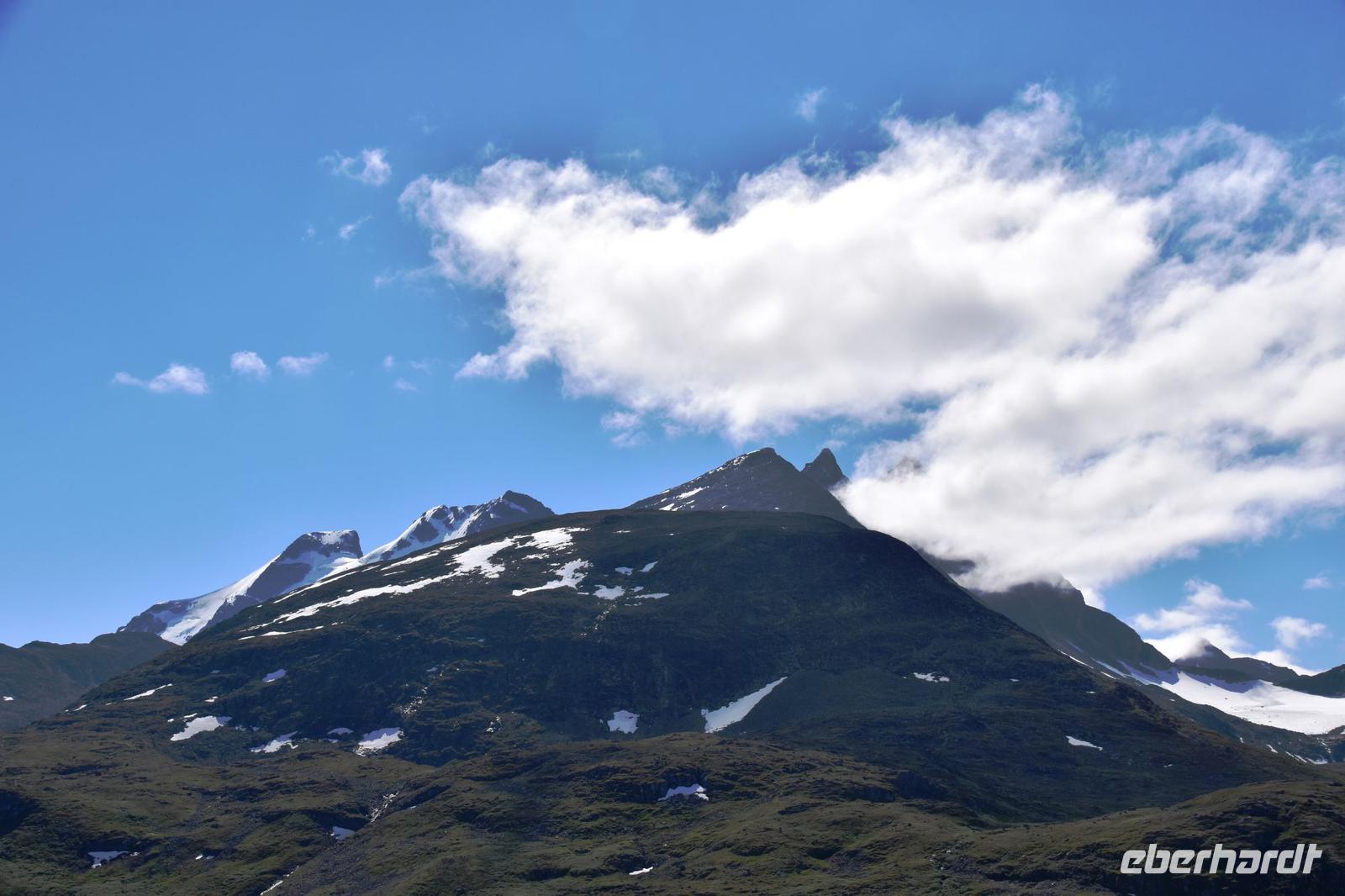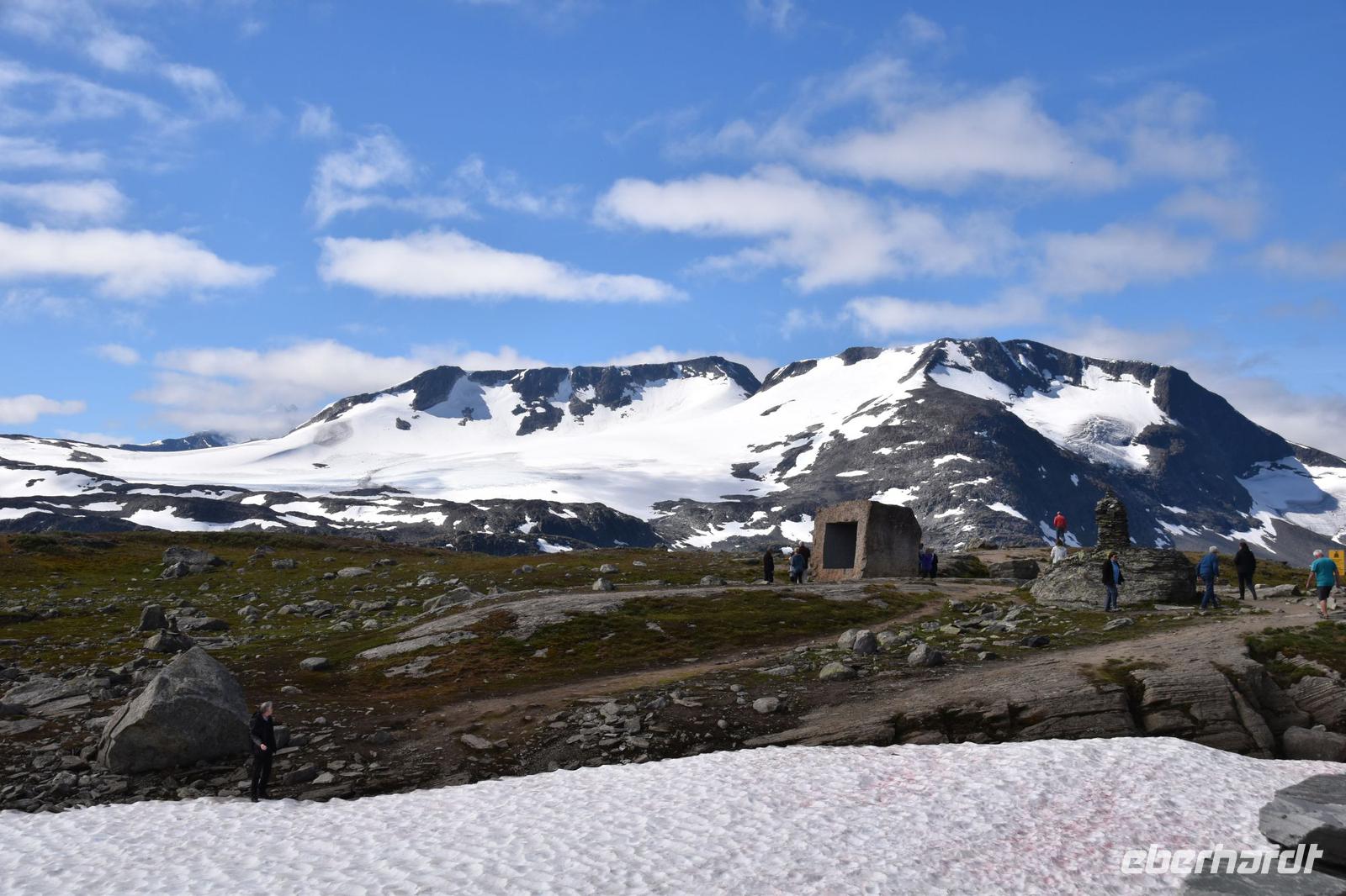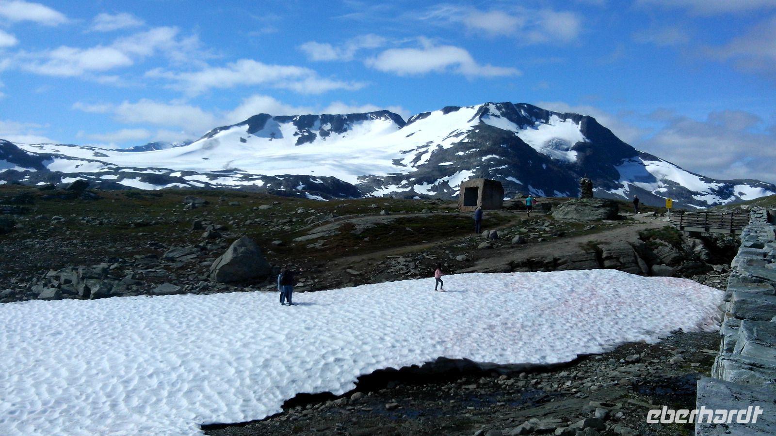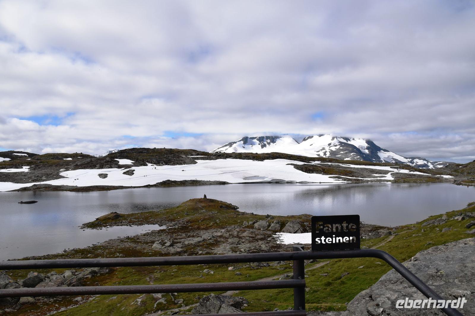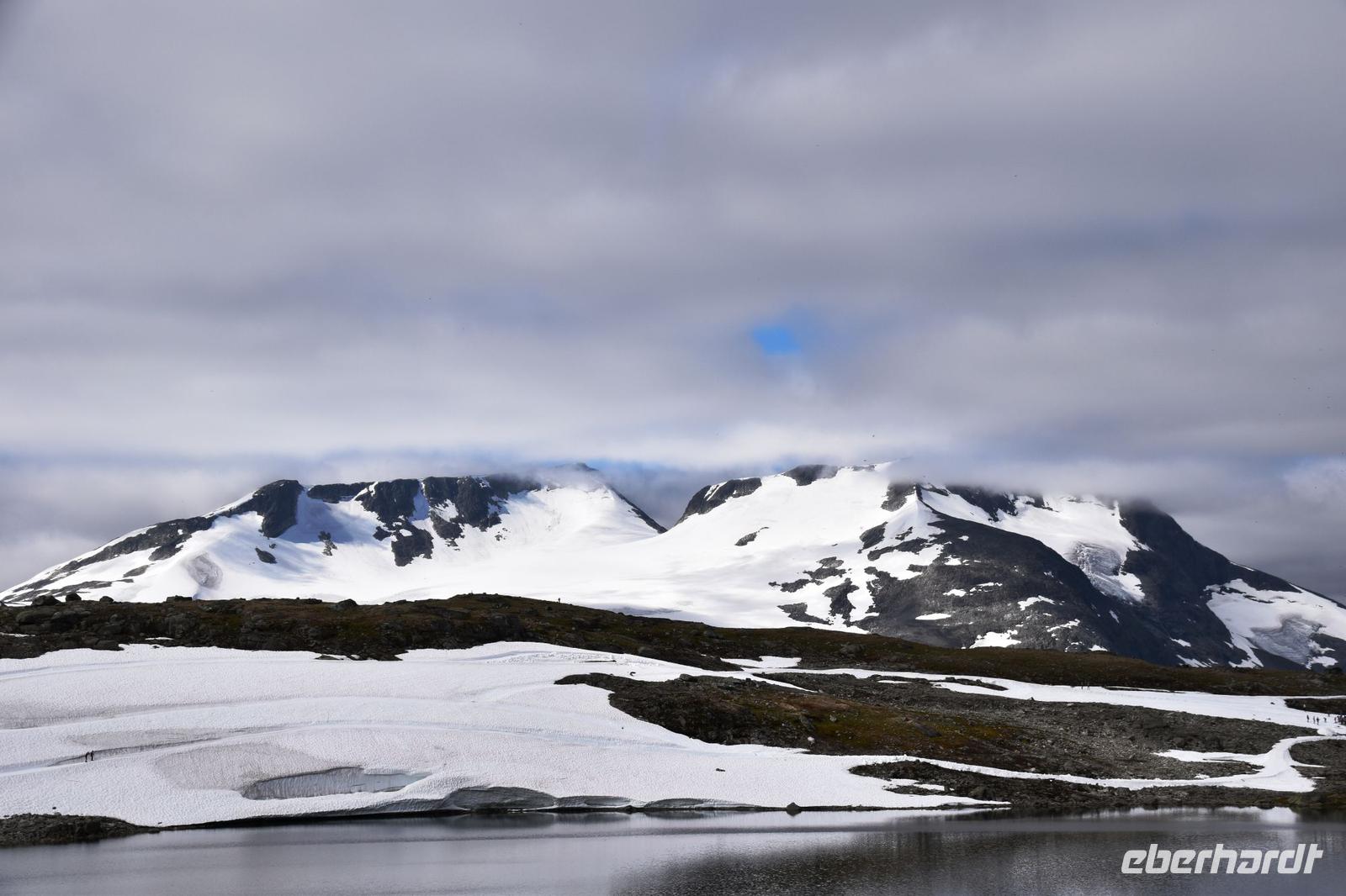 Die landschaftlich überwältigende Fahrt über die Sognefjellstraße führt uns mit diversen Fotostopps hinauf auf ihren höchsten Punkt im Jotunheimen Nationalpark, auf immerhin 1.434 m am Fantesteinen. Wer möchte kann ab hier zu Fuß zur nahen Sognefjellhütte laufen. Dort, mit herrlichem Ausblick auf die „Riesen" des Jotunheimen, die Heimat der Trolle rasten wir. Es liegt noch Schnee und in der nahen Langlaufloipe ist noch viel Betrieb.