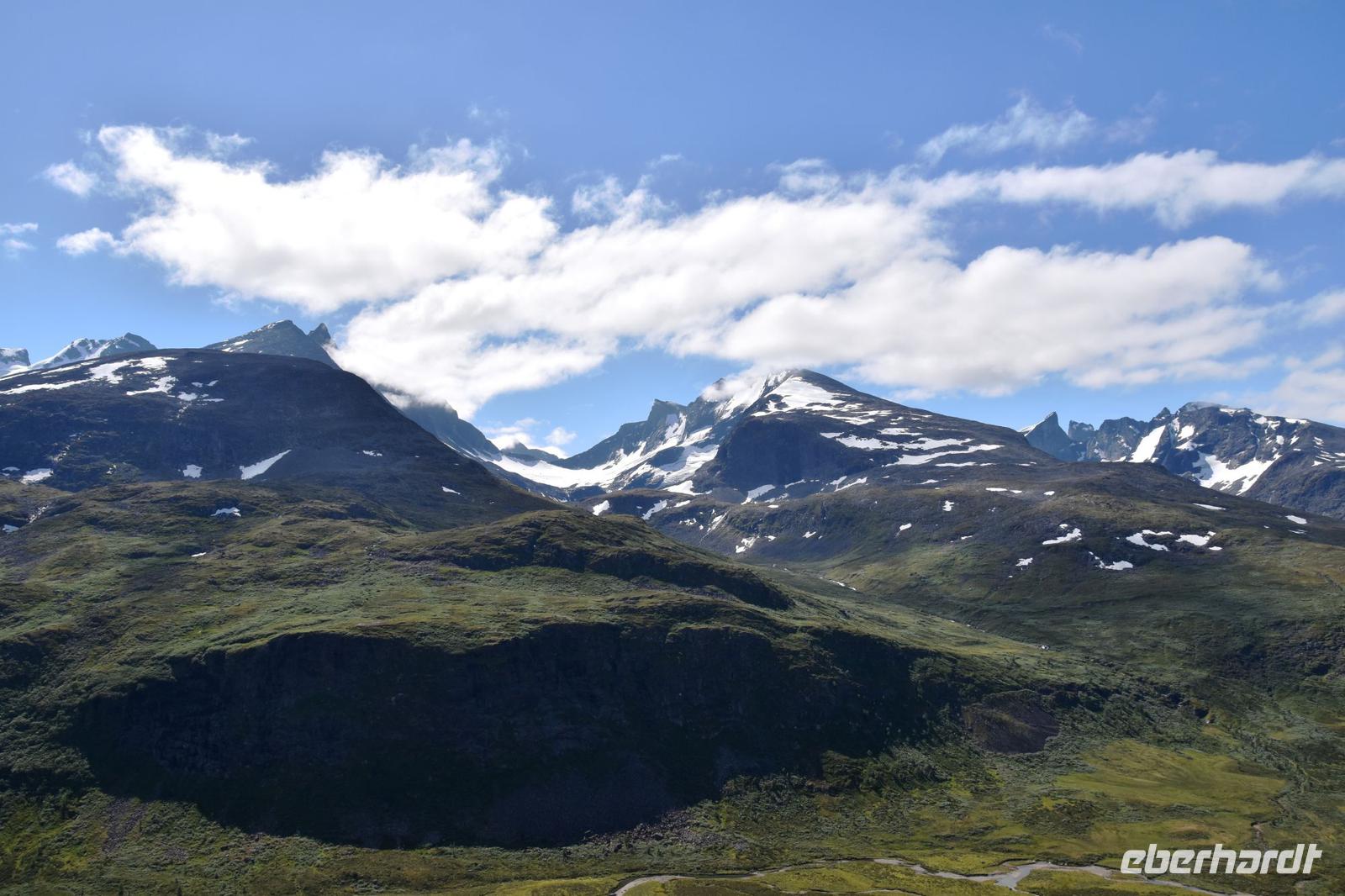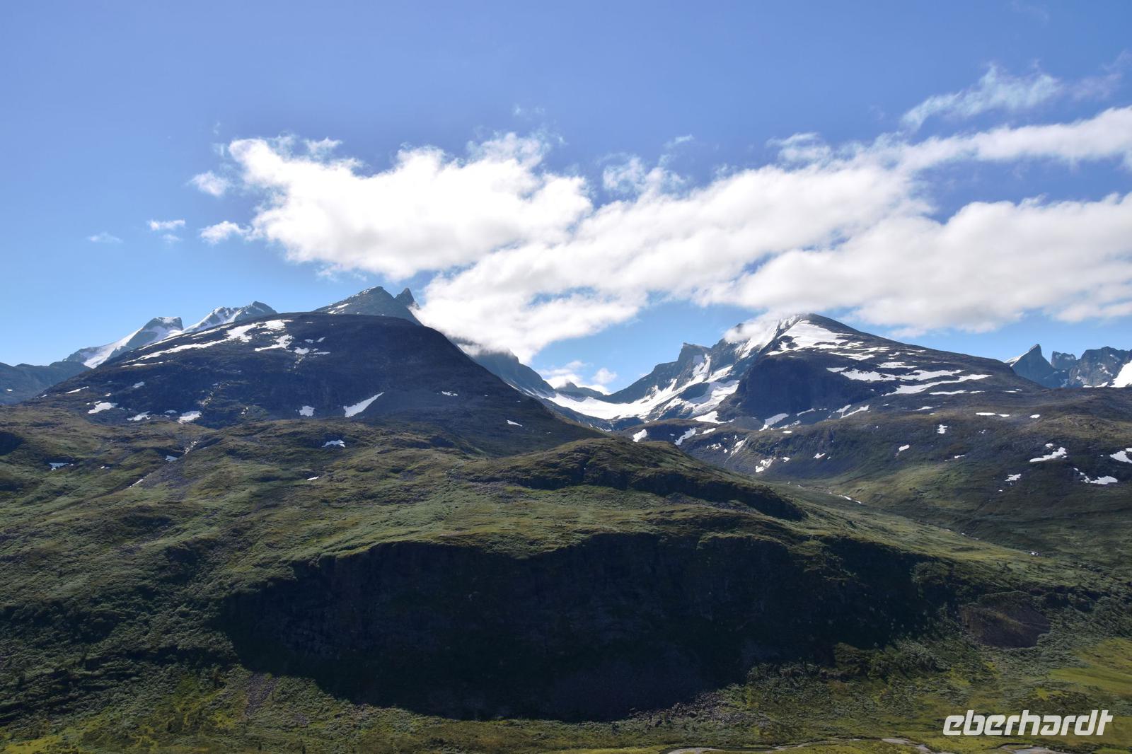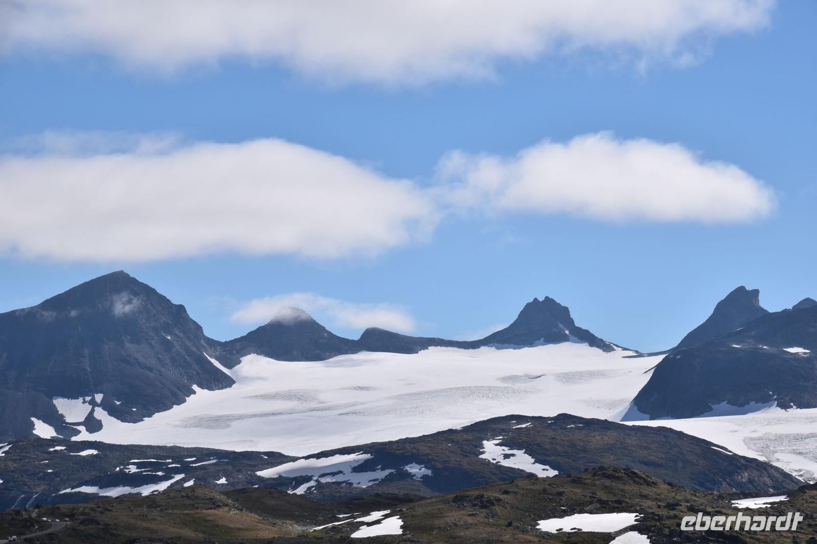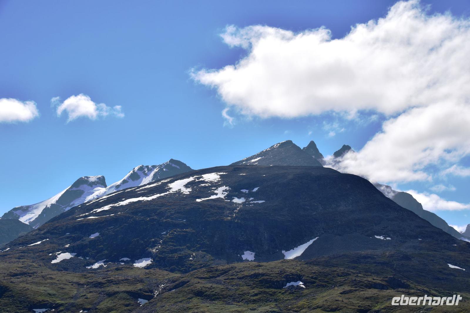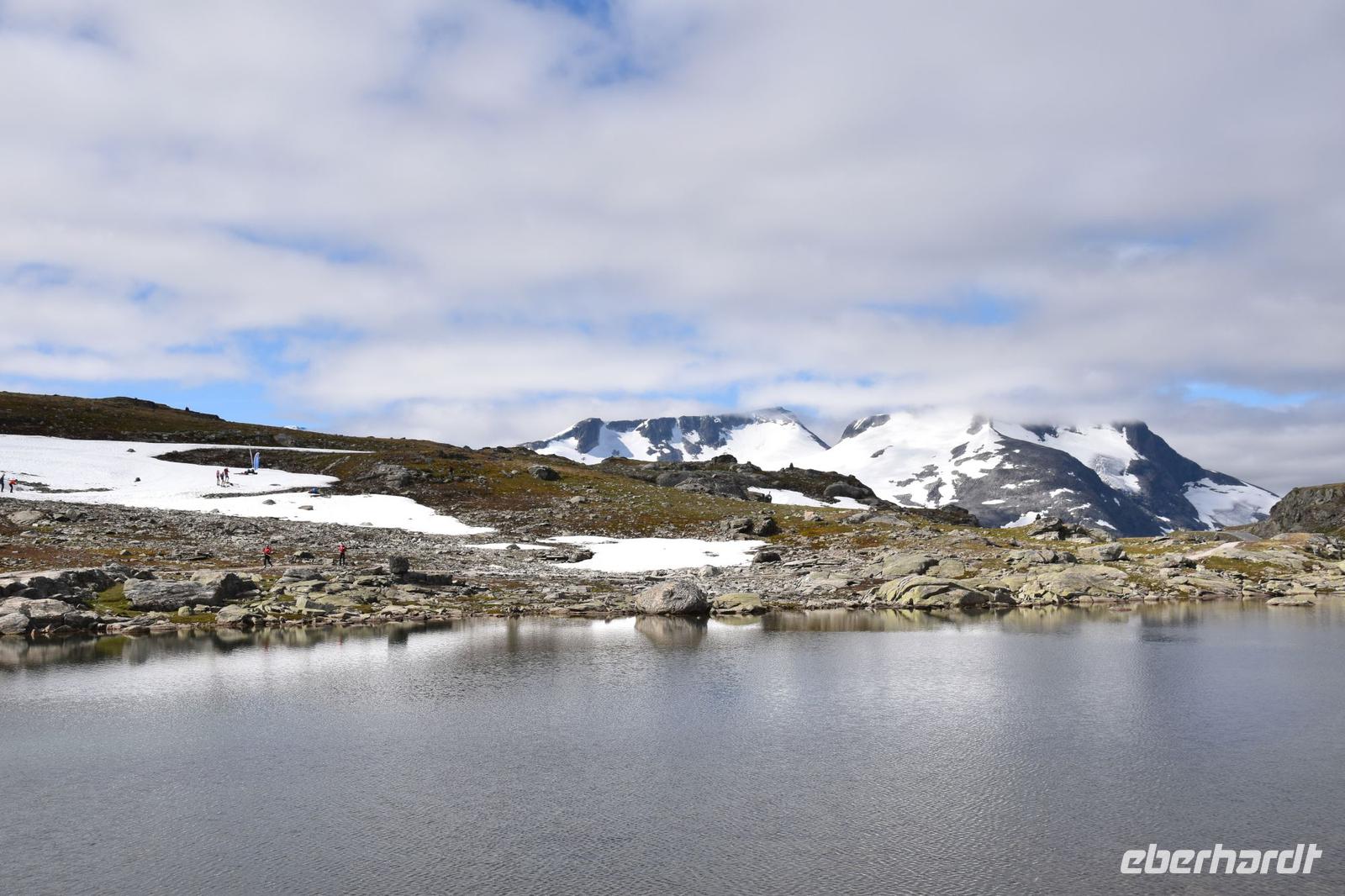 Die landschaftlich überwältigende Fahrt über die Sognefjellstraße führt uns mit diversen Fotostopps hinauf auf ihren höchsten Punkt im Jotunheimen Nationalpark, auf immerhin 1.434 m am Fantesteinen. Wer möchte kann ab hier zu Fuß zur nahen Sognefjellhütte laufen. Dort, mit herrlichem Ausblick auf die „Riesen" des Jotunheimen, die Heimat der Trolle rasten wir. Es liegt noch Schnee und in der nahen Langlaufloipe ist noch viel Betrieb.