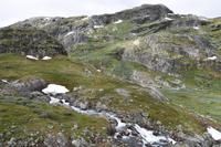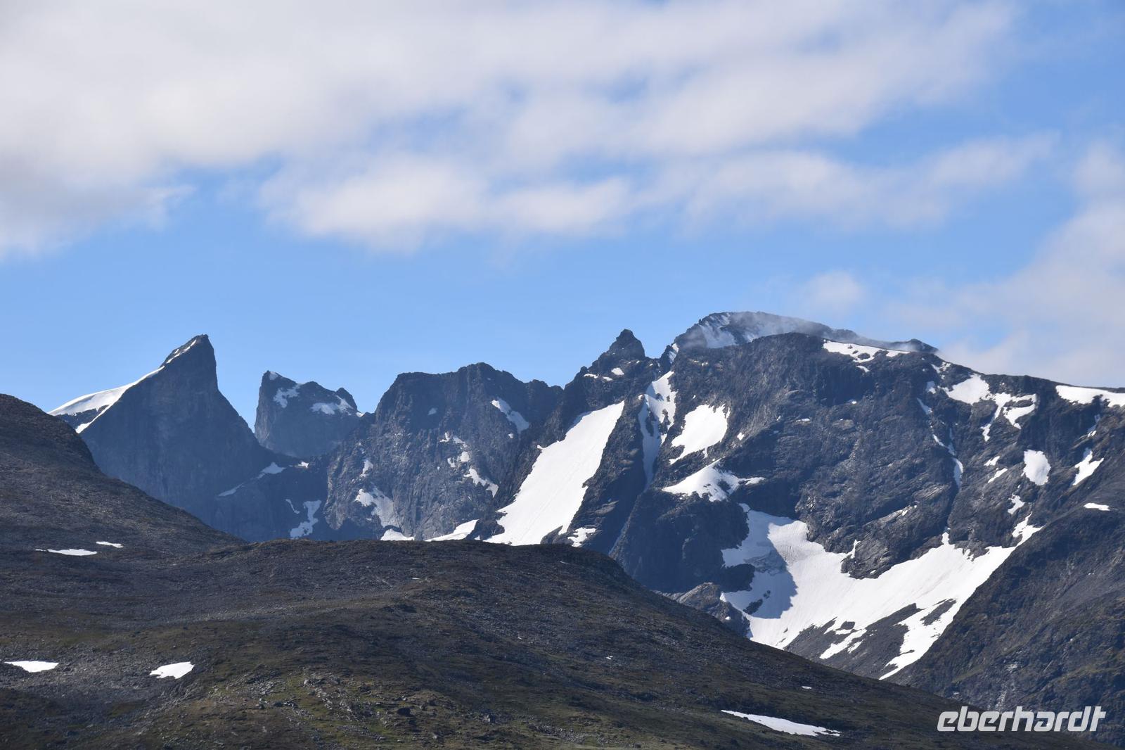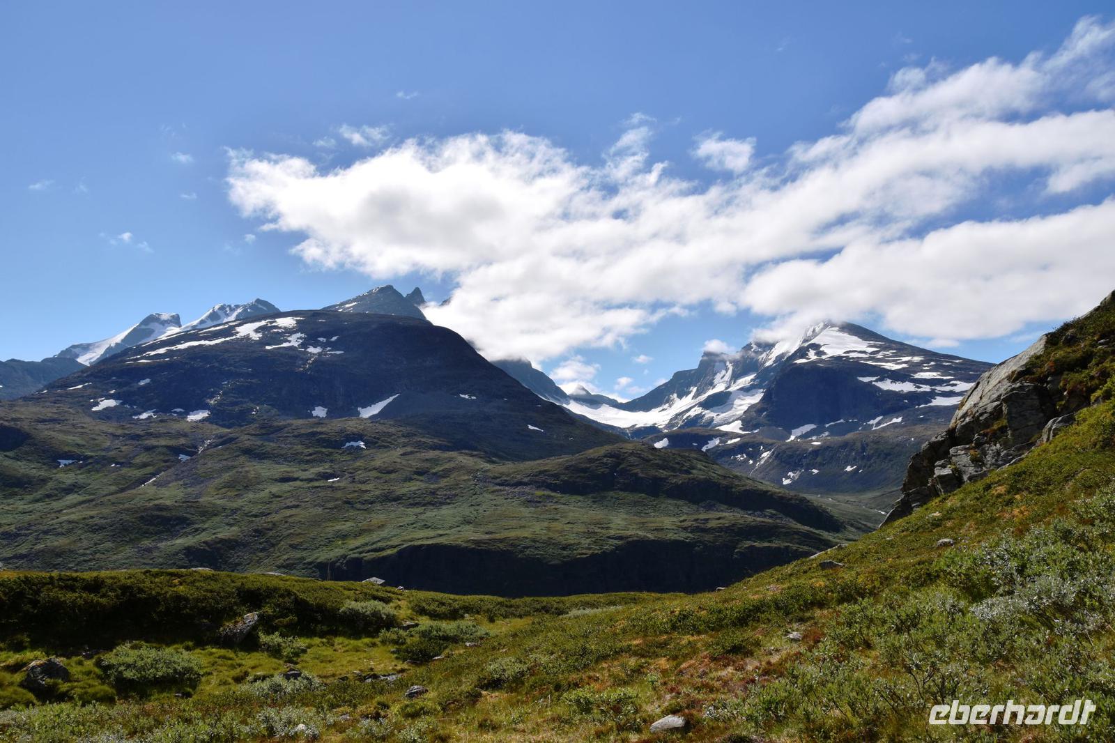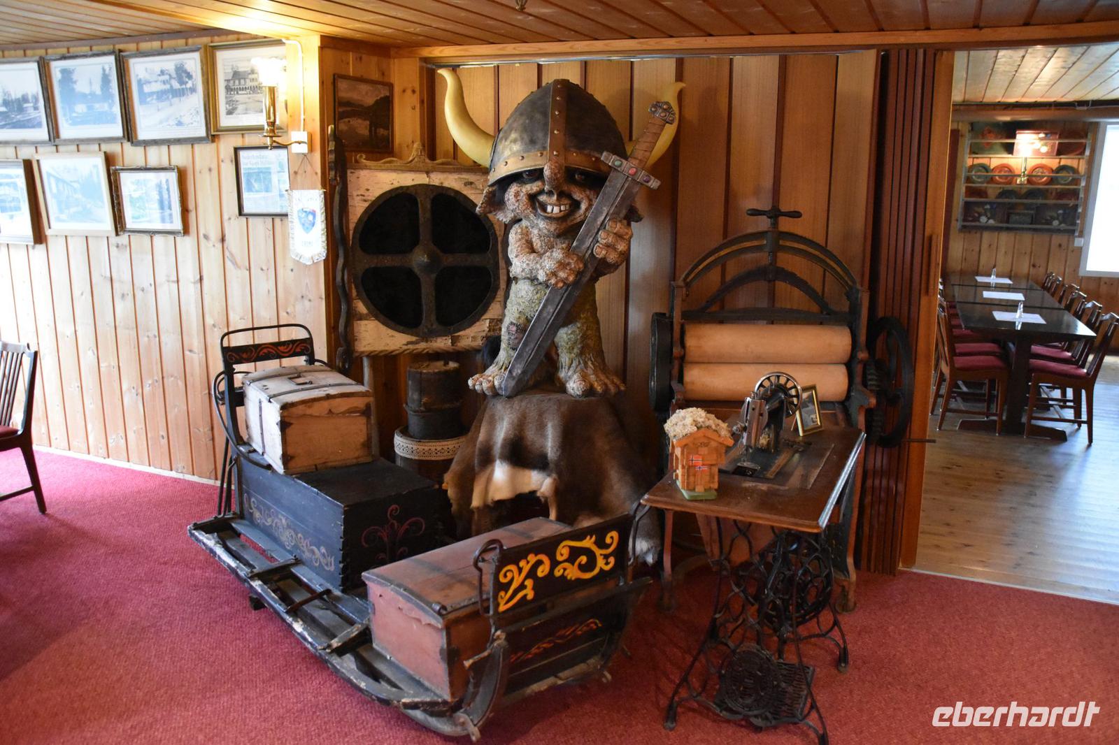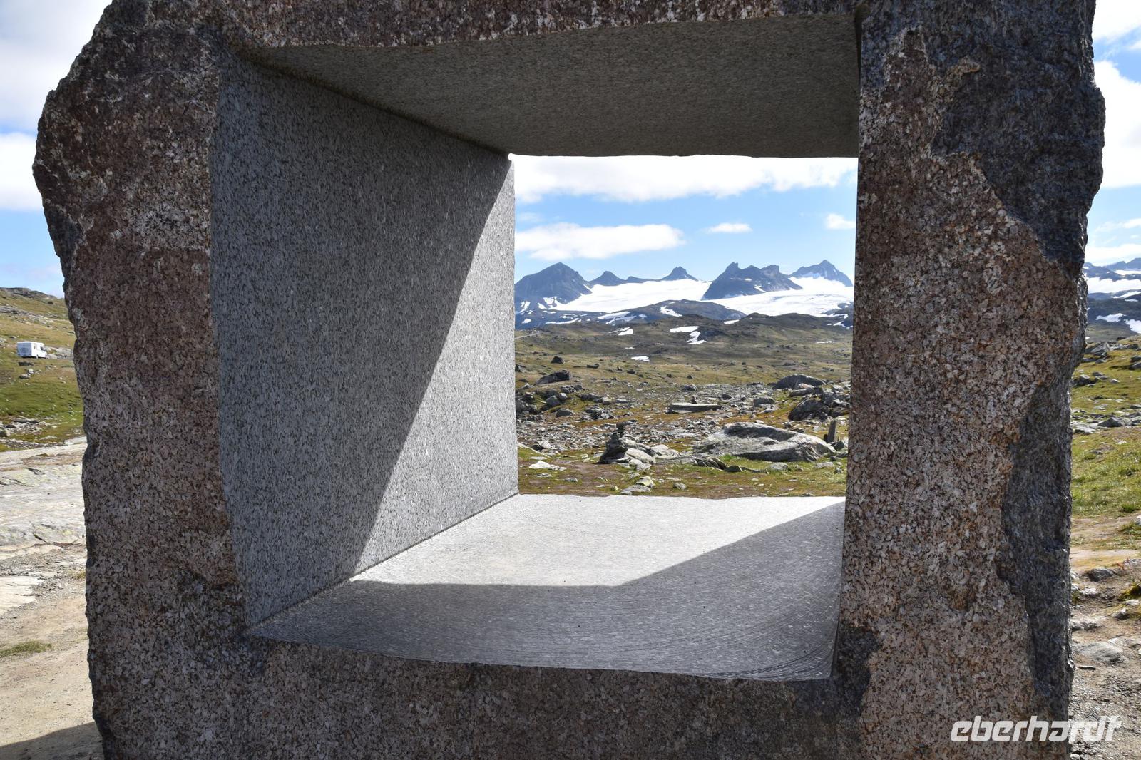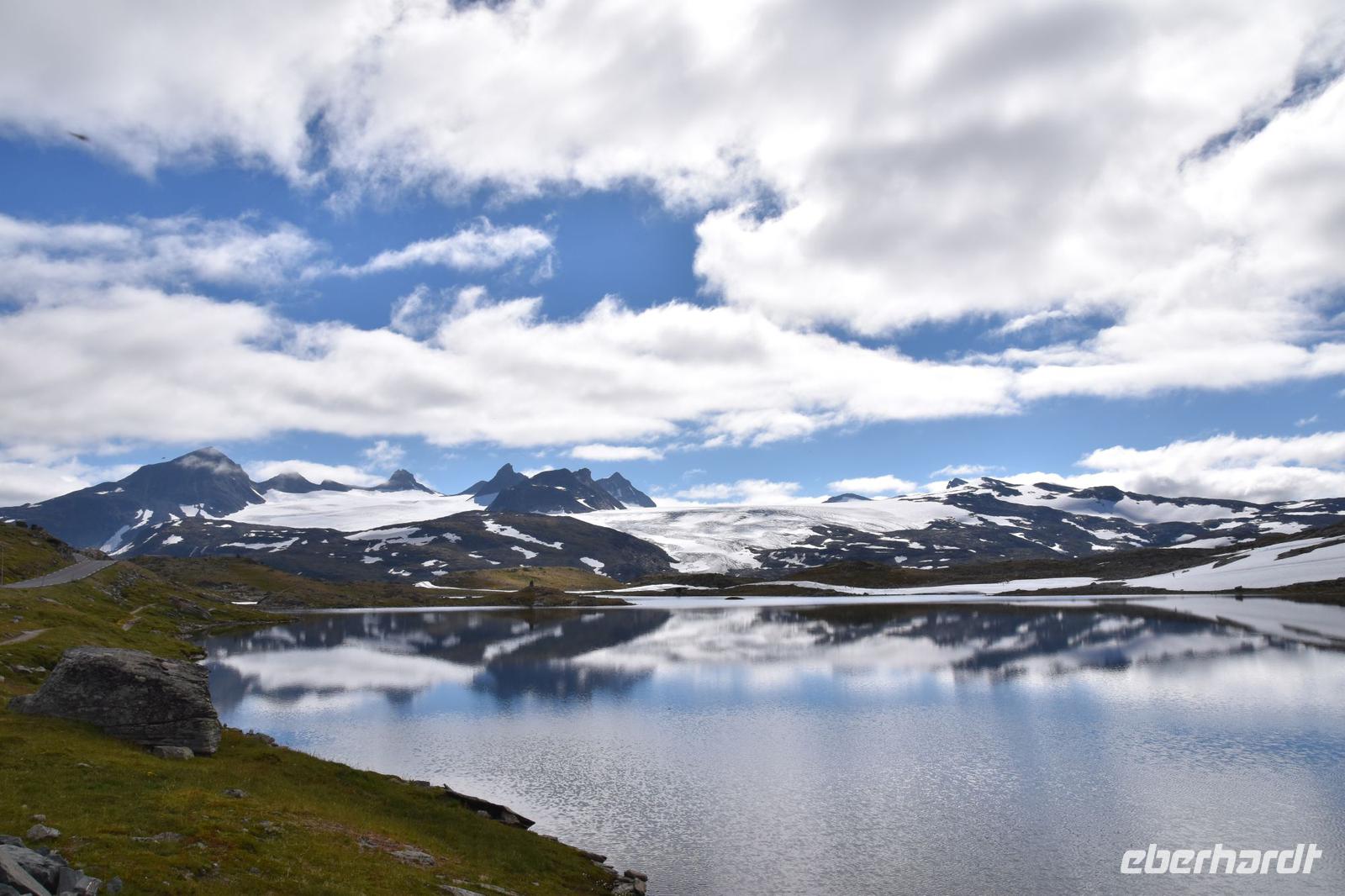 Die landschaftlich überwältigende Fahrt über die Sognefjellstraße führt uns mit diversen Fotostopps hinauf auf ihren höchsten Punkt im Jotunheimen Nationalpark, auf immerhin 1.434 m am Fantesteinen. Wer möchte kann ab hier zu Fuß zur nahen Sognefjellhütte laufen. Dort, mit herrlichem Ausblick auf die „Riesen" des Jotunheimen, die Heimat der Trolle rasten wir. Es liegt noch Schnee und in der nahen Langlaufloipe ist noch viel Betrieb.