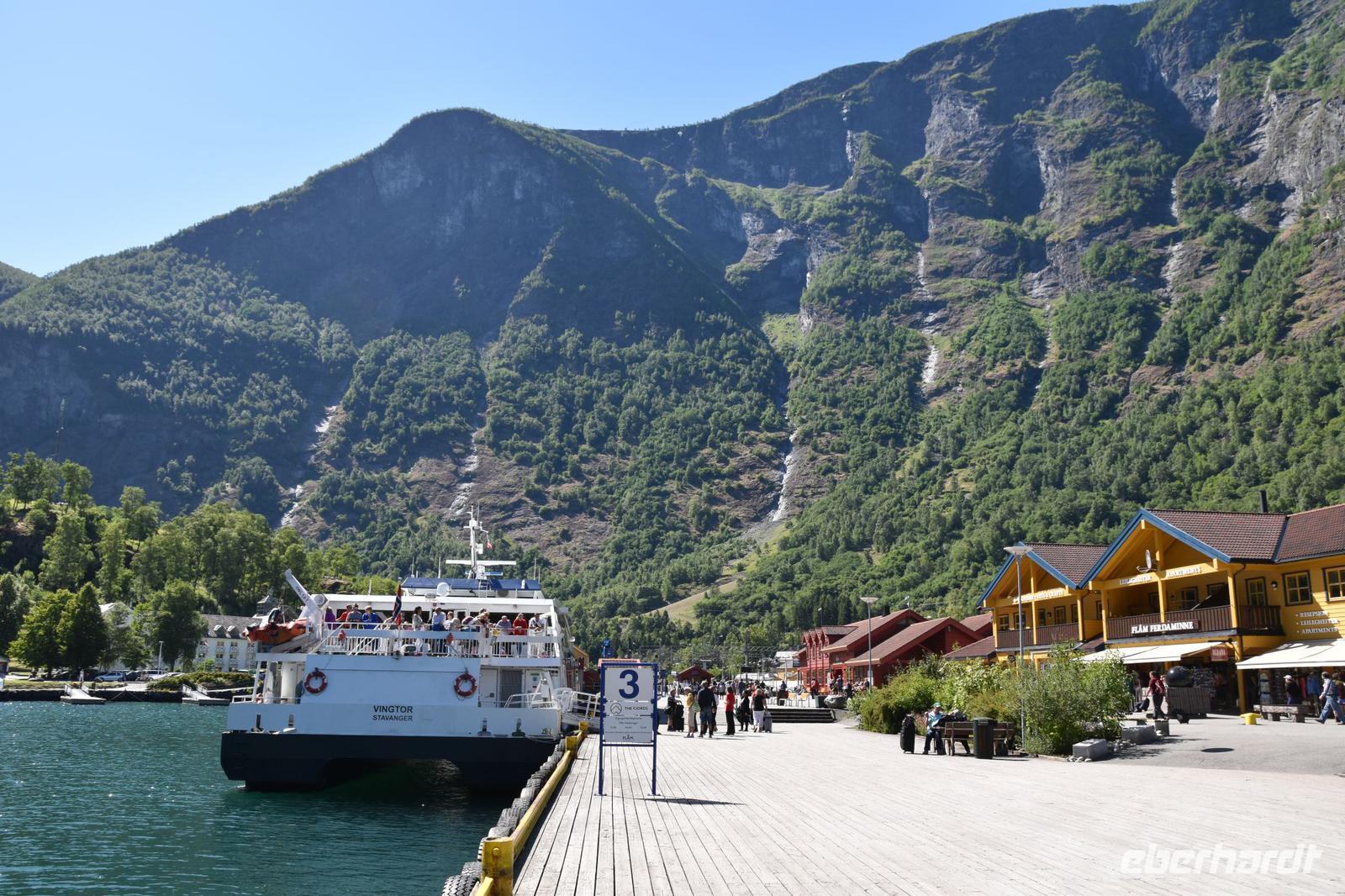 Fährüberfahrt Mannheller - Fodnes, bringt uns durch den mit 24,5 km längsten Straßentunnel Europas nach Auerland und Flam, wo die Möglichkeit zum Besuch des Eisenbahnmuseums oder zu einem Spaziergang am Auerlandsfjord besteht.