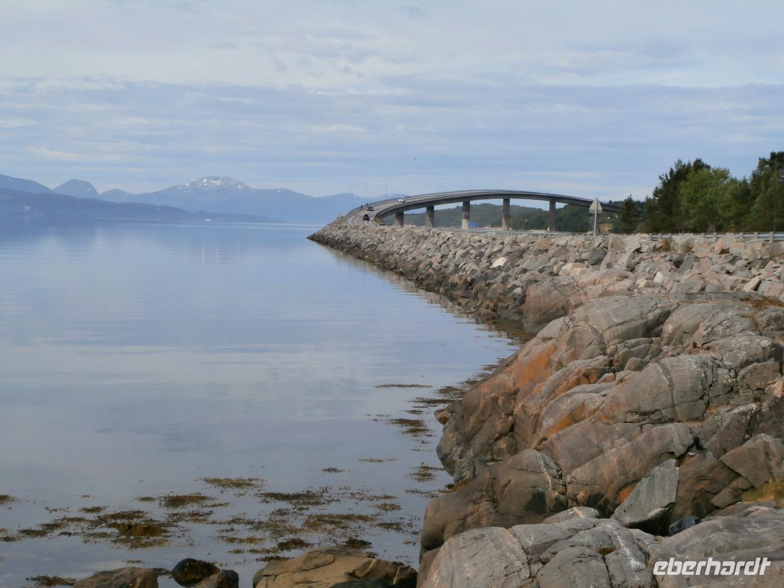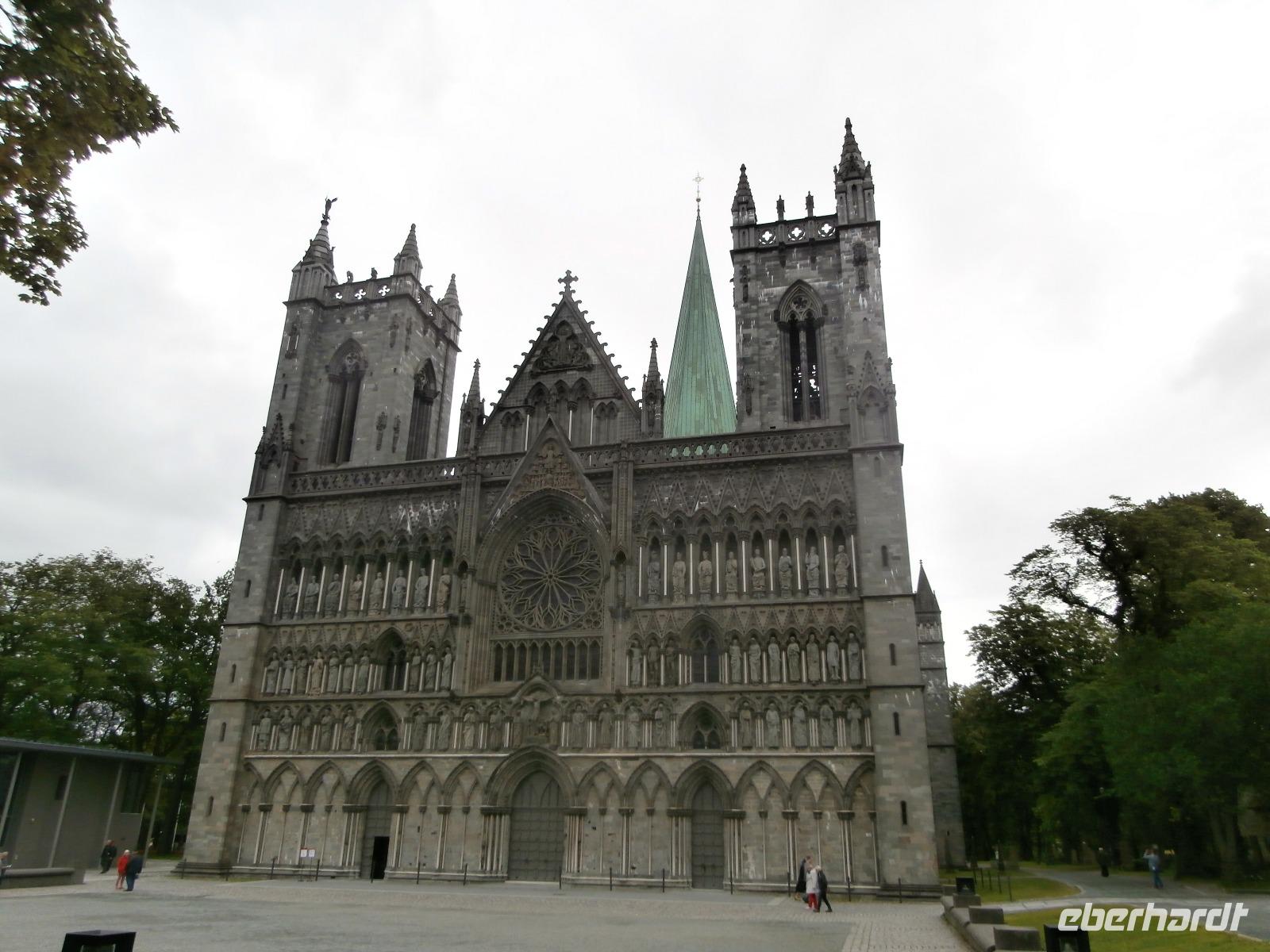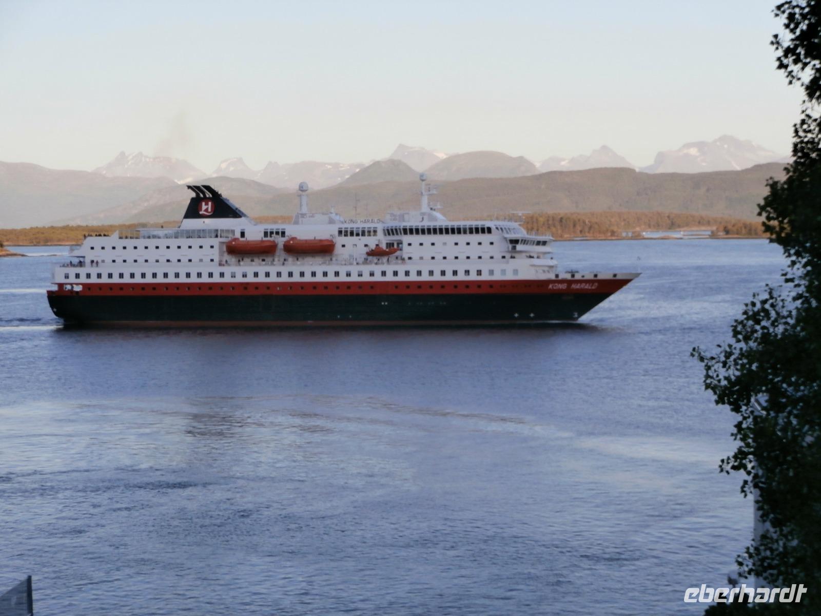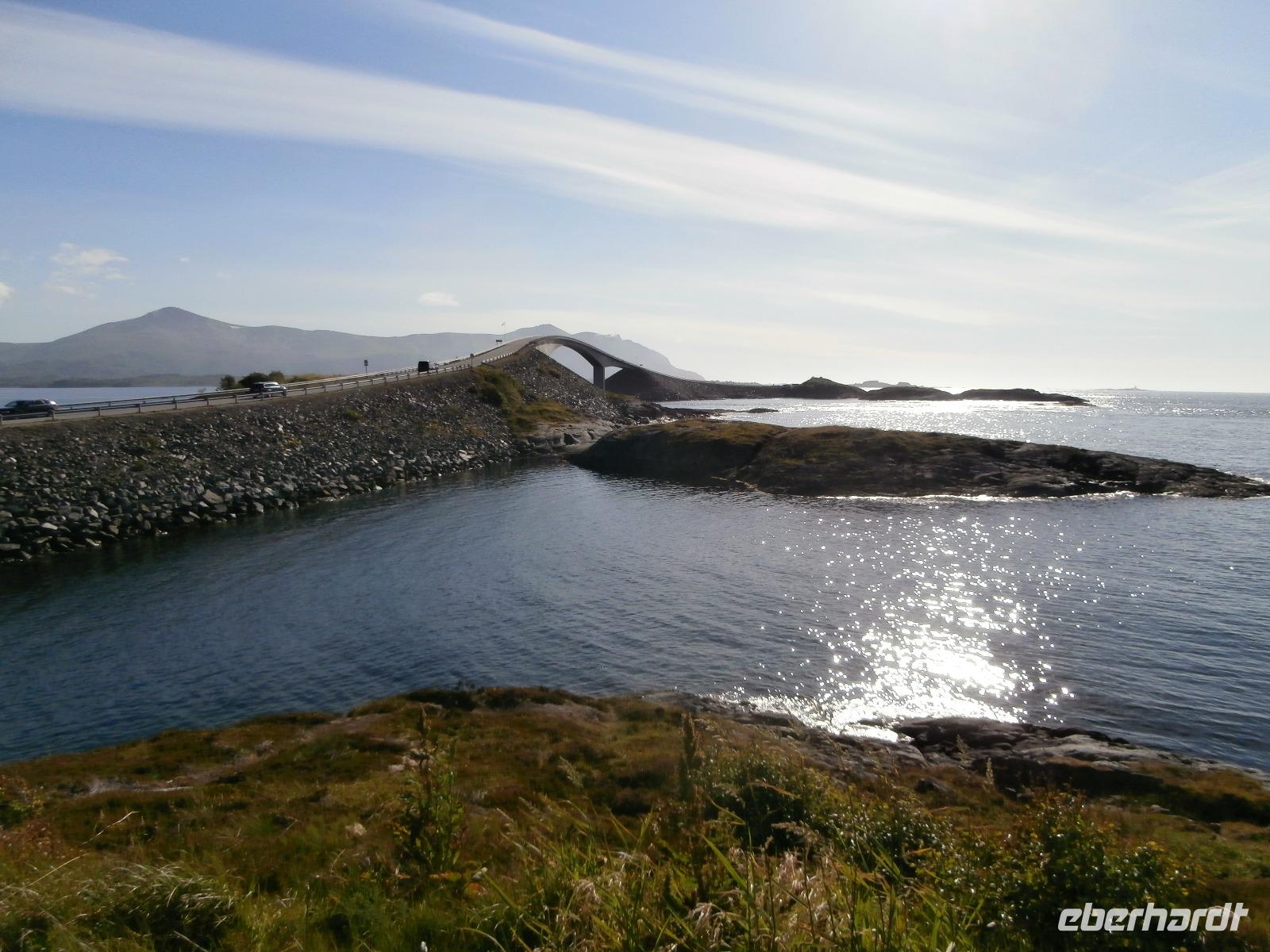 Heute Morgen werden wir mit bewölktem Himmel, aber trocken, geweckt. Das Frühstück im Hotel lässt keine Wünsche offen. Vom Hotel aus fahren wir gemeinsam zum Nidaros-Dom, er ist Skandinaviens größter und prächtigster Sakralbau, ihn besichtigen einige Reisegäste. Das reich verzierte Hauptportal ist sehenswert. Der Nidarosdom ist ganz in der Nähe der Gamle Bybrua-die alte Stadtbrücke, von ihr hat man einen schönen Blick auf die alten Speicherhäuser am Nidelv und die weiße Festung Kristiansten. Mit unserem Bus geht die Fahrt zum Hurtigrutenkai, gemeinsam gehen wir an Bord der M/S „Kong Harald" zur "Schönsten Seereise der Welt". Nun haben wir bis zum Nachmittag Zeit zum Relaxen, genießen die Atmosphäre an Bord und lassen die beeindruckenden Küsten und das weite, offene Meer an uns vorüber ziehen. Die Sonne kommt später hinter den Wolken hervor, fantastische Ausblicke in die Schären sind möglich. Falk erwartet uns im Hafen von Kristiansund mit Kaffee am Bus. Schnell noch ein Foto vom Hurtigrutenschiff und ein Spaziergang zur Klippfischfrau in Kristiansund. Zum nächsten Höhepunkt unserer Reise geht die Fahrt, auf der Atlantikstraße mitten durch die offene See und die markante Schärenlandschaft, führt die Tour mit unserem Bus. Wir fahren zuerst in einen langen, neuen Tunnel unter dem Fjord durch. Die Atlantikstraße präsentiert sich mit mehreren Brücken und Dämmen in toller Form auf einer Länge von über 8 km. Wir legen einen Fotostopp ein und können wunderschöne Aussichten im Sonnenschein und bei azurblauem Himmel genießen. Weiter geht die Fahrt nach Molde. In das Gebiet der Romsdalsalpen können wir schauen. Genächtigt wird heute in der "Stadt der Rosen" so der Beiname von Molde, das milde Klima verlieh ihr einst den Namen. Am späten Abend legen noch 2 Schiffe der Hurtigrute, unser Schiff „ Kong Harald" und „Nordnorge" in Molde an, was bei uns nochmal große Freude und das Fotografieren auslöst. 297 km
