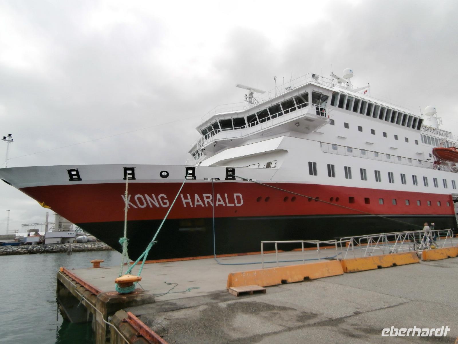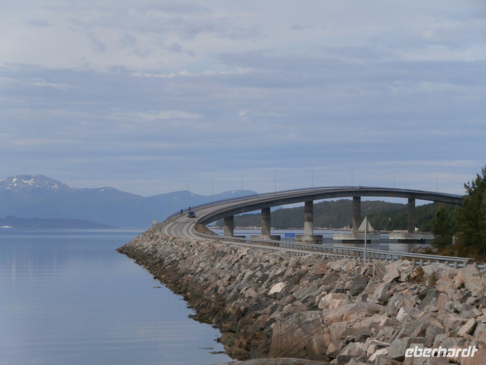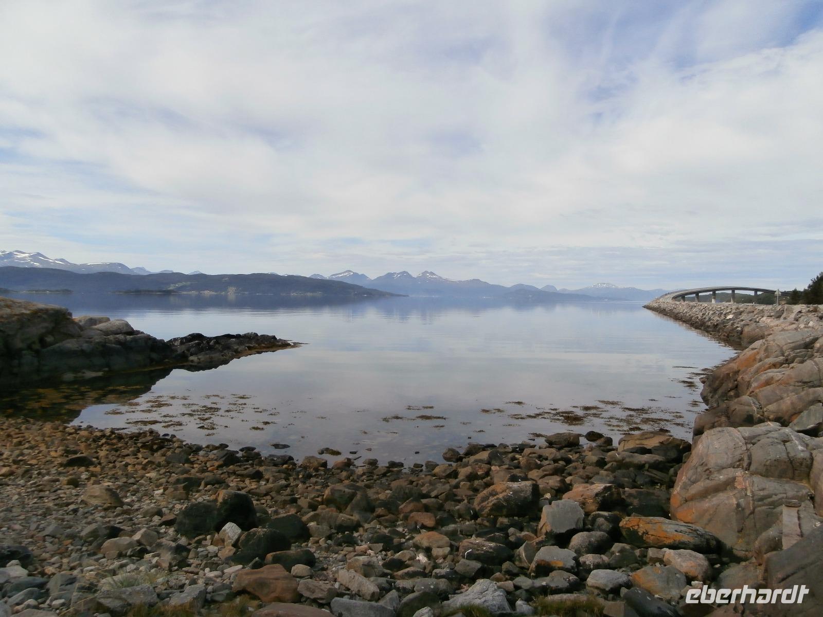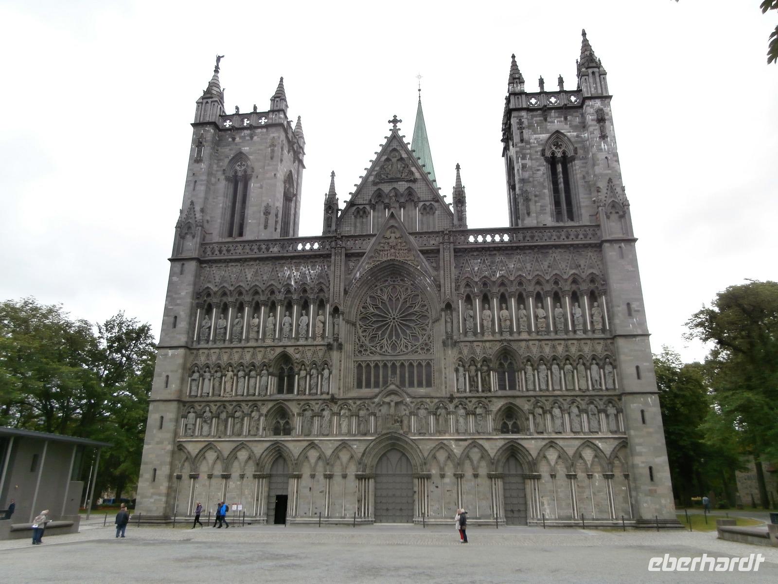 Heute Morgen werden wir mit bewölktem Himmel, aber trocken, geweckt. Das Frühstück im Hotel lässt keine Wünsche offen. Vom Hotel aus fahren wir gemeinsam zum Nidaros-Dom, er ist Skandinaviens größter und prächtigster Sakralbau, ihn besichtigen einige Reisegäste. Das reich verzierte Hauptportal ist sehenswert. Der Nidarosdom ist ganz in der Nähe der Gamle Bybrua-die alte Stadtbrücke, von ihr hat man einen schönen Blick auf die alten Speicherhäuser am Nidelv und die weiße Festung Kristiansten. Mit unserem Bus geht die Fahrt zum Hurtigrutenkai, gemeinsam gehen wir an Bord der M/S „Kong Harald" zur "Schönsten Seereise der Welt". Nun haben wir bis zum Nachmittag Zeit zum Relaxen, genießen die Atmosphäre an Bord und lassen die beeindruckenden Küsten und das weite, offene Meer an uns vorüber ziehen. Die Sonne kommt später hinter den Wolken hervor, fantastische Ausblicke in die Schären sind möglich. Falk erwartet uns im Hafen von Kristiansund mit Kaffee am Bus. Schnell noch ein Foto vom Hurtigrutenschiff und ein Spaziergang zur Klippfischfrau in Kristiansund. Zum nächsten Höhepunkt unserer Reise geht die Fahrt, auf der Atlantikstraße mitten durch die offene See und die markante Schärenlandschaft, führt die Tour mit unserem Bus. Wir fahren zuerst in einen langen, neuen Tunnel unter dem Fjord durch. Die Atlantikstraße präsentiert sich mit mehreren Brücken und Dämmen in toller Form auf einer Länge von über 8 km. Wir legen einen Fotostopp ein und können wunderschöne Aussichten im Sonnenschein und bei azurblauem Himmel genießen. Weiter geht die Fahrt nach Molde. In das Gebiet der Romsdalsalpen können wir schauen. Genächtigt wird heute in der "Stadt der Rosen" so der Beiname von Molde, das milde Klima verlieh ihr einst den Namen. Am späten Abend legen noch 2 Schiffe der Hurtigrute, unser Schiff „ Kong Harald" und „Nordnorge" in Molde an, was bei uns nochmal große Freude und das Fotografieren auslöst. 297 km