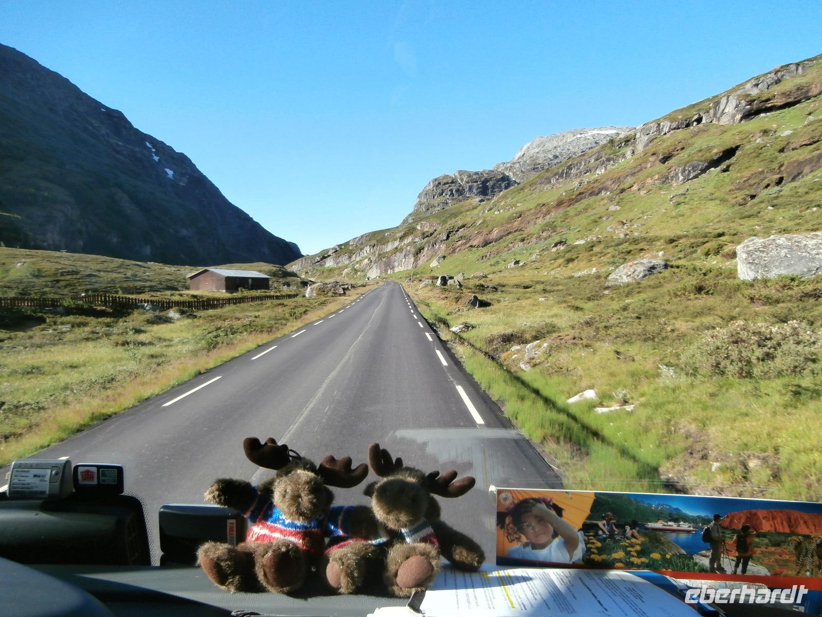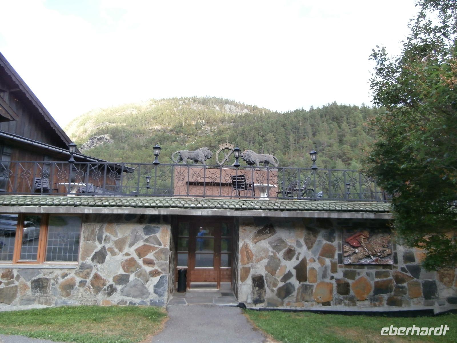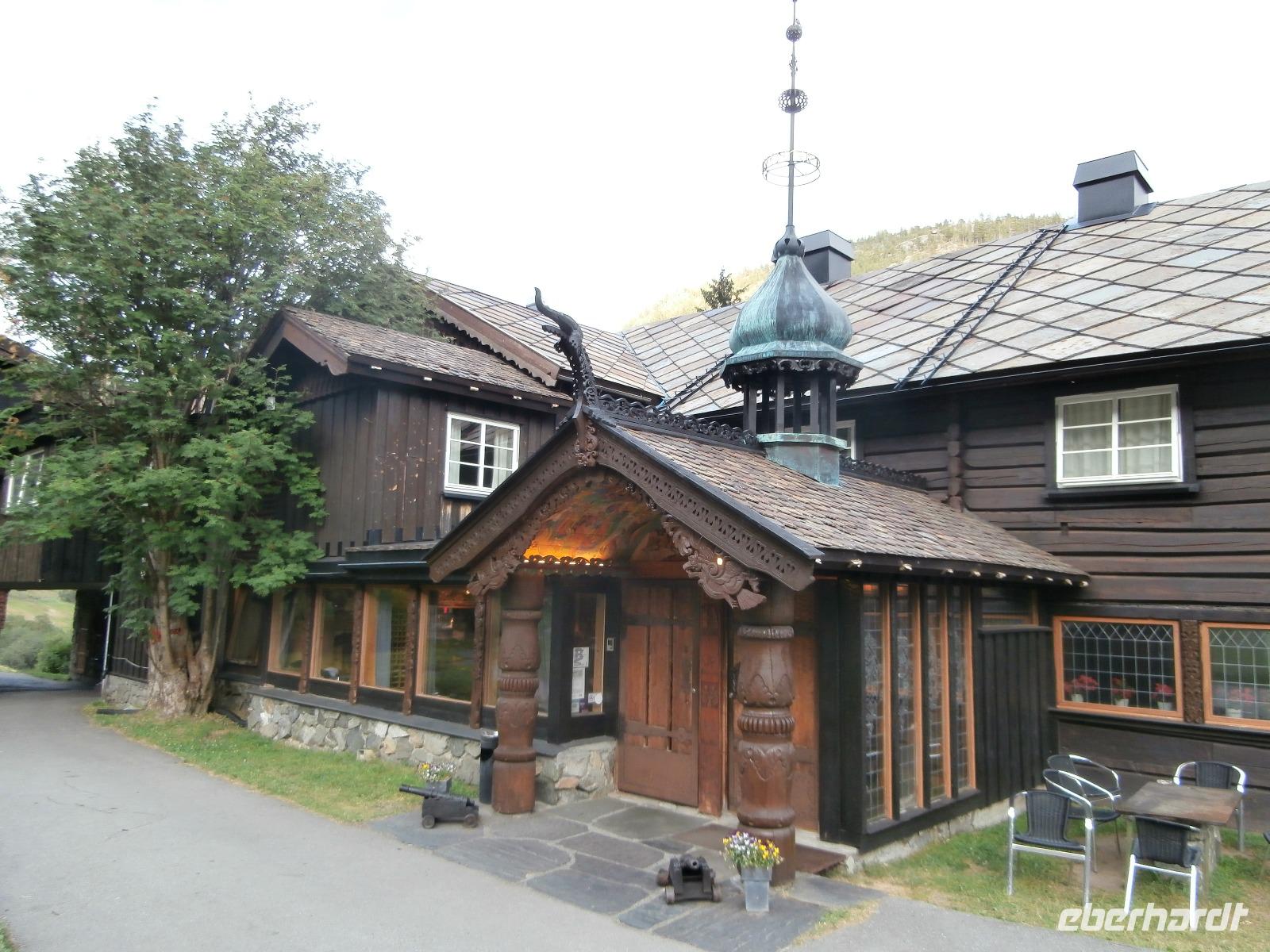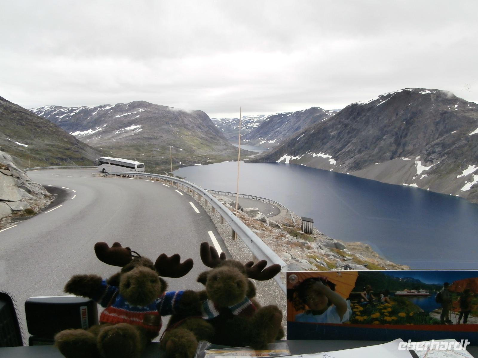 Unser Tagesprogramm startet bewölkt und regnerisch. Wir haben als Erstes eine kurze Fährüberfahrt von Magerholm nach Ørsneset. Sonne und etwas Blau am Himmel, schön ist unsere Fahrt mit Blick in teilweise sichtbar werdende Berge und so erreichen wir Hellesylt. Der Start für die Kreuzfahrt auf dem Geirangerfjord steht als Höhepunkt auf dem Programm. Mit Sonne und fast windstill beginnen wir die Minikreuzfahrt im Geirangerfjord. Er zählt wohl zu den schönsten und meistbesuchten Fjorden mit bis zu 800 Meter hohen Felswänden zu beiden Seiten und den in die Tiefe tosenden Wasserfällen mit Namen "Die sieben Schwestern" oder "Der Freier". In Geiranger verlassen wir die Fähre und hier liegen zwei Kreuzfahrtschiffe im Hafen. In mächtigen Spitzkehren mit einigen Bussen im Gegenverkehr schrauben wir uns durch das Bergmassiv. Bei einem Fotostopp weit oberhalb vom Geirangerfjord genießen wir atemberaubende Blicke in den smaragdgrünen Fjord, auf die Adlerstraße und die Kreuzfahrtschiffe. Unsere Fahrt geht immer weiter auf der im Jahre 1885 fertiggestellten Straße RV 63 mit 8% Steigung, 20 engen Kehren und 1000m Höhenunterschied. Es wird auf der ca. 17 km langen Strecke vom Fjord wegführend rauer, ein mit etwas Schnee durchsetztes Gebirgsklima empfängt uns in der Höhe. An der Djupvathytta auf 1038m verweilen wir, unser Mittagessen aus dem Bus lassen wir uns hier schmecken. Der Blick auf den gleichnamigen See ist sehr schön. Bei schönem Wetter laden wir unsere Gäste zur Fahrt auf der mautpflichtigen Passstraße zum Dalsnibba ein. Teilweise geben die Wolken den Blick auf Berge und hinunter zum Geirangerfjord frei. Über Grotli, vorüber an einigen großen Seen, fahren wir durch das Ottadalen. Bei einem Picknick mit Rentier- und Elchsalami sowie Multe Marmelade und Knäckebrot und Kaviar begeistern wir unsere Gäste mit einheimischen Produkten. Einen Fotostopp in Dönfoss am Campingplatz mit Schwimmbad und der wilden Otta leisten wir uns bei angenehmen Temperaturen. Bis hinein nach Lom geht es nun, die Stabkirche besichtigen wir bei einer Führung. Lars gibt uns Einblicke in die einzigartige Holzbauweise mit liebevollen Details, wie z.B. die Drachenköpfe an den Giebeln, aber auch viel zur Geschichte erfahren wir von ihm. Von Lom weg fahren wir noch bis zum Elveseter Turisthotel. Hier wohnen wir heute fast wie im Museum. Mit viel Liebe haben die Besitzer wertvolle Gegenstände zusammengetragen und fabelhaft die Räume gestaltet. Eine alte Sagasäule steht am großen Platz und gibt Einblicke in die norwegische Geschichte. Heute ruhen wir am Busen der Natur, ein großer Bach fließt direkt am Hotel vorüber. 236 km