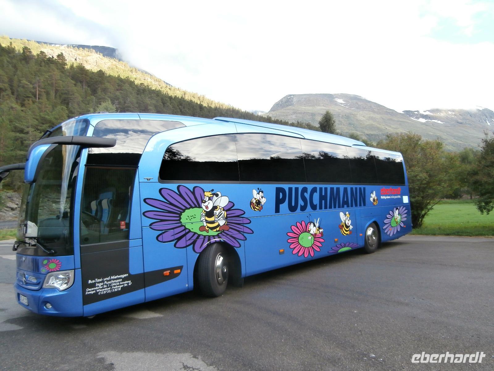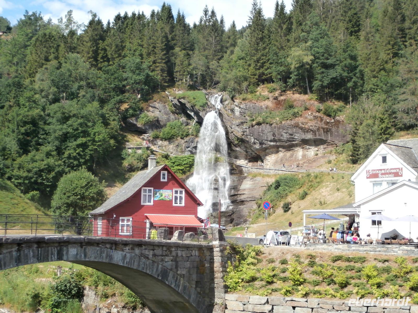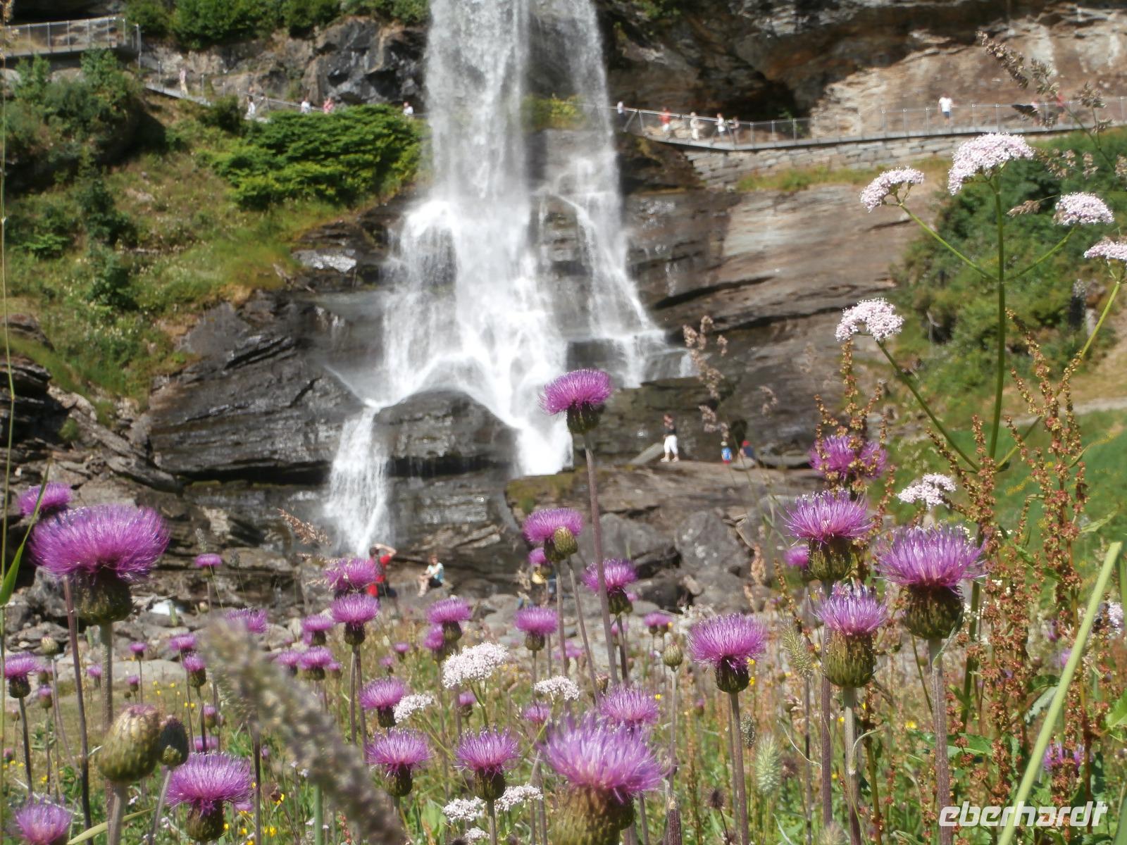 Mit unserem Reiseleiter Matthias Klemenc erleben wir heute Morgen die Stadtrundfahrt durch Bergen und die Führung im hanseatischen Viertel. Die Stadt ist fast schon südländisch geprägt, versprüht ein maritimes Flair-hier ist auch der Anfang der Linie der Hurtigruten und mit der Bergenbahn fährt man von hier bis in den Osten nach Oslo. Während der Hansezeit war sie die größte Stadt Skandinaviens. Die Freizeit in Bergen beenden wir bei Sonnenschein und Wärme, wir verlassen Bergen und setzen die Fahrt entlang des Hardangerfjordes fort. Am Steindalsfossen lassen wir unsere Gäste mal hinter einen Wasserfall schauen, die Legende sagt: Wer sich hier küsst, soll die ewige Liebe verspüren. Die Fahrt auf der Neuen Brücke über den Hardangerfjord bringt uns weg aus Fjordnorwegen bis hin zum Dach dieses Traumlandes. Wir schrauben uns in einem gewaltigen Tunnelsystem im Mabödalen nach oben und bei Sommerwetter und guten Sichtverhältnissen erleben wir heute den Wasserfall Vøringfossen, er ergießt sich in eine Schlucht, 182m im freien Fall. Die neue Zuführung zum Wasserfall ist fertig gebaut, ein fantastisches Besucher Plateau ist entstanden und der Blick zum Wasserfall gigantisch. Leichter Regenfall ist nur von kurzer Dauer. Die Straße Nr.7 bringt uns direkt durch das weite Gebiet der Hardangervidda, diese beeindruckende Hochebene präsentiert sich als eine seen- und moorreiche, fast baum-und strauchlose Fjell-Landschaft. Wir können heute den Gletscher Hardangerjokülen wunderbar sehen, Falk stoppt für ein tolles Foto extra den Bus. Am Samenshop schauen wir noch in die Hütte, hier hat es tolle Sachen. Zu kaufen gibt es Rentierfelle, Geweihe und auch tollen Silberschmuck. Durch Geilo-auch das "Zermatt Norwegens" genannt, fahren wir weiter nach Noresund. Im Sole Hotel Gjestegard übernachten wir ein letztes Mal in Norwegen. Am See Kröderen lassen wir bei angenehmen Temperaturen diesen langen Sommertag ausklingen. 418 km
