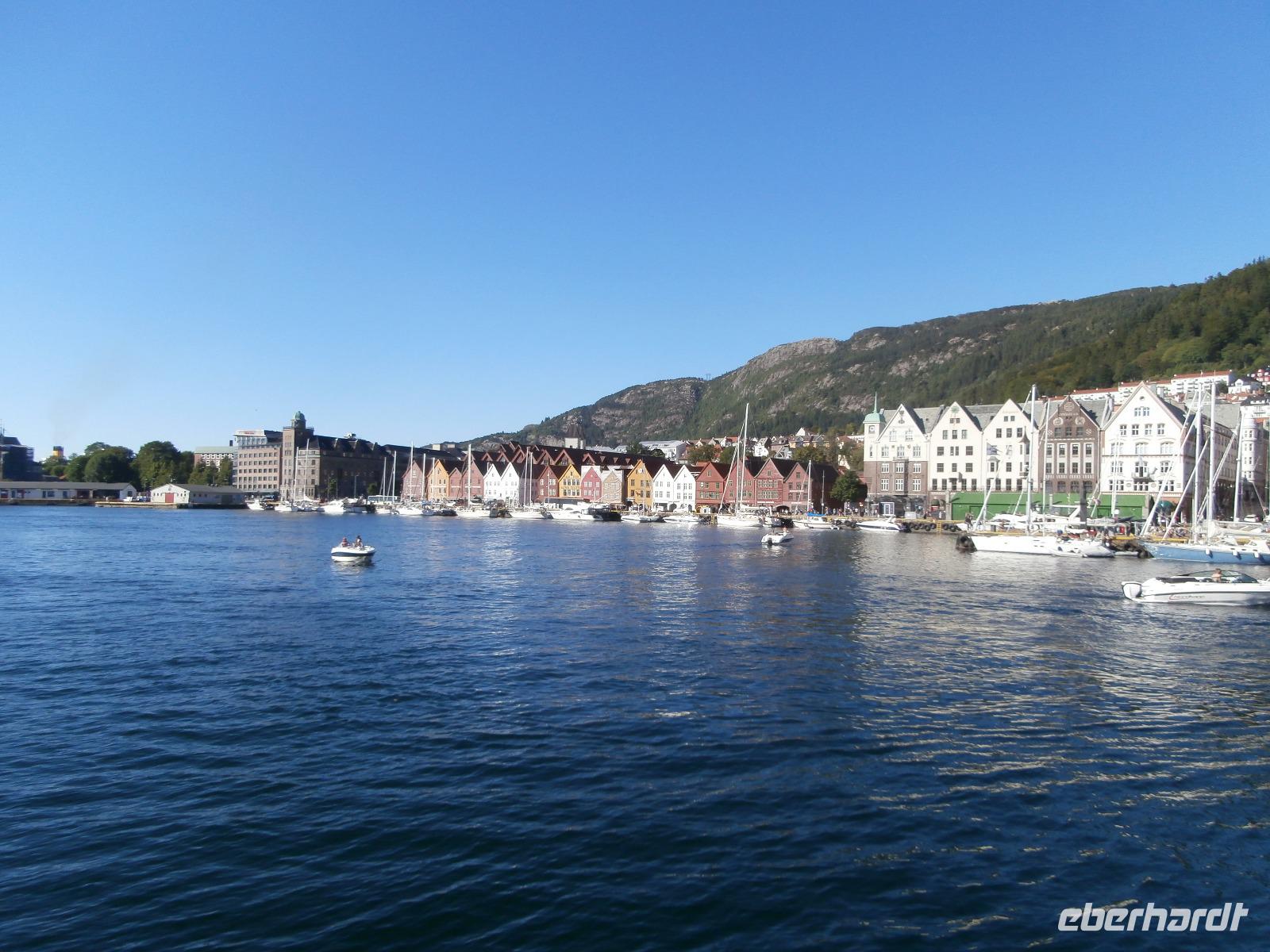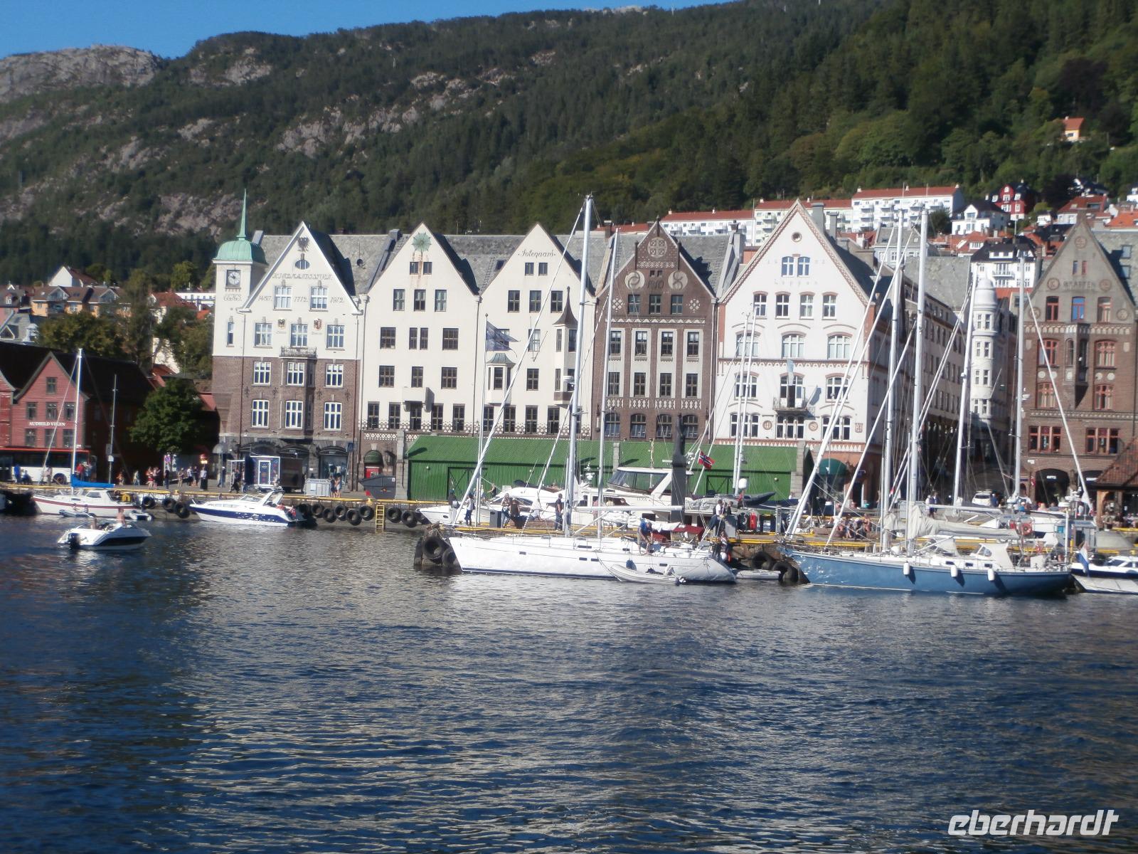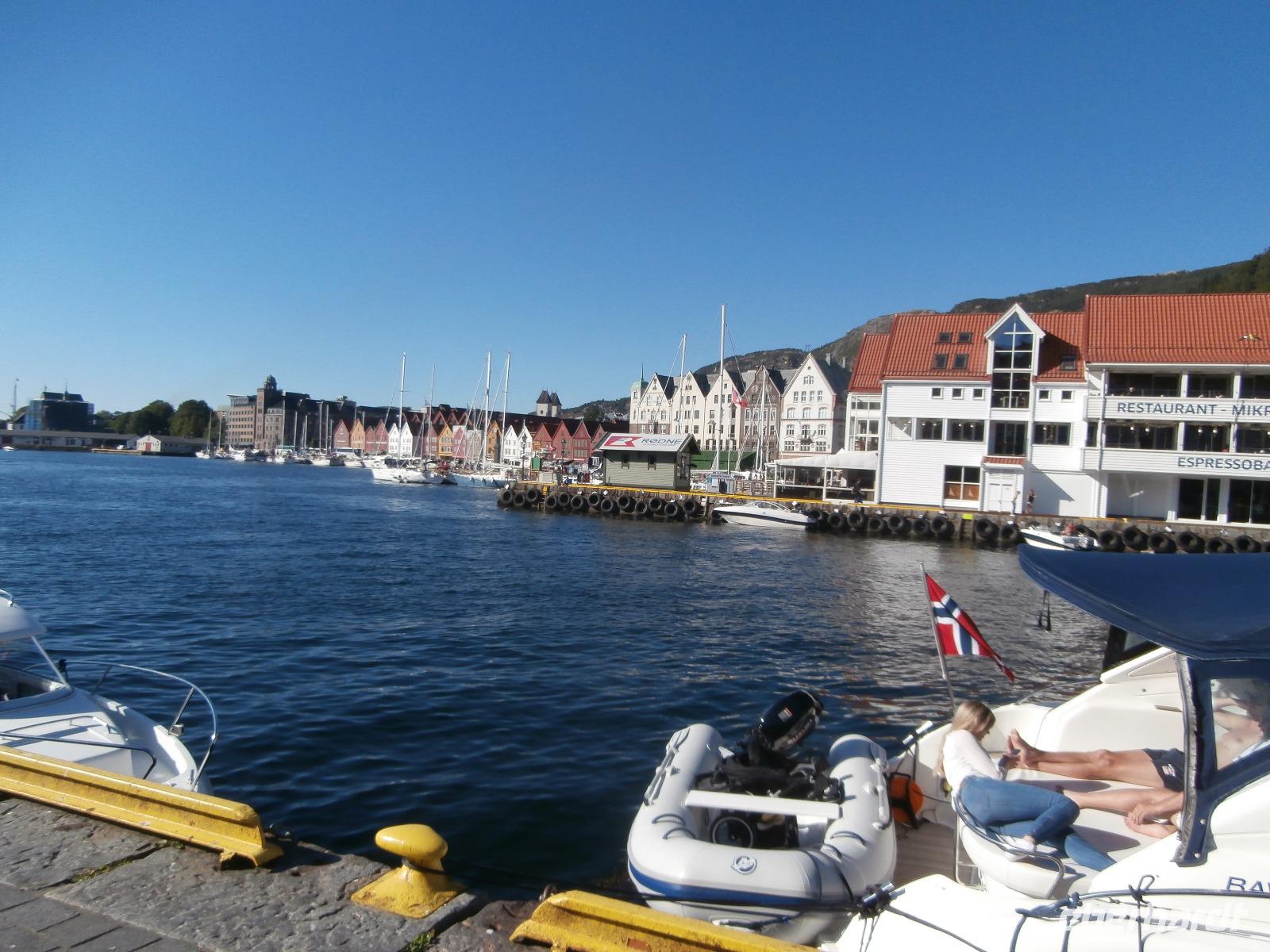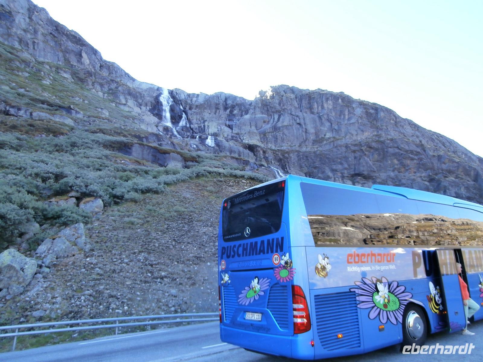 Im Hotel Elveseter starten wir bei Sonnenschein und azurblauen Himmel. Durch den Nationalpark Jotunheimen, er besteht schon seit 1980 und ist Heimat der 2 höchsten Gipfel Norwegens-der Galdhöpiggen mit 2468m und der Glittertind mit 2452m, geht die Fahrt weiter auf dem Sognefjellvegen. Unser fantastisches Sommerwetter läßt viele Fotostopps zu, begeistert lassen wir unsere Reisegäste im Sognefjell die Panoramen einfangen. Wir gelangen vorbei an Skjolden nach Luster am Lustrafjord und auch am Fjord hält Falk mit dem Bus zum Fotografieren an. Weiter geht die Fahrt vorbei an Kaupanger an den Sognefjord. Er ist mit 204 km Länge auch der am Längsten und Tiefsten in das Festland hineingehende Fjord der Welt. In Mannheller nehmen wir die Fähre hinüber nach Fodnes. Heute führt uns die Route nach Bergen durch zahlreiche Tunnel, der Längste ist der Fjälandstunnel mit 24,5km. In Flam stoppen wir für unsere Mittagspause, zum Einkaufen und auch die Flambahn können wir einfahren sehen. Wir schauen ins Museum der Flam Bahn. Am fantastischen Wasserfall Tvindefossen legen wir noch einen Fotostopp ein, er hat in diesem Jahr wenig Wasser, denn der Sommer und die Trockenheit halten in Norwegen schon alle Weile an. 17 Uhr erreichen wir bei hitzigen Temperaturen Bergen, gelegen auf mehreren Inseln und gerahmt von 7 Bergen. Nach dem Abendessen gehen einige Gäste mit mir durch die Stadt bis zur Talstation des Fløyen. Mit der Standseilbahn fahren unsere Reisegäste hinauf und genießen die Sicht über die Stadt Bergen und in die Schärenwelt. 354 km