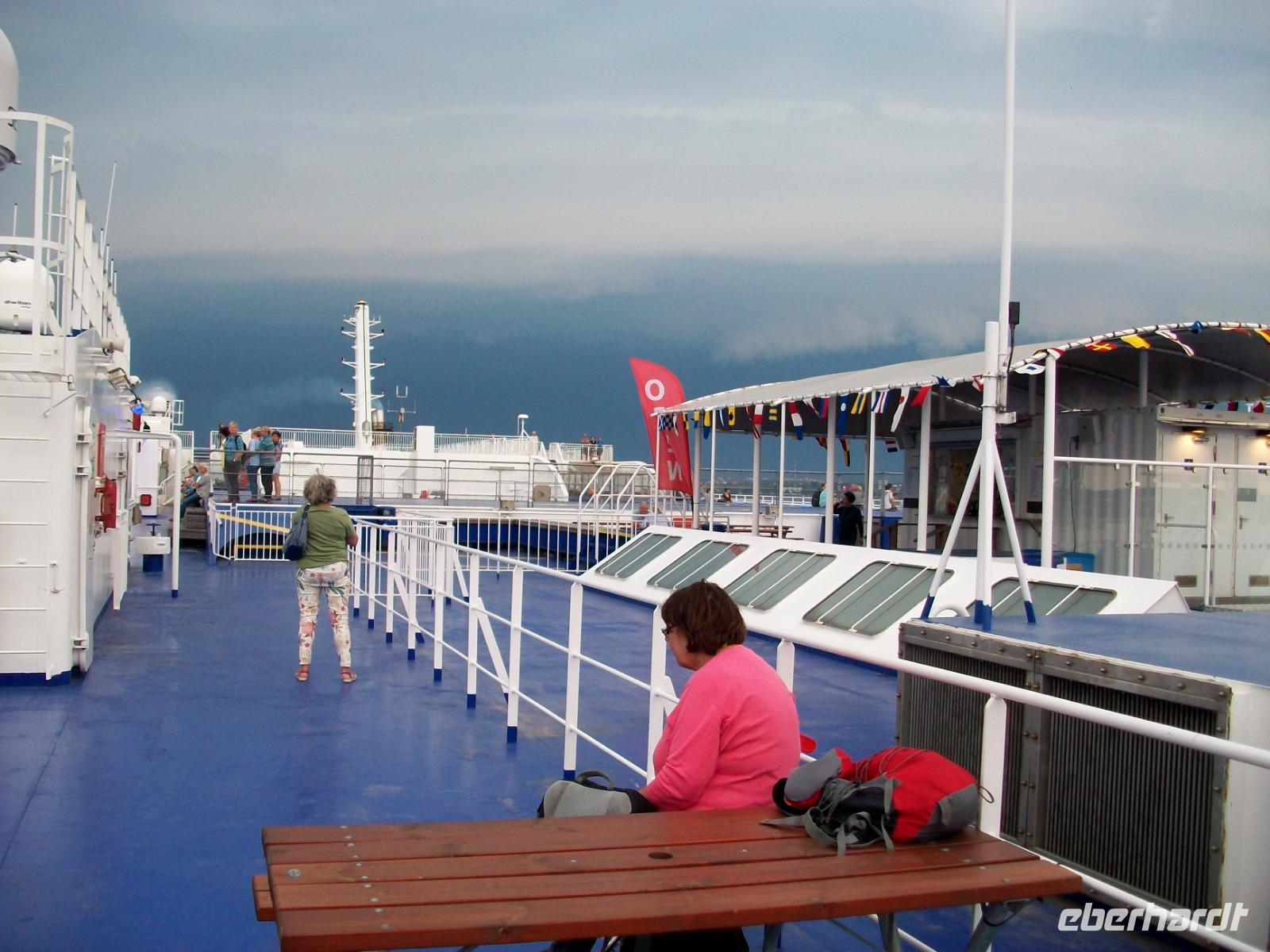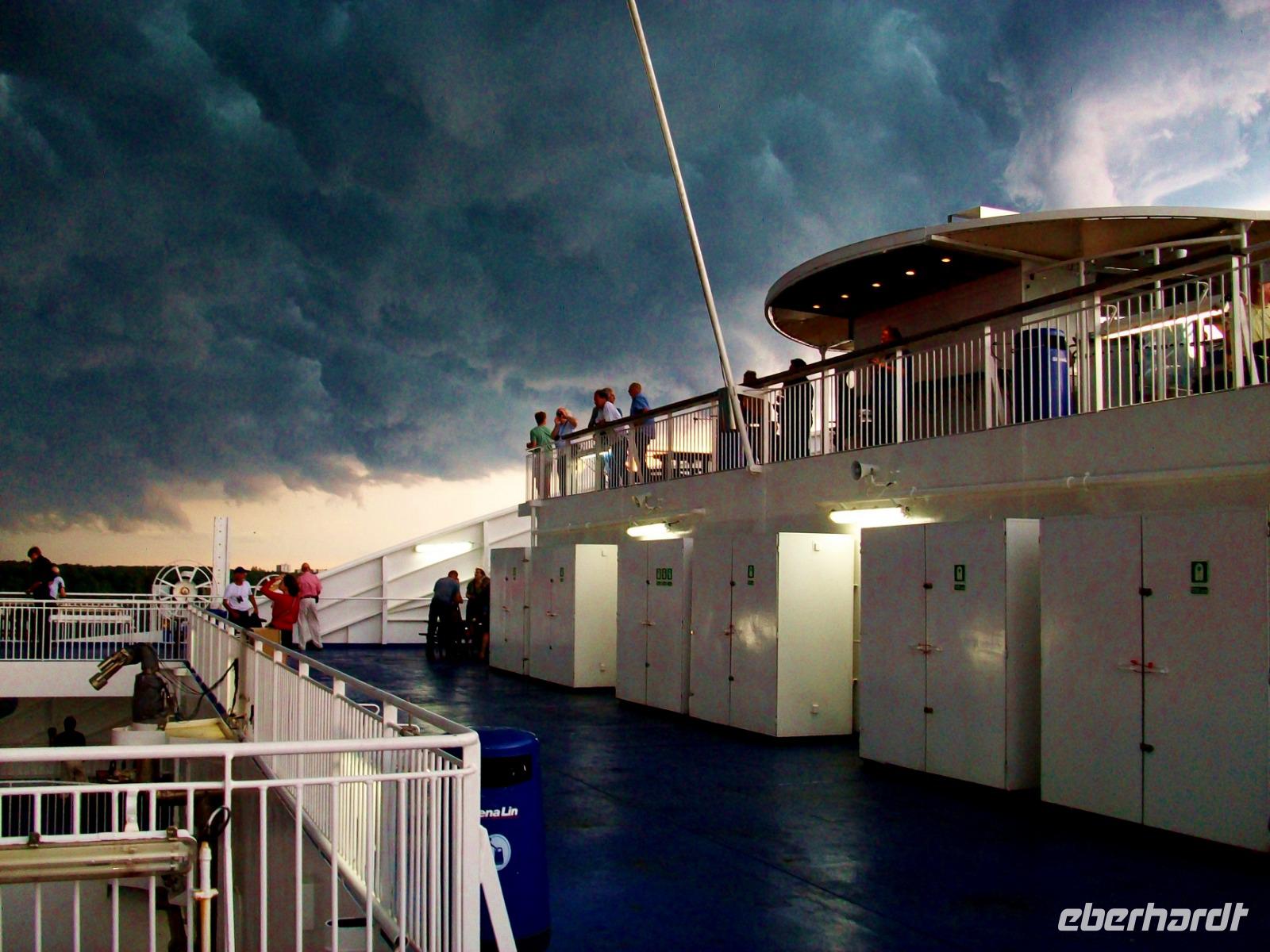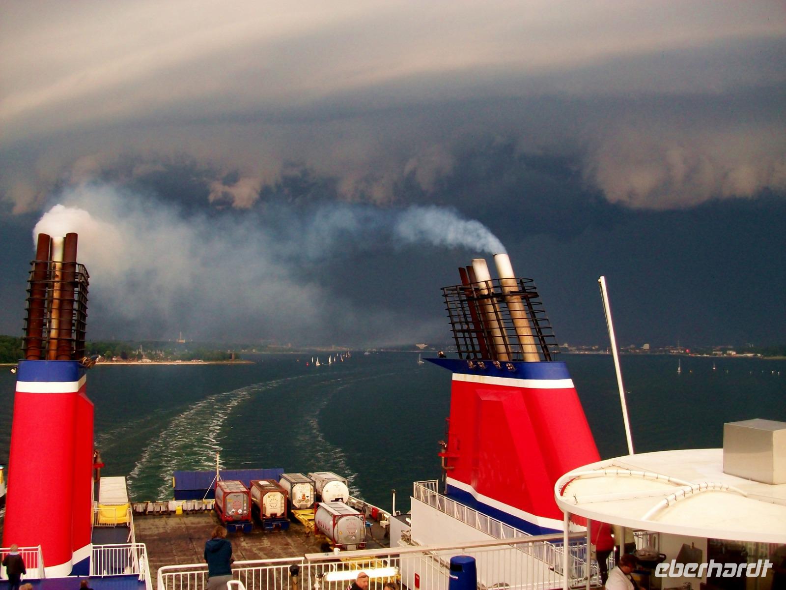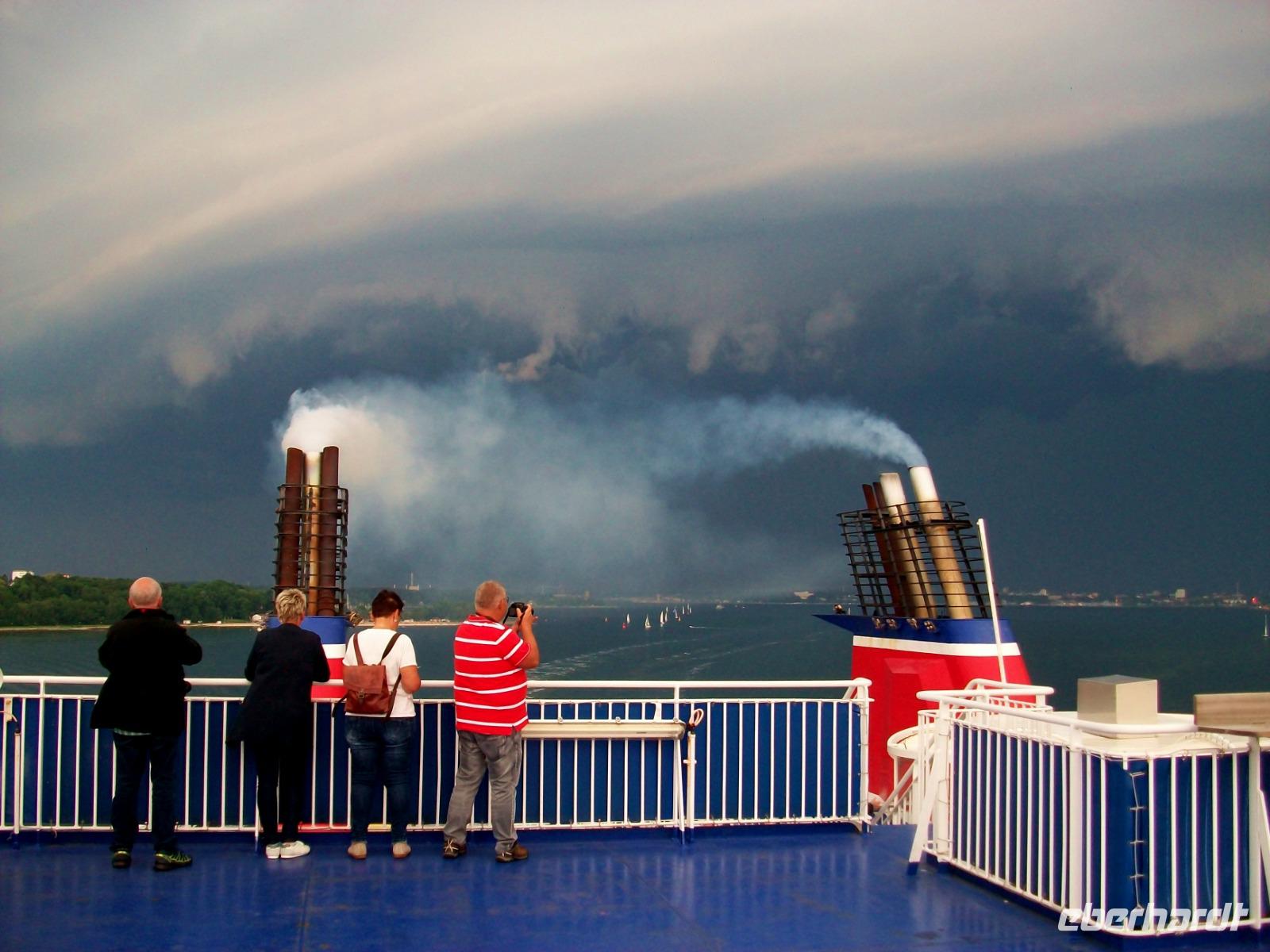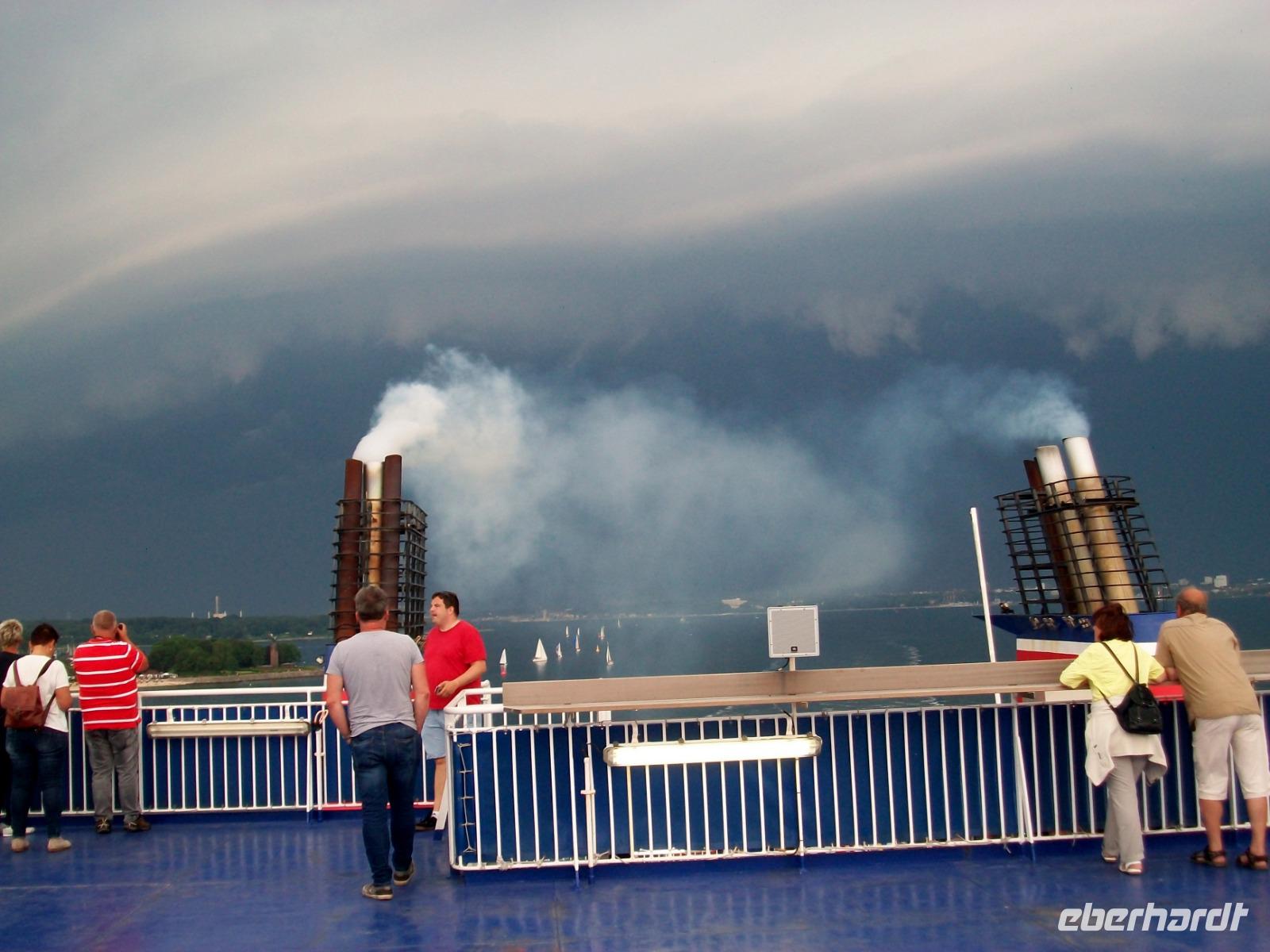 Hier erwartet uns ein reichhaltiges Abendessen vom Buffet und während wir es uns so richtig schmecken lassen, legt das Schiff ab und nimmt Kurs in Richtung Ostsee. Da lohnt später natürlich ein Gang hinauf aufs Deck; von hier sehen wir einiges von der Kieler Förde. Der Himmel hat sich unterdessen hinter uns gefährlich dunkel eingefärbt, Blitze zucken und bald hat uns die Front eingeholt, dennoch ein beeindruckendes Erlebnis am Ende dieses Tages.