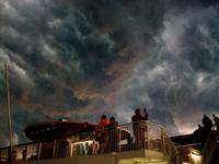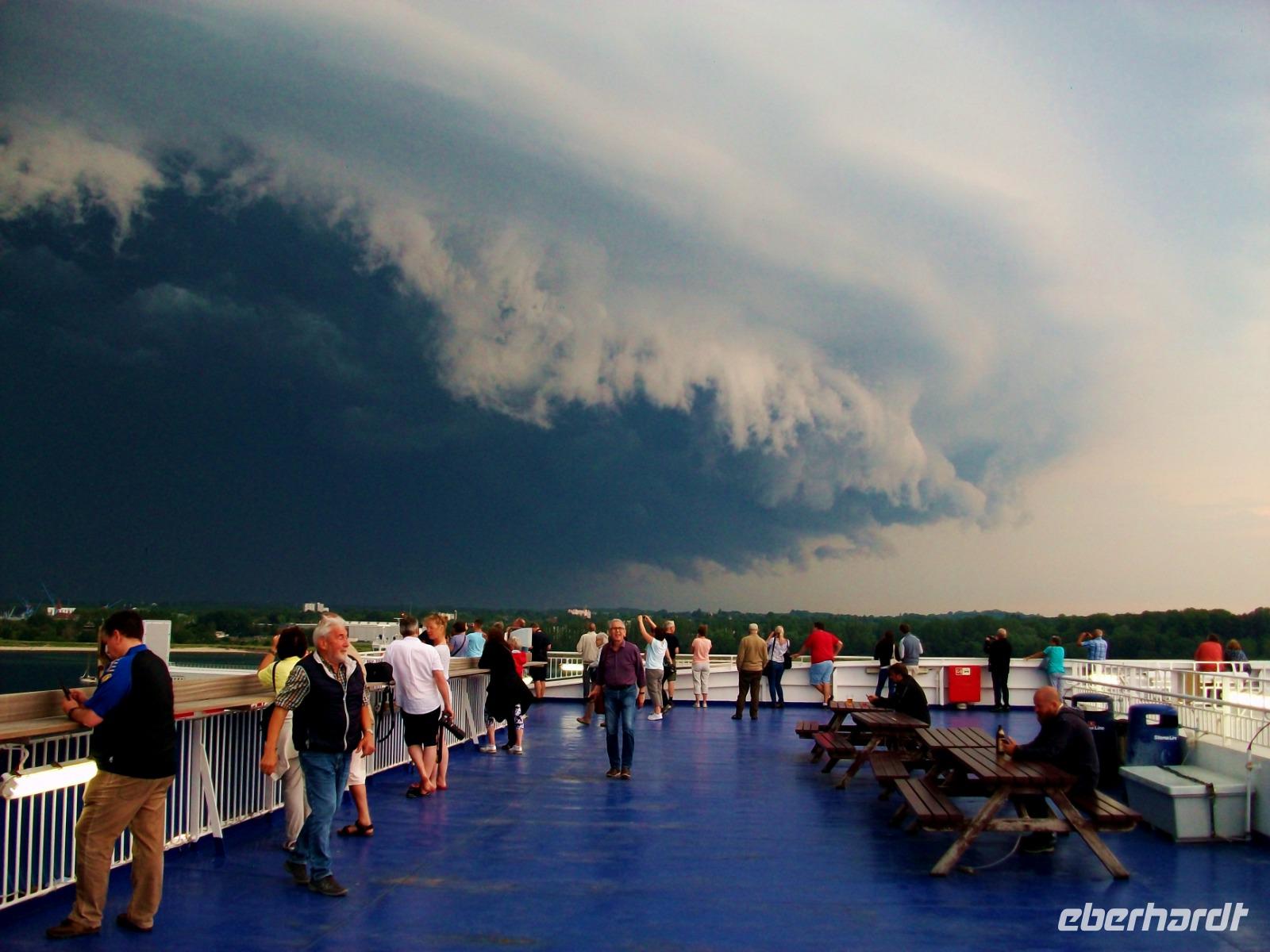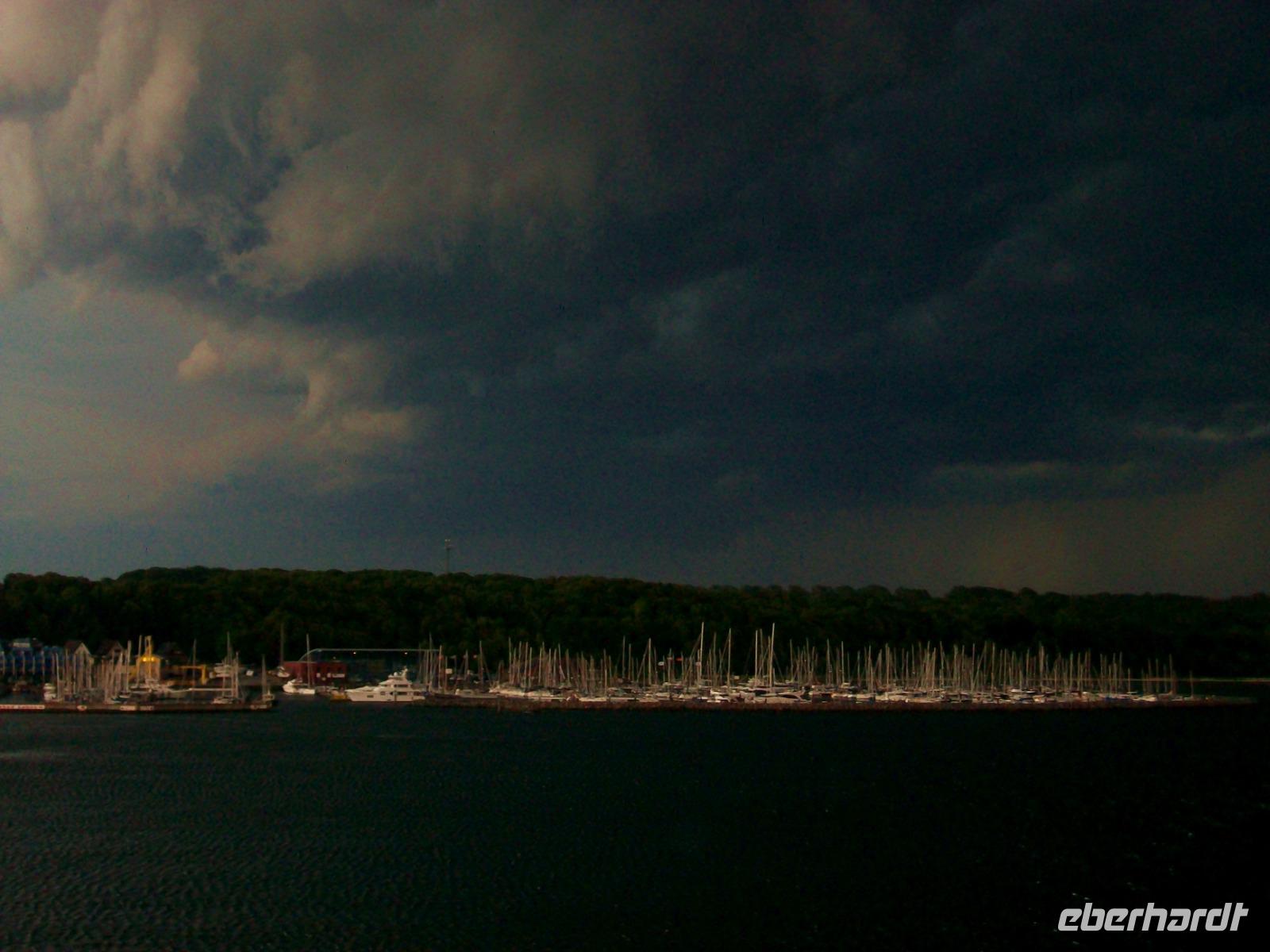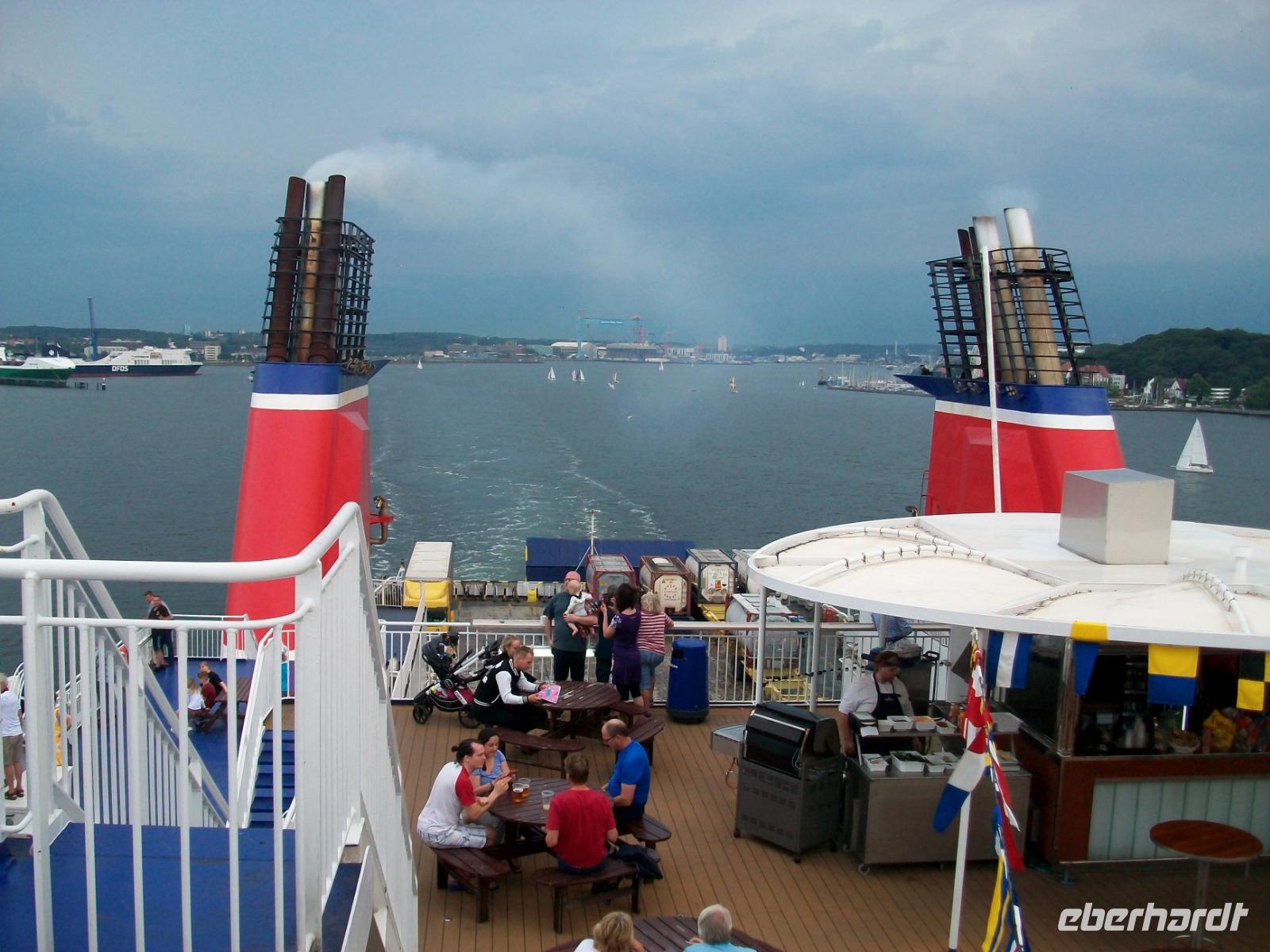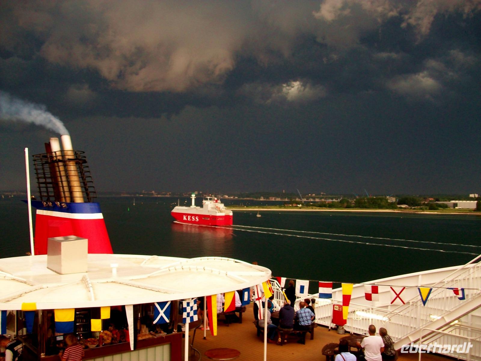 Hier erwartet uns ein reichhaltiges Abendessen vom Buffet und während wir es uns so richtig schmecken lassen, legt das Schiff ab und nimmt Kurs in Richtung Ostsee. Da lohnt später natürlich ein Gang hinauf aufs Deck; von hier sehen wir einiges von der Kieler Förde. Der Himmel hat sich unterdessen hinter uns gefährlich dunkel eingefärbt, Blitze zucken und bald hat uns die Front eingeholt, dennoch ein beeindruckendes Erlebnis am Ende dieses Tages.