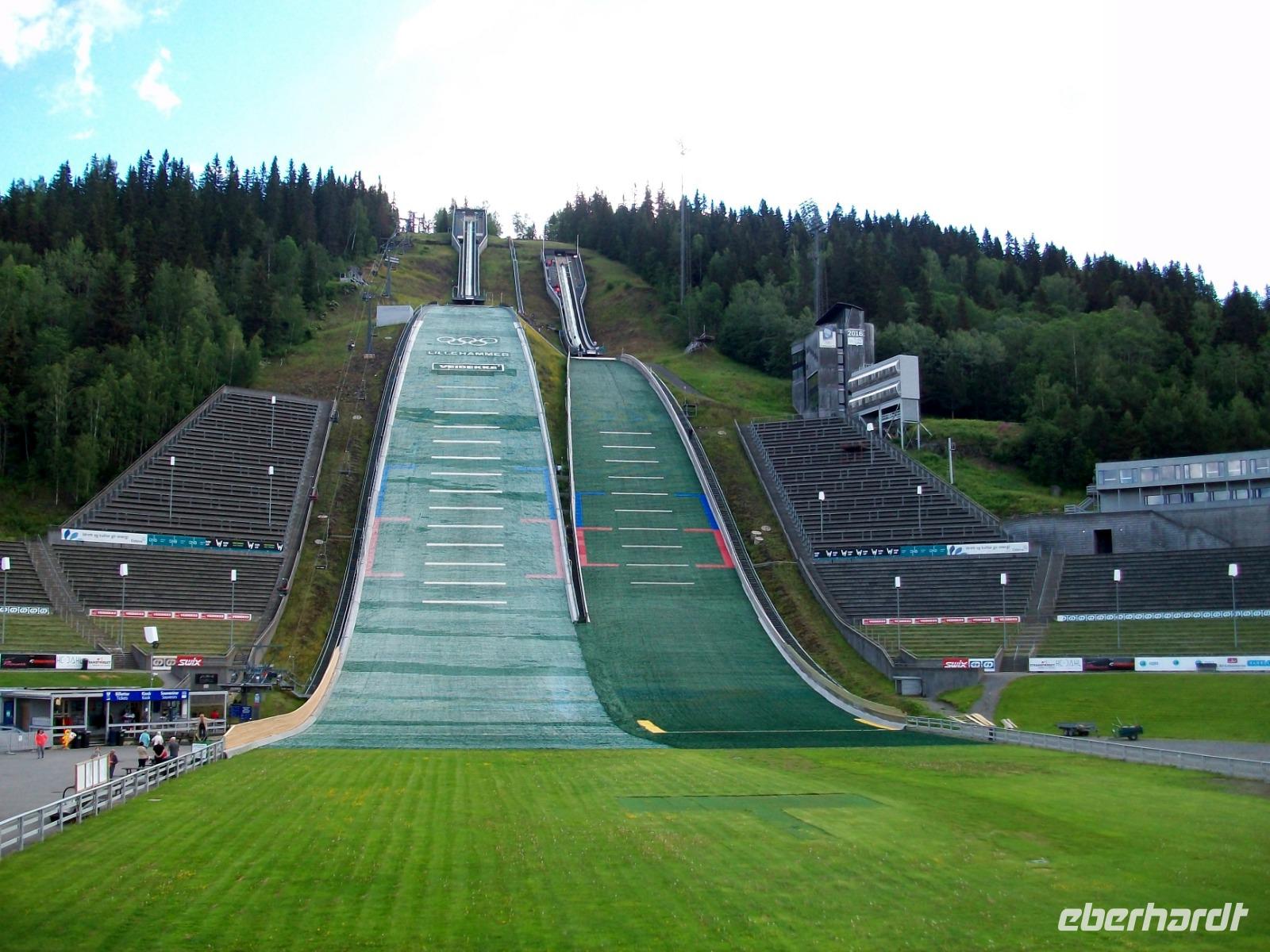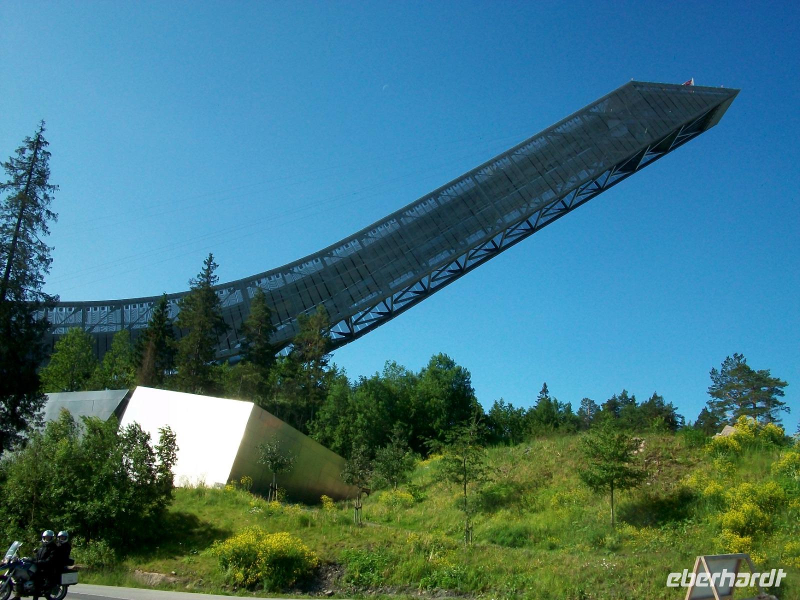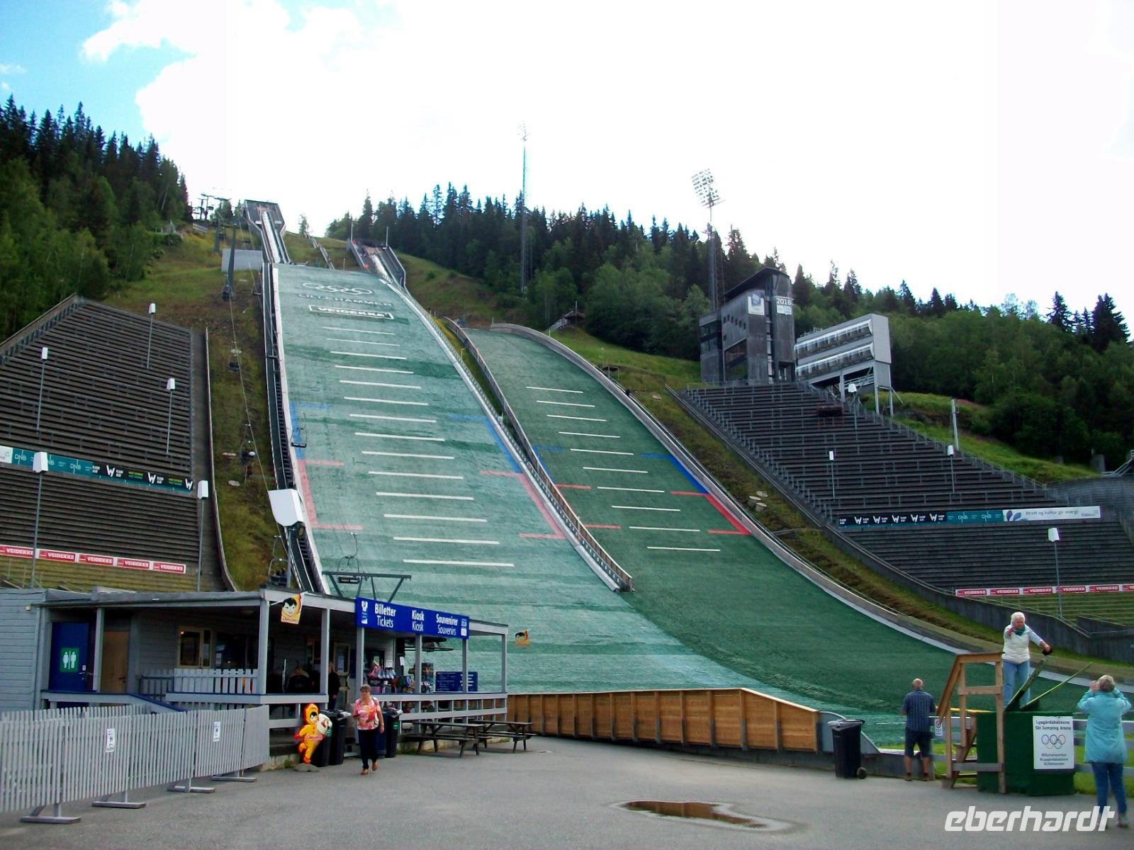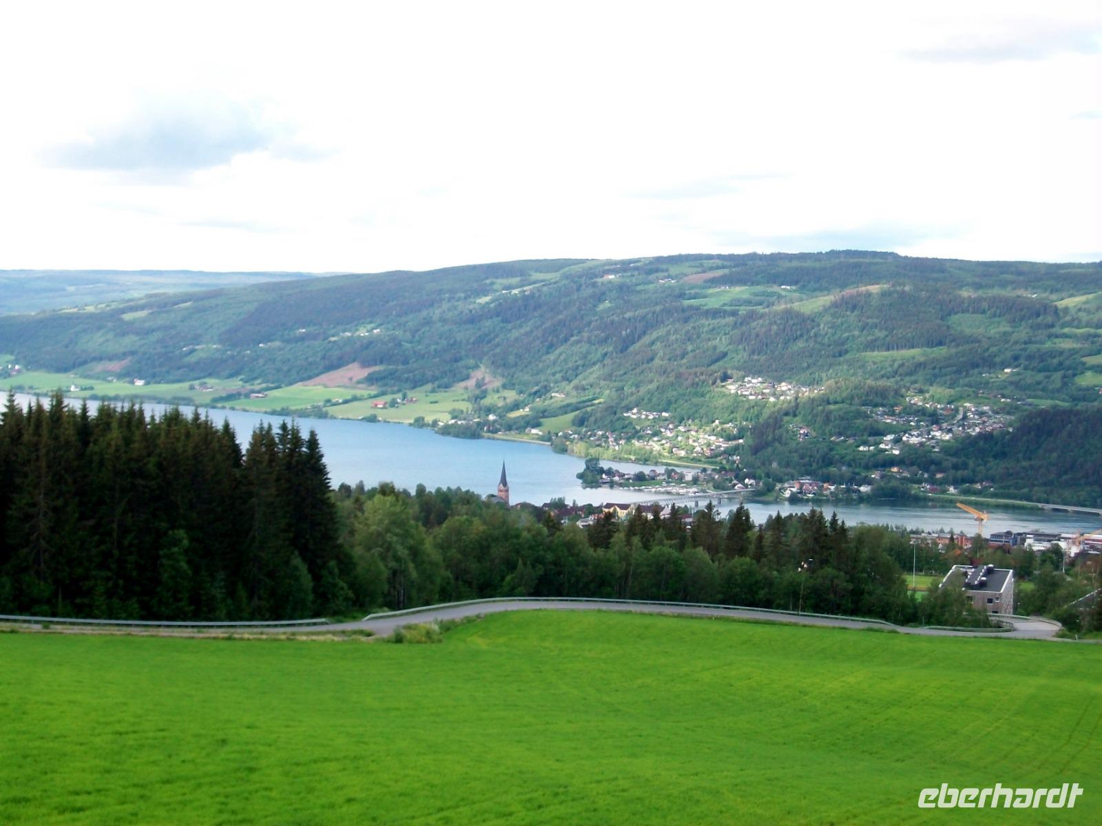 21.6.2019. Ein langer Tag steht uns heute bevor, aber auch ein sehr ereignisreicher! Als wir starten lacht nun endlich auch mal die Sonne und wir machen uns auf um zunächst einmal noch ein Stück am Miøsa - See entlang zu fahren. Bald sehen wir aber sein Ende und hier den bekannten Wintersportort Lillehammer. In diesem beschaulichen Ort fanden 1994 die Olympischen Winterspiele statt und die Sprungschanzen legen heute noch Zeugnis davon ab. Das lassen wir uns keinesfalls entgehen und somit nehmen wir Kurs auf das Skistadion. Grandios ist der Blick von hier oben ins Tal, beeindruckend die Schanzen und bewundernswert der Mut der Sportler die hier springen.