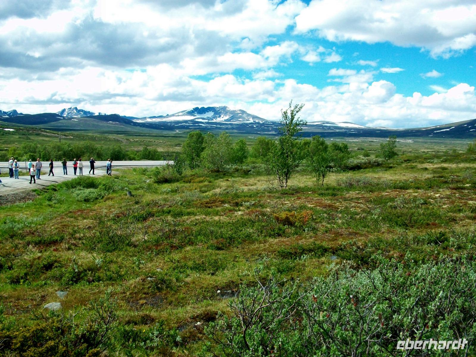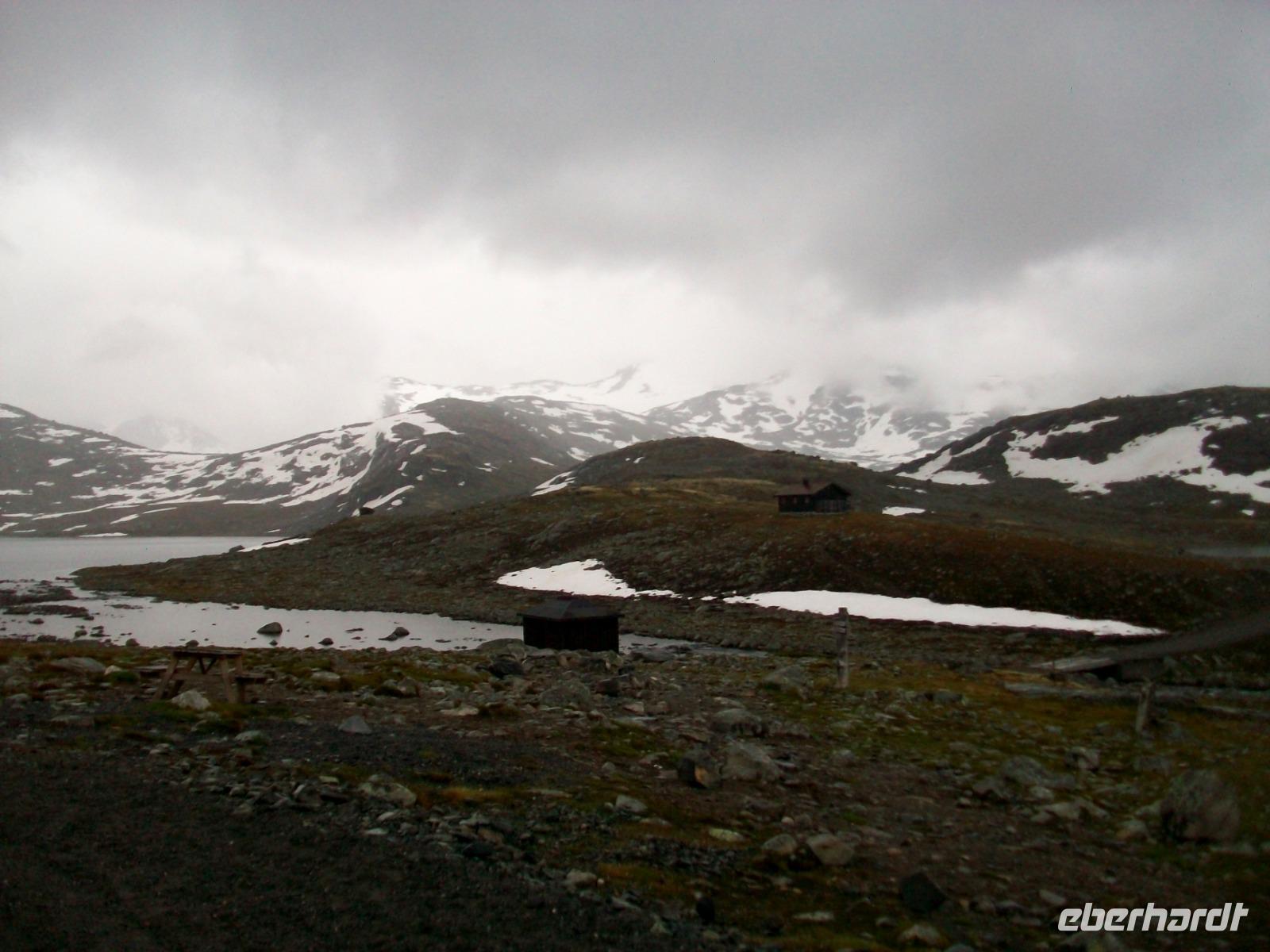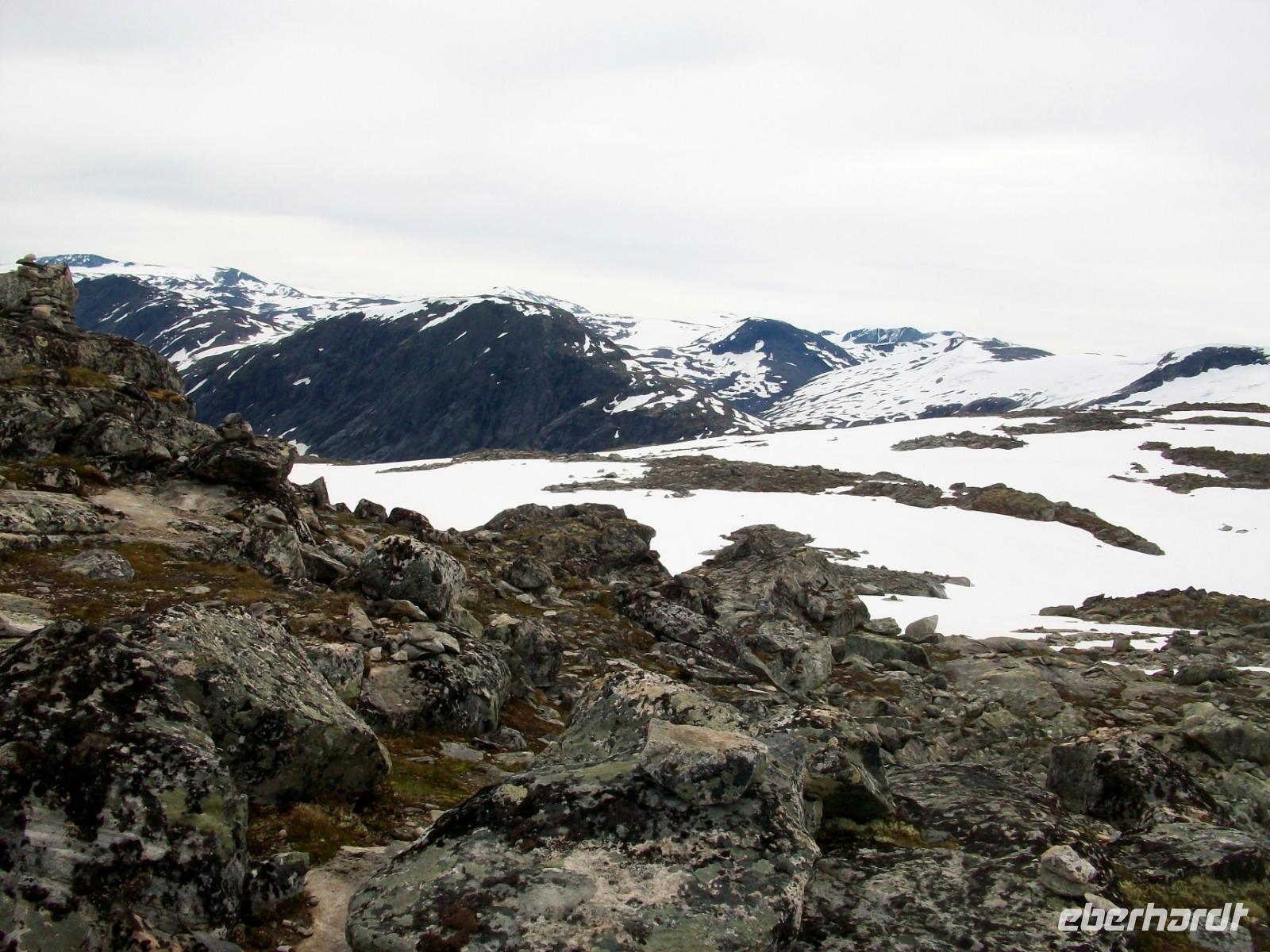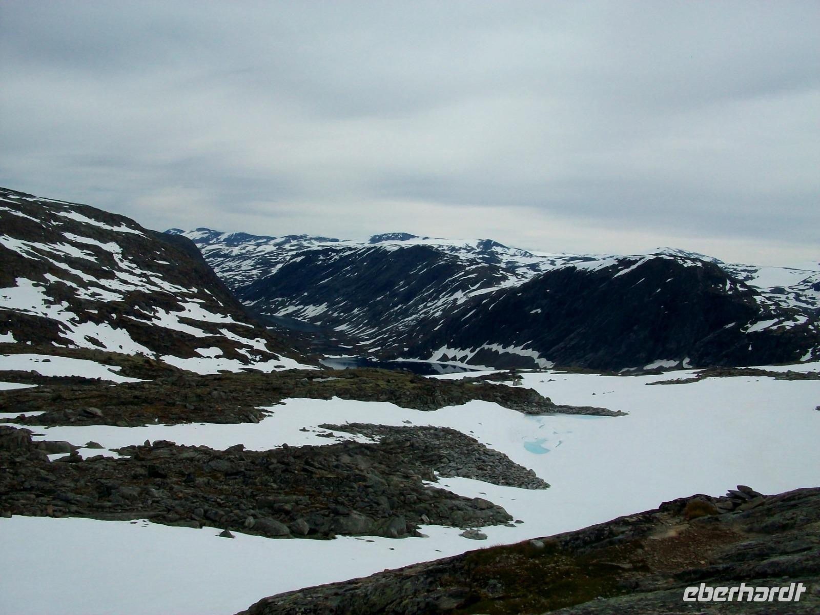 Dann steigen wir ein letztes Mal auf dieser Reise zu einem Fjell auf, es ist die Hardangervidda. Eine unendlich scheinende Hochebene mit karger Vegetation zeigt sich uns hier, durchflossen von kleineren Flüssen und bedeckt mit Schneeinseln.