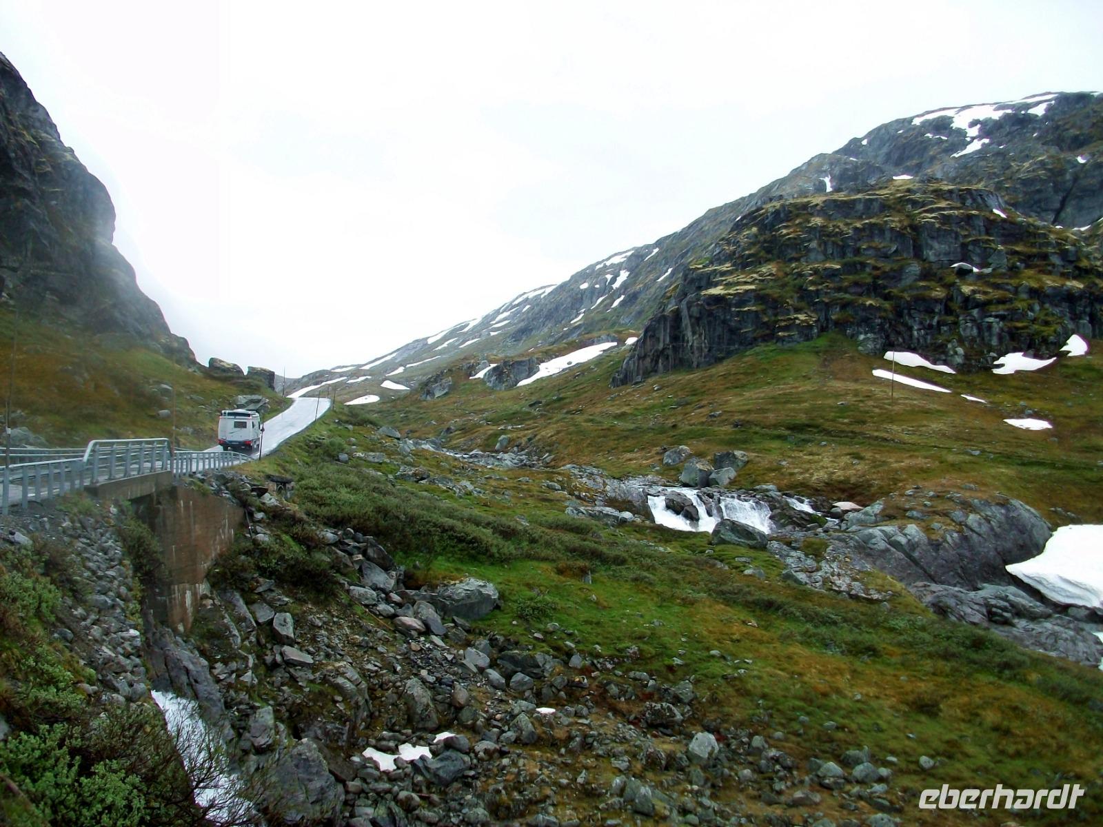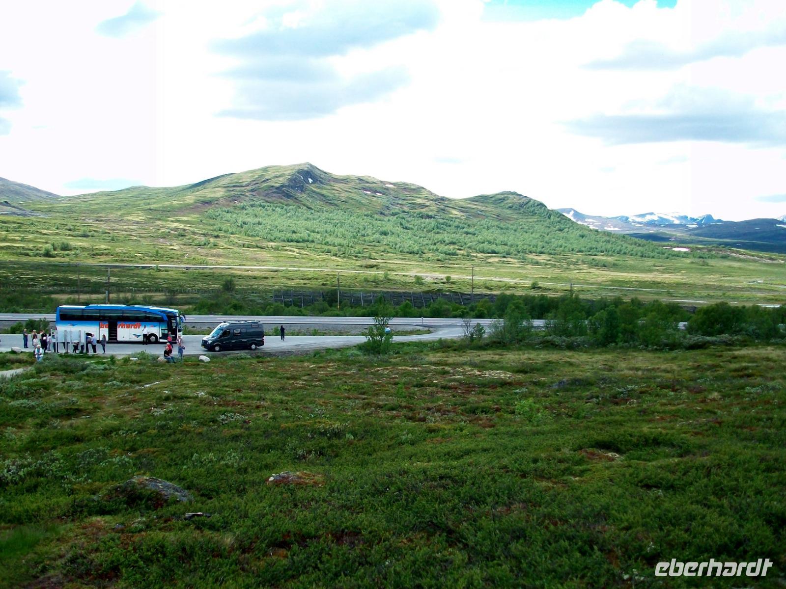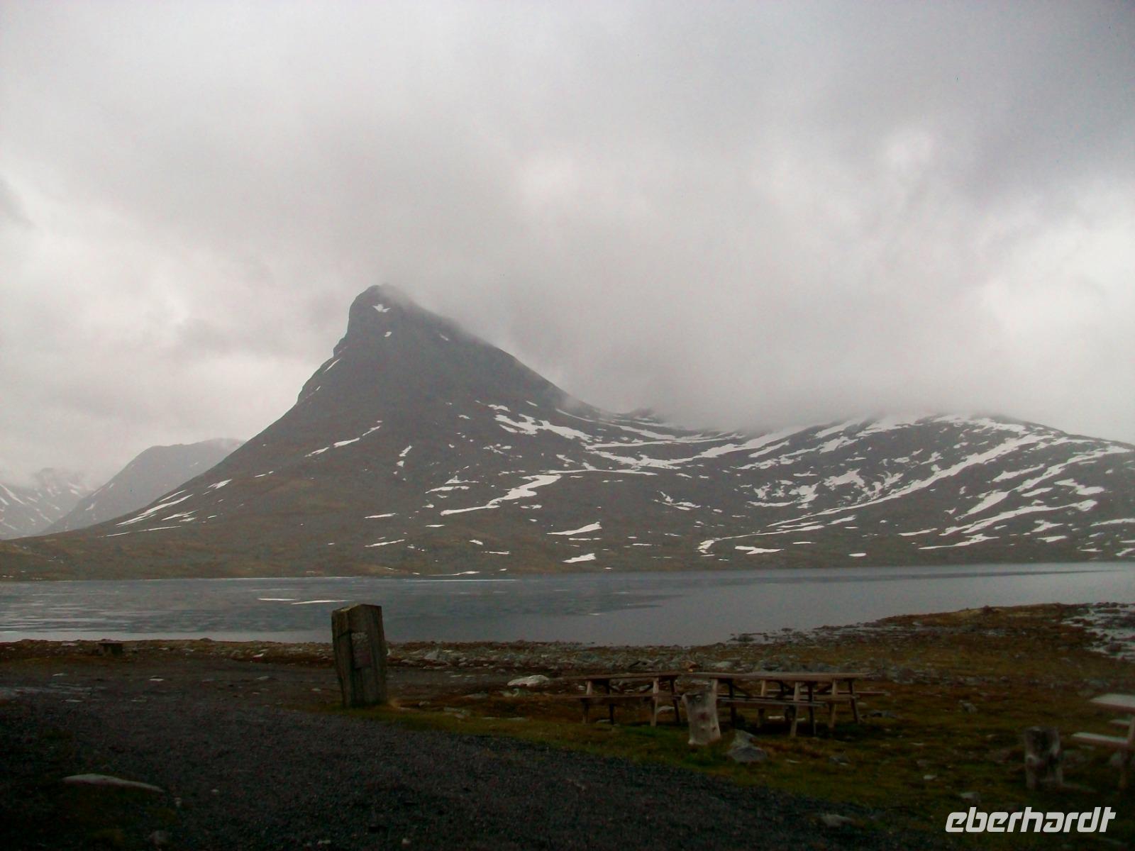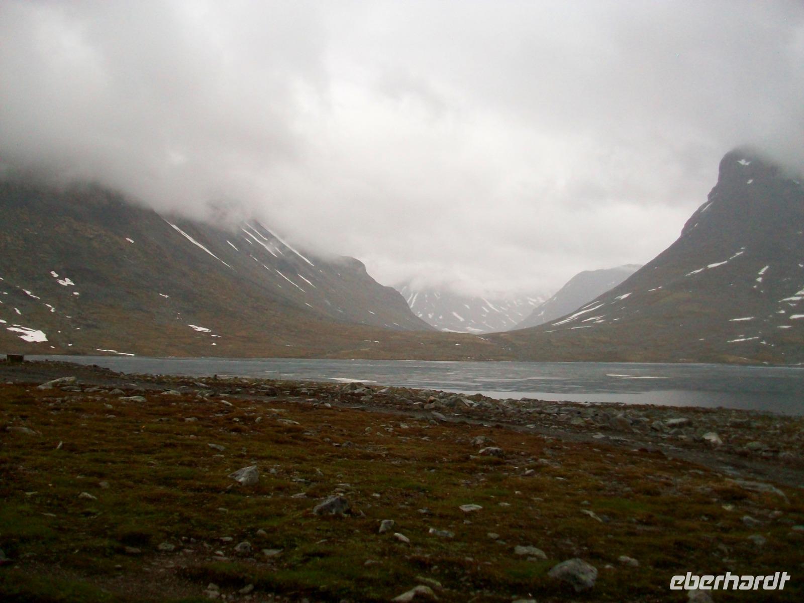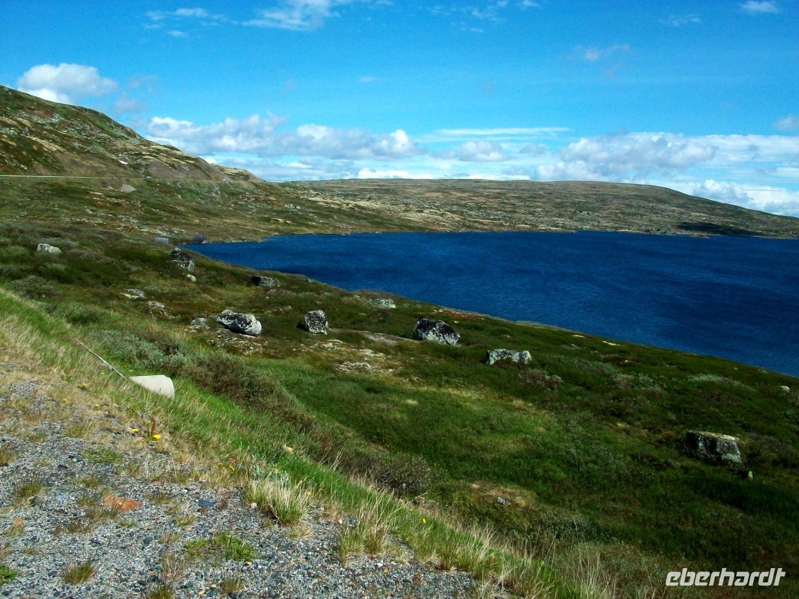 Dann steigen wir ein letztes Mal auf dieser Reise zu einem Fjell auf, es ist die Hardangervidda. Eine unendlich scheinende Hochebene mit karger Vegetation zeigt sich uns hier, durchflossen von kleineren Flüssen und bedeckt mit Schneeinseln.