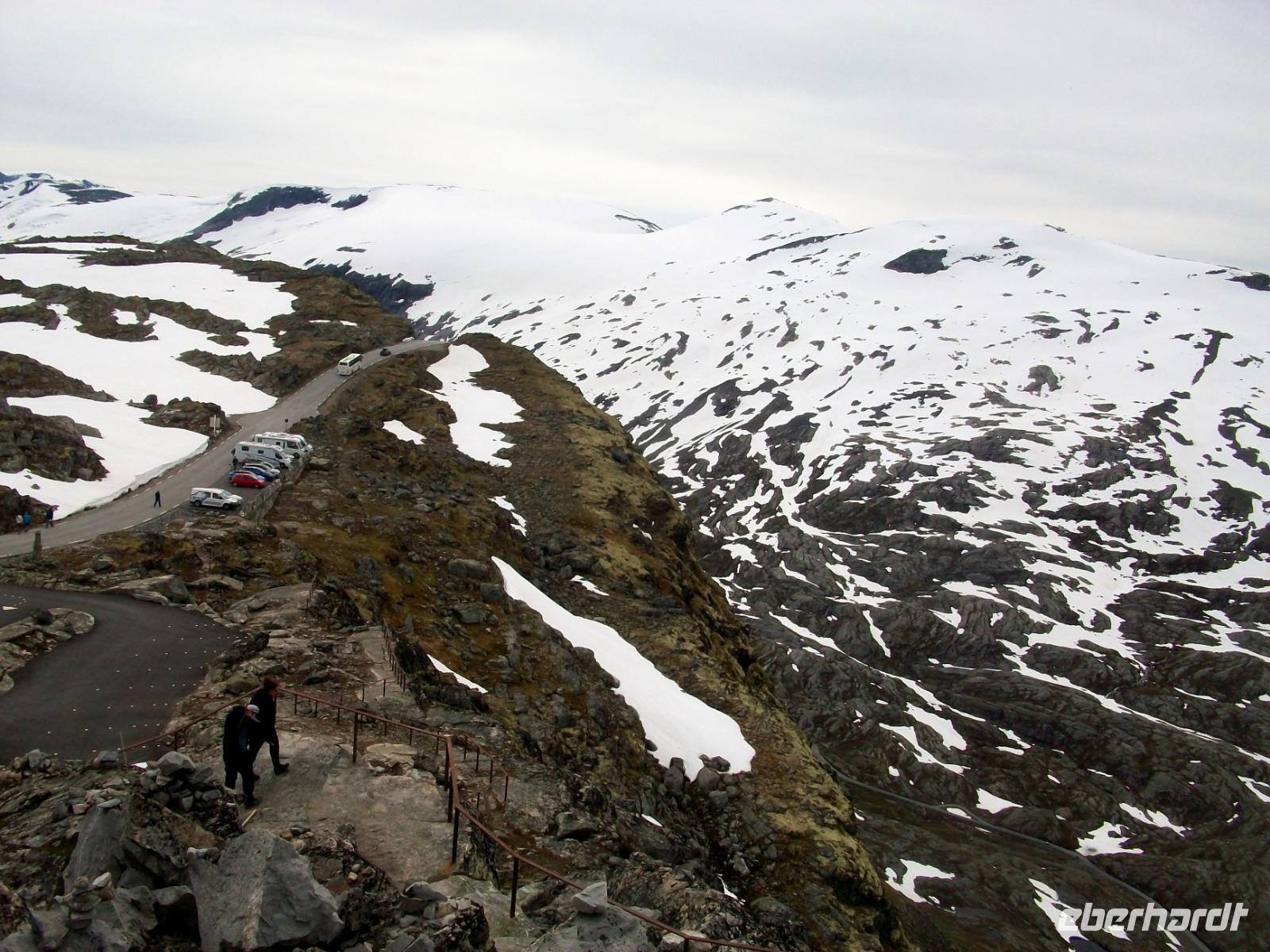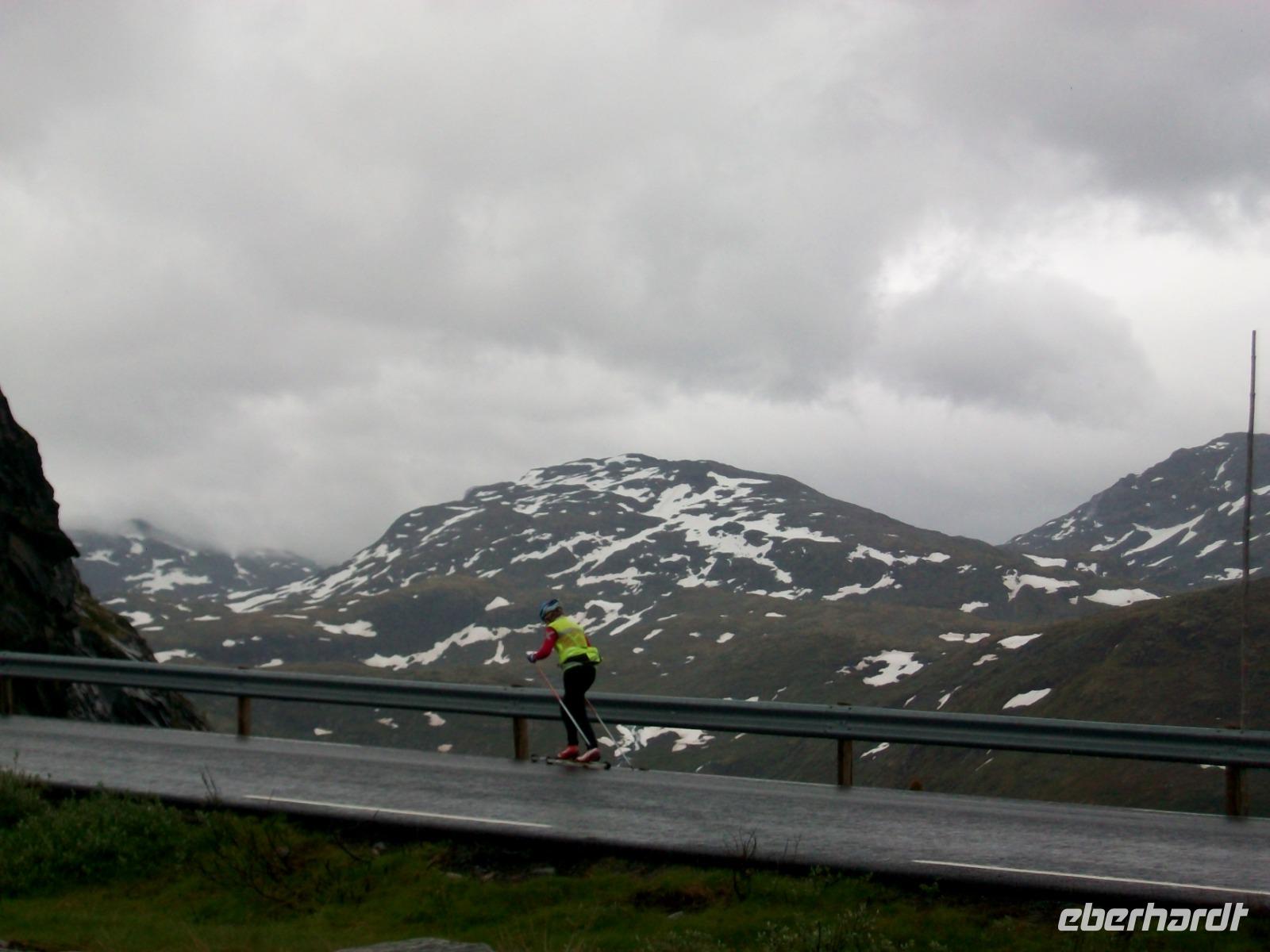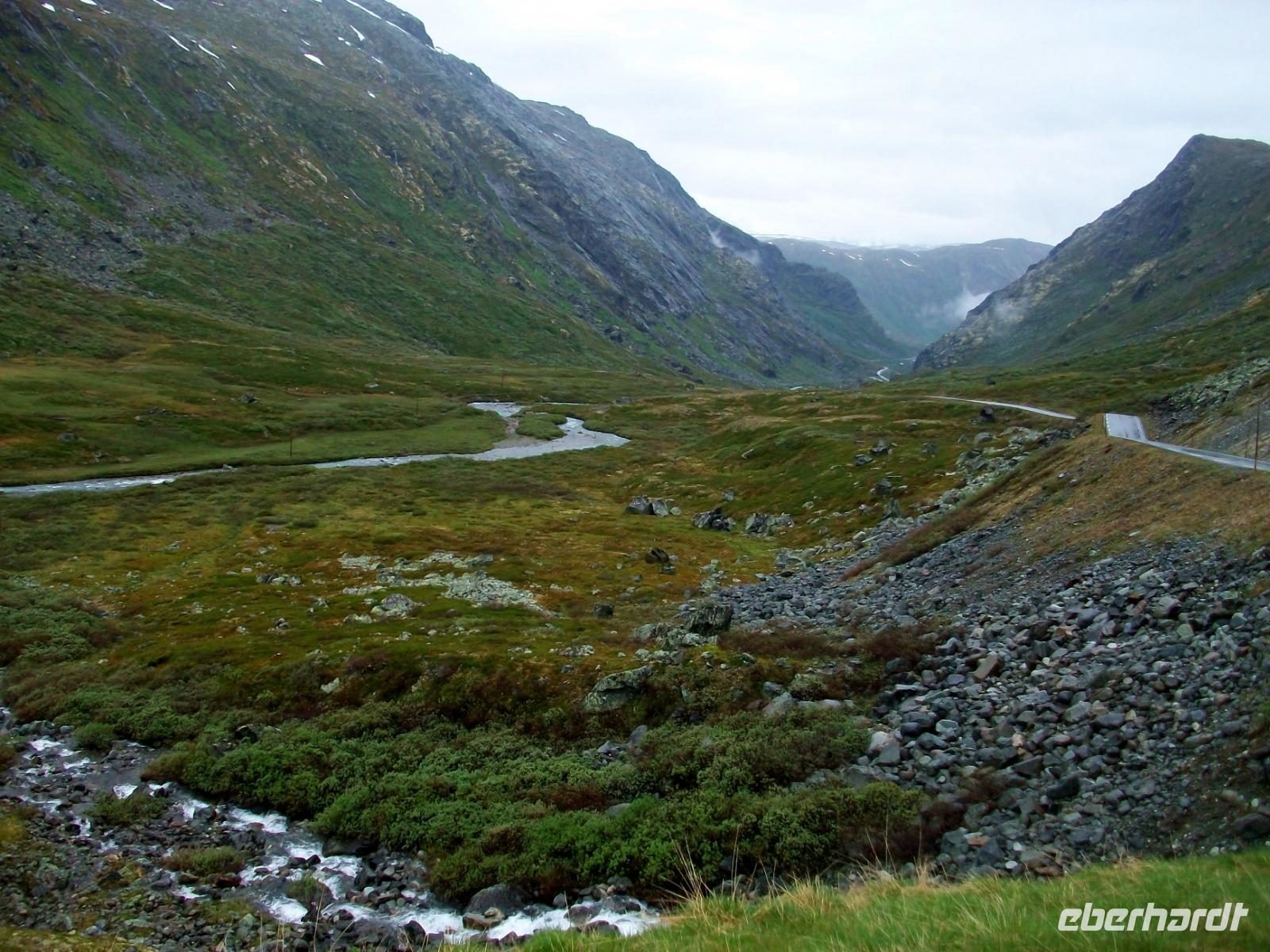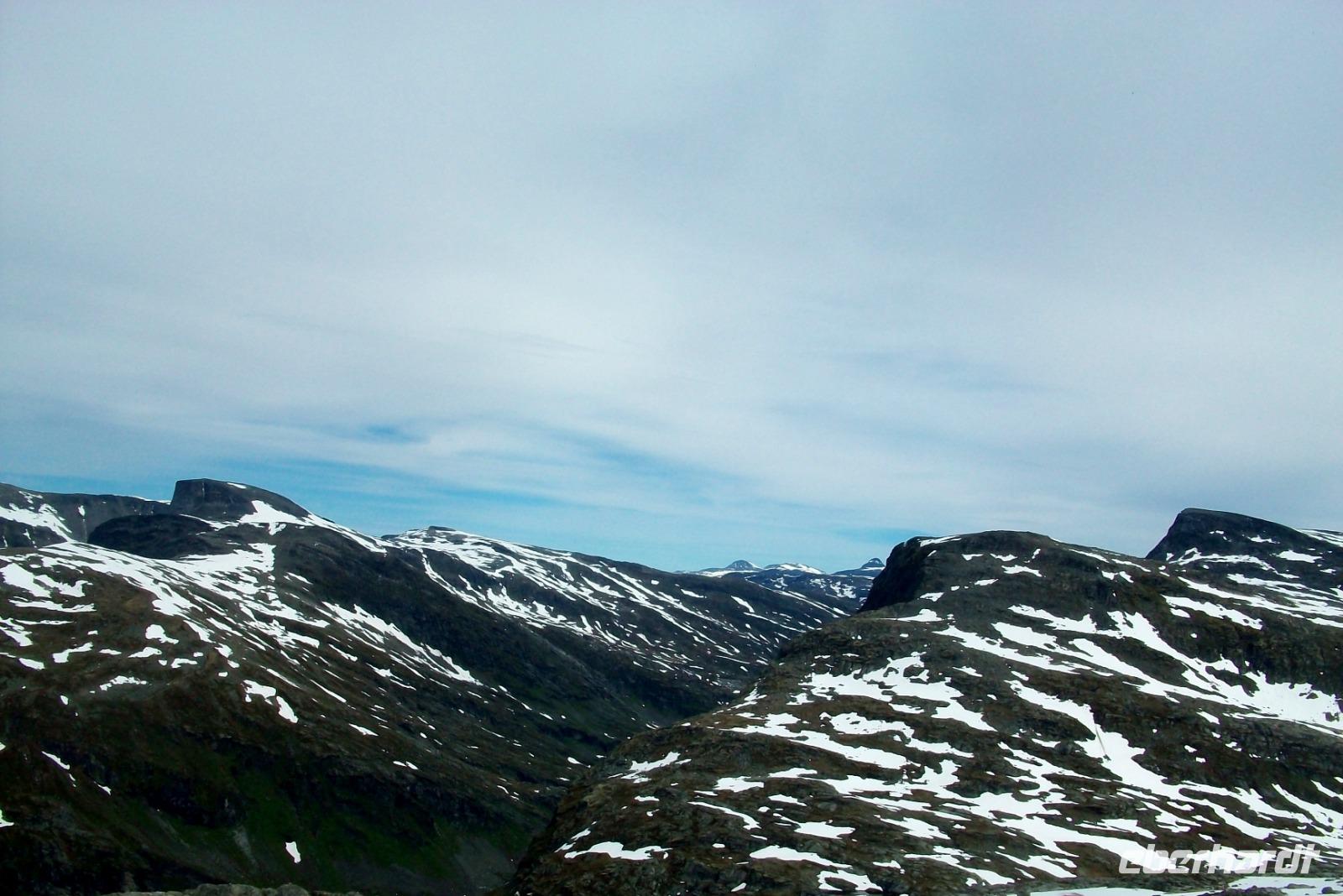 Dann steigen wir ein letztes Mal auf dieser Reise zu einem Fjell auf, es ist die Hardangervidda. Eine unendlich scheinende Hochebene mit karger Vegetation zeigt sich uns hier, durchflossen von kleineren Flüssen und bedeckt mit Schneeinseln.