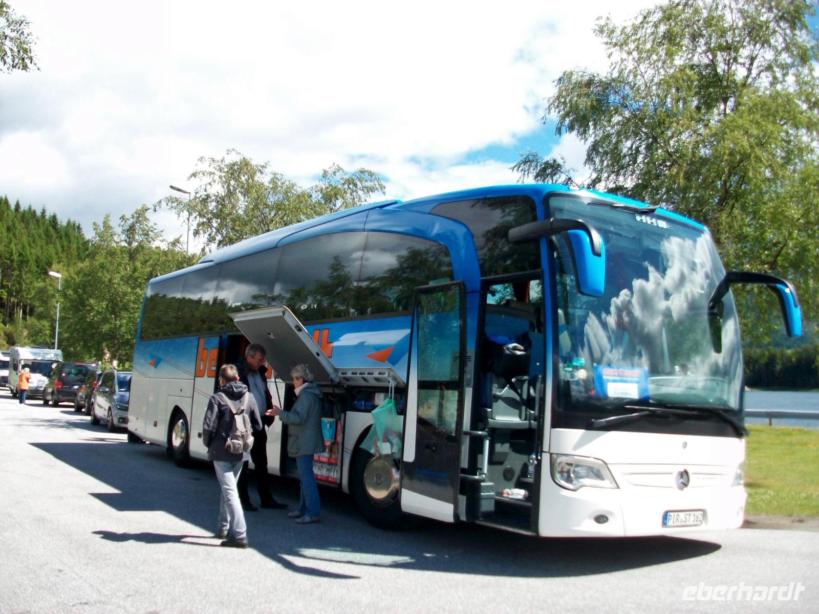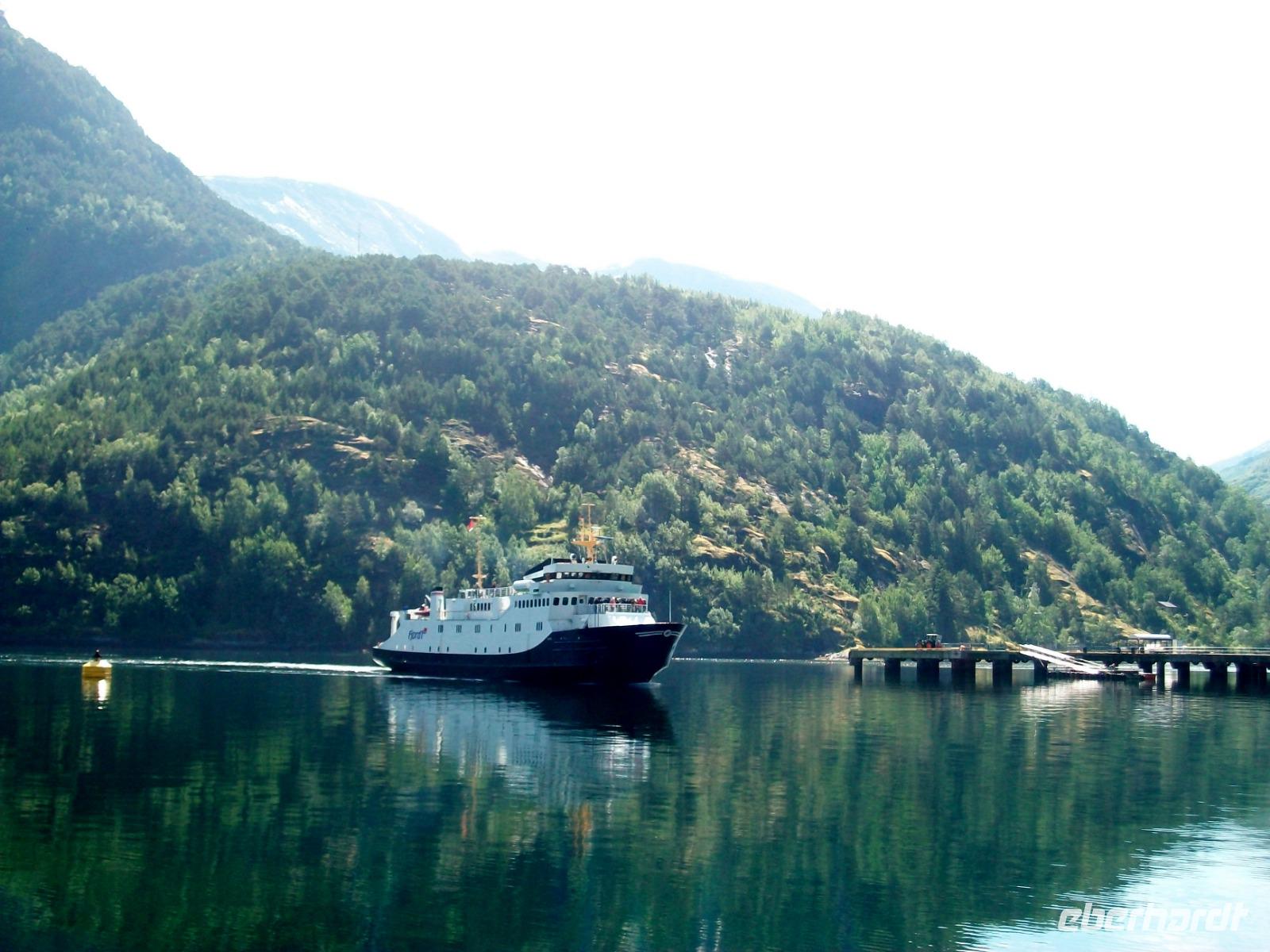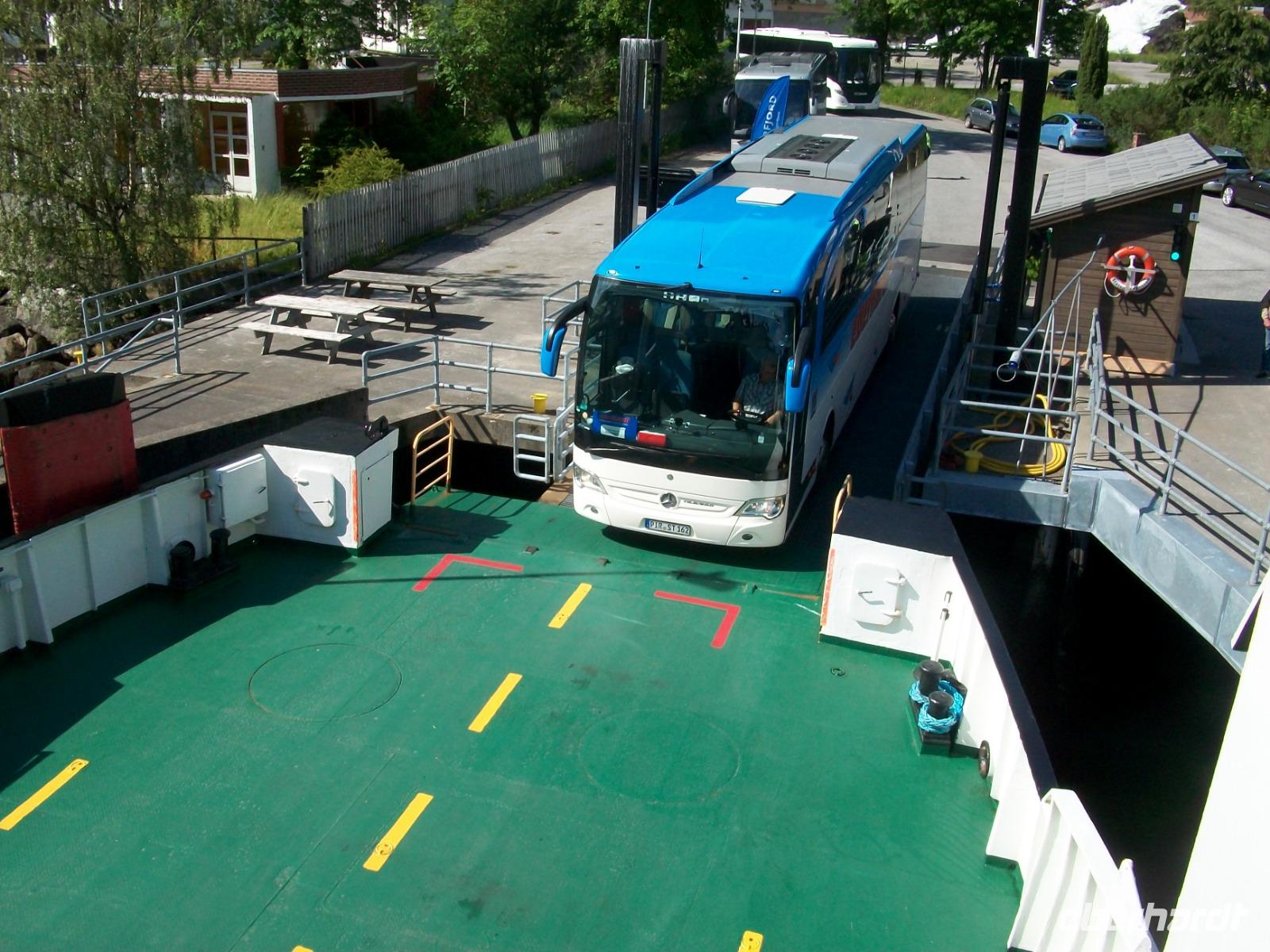 24.6.2019. Heute müssen wir wieder etwas früher starten, denn eine besondere Schifffahrt erwartet uns. Wir beginnen zunächst ganz klein: Eine Fährüberfahrt bringt uns über einen kleineren Fjord und danach sind wir wieder in der grandiosen Natur Norwegens unterwegs. Heute weht kein Lüftchen, das Wasser an dem wir vorbei fahren ist dabei ganz ruhig und in einer nicht zu beschreibenden Art widerspiegeln sich die Berge im Fjord.