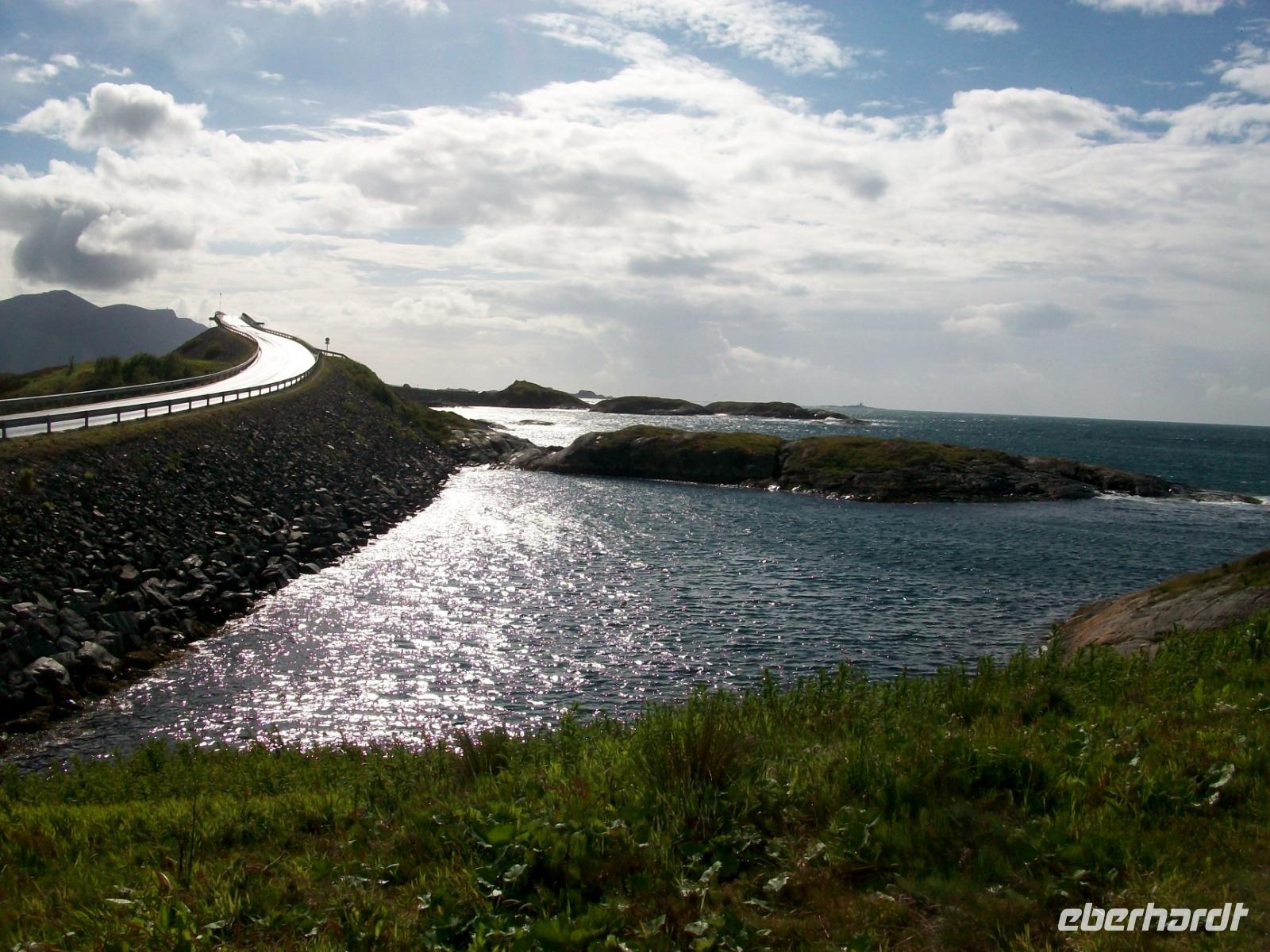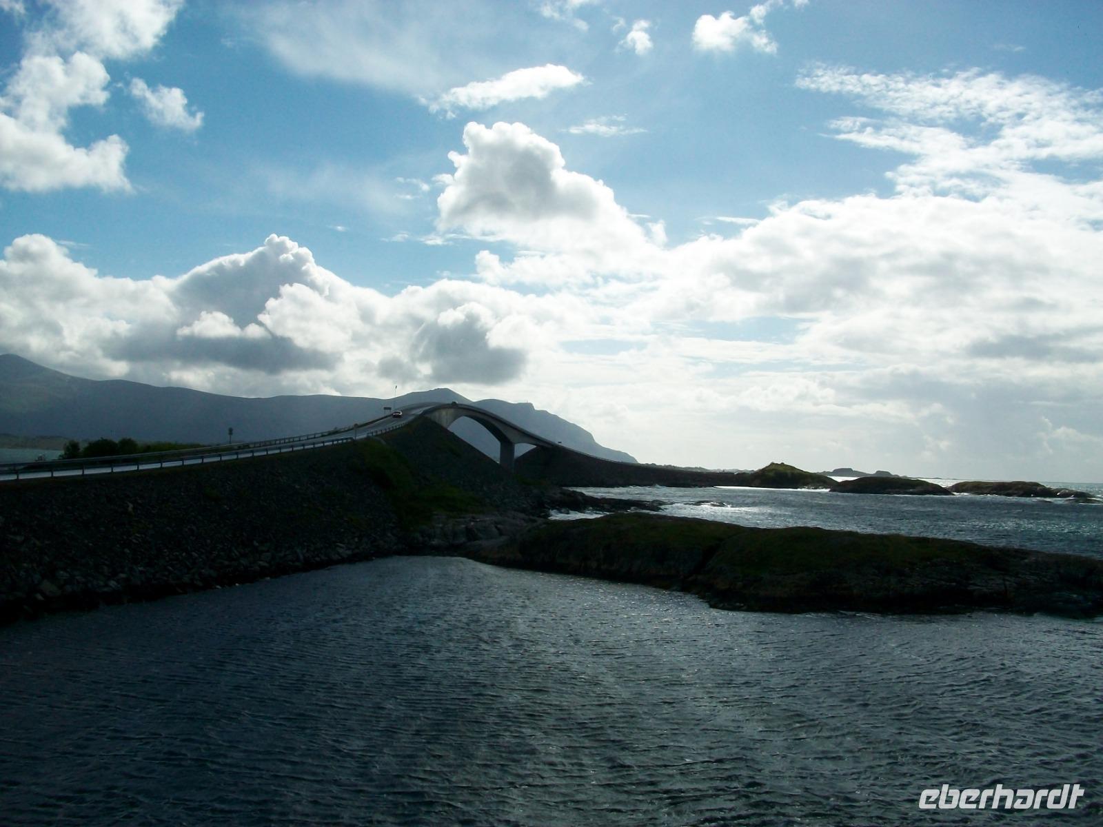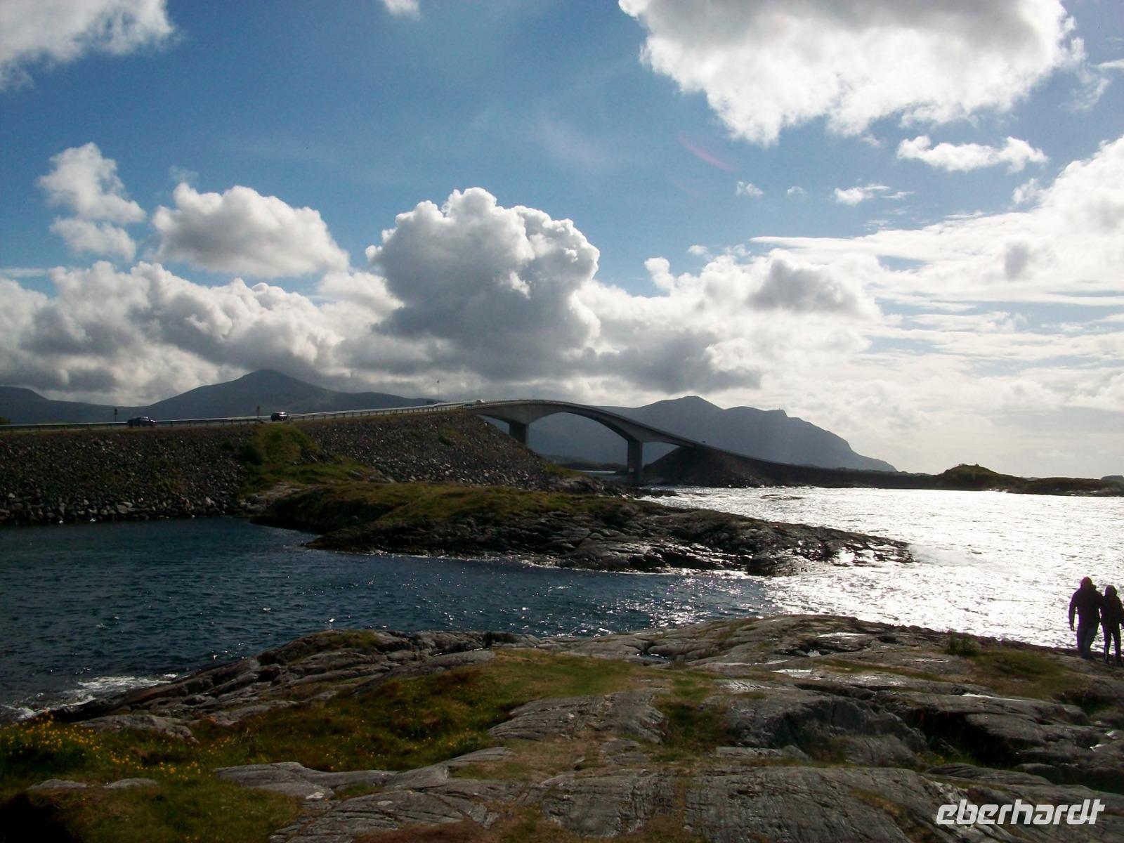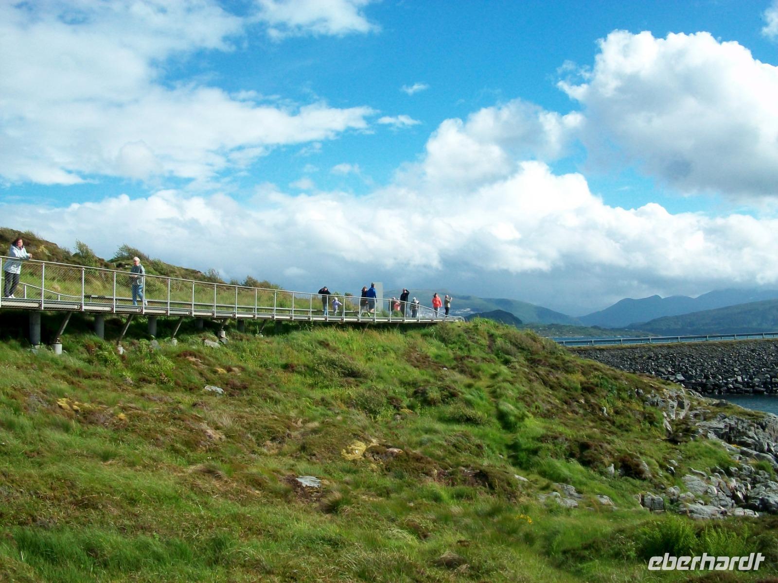 Die letzte Etappe bis zu unserem Ziel ist noch etwas Besonderes! Zunächst geht es durch den Atlantiktunnel 250 Meter unter dem Meer entlang und als wir wieder ans Licht kommen, gelangen wir bald auf die Atlantikstraße. Zahlreiche abenteuerliche Brückenkonstruktionen verbinden hier Schären und Inseln und als wir einen solchen Hügel über einen Fußweg umrunden, bläst uns ein steifer Wind vom Meer an.