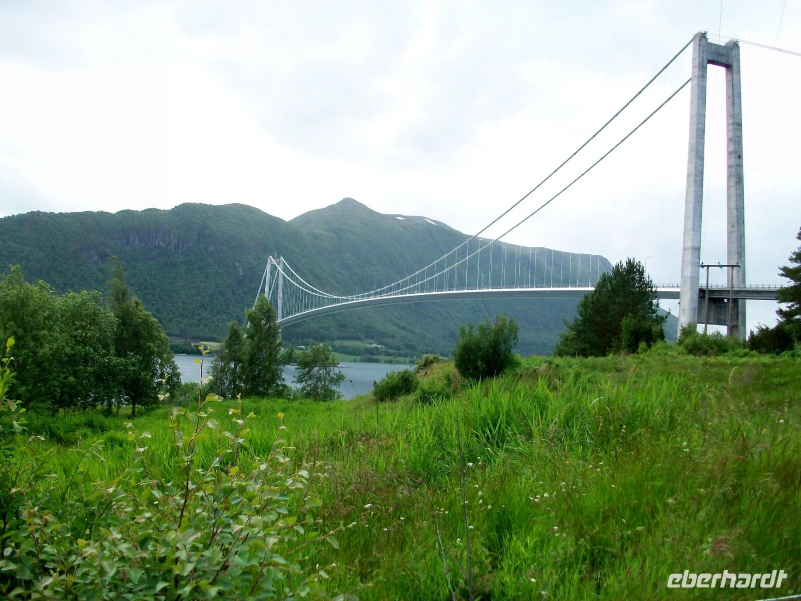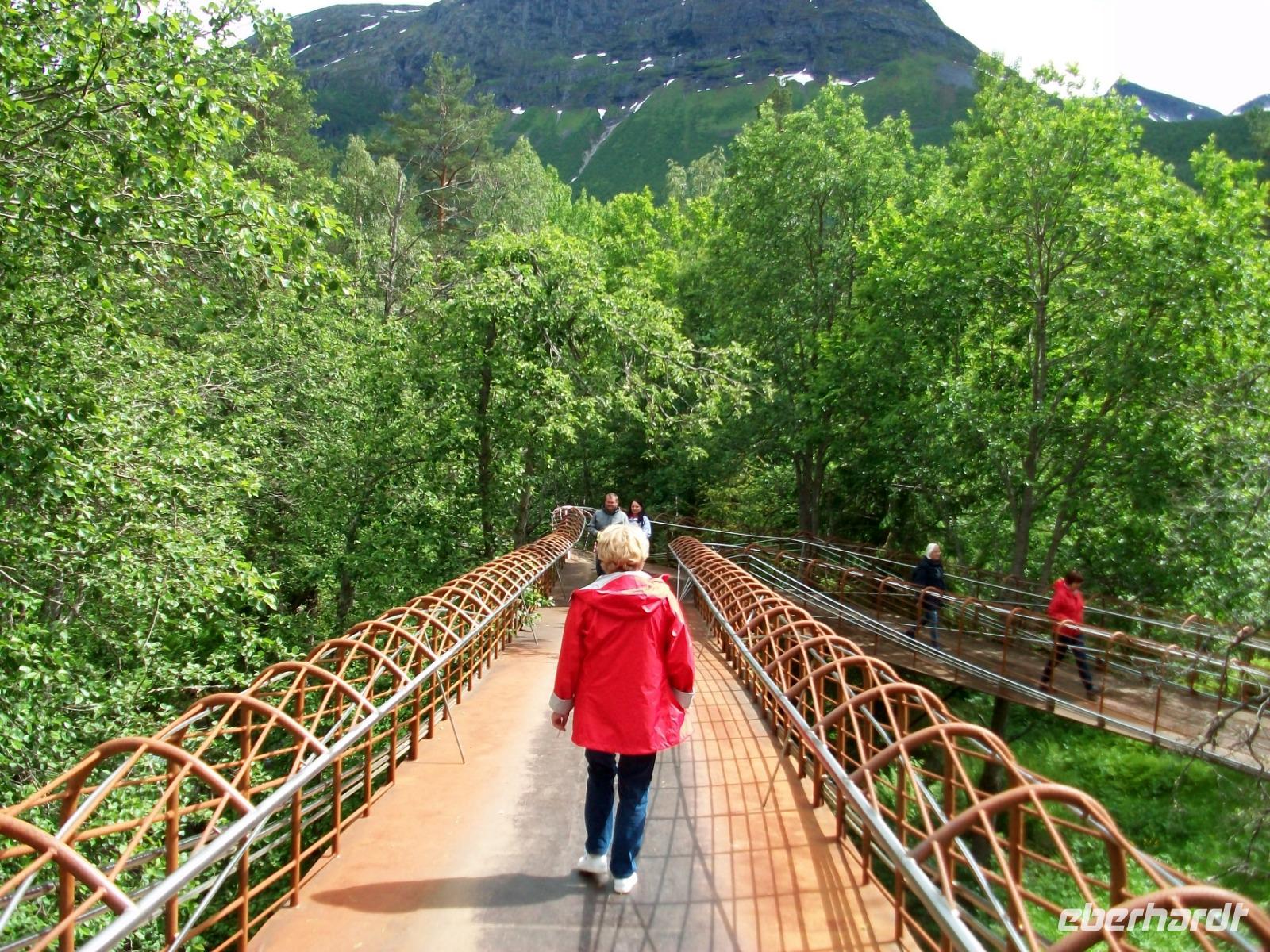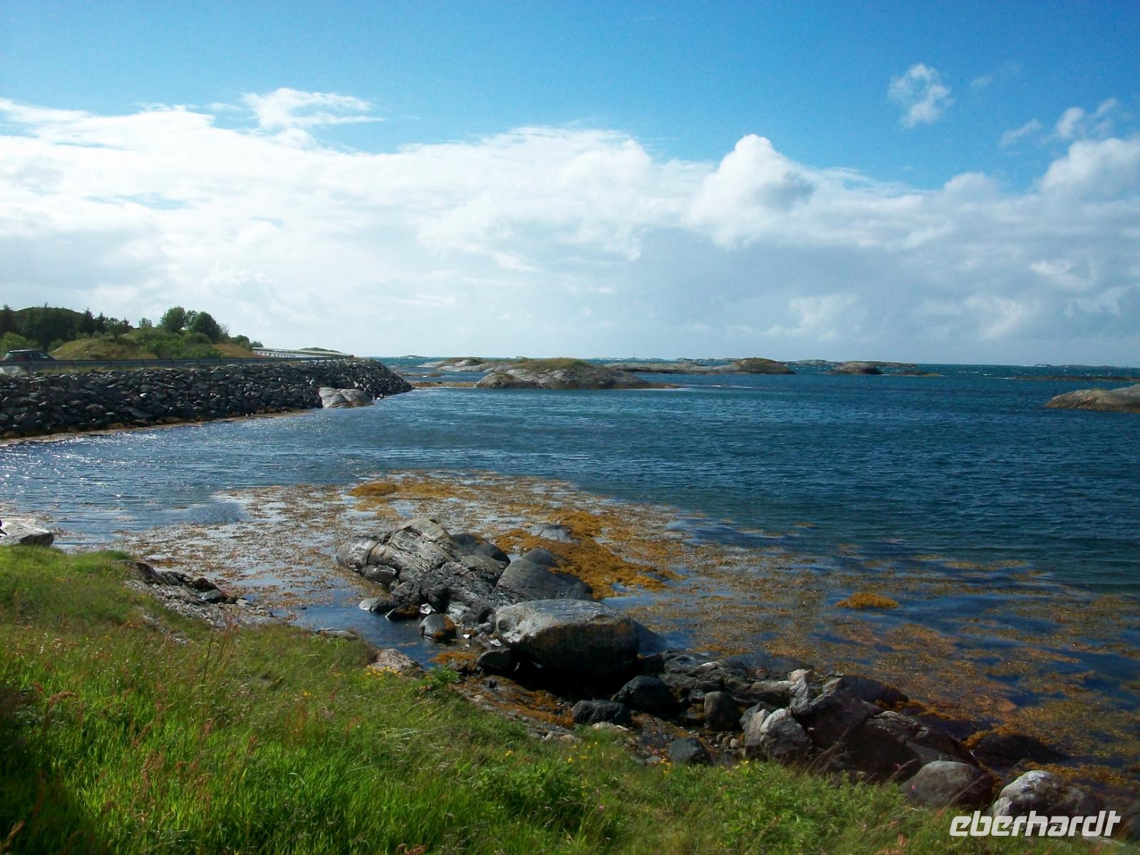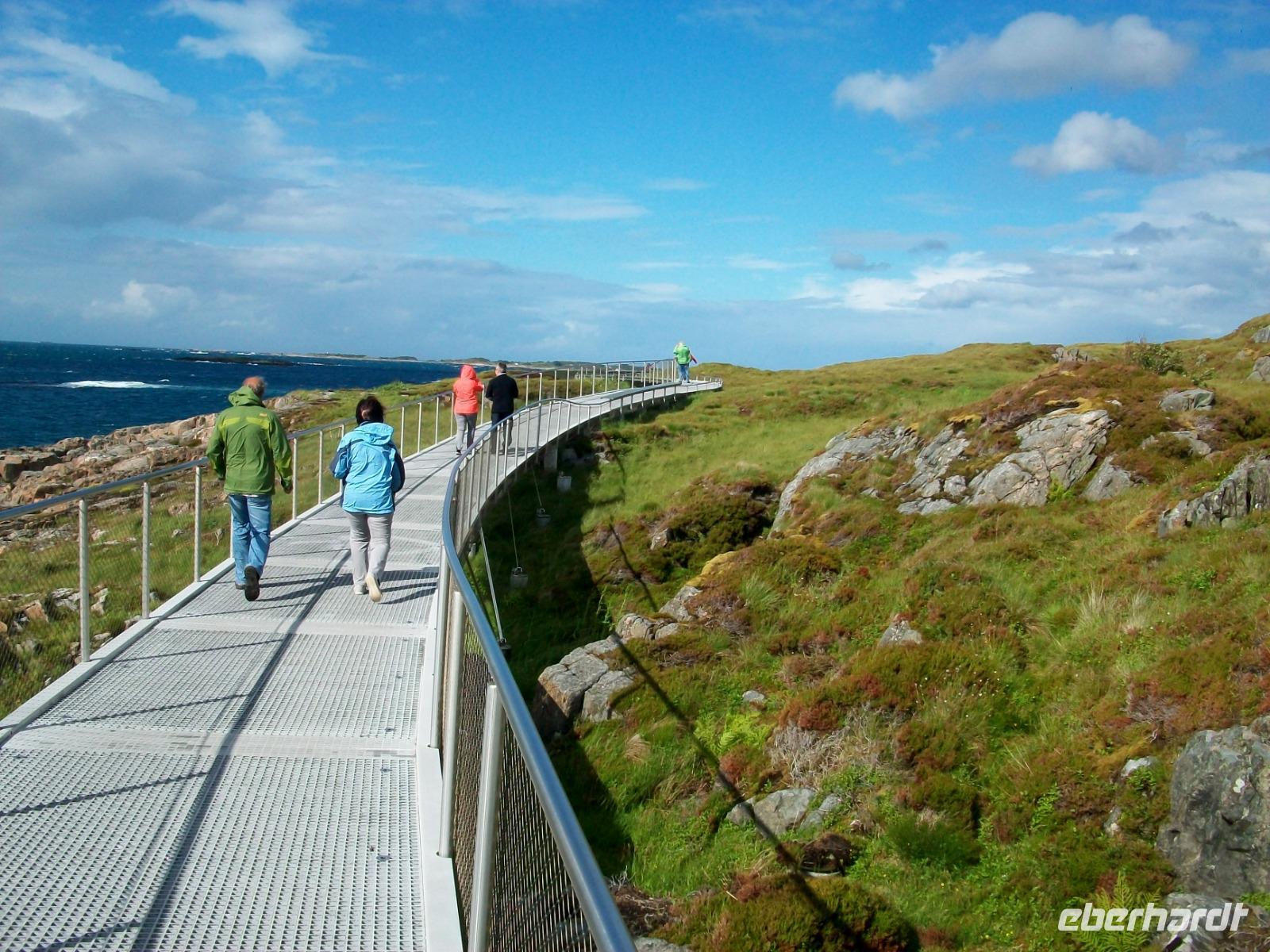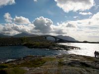 Die letzte Etappe bis zu unserem Ziel ist noch etwas Besonderes! Zunächst geht es durch den Atlantiktunnel 250 Meter unter dem Meer entlang und als wir wieder ans Licht kommen, gelangen wir bald auf die Atlantikstraße. Zahlreiche abenteuerliche Brückenkonstruktionen verbinden hier Schären und Inseln und als wir einen solchen Hügel über einen Fußweg umrunden, bläst uns ein steifer Wind vom Meer an.