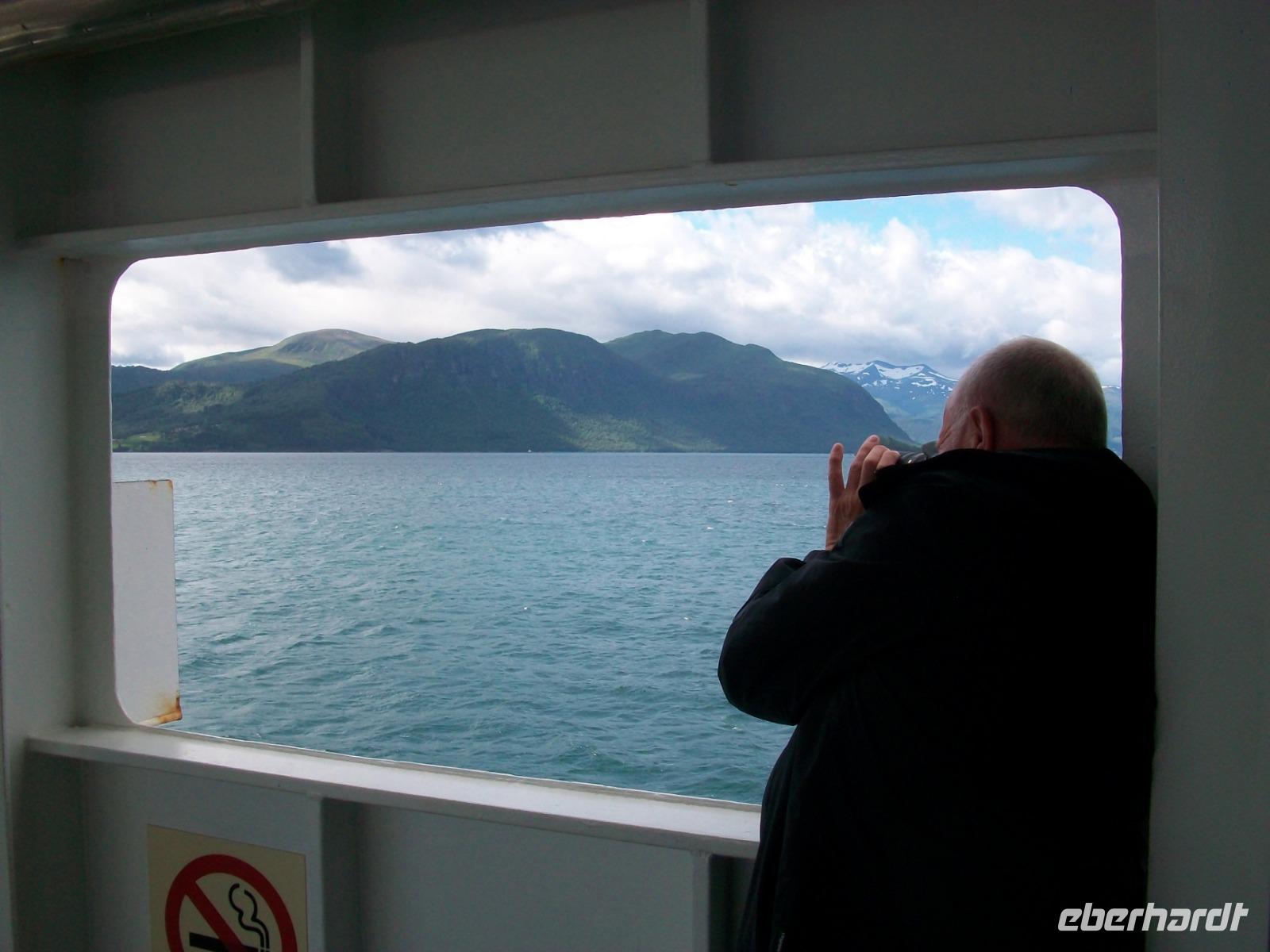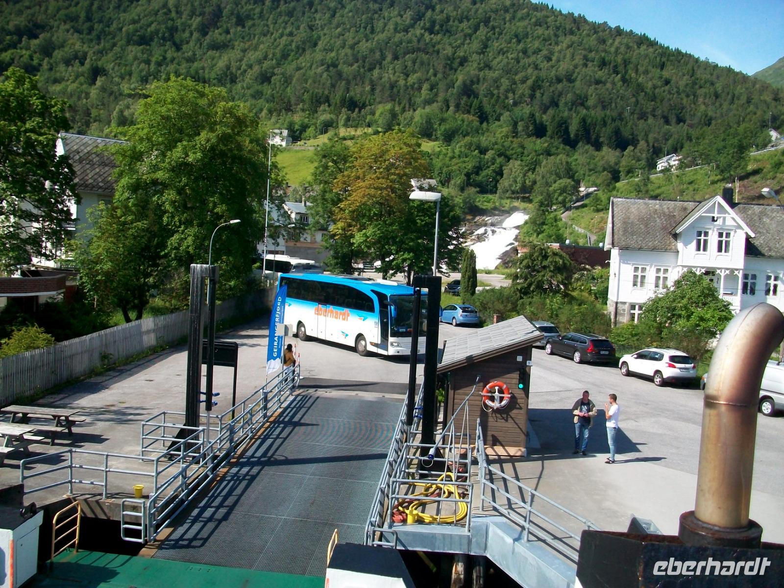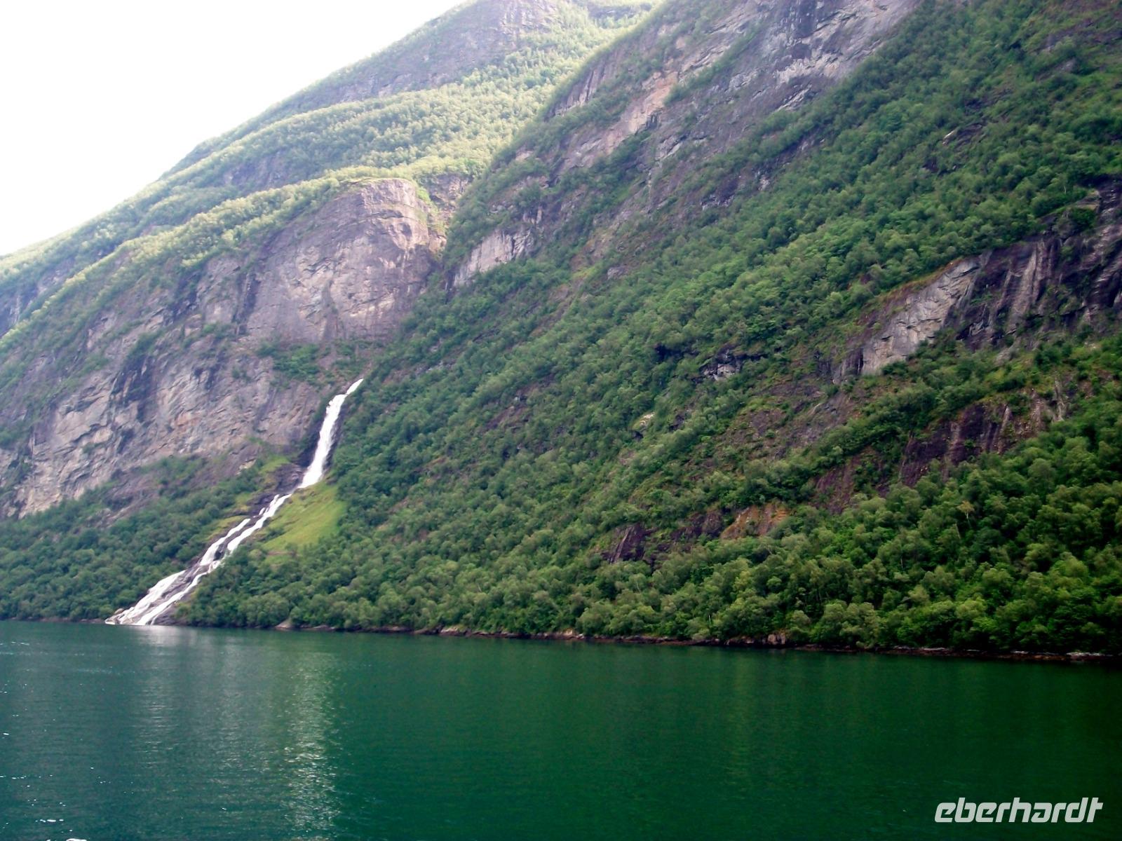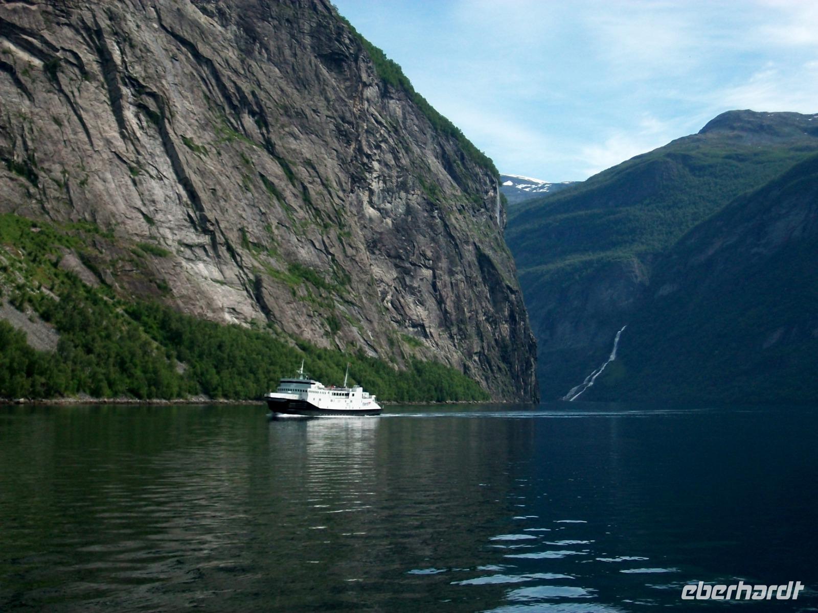 Nach einem Tunnel haben wir einen grandiosen Blick auf den Geirangerfjord ganz unten, es ist unser erstes Ziel des Tages. Nachdem die Fotos geschossen wurden wagen wir den Abstieg und im kleinen Ort Hellesylt erwarten wir unser Schiff. Das lässt auch gar nicht lange auf sich warten, nach dem Anlegen können wir bald aufs Sonnendeck und nun beginnt eine Überfahrt die atemberaubend ist. Gleich vom Wassre steigen steil die Berge an, so mancher Wasserfall donnert zu Tal und wir sind mittendrin! Auch hier kann sich das Auge kaum satt sehen und nach einer guten Stunde, viel zu schnell, endet die schöne Fahrt am anderen Ende des Fjords.