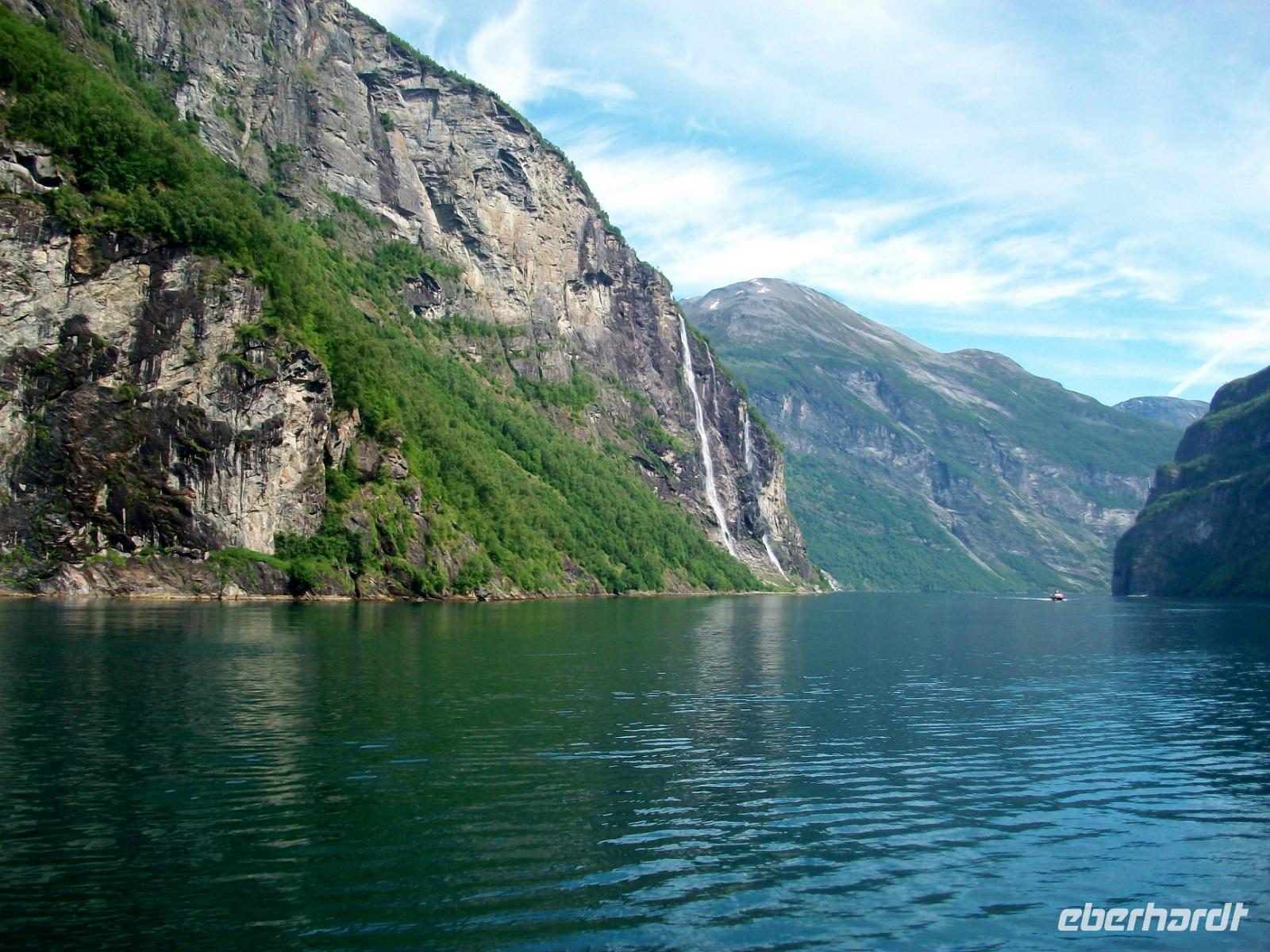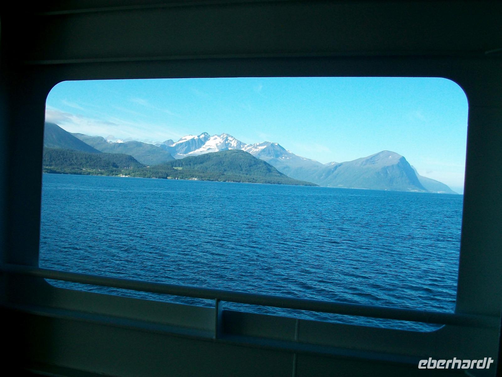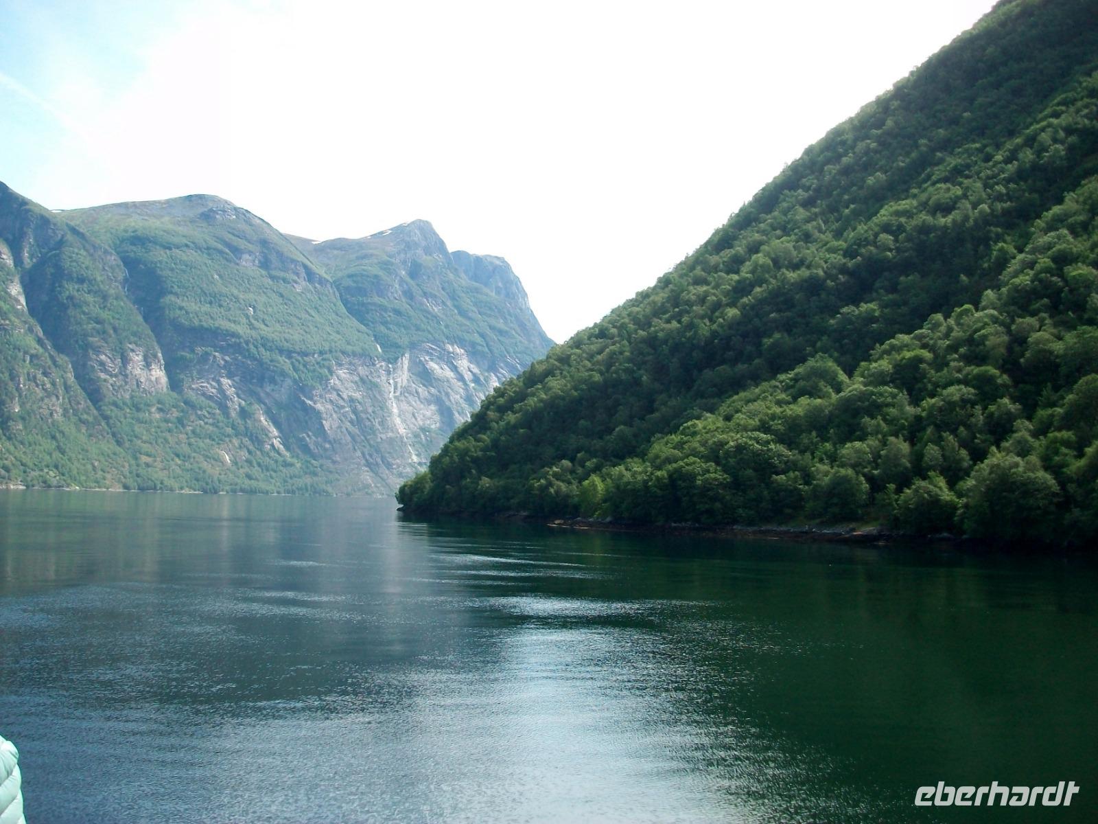 Nach einem Tunnel haben wir einen grandiosen Blick auf den Geirangerfjord ganz unten, es ist unser erstes Ziel des Tages. Nachdem die Fotos geschossen wurden wagen wir den Abstieg und im kleinen Ort Hellesylt erwarten wir unser Schiff. Das lässt auch gar nicht lange auf sich warten, nach dem Anlegen können wir bald aufs Sonnendeck und nun beginnt eine Überfahrt die atemberaubend ist. Gleich vom Wassre steigen steil die Berge an, so mancher Wasserfall donnert zu Tal und wir sind mittendrin! Auch hier kann sich das Auge kaum satt sehen und nach einer guten Stunde, viel zu schnell, endet die schöne Fahrt am anderen Ende des Fjords.