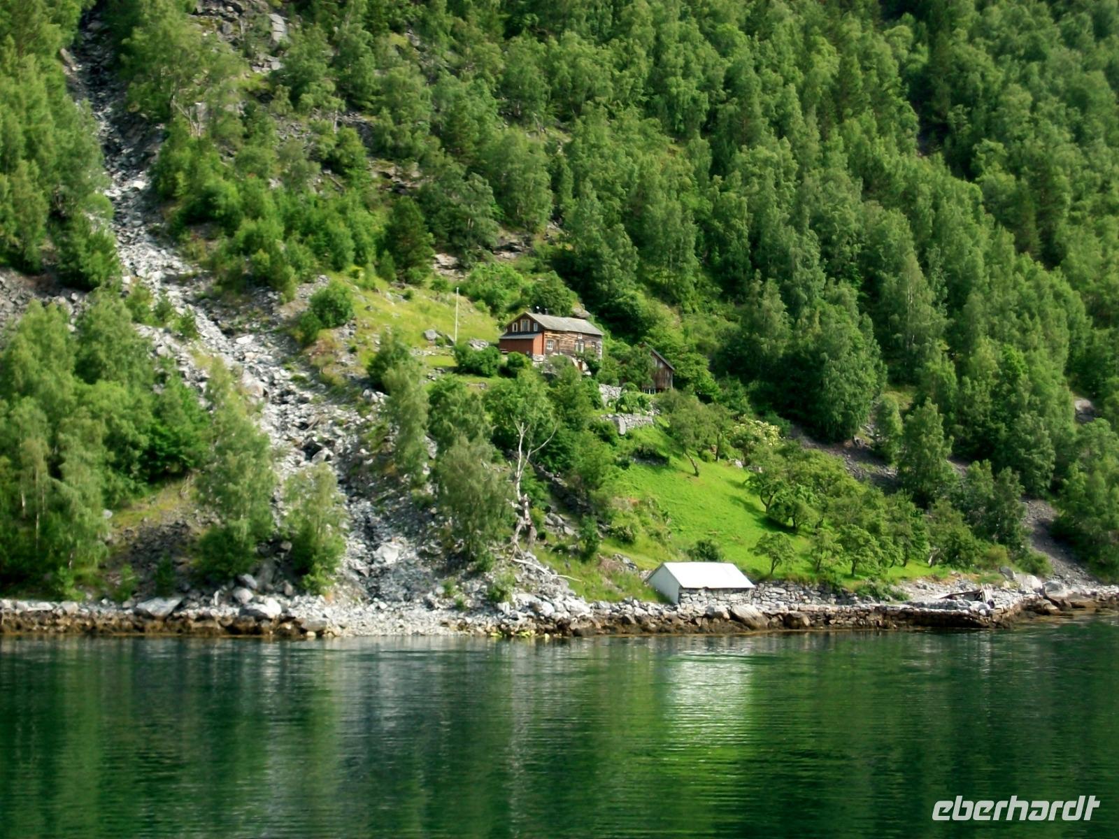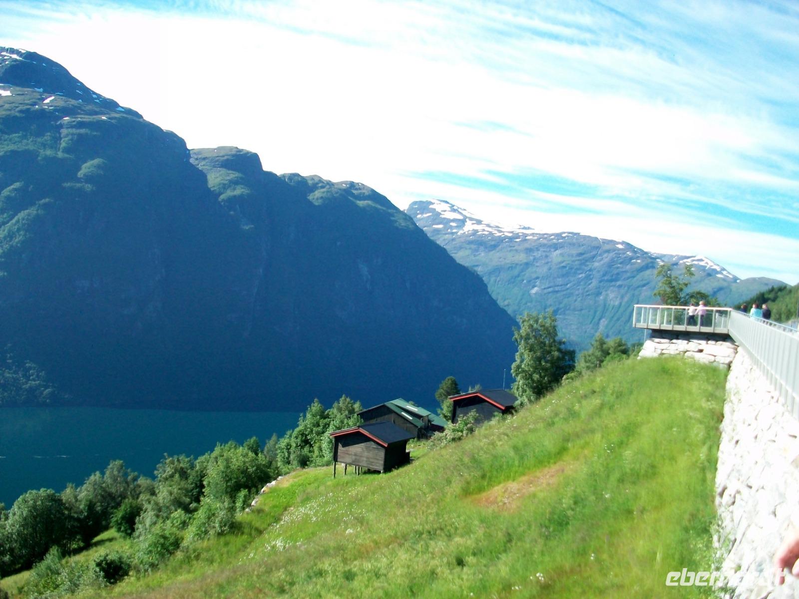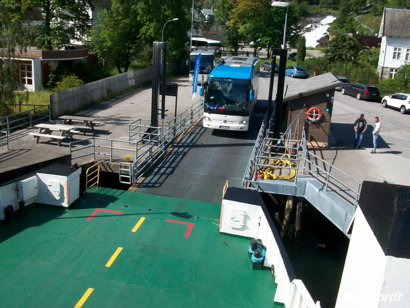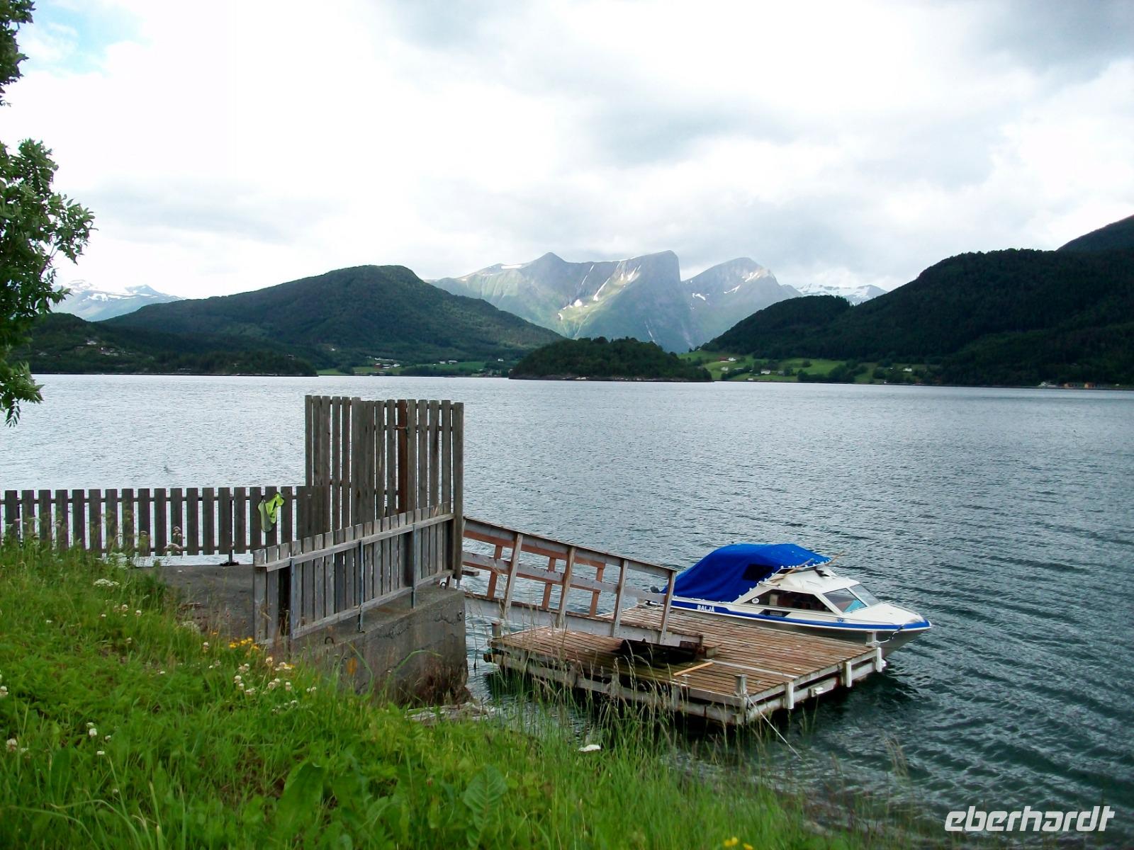 Nach einem Tunnel haben wir einen grandiosen Blick auf den Geirangerfjord ganz unten, es ist unser erstes Ziel des Tages. Nachdem die Fotos geschossen wurden wagen wir den Abstieg und im kleinen Ort Hellesylt erwarten wir unser Schiff. Das lässt auch gar nicht lange auf sich warten, nach dem Anlegen können wir bald aufs Sonnendeck und nun beginnt eine Überfahrt die atemberaubend ist. Gleich vom Wassre steigen steil die Berge an, so mancher Wasserfall donnert zu Tal und wir sind mittendrin! Auch hier kann sich das Auge kaum satt sehen und nach einer guten Stunde, viel zu schnell, endet die schöne Fahrt am anderen Ende des Fjords.