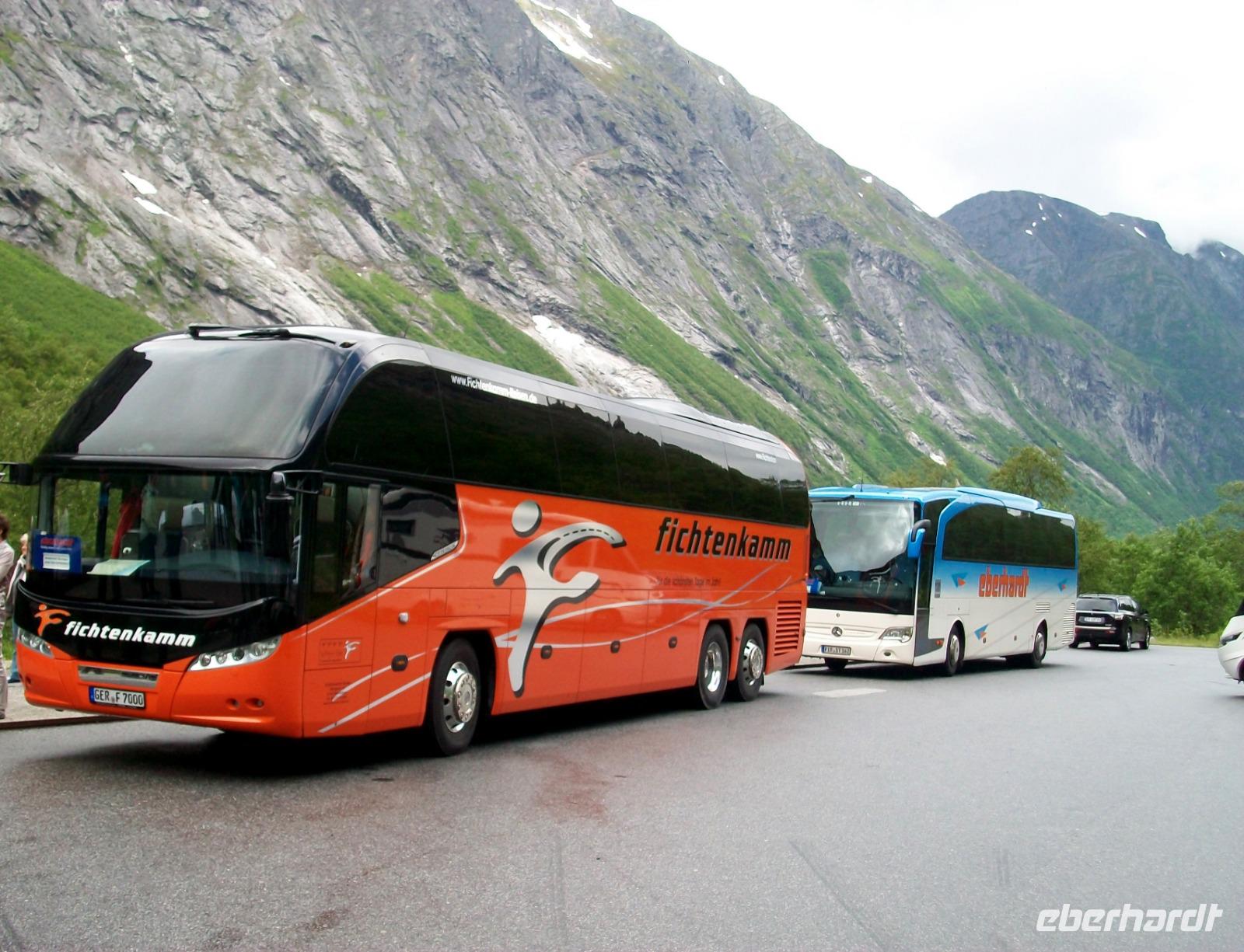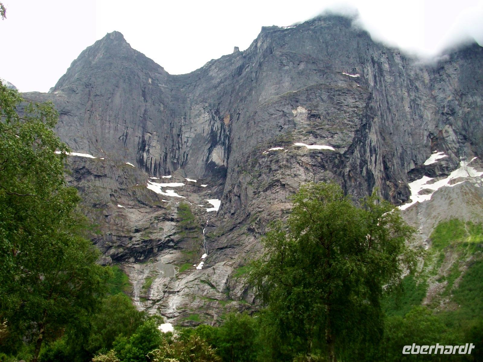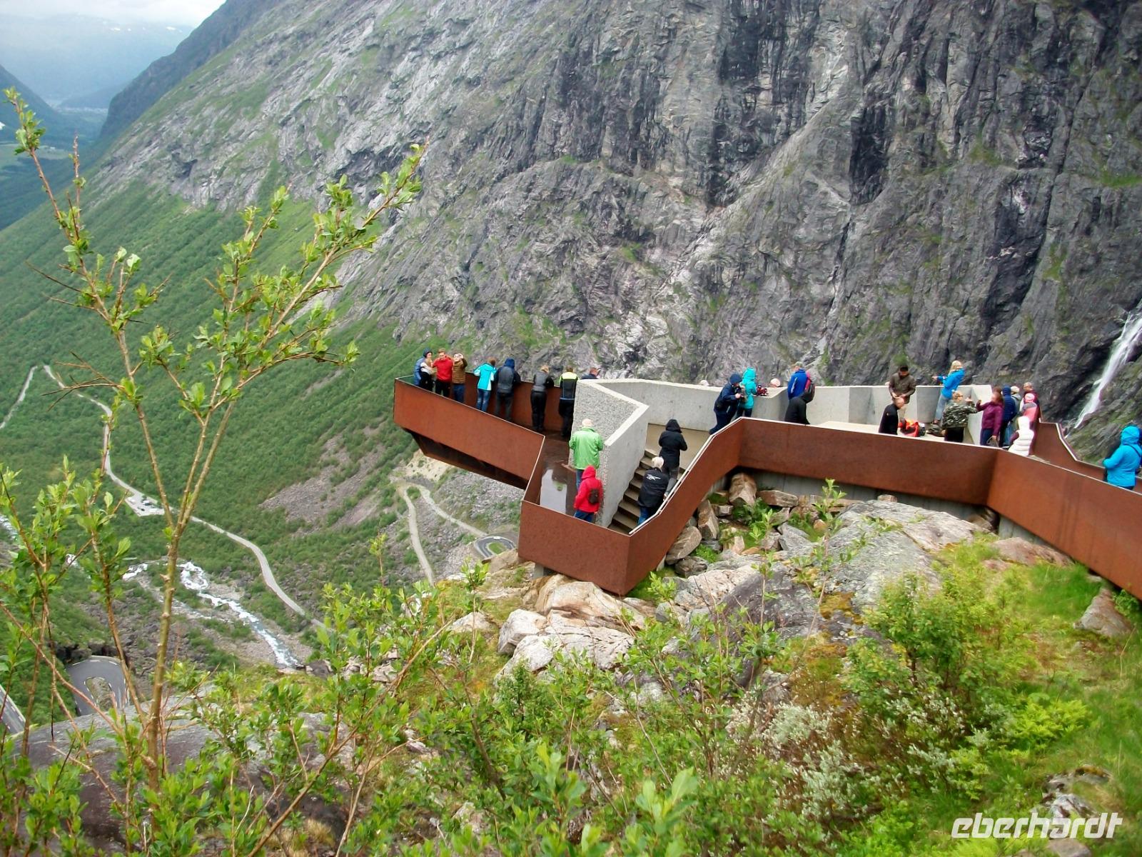 23.6.2019. Heute scheint Petrus wieder bessere Laune zu haben; ein Blick aus meinem Hotelfenster zeigt mir schon etwas Sonne über dem Varden, dem Hausberg von Molde den ich gut von hier sehen kann. Ihn werden wir heute Vormittag für eine Stippvisite erklimmen. Wir starten hierzu gegen neun und gelangen bei guter Sicht hinauf. Der Blick auf die schneebedeckten Berge, den Fjord und die Stadt zu unseren Füßen kann aber grandioser nicht sein! Da möchte man ewig bleiben, schauen und genießen. Doch, unser Programm ist auch heute gut gefüllt und so starten wir um wieder hinunter zum Fjord zu gelangen. An diesem Vormittag steht erneut eine Fährüberfahrt an um danach in Richtung Trollwand unterwegs zu sein. Die Berge rücken immer näher an die Straße heran, diese berühmte Wand steigt senkrecht runde Eintausend Meter an - ein beeindruckender Blick! Hier, umgeben von dieser schroffen Bergwelt, genießen wir einen Mittagsimbiss um uns für einen besonderen Aufstieg gebührend zu stärken. Nach einer knappen halben Stunde haben wir die Serpentinenstraße erreicht die uns an den Trollstigen hinauf bringen soll. Uralten Sagen nach sollen hier Riesentrolle ihre Leitern angestellt haben um die Berge zu erklimmen, wir nehmen unseren Bus. Hier nun muss André, unser Chauffeur, sein ganzes Können zeigen. Wir langen oben gut an und bei wunderbarerer Sicht nehmen wir uns an diesem Nachmittag genügend Zeit um die wirklich grandiosen Blicke in das Tal und zu den Bergen zu genießen. Ein Wasserfall donnert tosend zu Tal, unten sehen wir üppiges Grün und oben auf den Bergspitzen Schnee - ein Anblick den man so schnell nicht vergisst!
