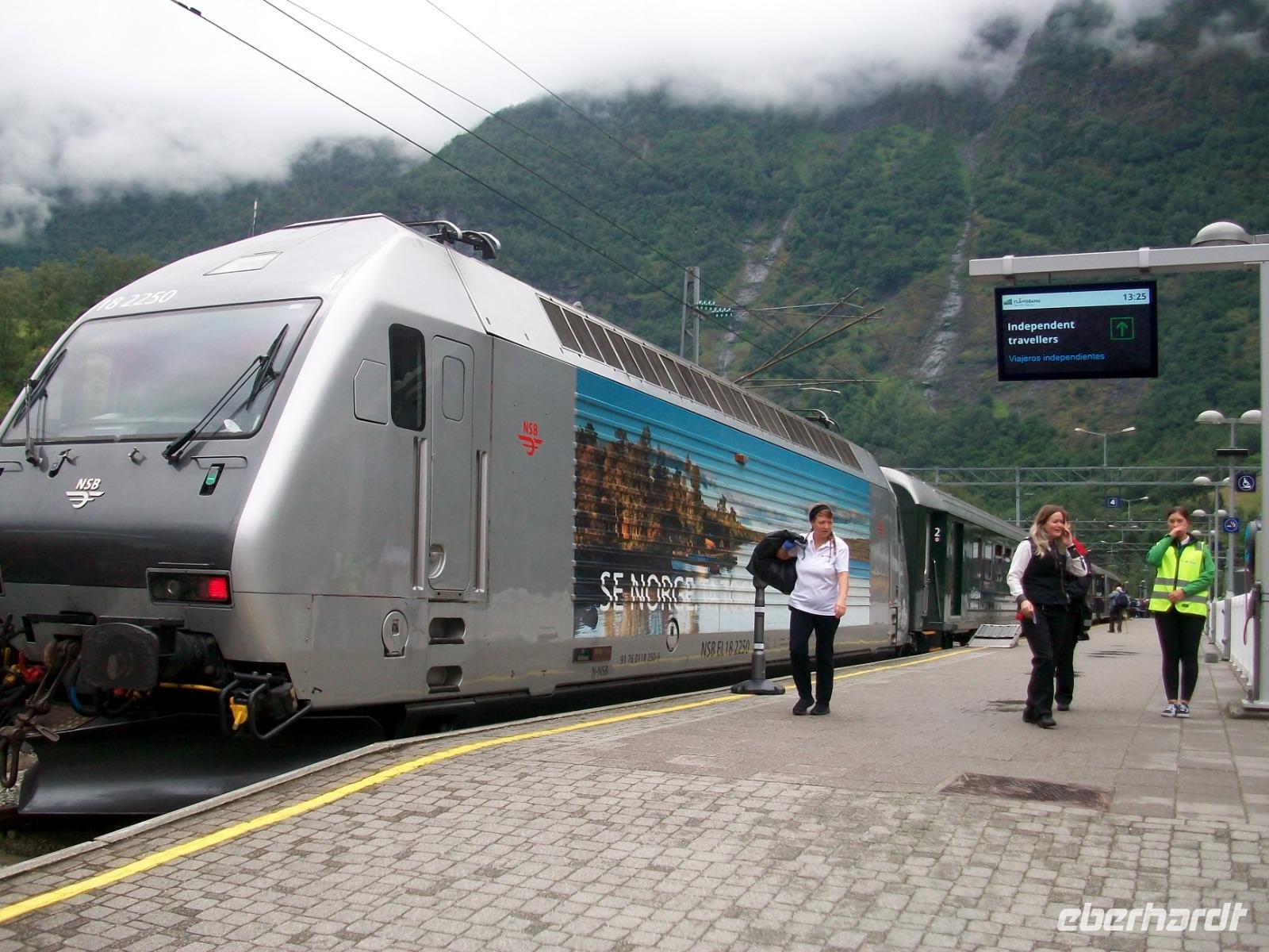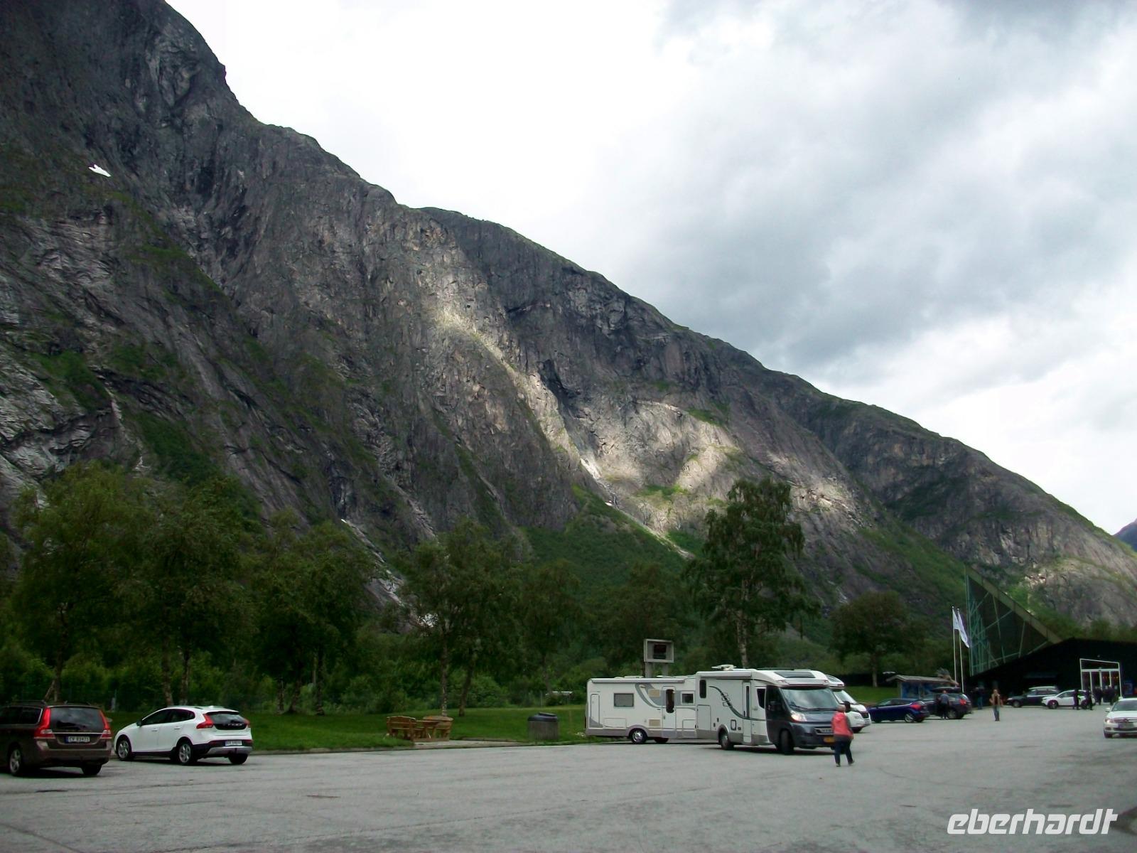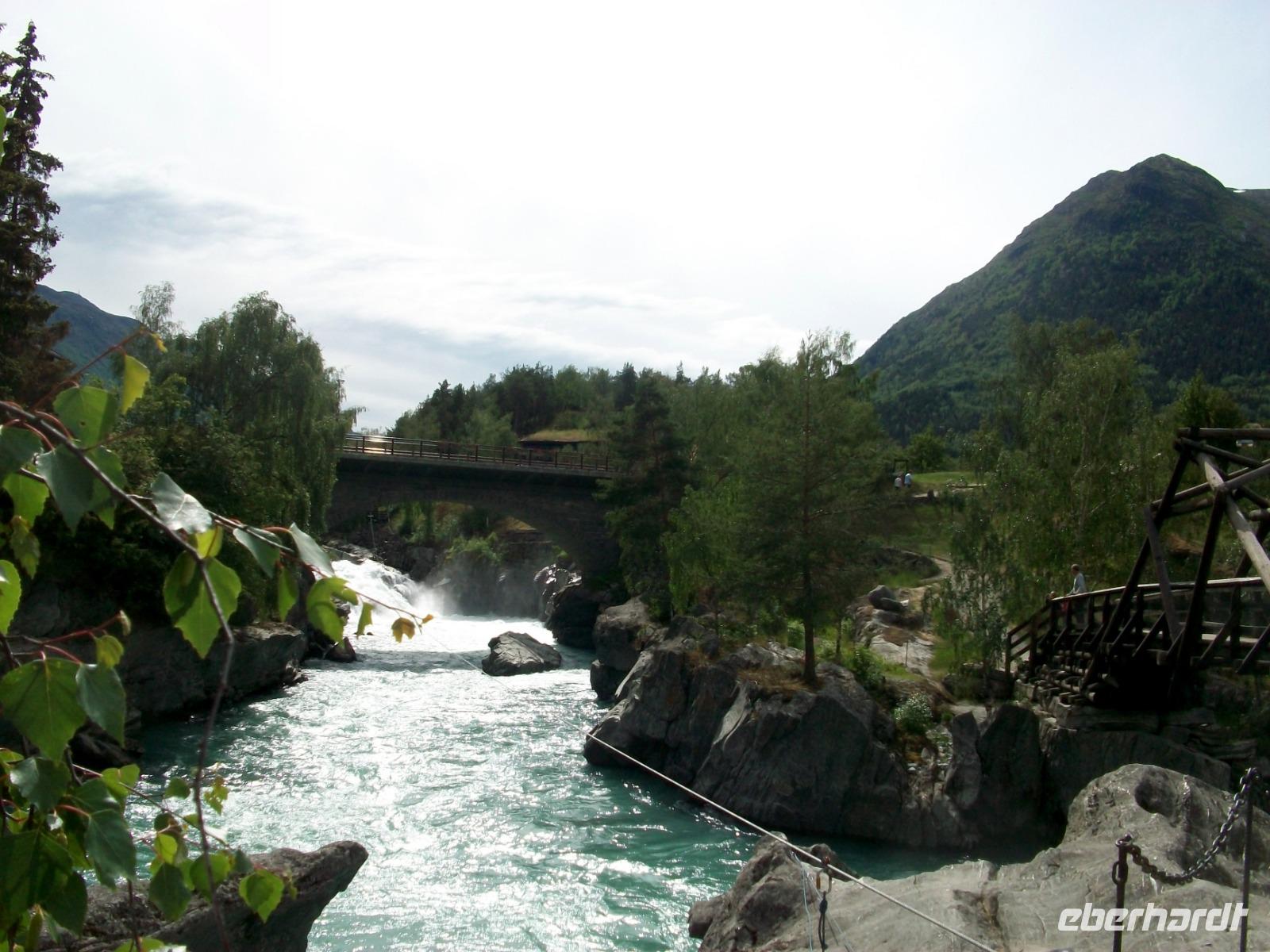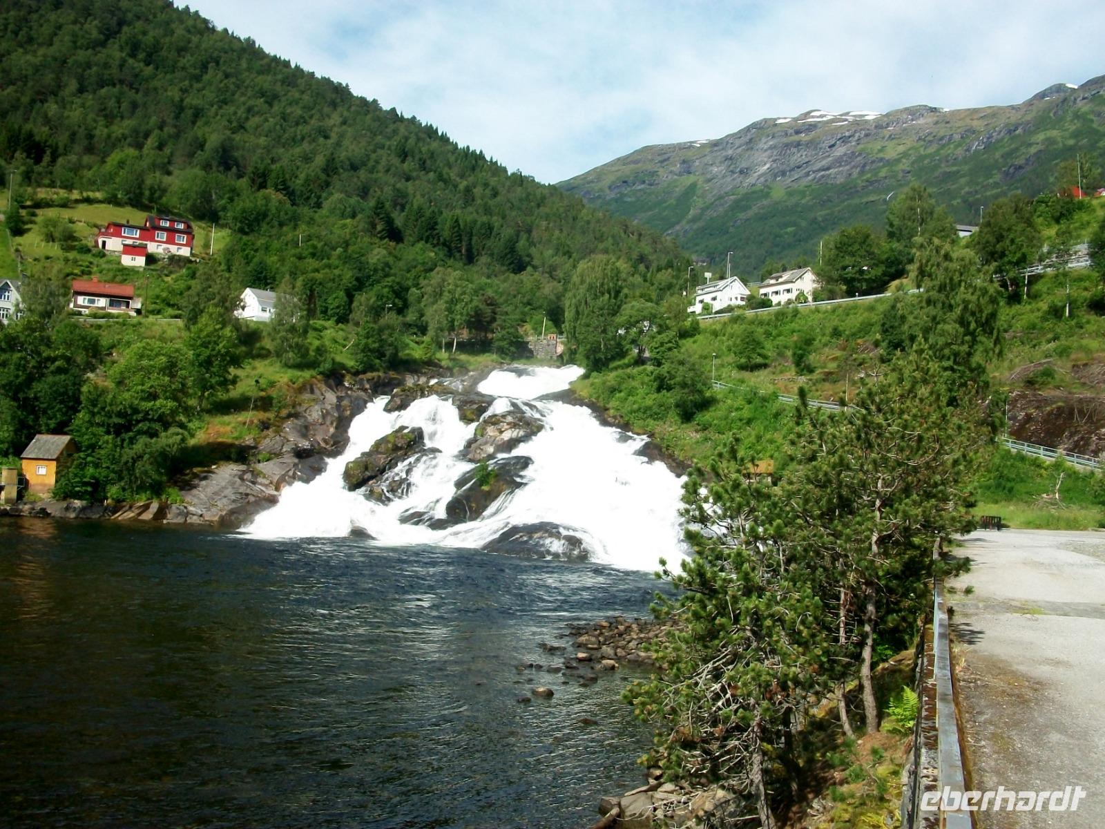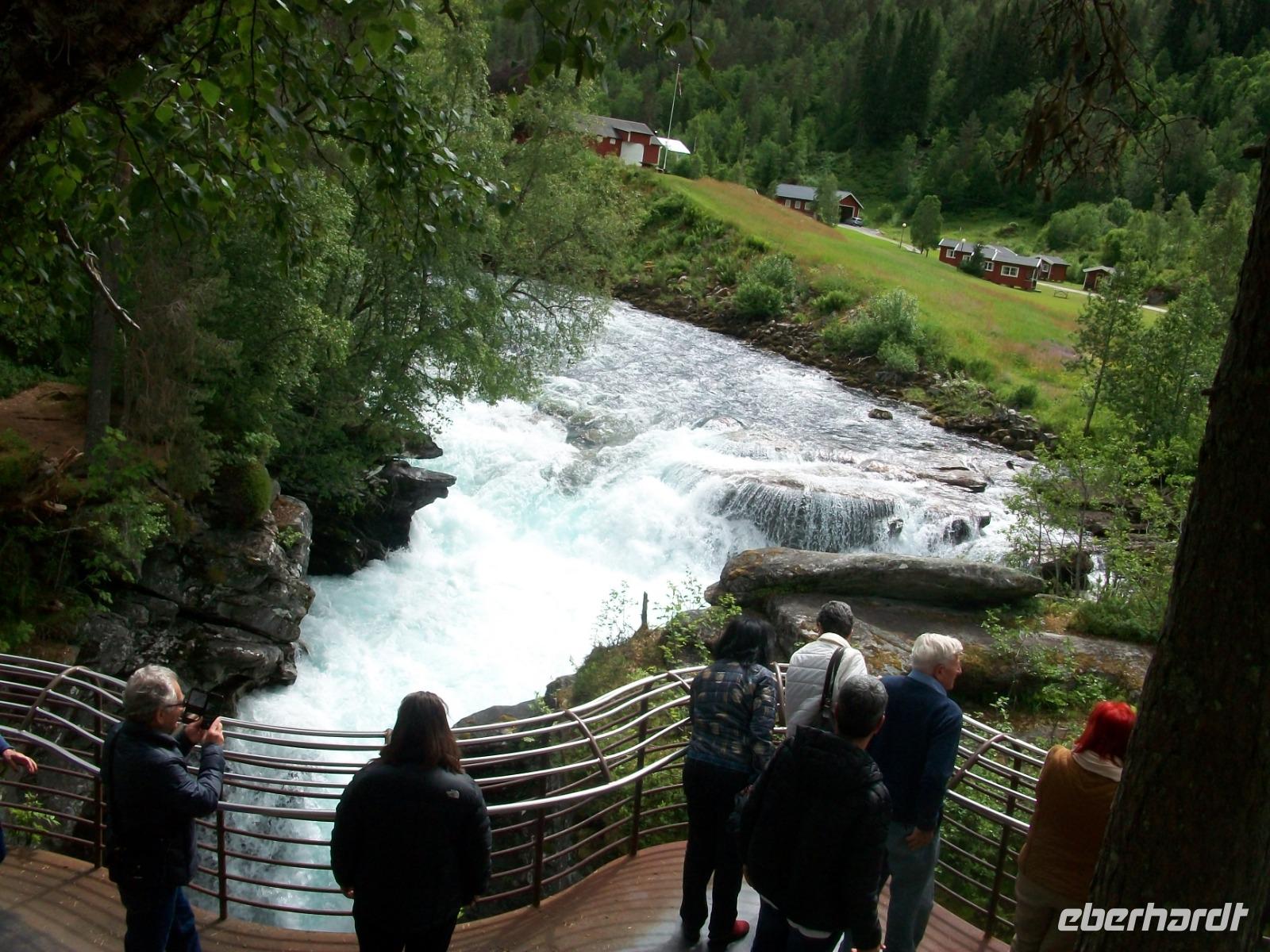 25.6.2019. Leider hat es die ganze Nacht geregnet; am Morgen wallt Nebel durch das Tal und die uns umgebenden Berge haben sich eine Wolkenmütze aufgesetzt. Wir starten gegen acht um über die schmale Straße wieder in zivilisiertere Gegenden zu gelangen. Manch Wasserfall donnert zu Tal und bald gelangen wir über Serpentinen hinauf auf das Sognefjell. Hier gibt es auch im Sommer noch reichlich Schnee, wir trauen kaum unseren Augen als wir hier doch tatsächlich Skifahrer sehen die auf gespurten Loipen Langlauf betreiben, in Deutschland steht das Thermometer derzeit auf über 30° Celsius!. Dann führt uns die Straße bergab und an den Fjorden haben wir dann wieder das Meeresniveau erreicht. Auch heute können wir eine kurze Fährüberfahrt genießen, danach geht es einem weiteren Ziel entgegen. Wir gelangen in den romantische Ort Flåm; direkt am Wasser gelegen liegt er eingebettet zwischen mächtigen Bergen. Hier verkehrt die bekannte Eisenbahn, ein kleines Museum zeigt den Interessierten die Geschichte dieser wichtigen Linie. Nach dieser ausgiebigen Mittagspause nehmen wir dann unsere Fahrt wieder auf und gelangen an Gudvangen vorbei wieder aufwärts. Entlang eines Sees geht es nun in ein Tal und bald kommt rechts der berühmte Wasserfall Twinde in unser Blickfeld. Dieses Naturereignis lassen wir uns keineswegs entgehen; donnernd sendet der Fall seine Wasser über zahlreiche Kaskaden zu Tal und wir stehen erneut staunend vor diesem Wunder der norwegischen Natur.