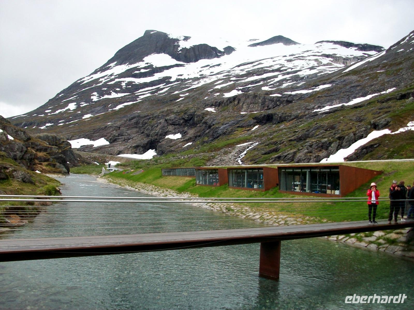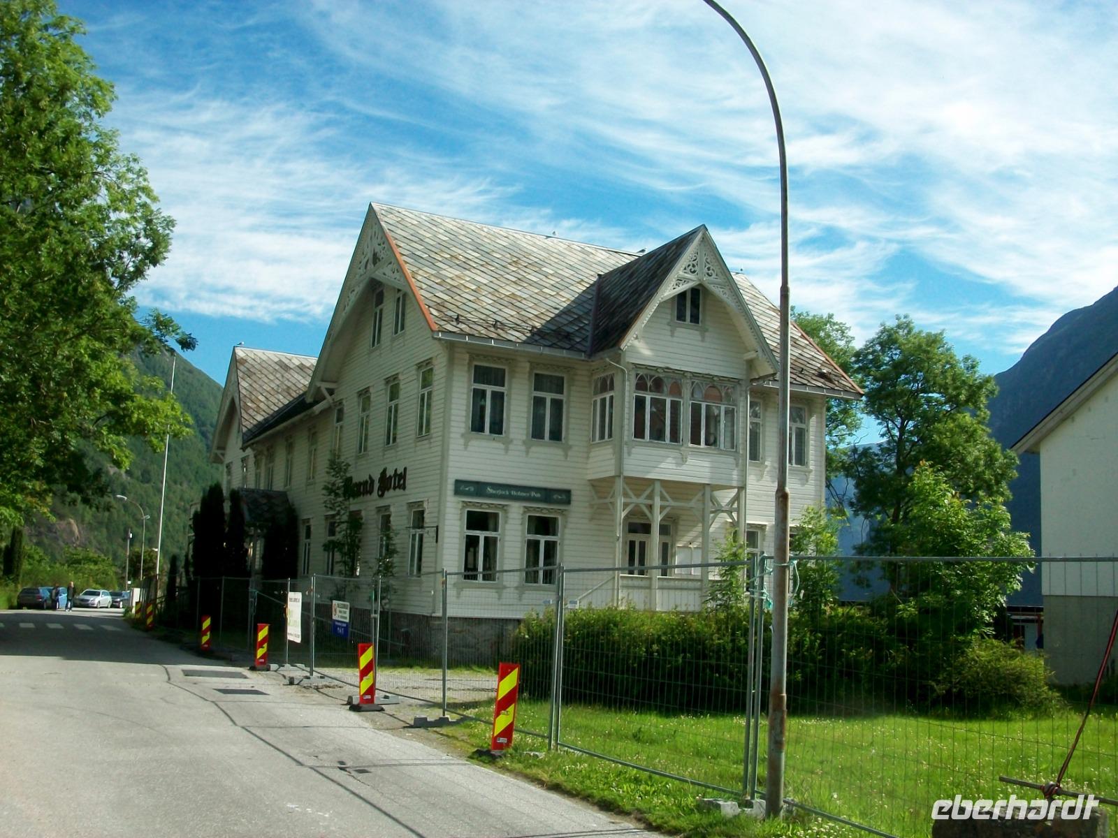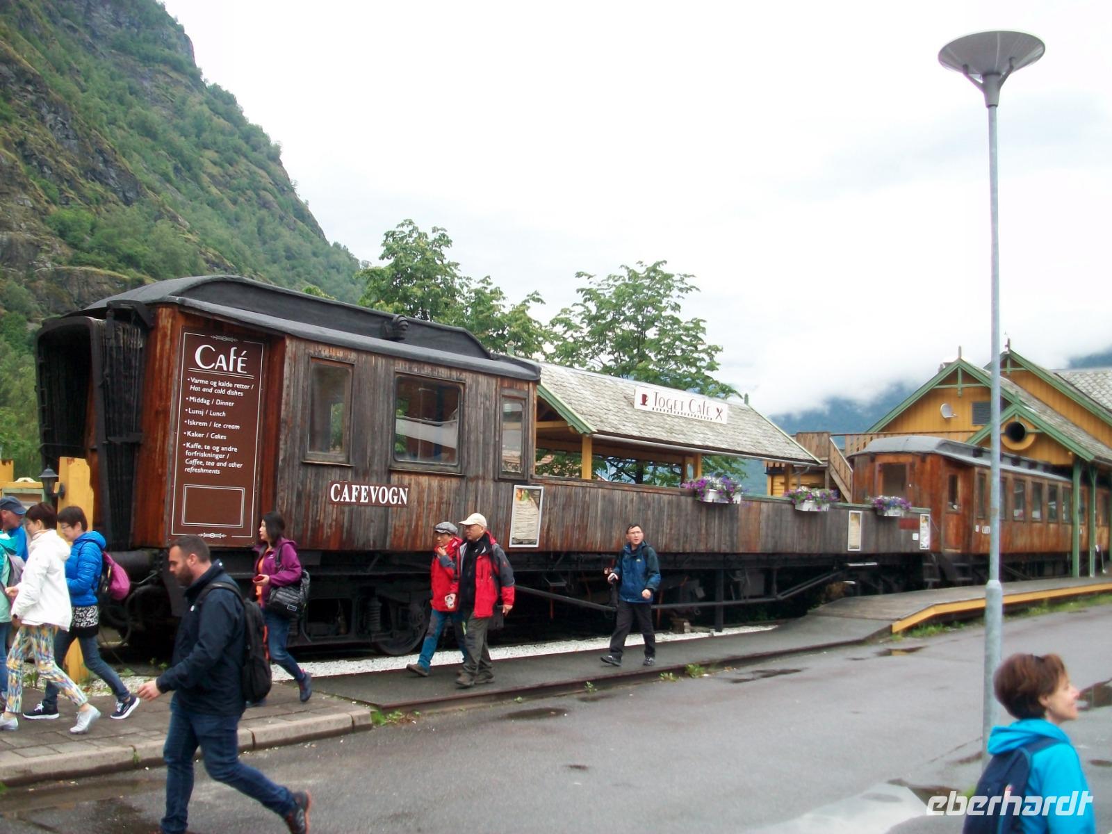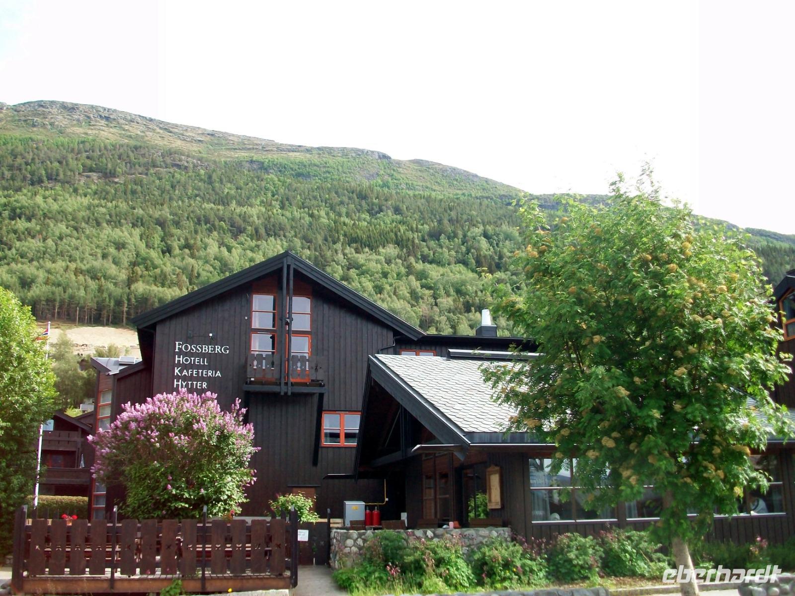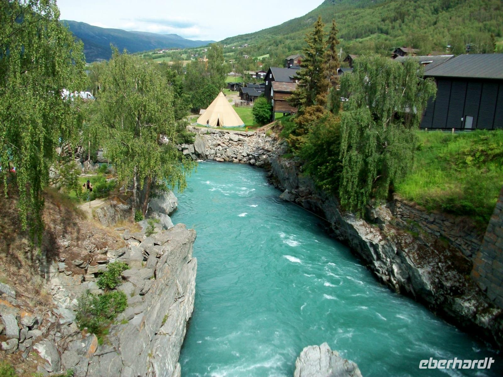 25.6.2019. Leider hat es die ganze Nacht geregnet; am Morgen wallt Nebel durch das Tal und die uns umgebenden Berge haben sich eine Wolkenmütze aufgesetzt. Wir starten gegen acht um über die schmale Straße wieder in zivilisiertere Gegenden zu gelangen. Manch Wasserfall donnert zu Tal und bald gelangen wir über Serpentinen hinauf auf das Sognefjell. Hier gibt es auch im Sommer noch reichlich Schnee, wir trauen kaum unseren Augen als wir hier doch tatsächlich Skifahrer sehen die auf gespurten Loipen Langlauf betreiben, in Deutschland steht das Thermometer derzeit auf über 30° Celsius!. Dann führt uns die Straße bergab und an den Fjorden haben wir dann wieder das Meeresniveau erreicht. Auch heute können wir eine kurze Fährüberfahrt genießen, danach geht es einem weiteren Ziel entgegen. Wir gelangen in den romantische Ort Flåm; direkt am Wasser gelegen liegt er eingebettet zwischen mächtigen Bergen. Hier verkehrt die bekannte Eisenbahn, ein kleines Museum zeigt den Interessierten die Geschichte dieser wichtigen Linie. Nach dieser ausgiebigen Mittagspause nehmen wir dann unsere Fahrt wieder auf und gelangen an Gudvangen vorbei wieder aufwärts. Entlang eines Sees geht es nun in ein Tal und bald kommt rechts der berühmte Wasserfall Twinde in unser Blickfeld. Dieses Naturereignis lassen wir uns keineswegs entgehen; donnernd sendet der Fall seine Wasser über zahlreiche Kaskaden zu Tal und wir stehen erneut staunend vor diesem Wunder der norwegischen Natur.
