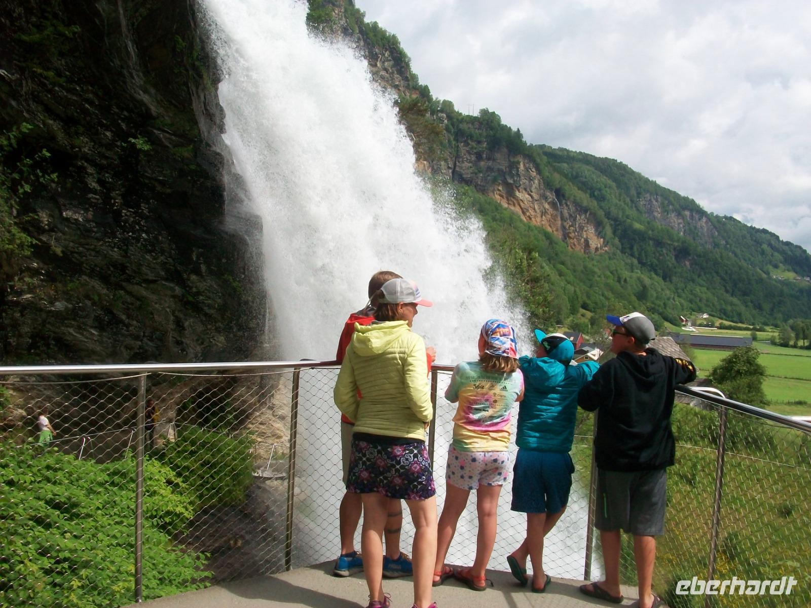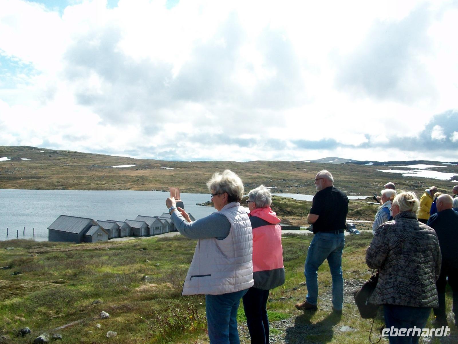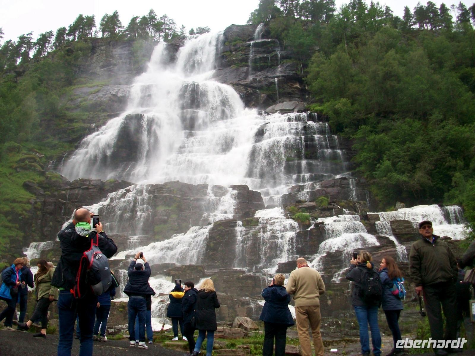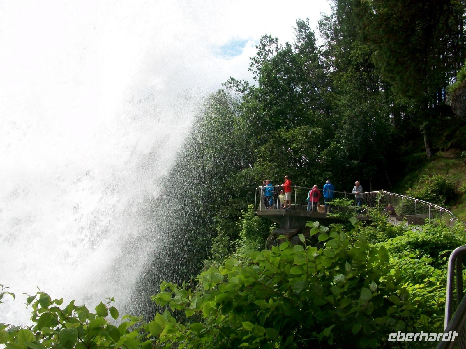 Dann nehmen wir die Fahrt wieder auf; am ausladenden Hardangerfjord mit seinen Fischfarmen entlang, gelangen wir zu einem weiteren gigantischen Wasserfall, dem Vöringfoss. Leider hat sich gerade jetzt eine dicke Wolke über das Land gelegt, so dass wir nur sein Rauschen hören können, schade.