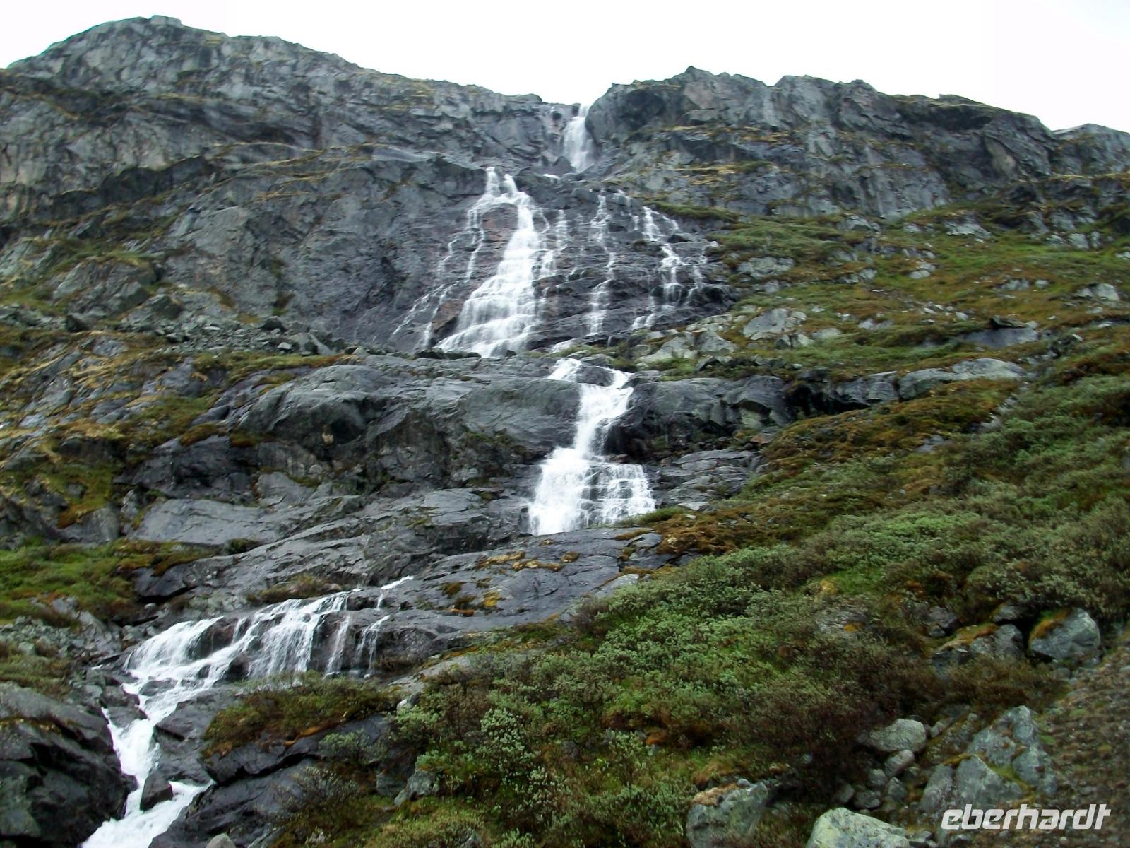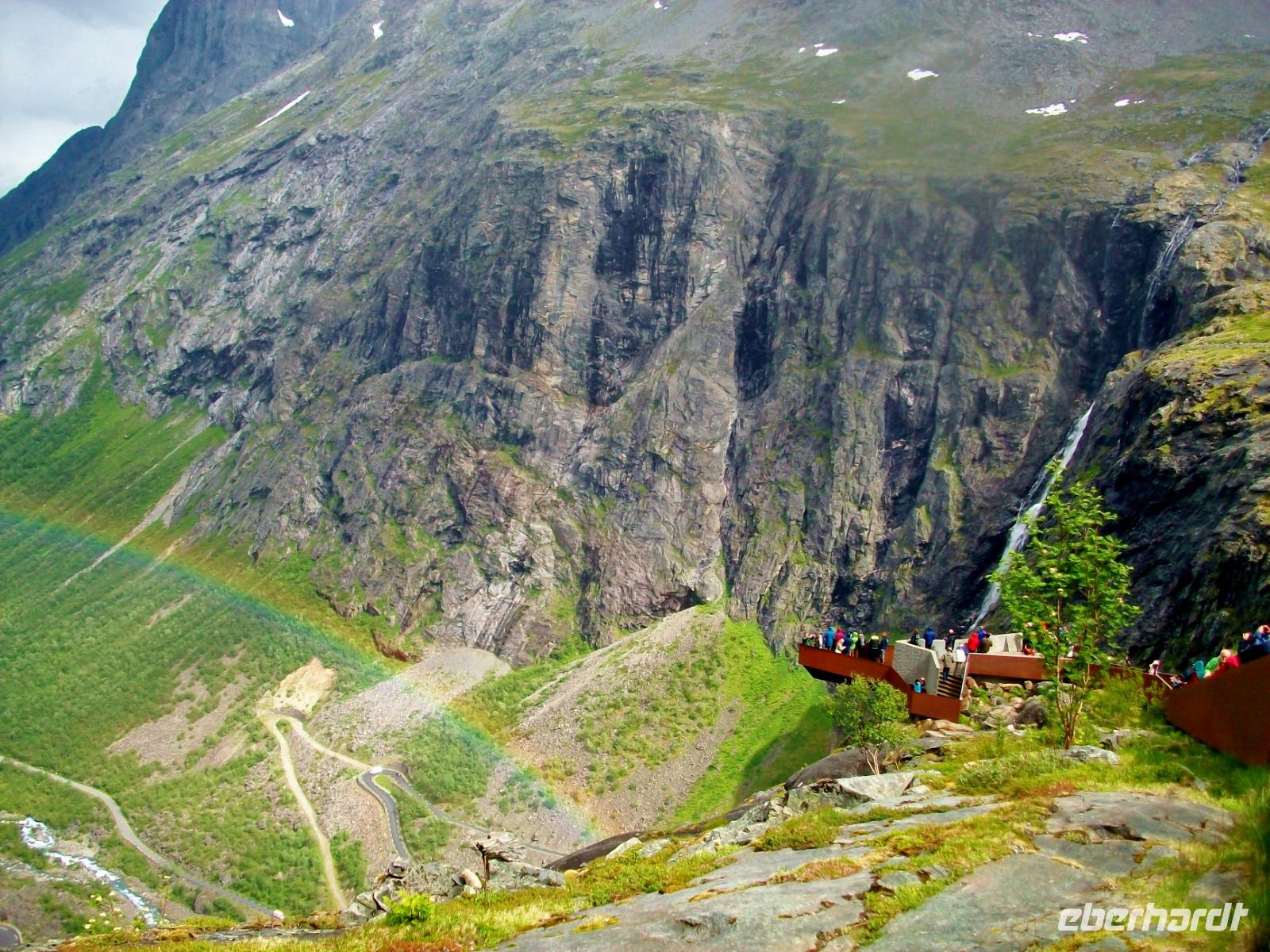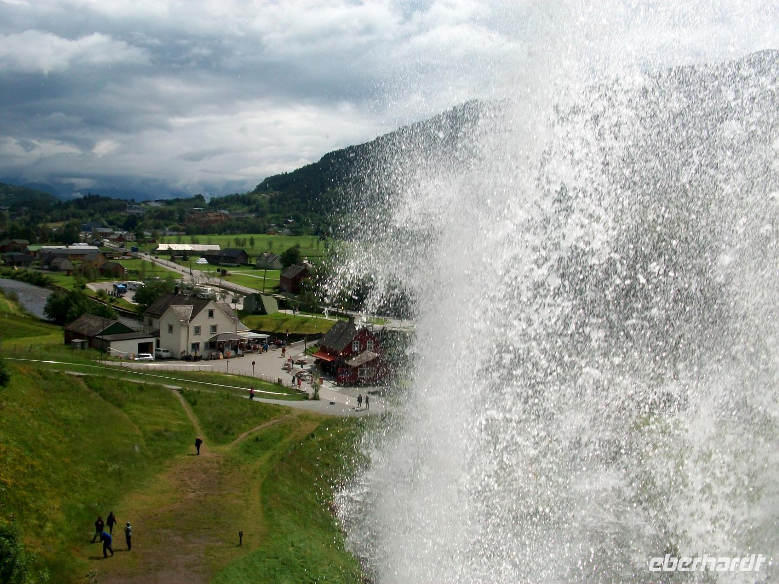Dann nehmen wir die Fahrt wieder auf; am ausladenden Hardangerfjord mit seinen Fischfarmen entlang, gelangen wir zu einem weiteren gigantischen Wasserfall, dem Vöringfoss. Leider hat sich gerade jetzt eine dicke Wolke über das Land gelegt, so dass wir nur sein Rauschen hören können, schade.