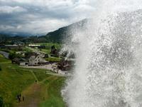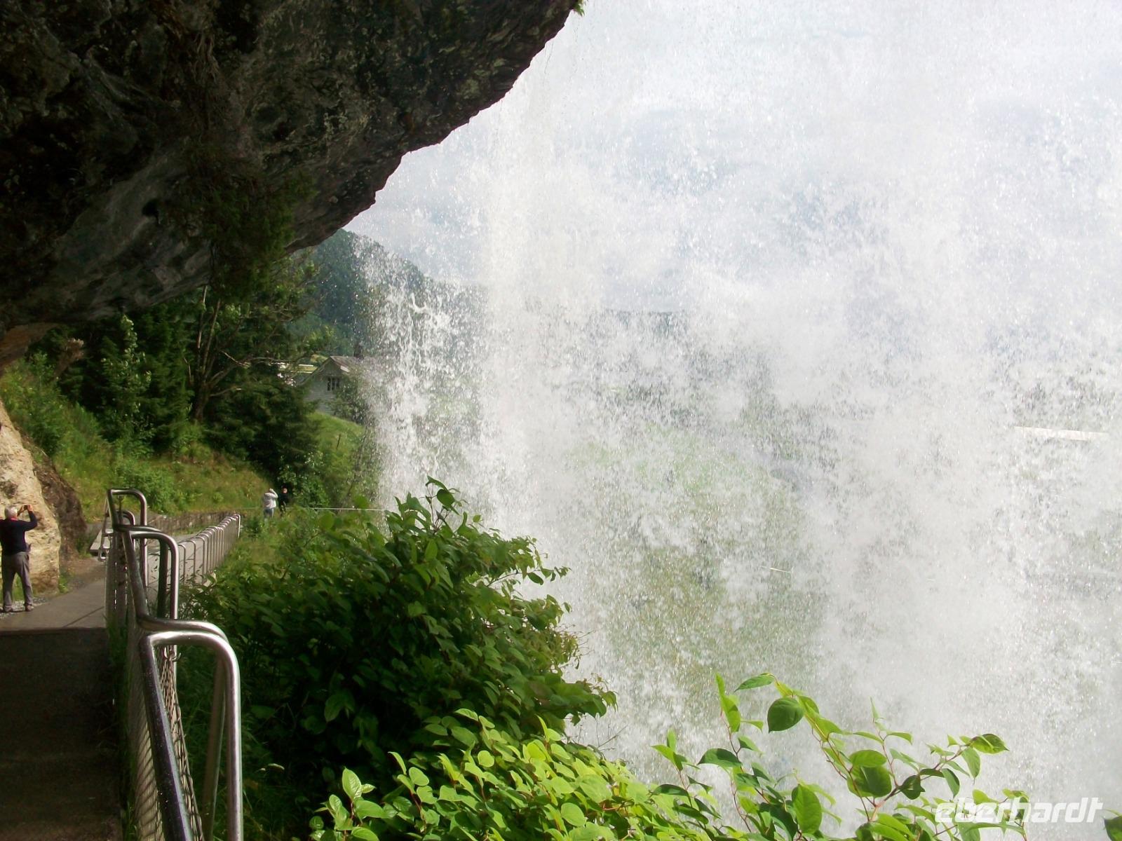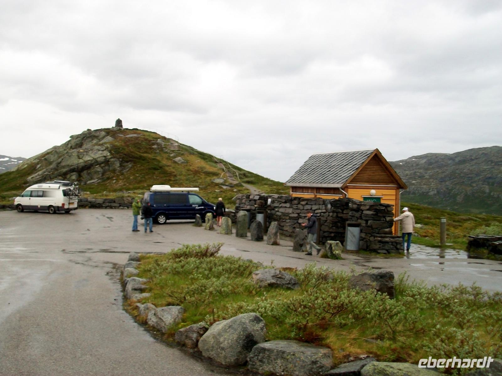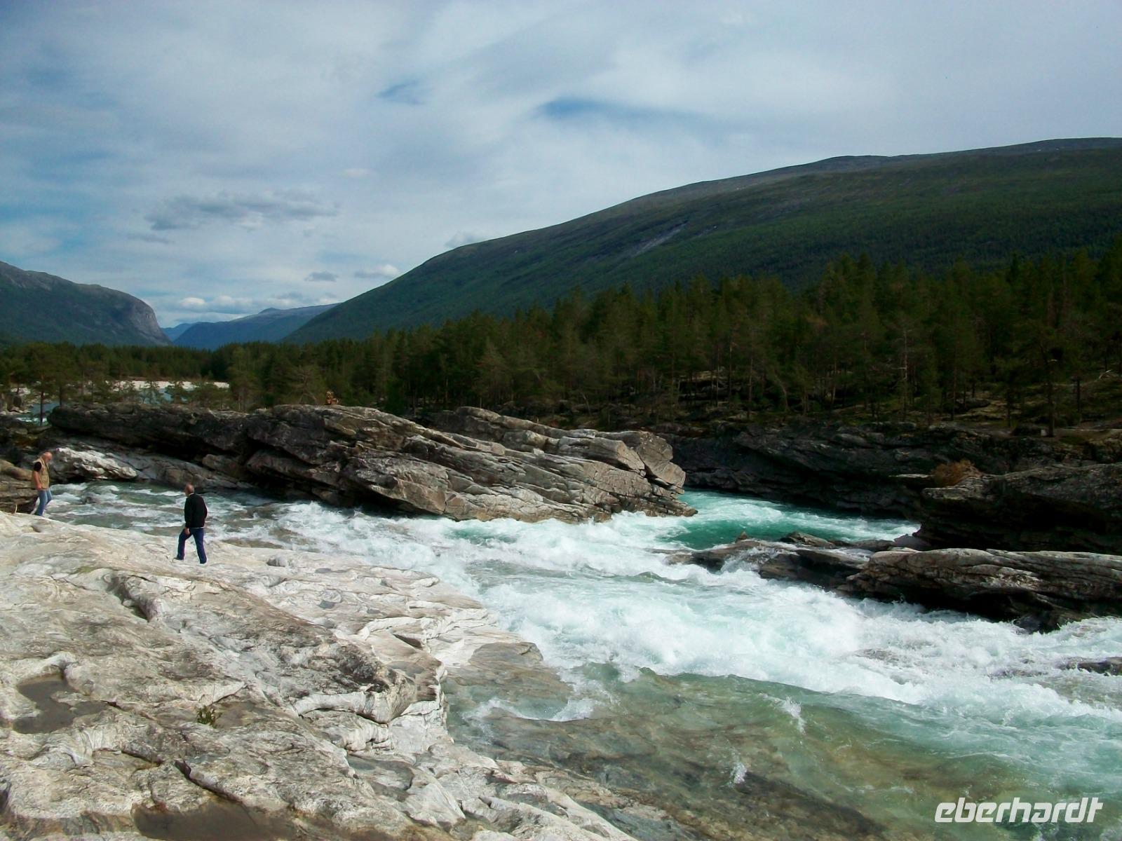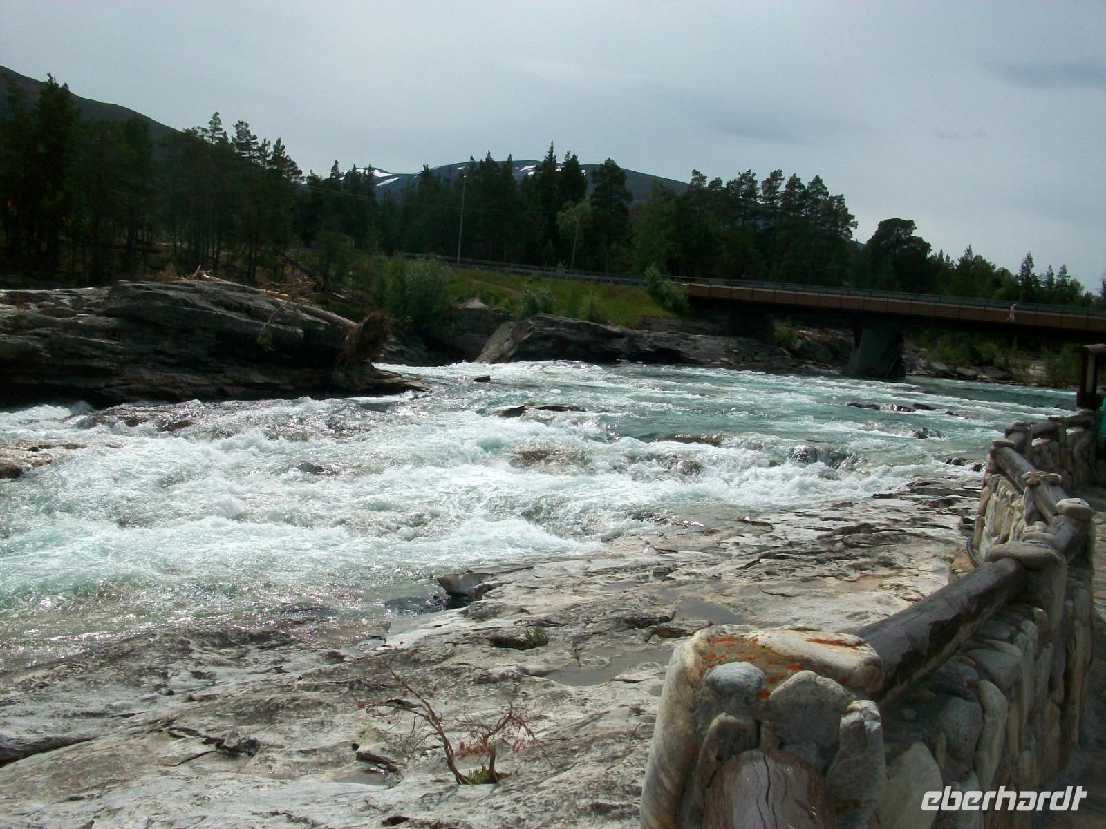 Dann nehmen wir die Fahrt wieder auf; am ausladenden Hardangerfjord mit seinen Fischfarmen entlang, gelangen wir zu einem weiteren gigantischen Wasserfall, dem Vöringfoss. Leider hat sich gerade jetzt eine dicke Wolke über das Land gelegt, so dass wir nur sein Rauschen hören können, schade.