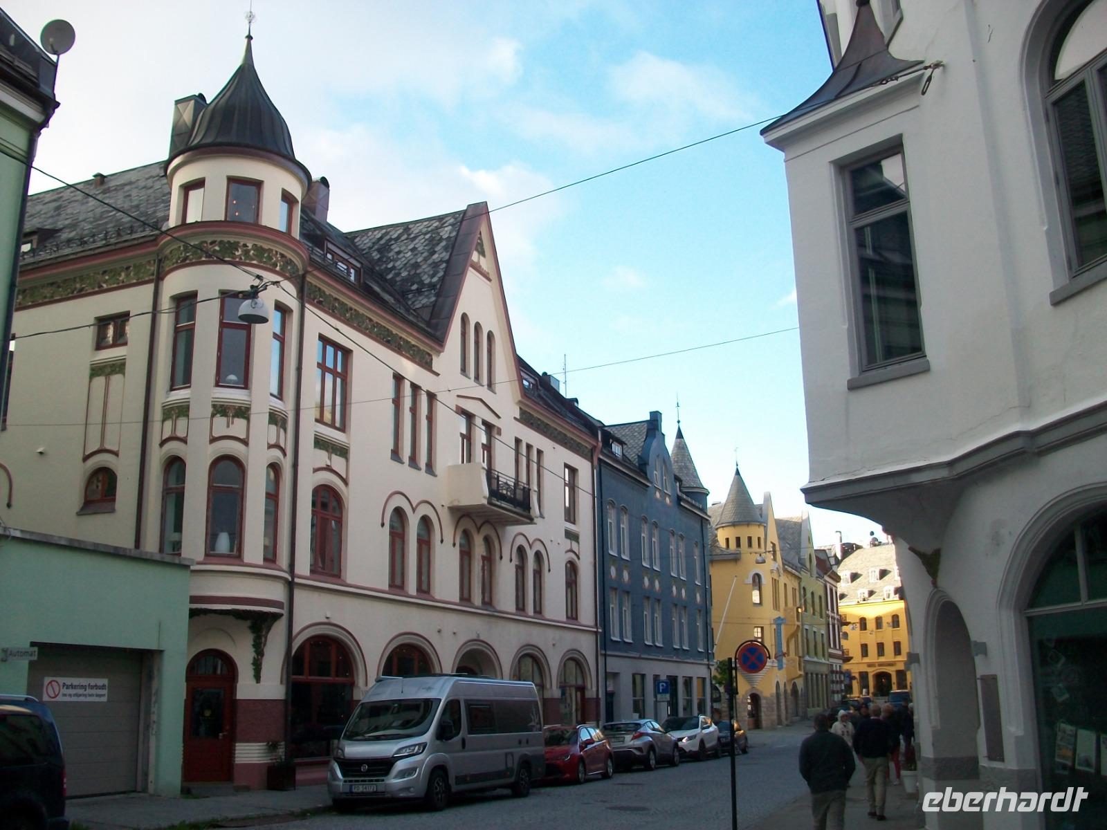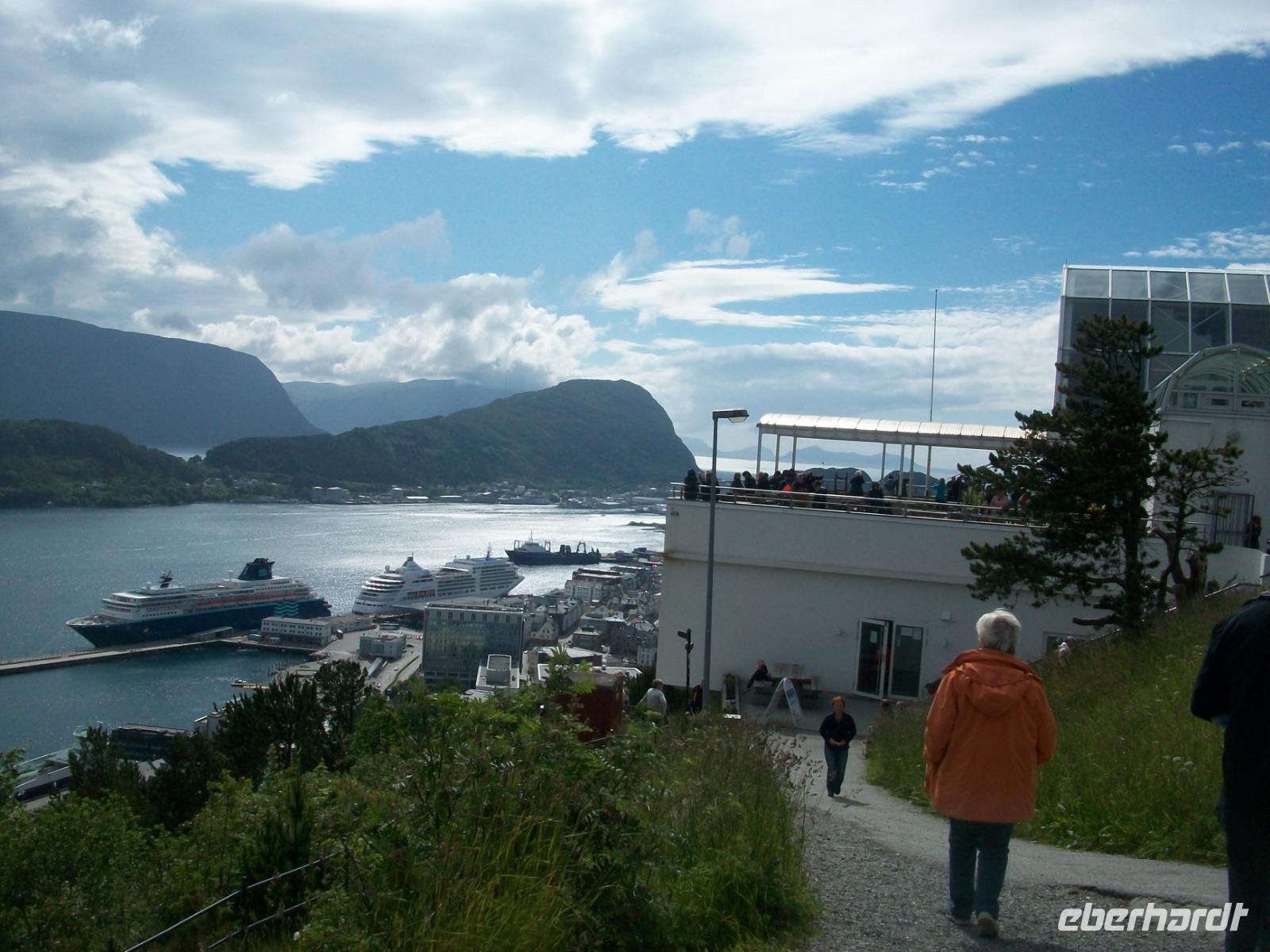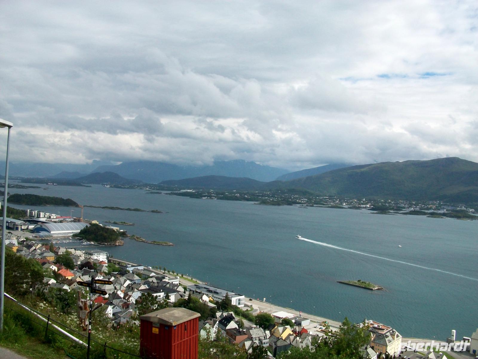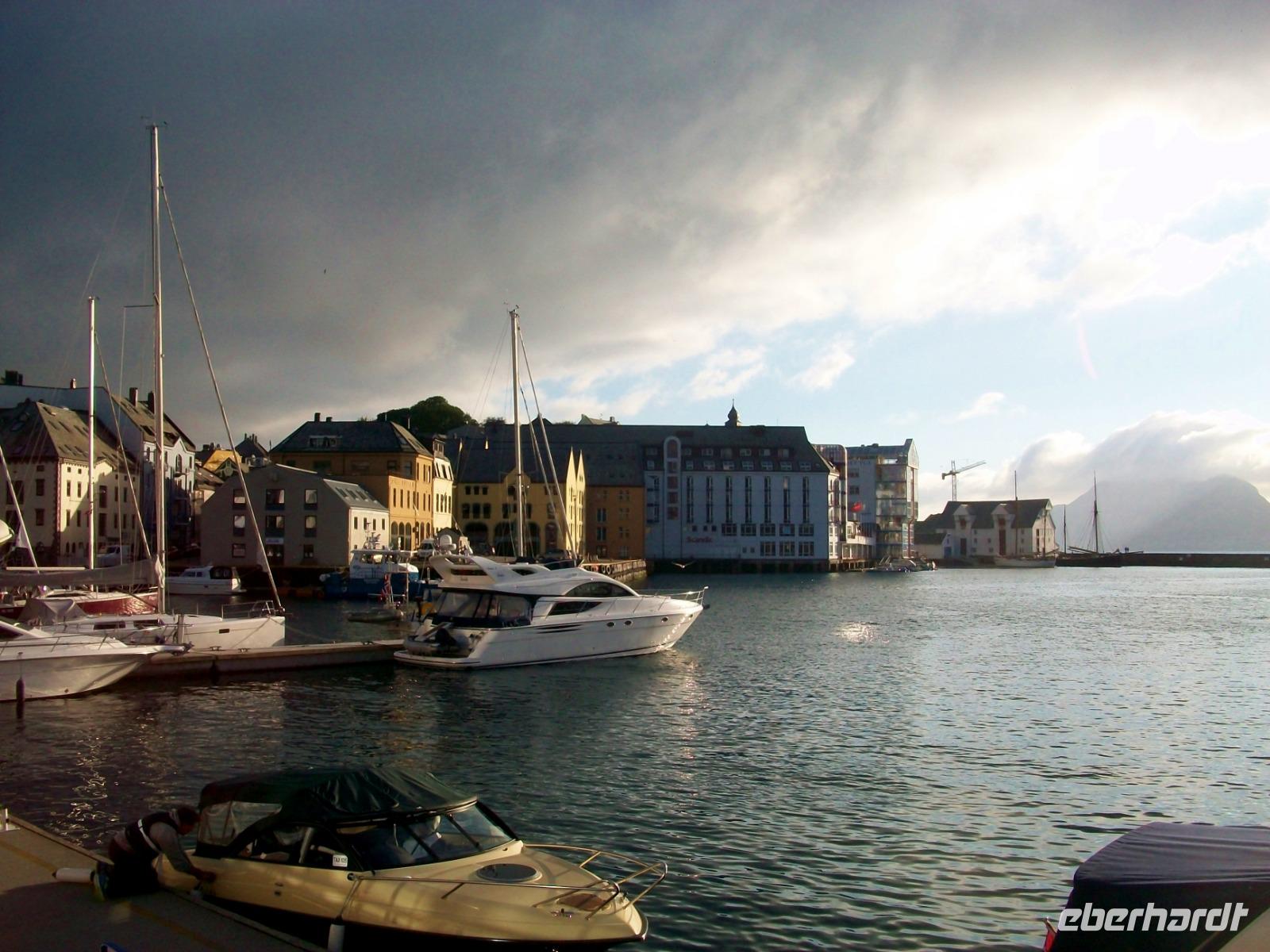 Doch dann geht es weiter und wieder zu Tal. Langsam geht es abwärts, wir durchfahren grüne Wälder und erreichen bald wieder die Fjorde. Manchmal durch Tunnels, dann wieder direkt am Wasser entlang, die Zeit vergeht mit diesen unvergesslichen Impressionen wie im Flug, am späteren Nachmittag haben wir dann unser Ziel Ålesund erreicht.