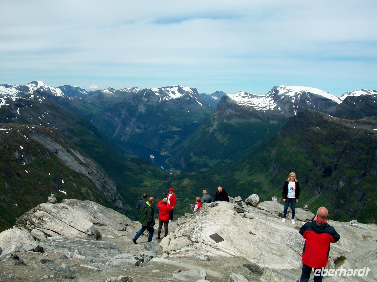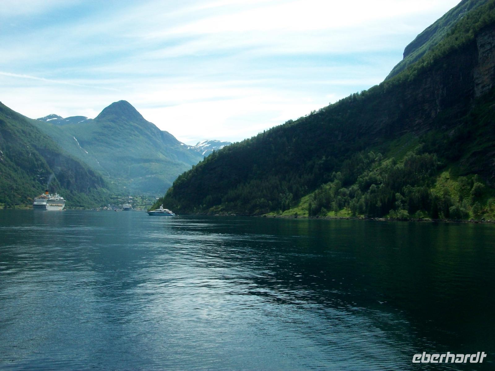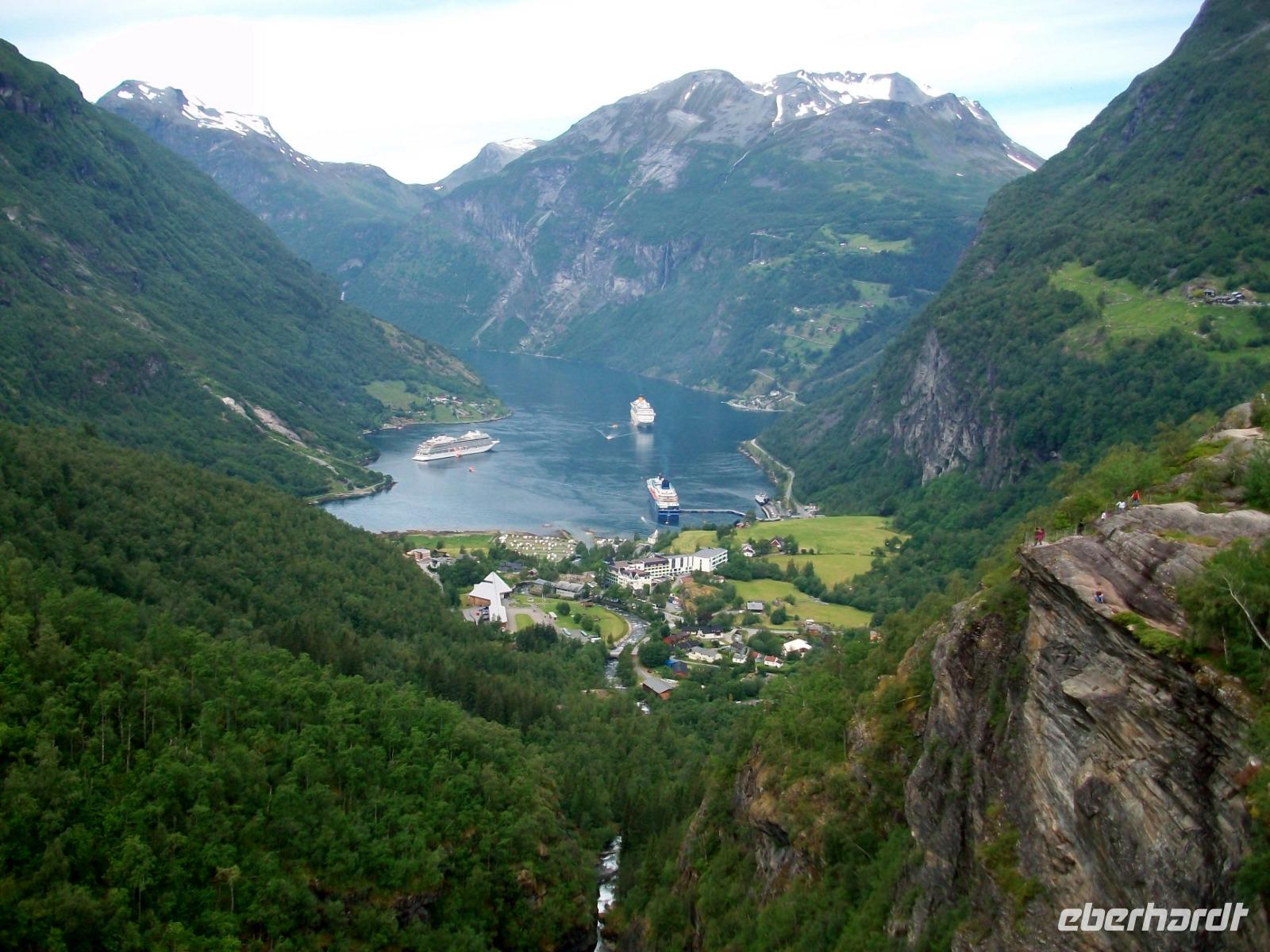 Hier, im Ort Geiranger, herrscht viel Trubel den wir auch ganz schnell verlassen um von einem höheren Standpunkt aus noch einen Blick auf den Fjord, die Schiffe und die Berge ringsum zu werfen.