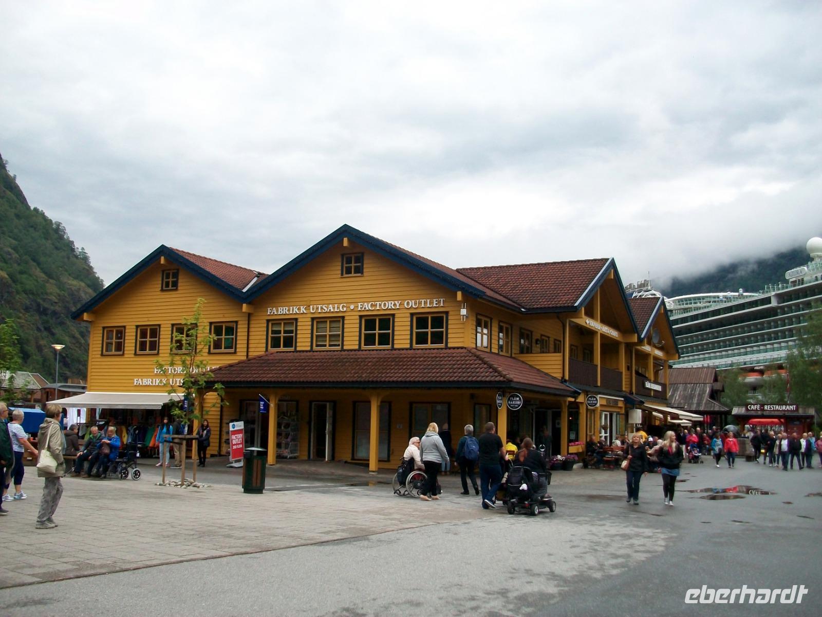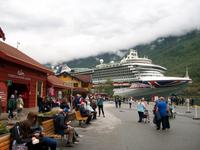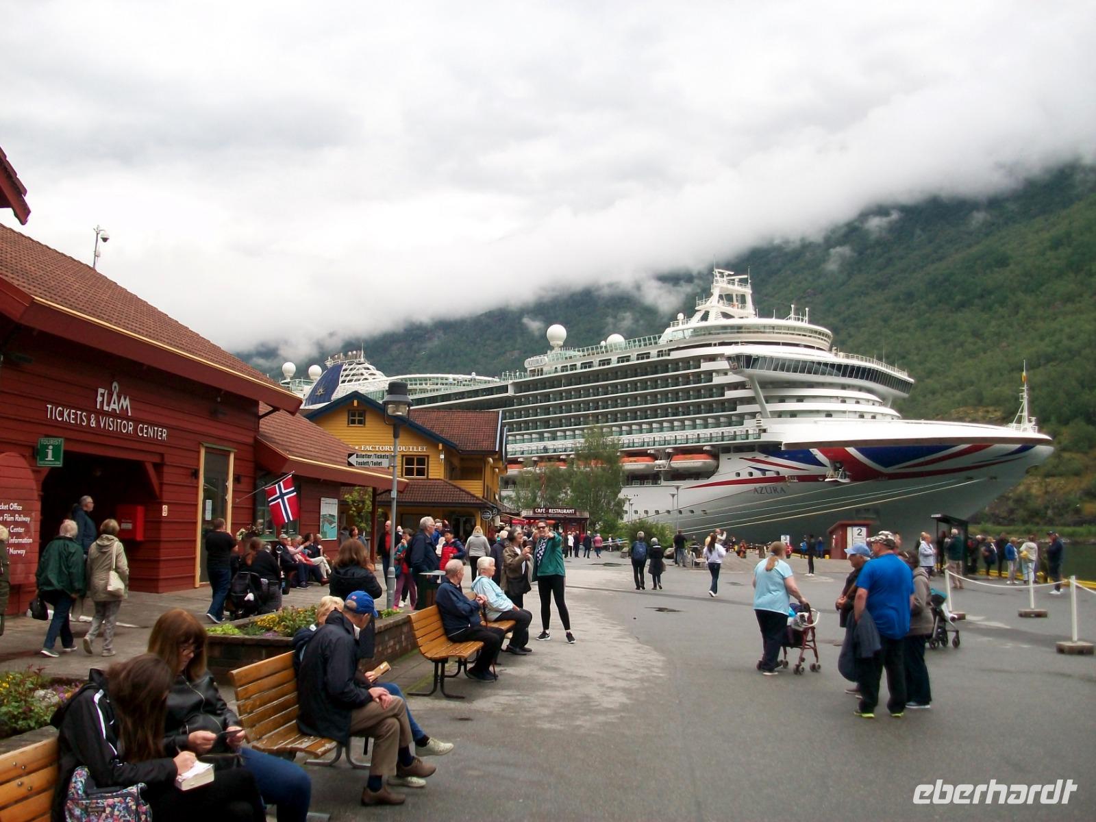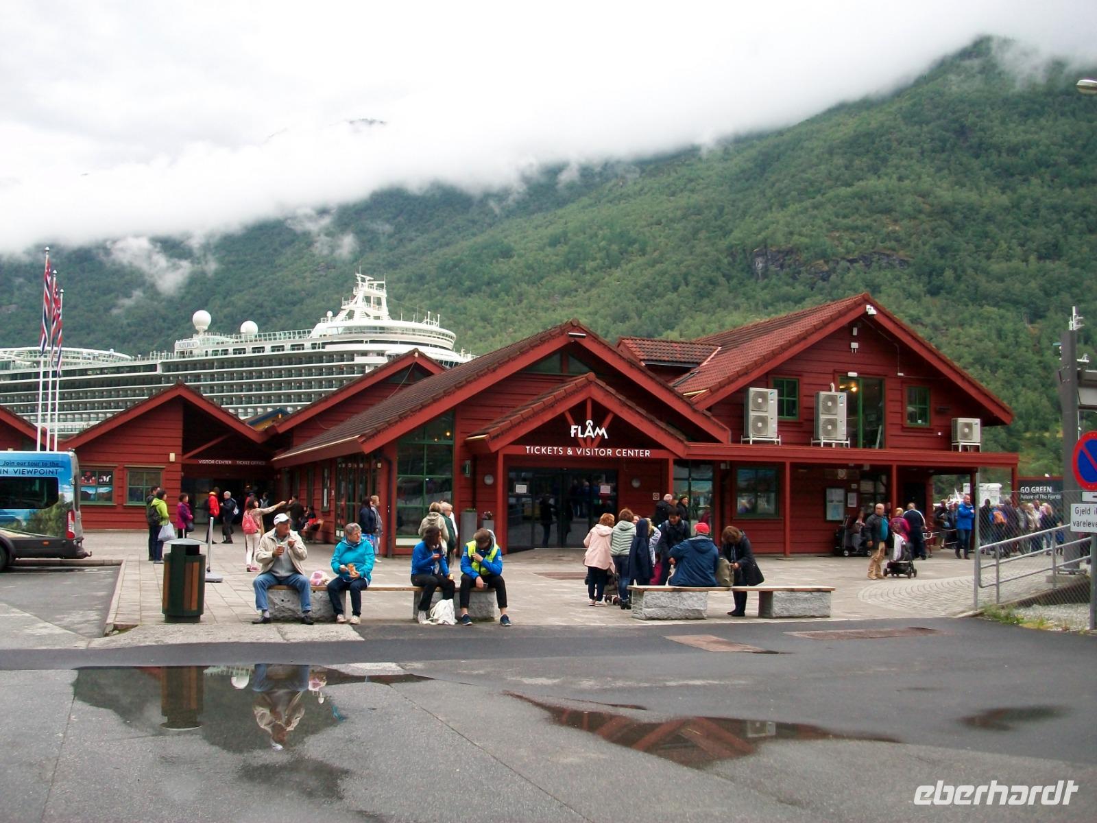 Hier, im Ort Geiranger, herrscht viel Trubel den wir auch ganz schnell verlassen um von einem höheren Standpunkt aus noch einen Blick auf den Fjord, die Schiffe und die Berge ringsum zu werfen.