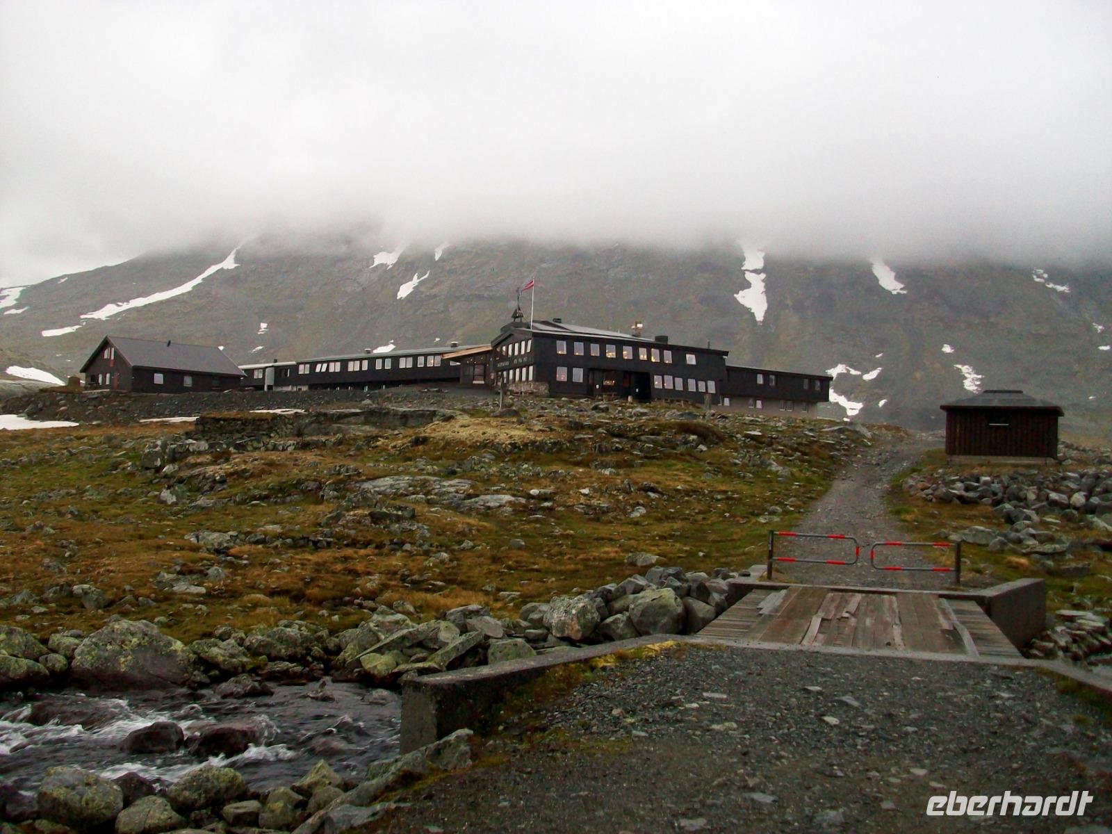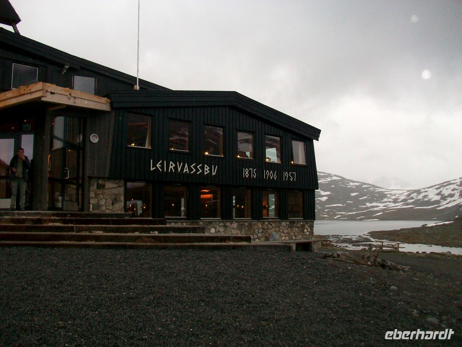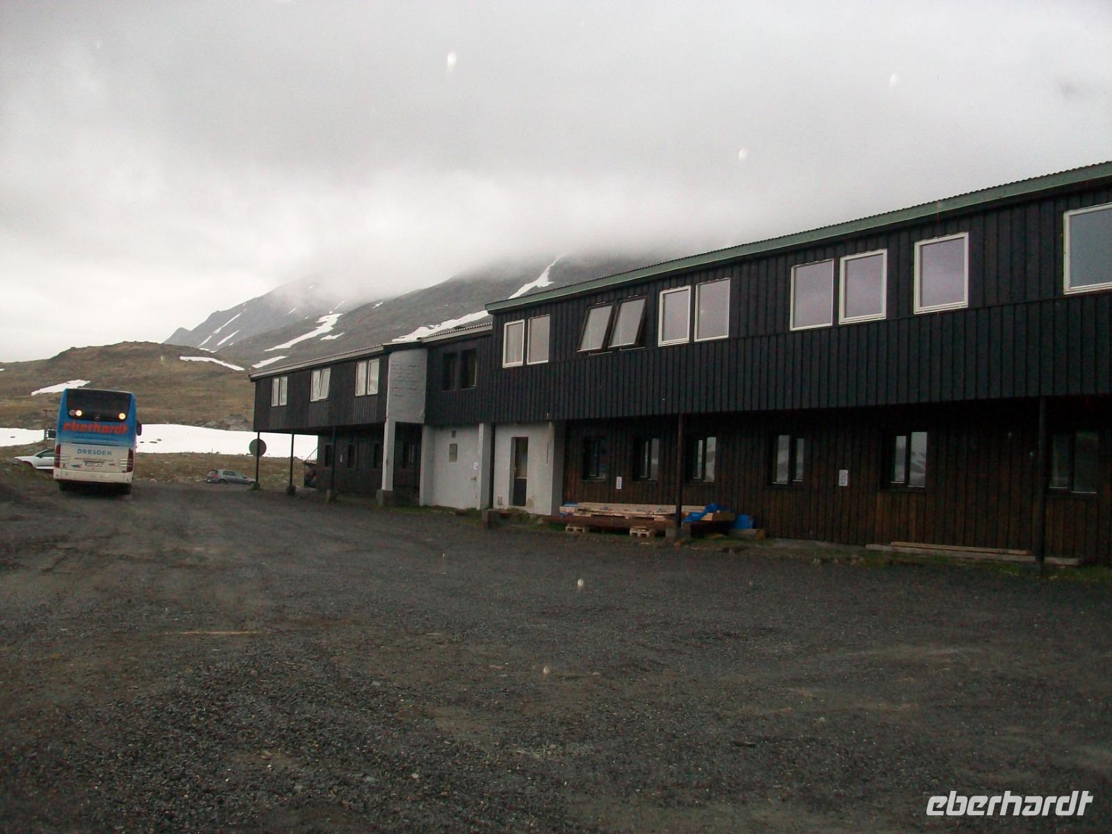 Dann starten wir um heute zu unserem besonderen Hotel Leirvassbu zu gelangen. Die Fahrt dahin zeigt sich sehr abenteuerlich. Weit über der Baumgrenze verlassen wir die Zivilisation um auf einer schmalen Straße unserem Ziel näher zu kommen. Das Gebirge wird immer rauer, Schneereste säumen bald unsere Bahn, aber wo ist unser Hotel? Nach einer halben Stunde taucht es dann doch auf, es ist das einzige Gebäude hier und ganz romantisch genießen wir hier, am Ende der Welt, ein schmackhaftes Abendessen und eine wirklich ungestörte Nachtruhe.