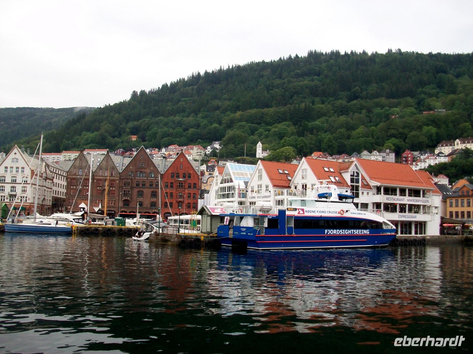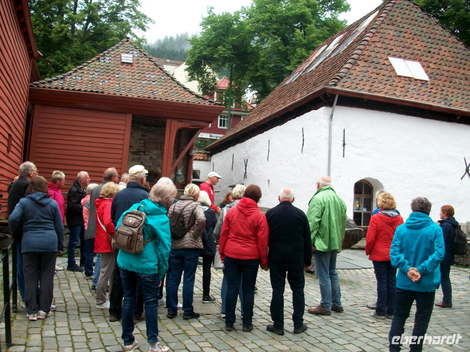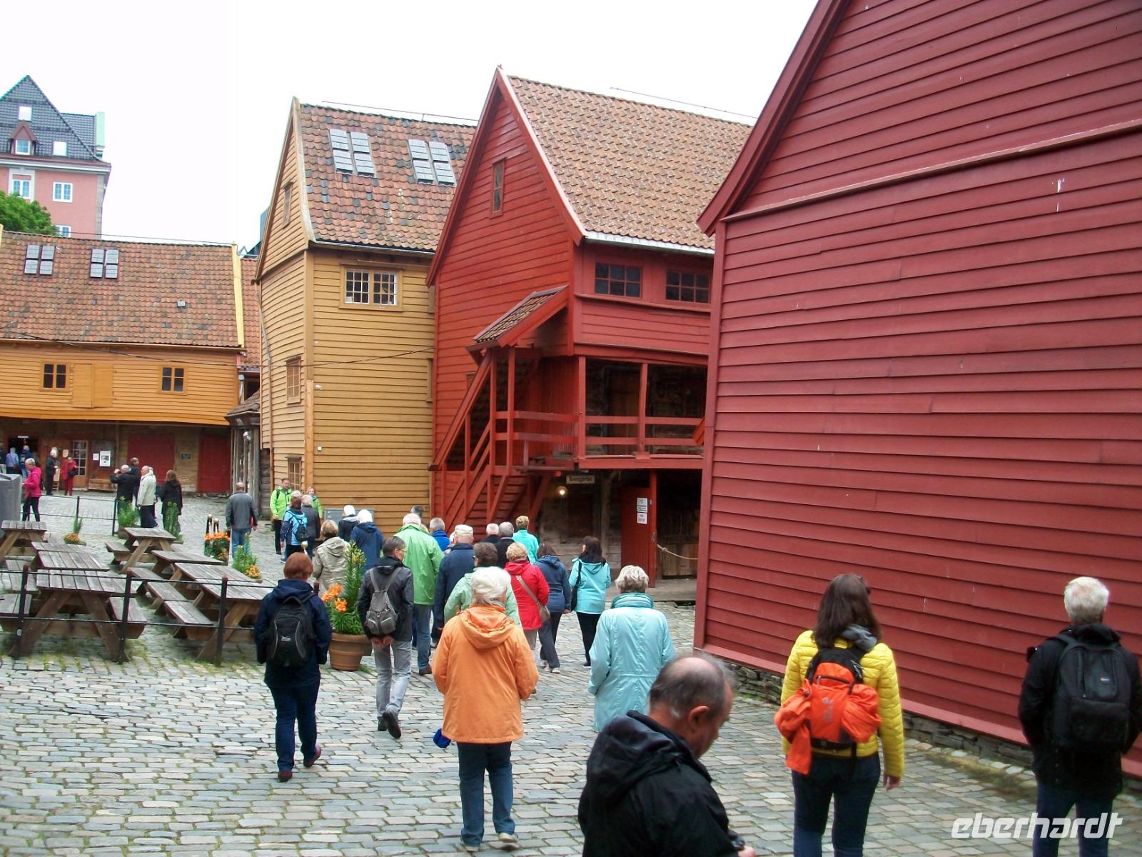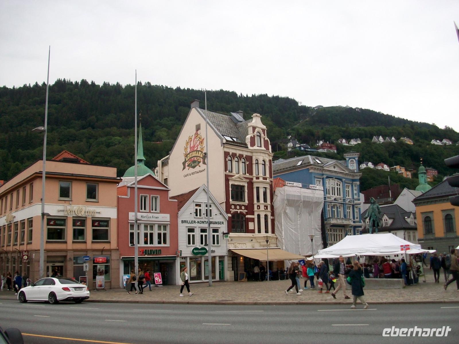 26.6.2019. Nach dem eigenen Erkunden Bergens am gestrigen Nachmittag haben wir heute Morgen Ed eingeladen uns seine Wahlheimat zu zeigen. Der Bus steht bereit, die Koffer sind verladen und es kann losgehen. Zunächst erkunden wir die Stadt mit dem Bus; kreuz und quer geht es durch die manchmal recht engen Straßen. Wir sehen die schönen Häuser, das Theater und die moderne Edvard - Grieg - Halle, benannt nach dem großen Sohn dieser Stadt. Dann gehen wir auf Erkundung im historischen Teil Bryggen. Hier hatte die Hanse einst eines ihrer Kontore und zwischen den bunten Holzhäusern fühlen wir uns gleich um Jahrhunderte in der Zeit zurückversetzt. Nach etwas Freizeit machen wir uns nun auf zu weiteren Erkundungen Norwegens. Wir verlassen die Küste und gelangen erneut in das reizvolle Hinterland. Außerordentlich sehenswert ist der Steindalfoss, ein beeindruckender Wasserfall der sein Wasser von einem Felsvorsprung sendet so dass der Besucher dahinter treten kann, außerordentlich beeindruckend!