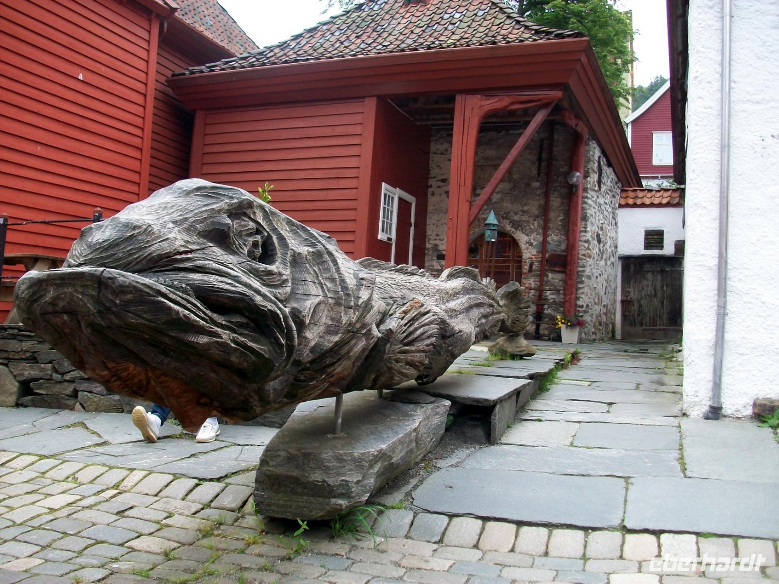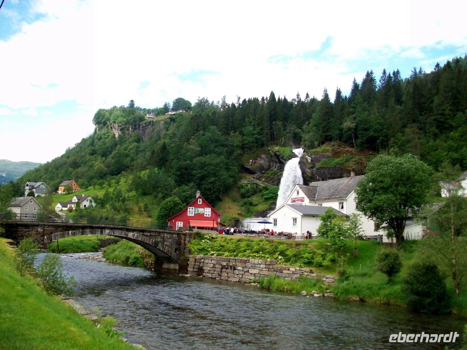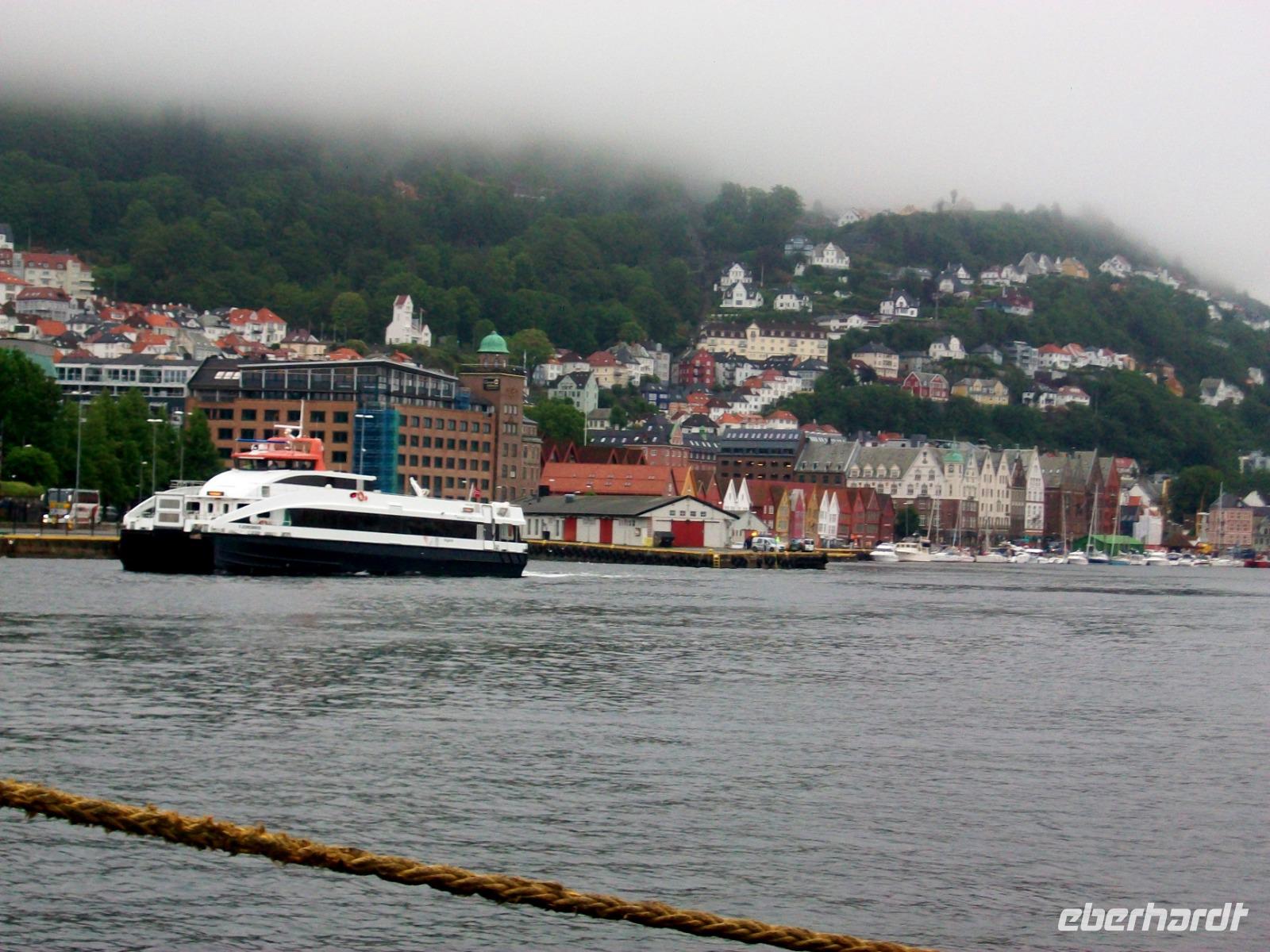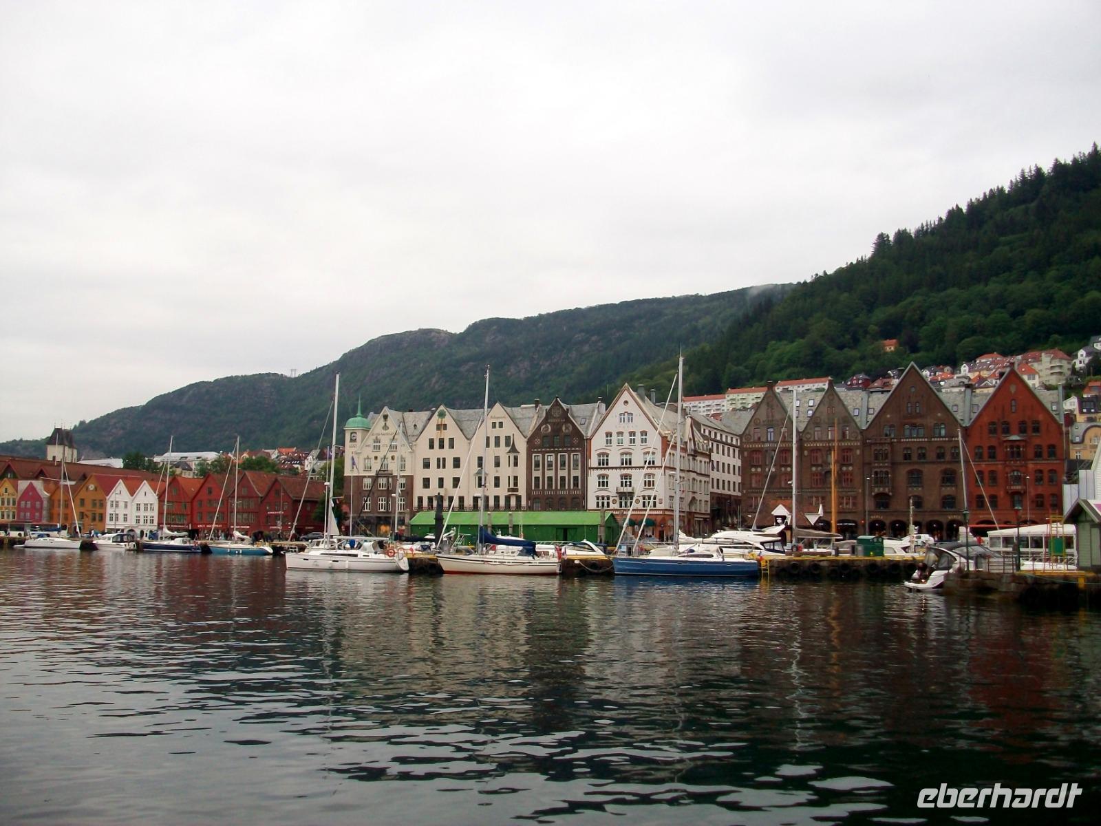 26.6.2019. Nach dem eigenen Erkunden Bergens am gestrigen Nachmittag haben wir heute Morgen Ed eingeladen uns seine Wahlheimat zu zeigen. Der Bus steht bereit, die Koffer sind verladen und es kann losgehen. Zunächst erkunden wir die Stadt mit dem Bus; kreuz und quer geht es durch die manchmal recht engen Straßen. Wir sehen die schönen Häuser, das Theater und die moderne Edvard - Grieg - Halle, benannt nach dem großen Sohn dieser Stadt. Dann gehen wir auf Erkundung im historischen Teil Bryggen. Hier hatte die Hanse einst eines ihrer Kontore und zwischen den bunten Holzhäusern fühlen wir uns gleich um Jahrhunderte in der Zeit zurückversetzt. Nach etwas Freizeit machen wir uns nun auf zu weiteren Erkundungen Norwegens. Wir verlassen die Küste und gelangen erneut in das reizvolle Hinterland. Außerordentlich sehenswert ist der Steindalfoss, ein beeindruckender Wasserfall der sein Wasser von einem Felsvorsprung sendet so dass der Besucher dahinter treten kann, außerordentlich beeindruckend!