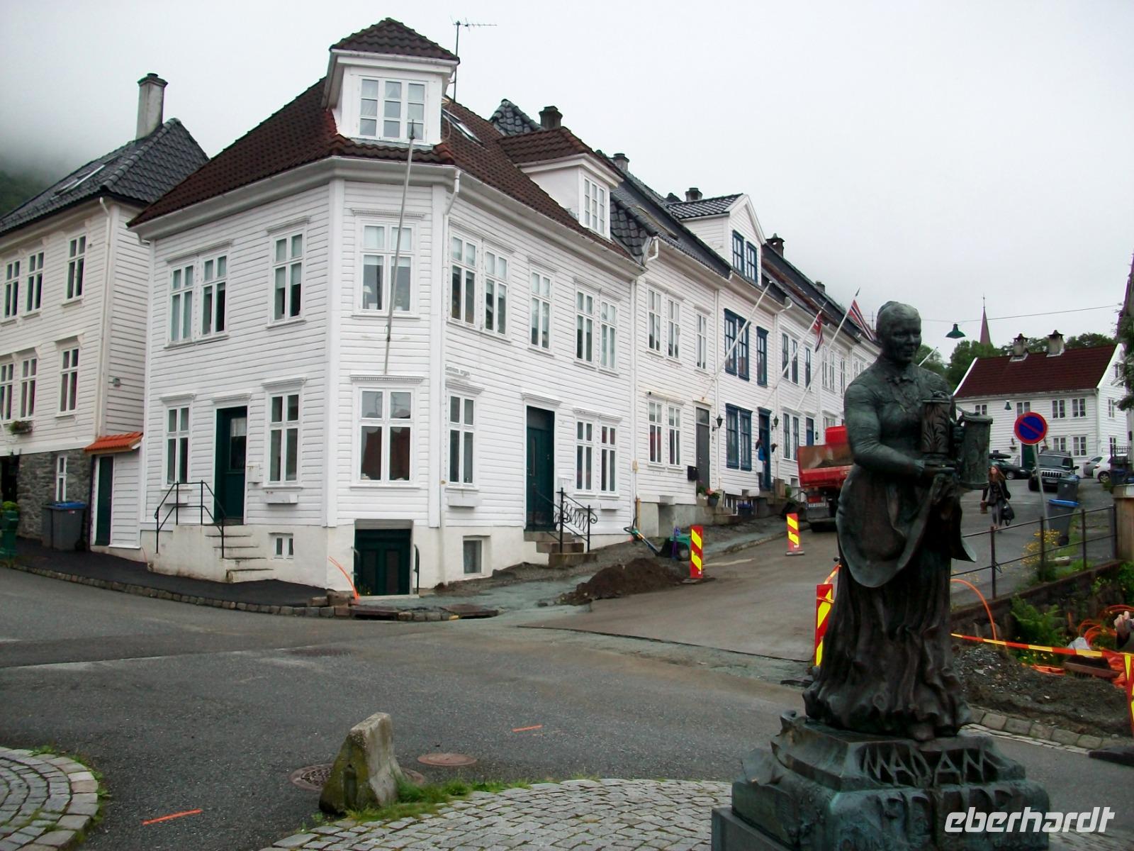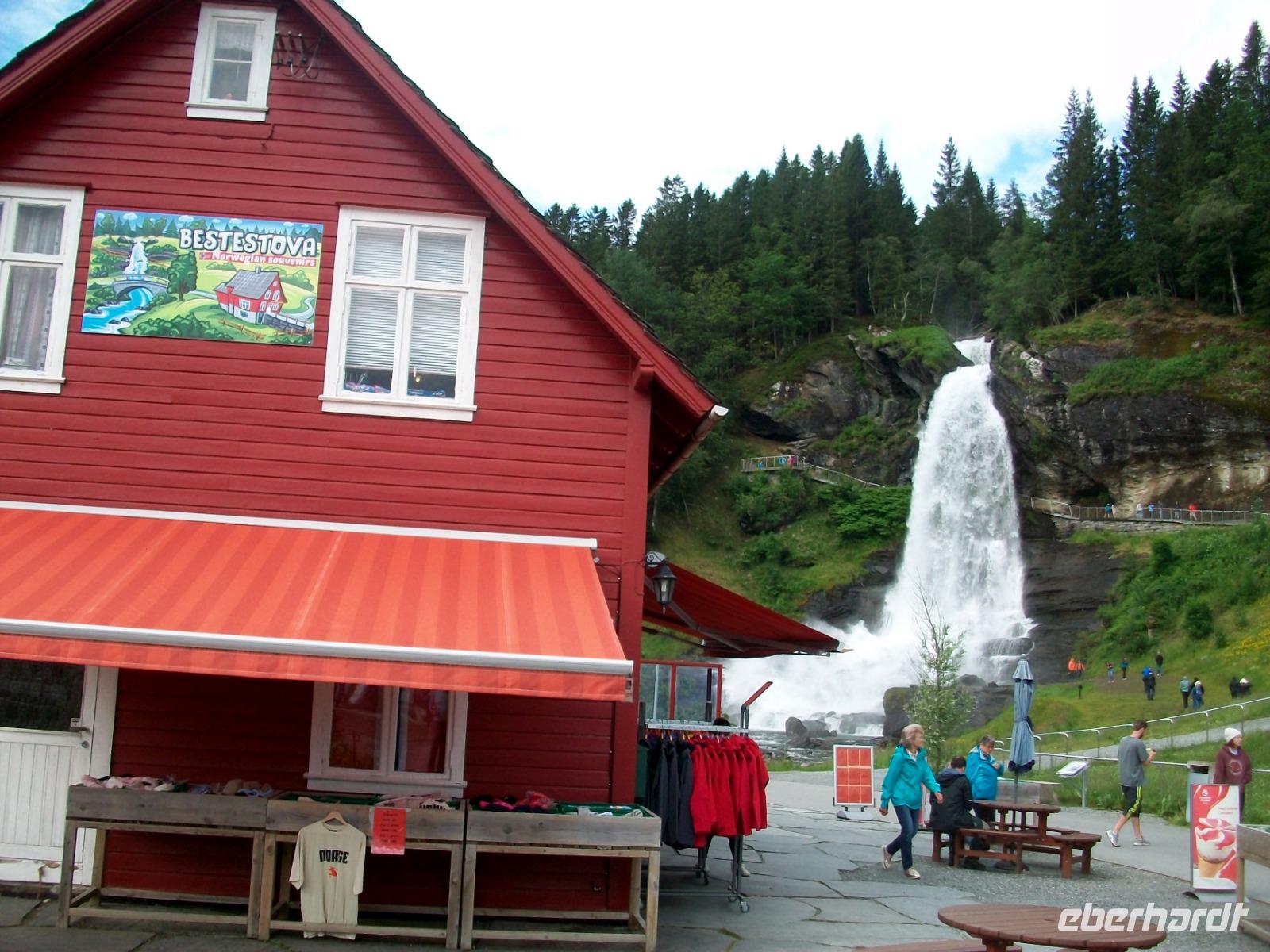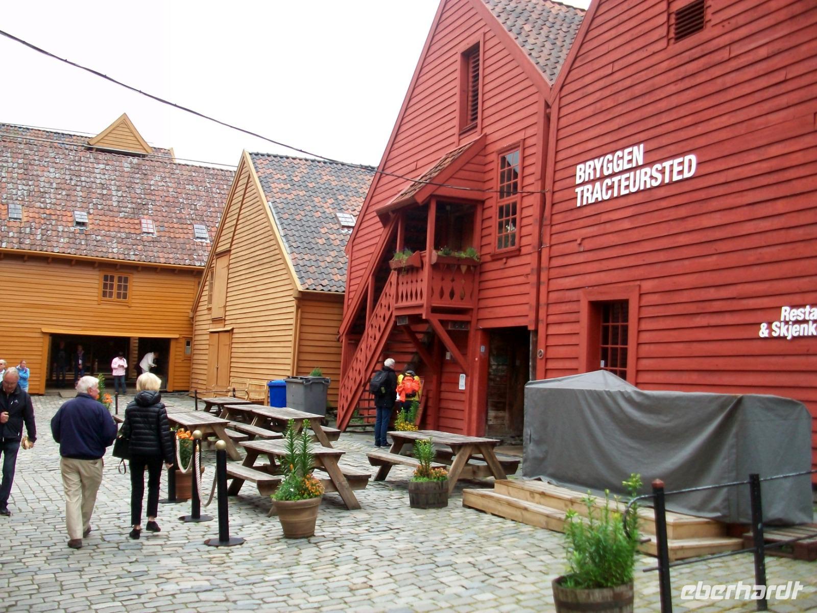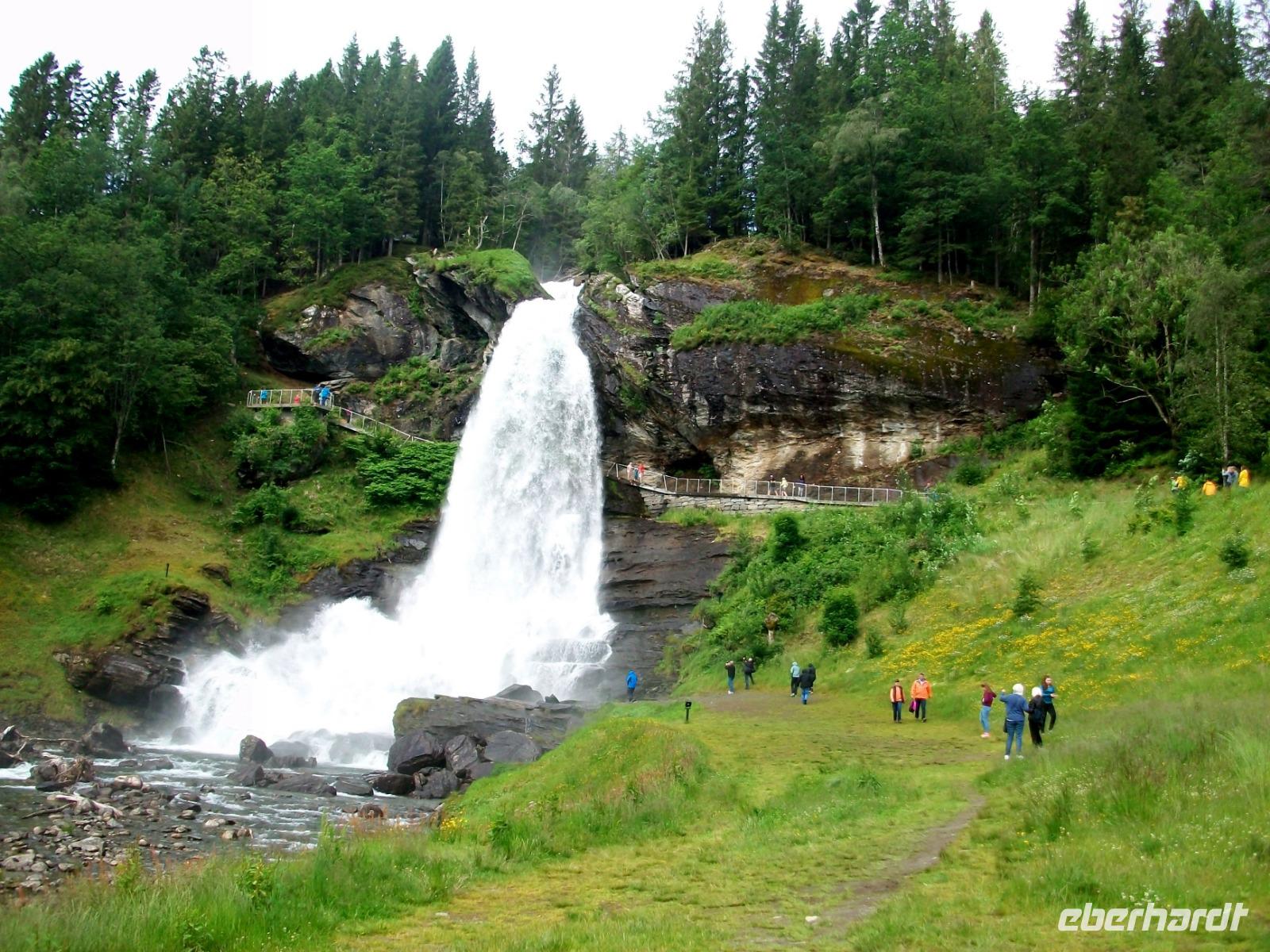 26.6.2019. Nach dem eigenen Erkunden Bergens am gestrigen Nachmittag haben wir heute Morgen Ed eingeladen uns seine Wahlheimat zu zeigen. Der Bus steht bereit, die Koffer sind verladen und es kann losgehen. Zunächst erkunden wir die Stadt mit dem Bus; kreuz und quer geht es durch die manchmal recht engen Straßen. Wir sehen die schönen Häuser, das Theater und die moderne Edvard - Grieg - Halle, benannt nach dem großen Sohn dieser Stadt. Dann gehen wir auf Erkundung im historischen Teil Bryggen. Hier hatte die Hanse einst eines ihrer Kontore und zwischen den bunten Holzhäusern fühlen wir uns gleich um Jahrhunderte in der Zeit zurückversetzt. Nach etwas Freizeit machen wir uns nun auf zu weiteren Erkundungen Norwegens. Wir verlassen die Küste und gelangen erneut in das reizvolle Hinterland. Außerordentlich sehenswert ist der Steindalfoss, ein beeindruckender Wasserfall der sein Wasser von einem Felsvorsprung sendet so dass der Besucher dahinter treten kann, außerordentlich beeindruckend!