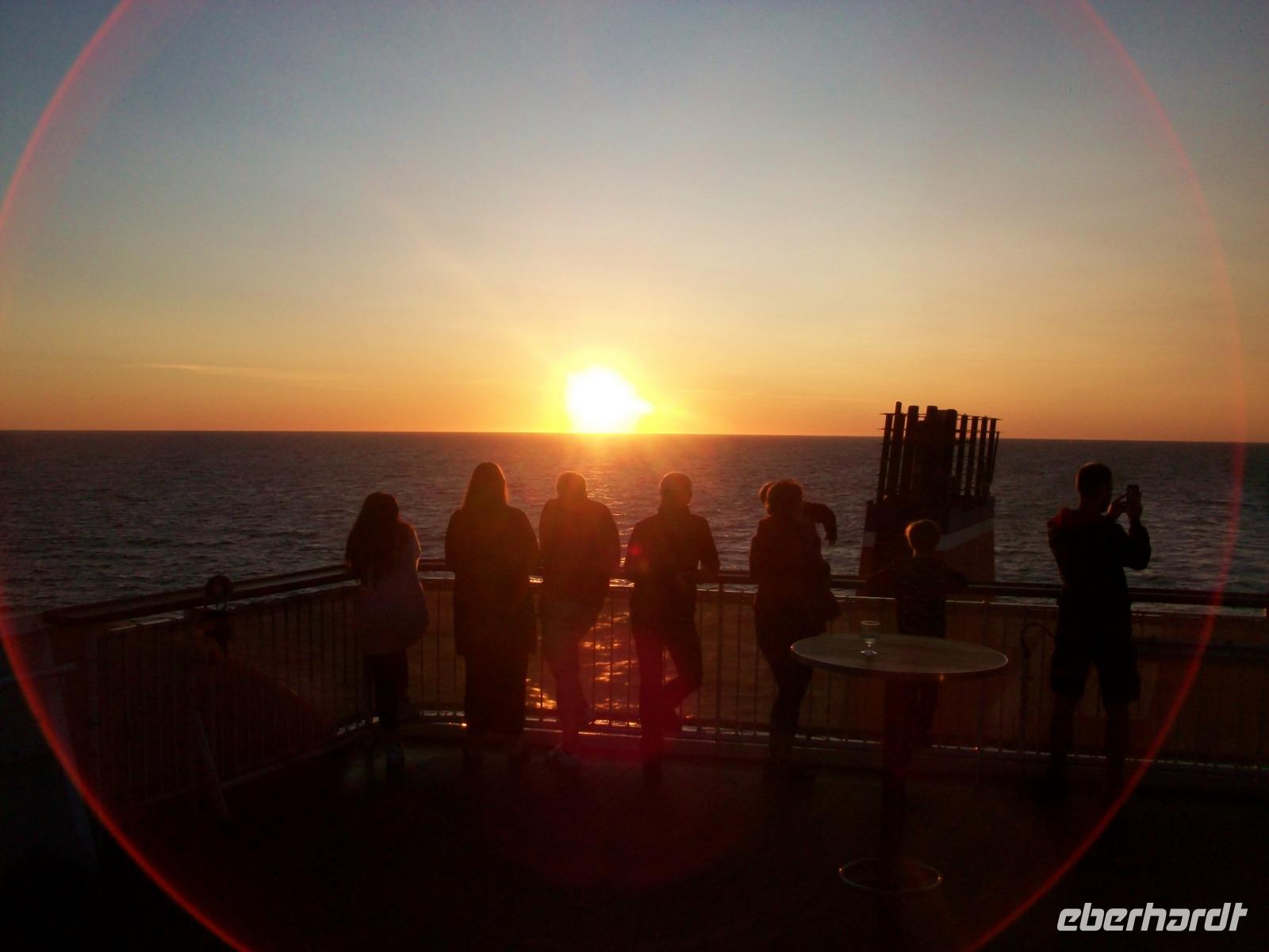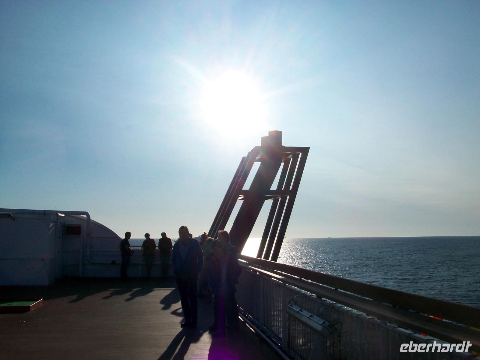 Dann geht alles recht schnell; wir können die Fähre betreten und bei strahlendem Sonnenschein genießen wir nach leckerem Mahl die Wärme auf dem Sonnendeck und eine angenehme Seereise in Richtung Heimat.