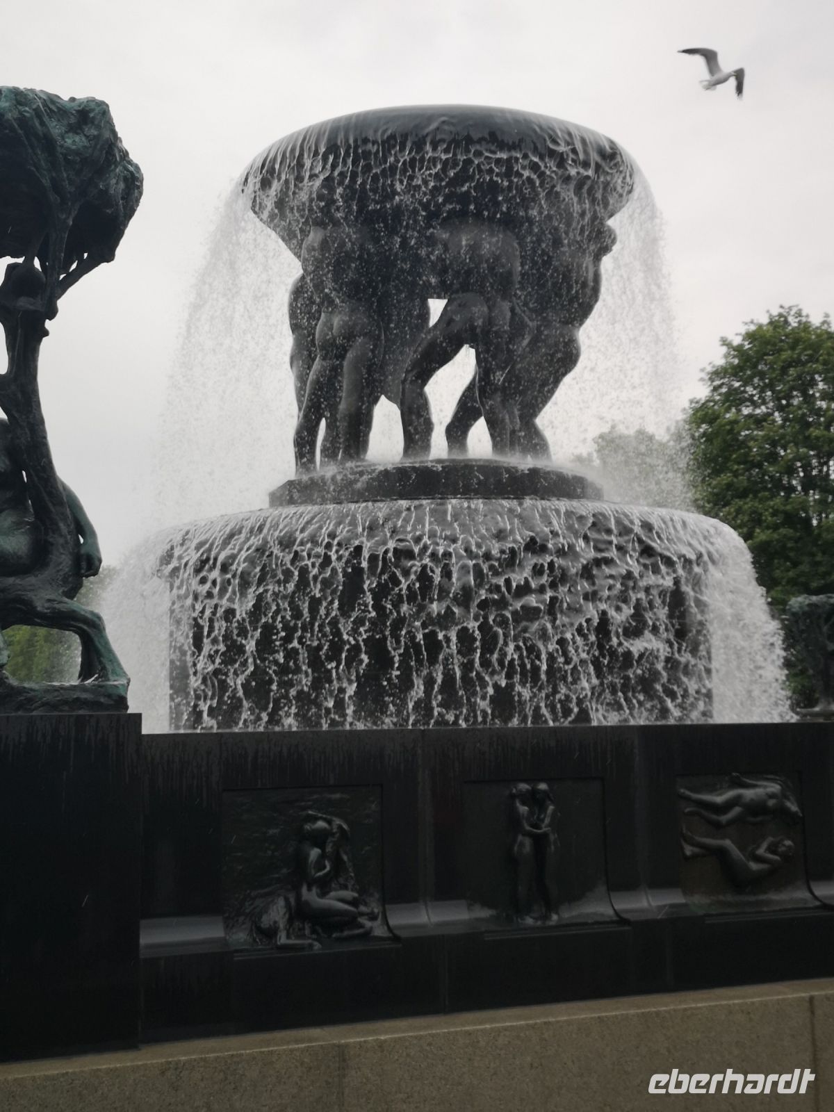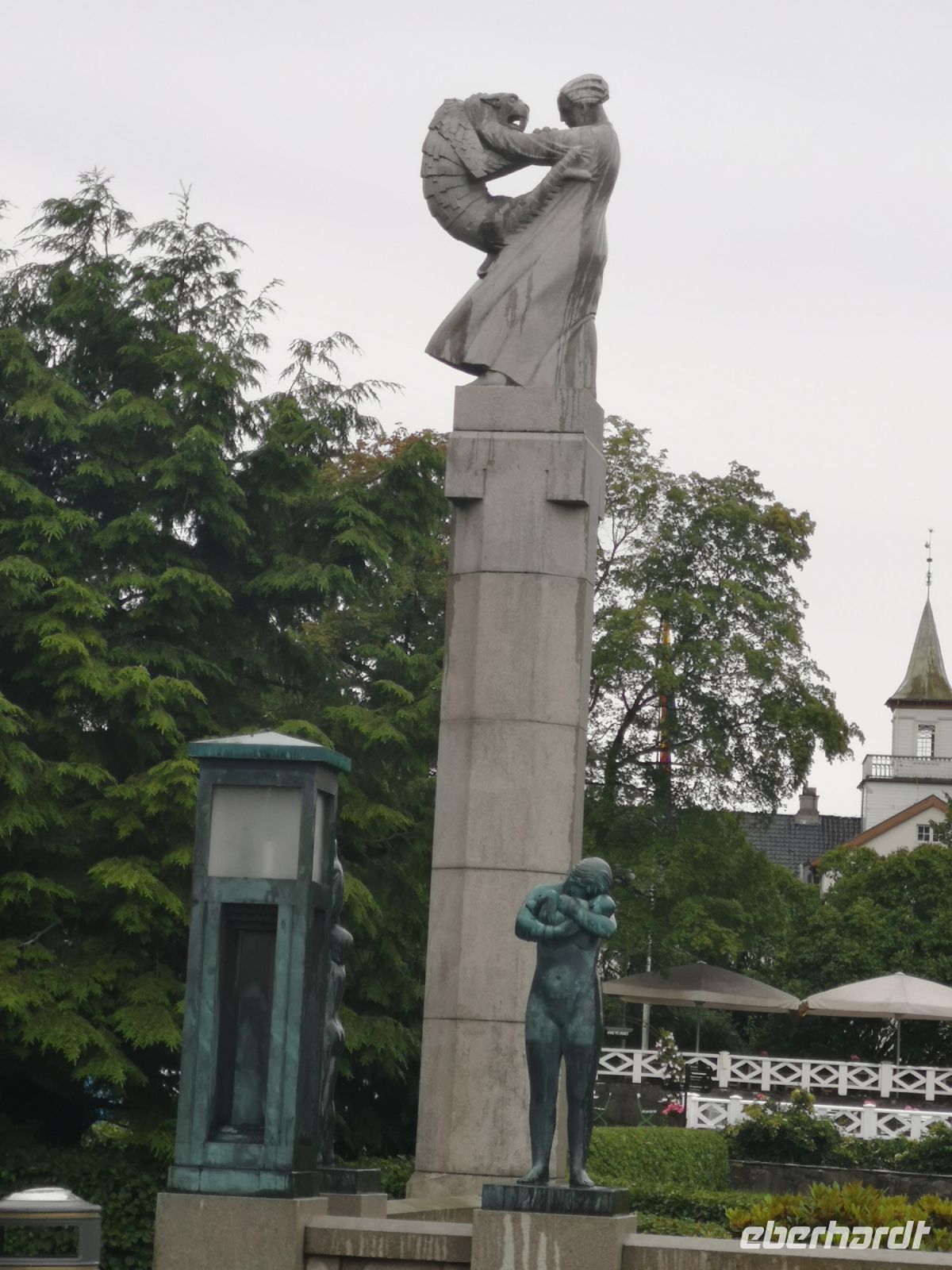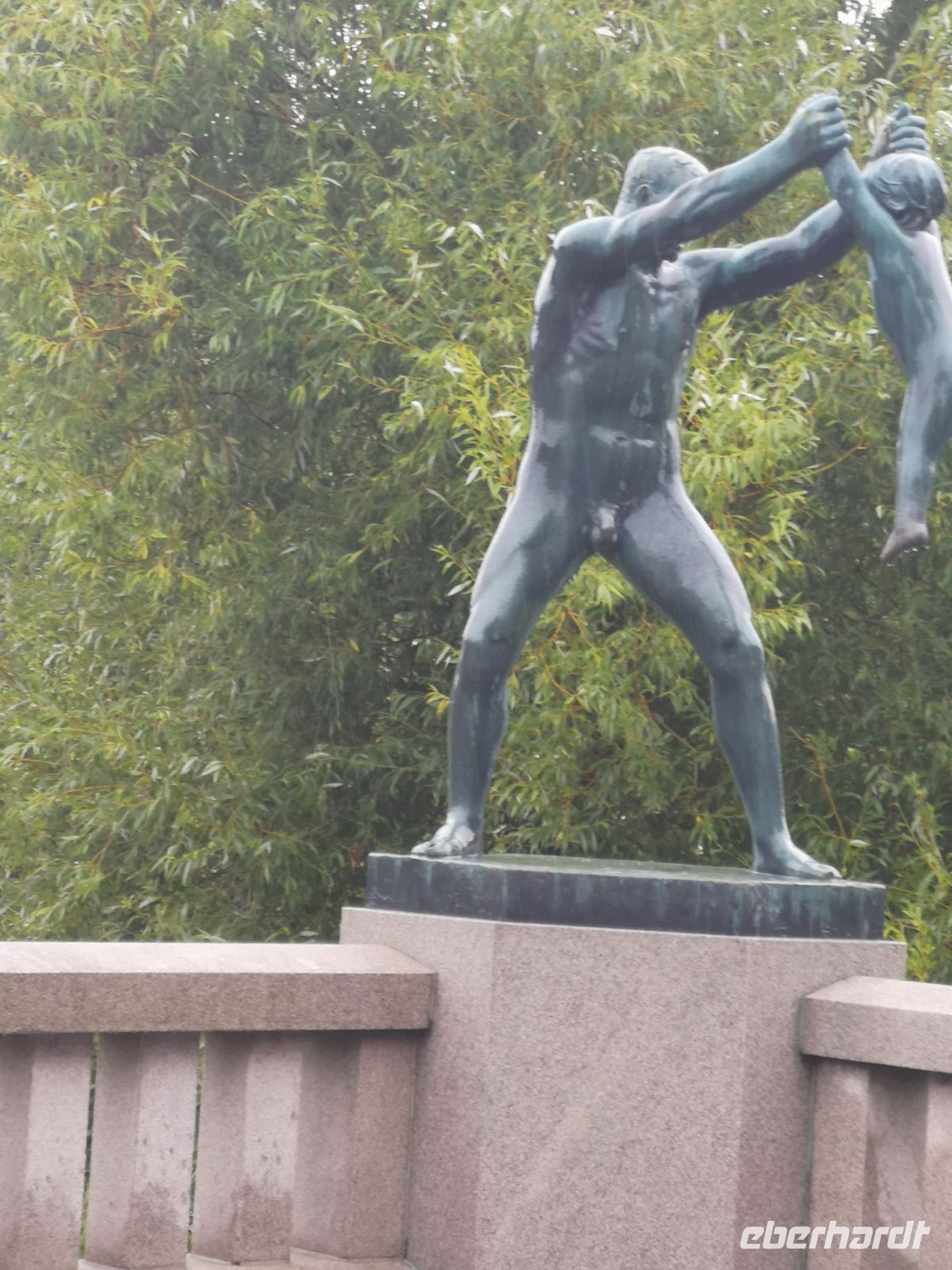 Als wir so durch das Schwedenland fuhren, wurde das Wetter anspruchsvoller: nebst dem Wind gesellte sich noch Regen dazu, als ob uns schon gleich am Anfang unserer Reise das Wetter prüfen wollte: seid ihr reif, reif, reif für Norwegen? Natürlich!! Auch als in Oslo ankommend und unsere Stadtrundfahrt im strömenden Regen begann, glaubten wir an unsere Portion Glück – und siehe: im Vigeland Park rissen die Regenwolken auf und wir konnten uns die frisch gewaschenen Skulpturen ausgiebig anschauen. Die Skulpturen der Menschen allen Alters, Lebensabschnittes, Wirkens…. Ein seltsames Lebenswerk des noch seltsameren Künstlers Vigeland, der scheinbar sein Leben durch seine Menschenfirguren, in Stein gemeißelt, geschaffen hat, aber das Gelebte abgelehnt hat.