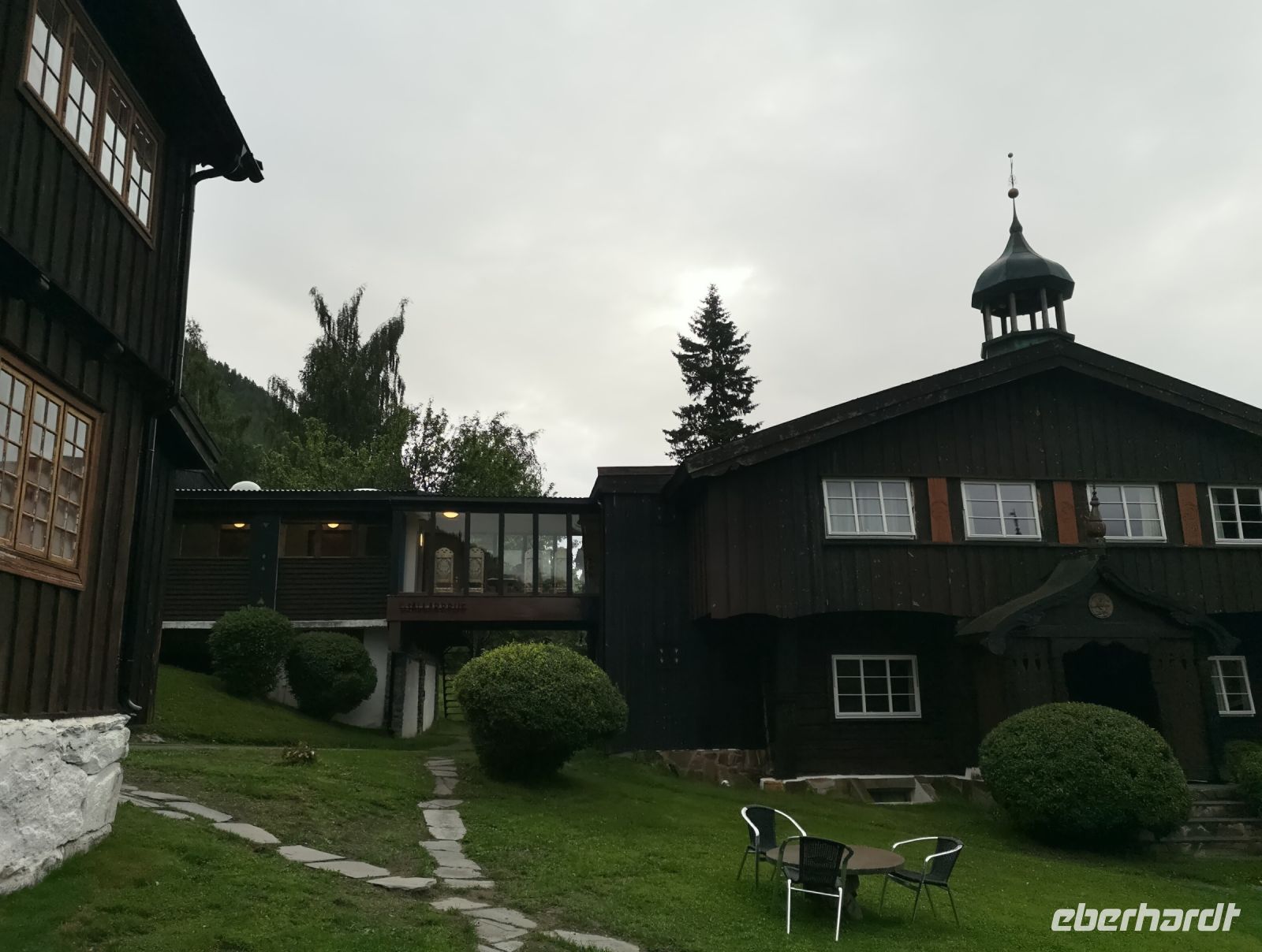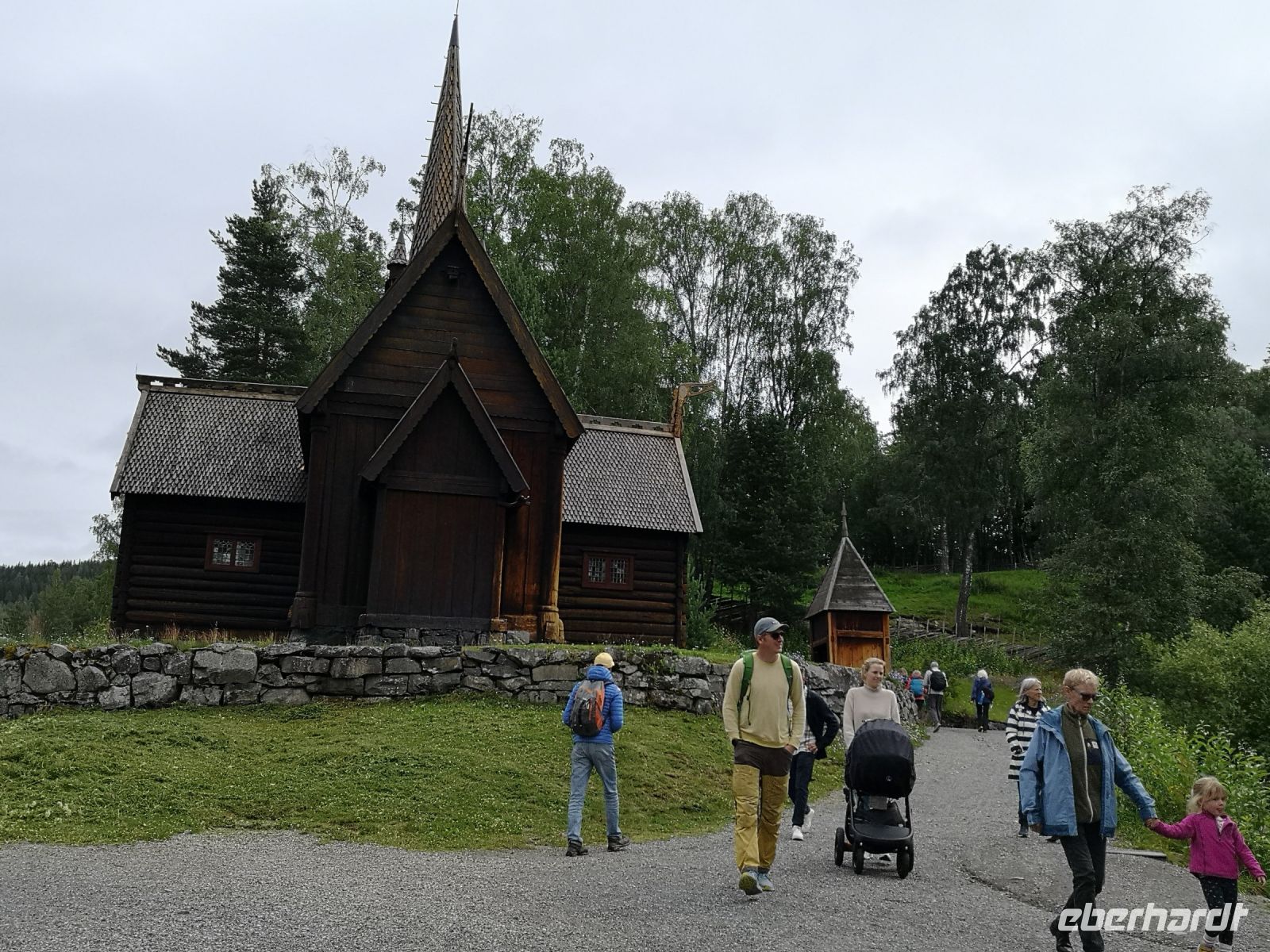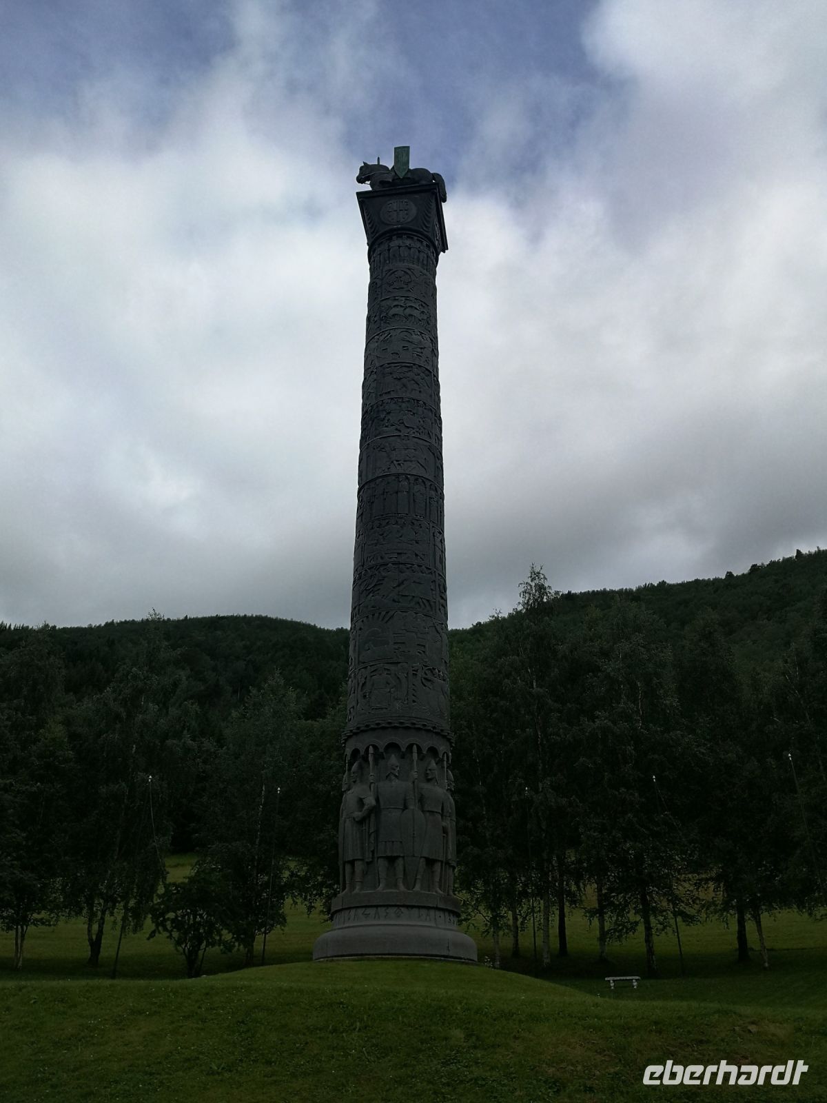 Dafür wurden wir mit der spannenden Fahrt der kurvenreicher Geiranger Straße hinauf auf 1000 m Höhe entlohnt. Nicht nur der weißblaue Himmel über den Tiefwassersee, sondern auch die sichere und entspannende Lenkkunst unseres Busfahrer Andreas sorgte für einen Höhepunkt des Tages, denke ich. Am liebsten hätte man noch länger verweilt, die wilde Natur mit so vielen Nuancen „atmen“, aber auf uns wartete noch eine schöne Fahrt über die Hochebene, wildes Wasser vom Donfoss vorbei bis Lom, wo wir uns mit der Geschichte der Stabkirche von Lom kennenlernten: vor inneren Augen sah man die Männer, die die Kirche bauten, mit bloßen Händen, im Sommer im Schweiß gebadet, im Winter durch Schneemassen geschoben, dann die Bauer, die Reisenden, die Soldaten, die in der Kirche Schutz gesucht hatten, bis hin zu denjenigen, die mit der Kirche gar nicht so gute Absichten hatten……bis zum heutigen Tag, wo wir unheimlich froh sind, dass solche Juwelen uns erhalten geblieben sind. Genauso wie auch unser Hotel an dem Tag: Elveseter. Eine Mischung aus Museum, Hotel, Herberge ……. Durchdrungen von Zeit und Geist. Wahrhaftig anders als alle anderen Hotels auf unserer Reise. Und mit einem Hauch von Abenteuer. Besiegelt mit der Siegessäule – die eingemeißelte Geschichte Norwegens.