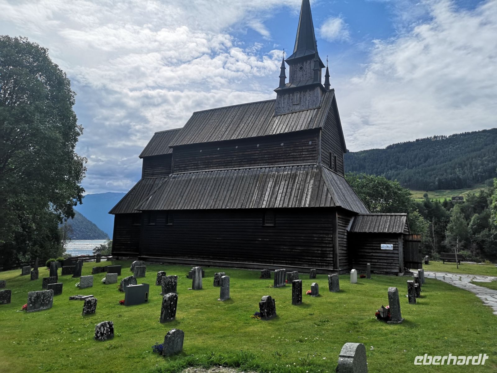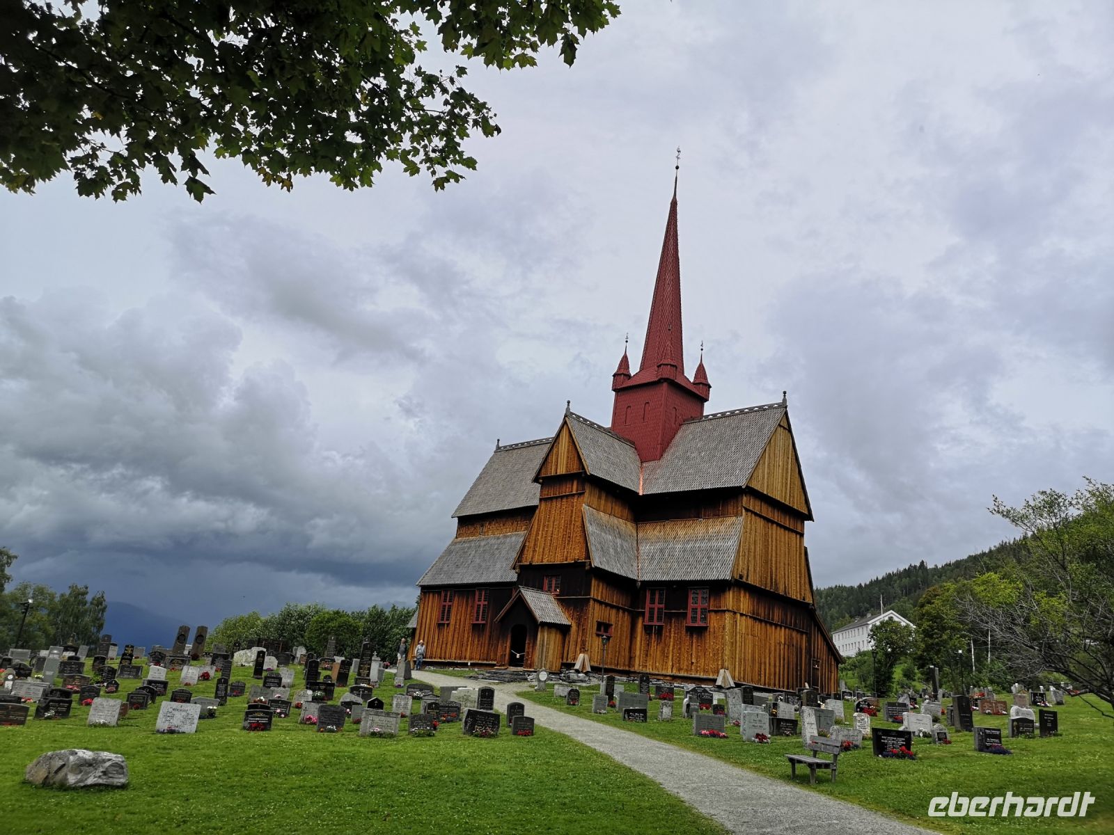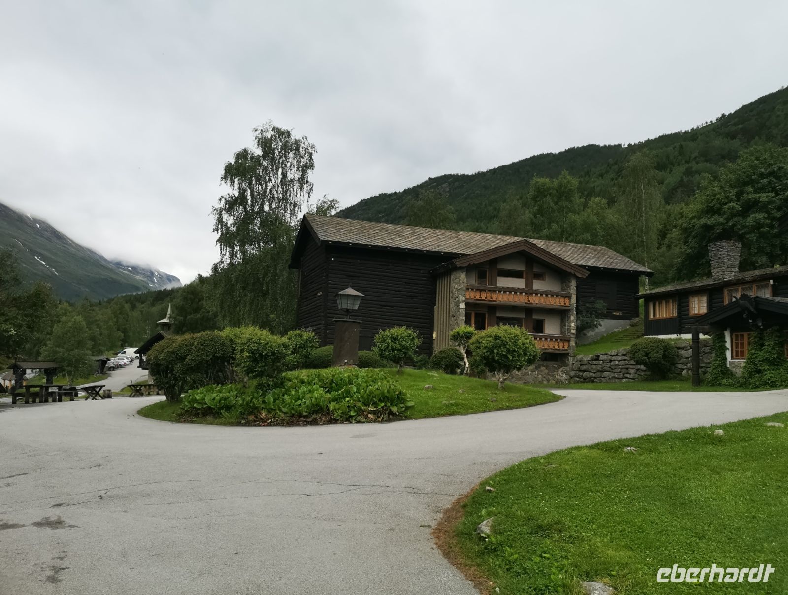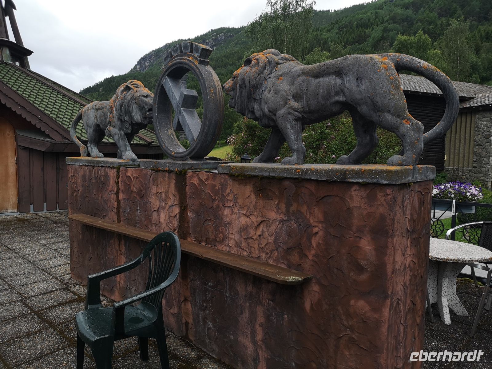 Dafür wurden wir mit der spannenden Fahrt der kurvenreicher Geiranger Straße hinauf auf 1000 m Höhe entlohnt. Nicht nur der weißblaue Himmel über den Tiefwassersee, sondern auch die sichere und entspannende Lenkkunst unseres Busfahrer Andreas sorgte für einen Höhepunkt des Tages, denke ich. Am liebsten hätte man noch länger verweilt, die wilde Natur mit so vielen Nuancen „atmen“, aber auf uns wartete noch eine schöne Fahrt über die Hochebene, wildes Wasser vom Donfoss vorbei bis Lom, wo wir uns mit der Geschichte der Stabkirche von Lom kennenlernten: vor inneren Augen sah man die Männer, die die Kirche bauten, mit bloßen Händen, im Sommer im Schweiß gebadet, im Winter durch Schneemassen geschoben, dann die Bauer, die Reisenden, die Soldaten, die in der Kirche Schutz gesucht hatten, bis hin zu denjenigen, die mit der Kirche gar nicht so gute Absichten hatten……bis zum heutigen Tag, wo wir unheimlich froh sind, dass solche Juwelen uns erhalten geblieben sind. Genauso wie auch unser Hotel an dem Tag: Elveseter. Eine Mischung aus Museum, Hotel, Herberge ……. Durchdrungen von Zeit und Geist. Wahrhaftig anders als alle anderen Hotels auf unserer Reise. Und mit einem Hauch von Abenteuer. Besiegelt mit der Siegessäule – die eingemeißelte Geschichte Norwegens.
