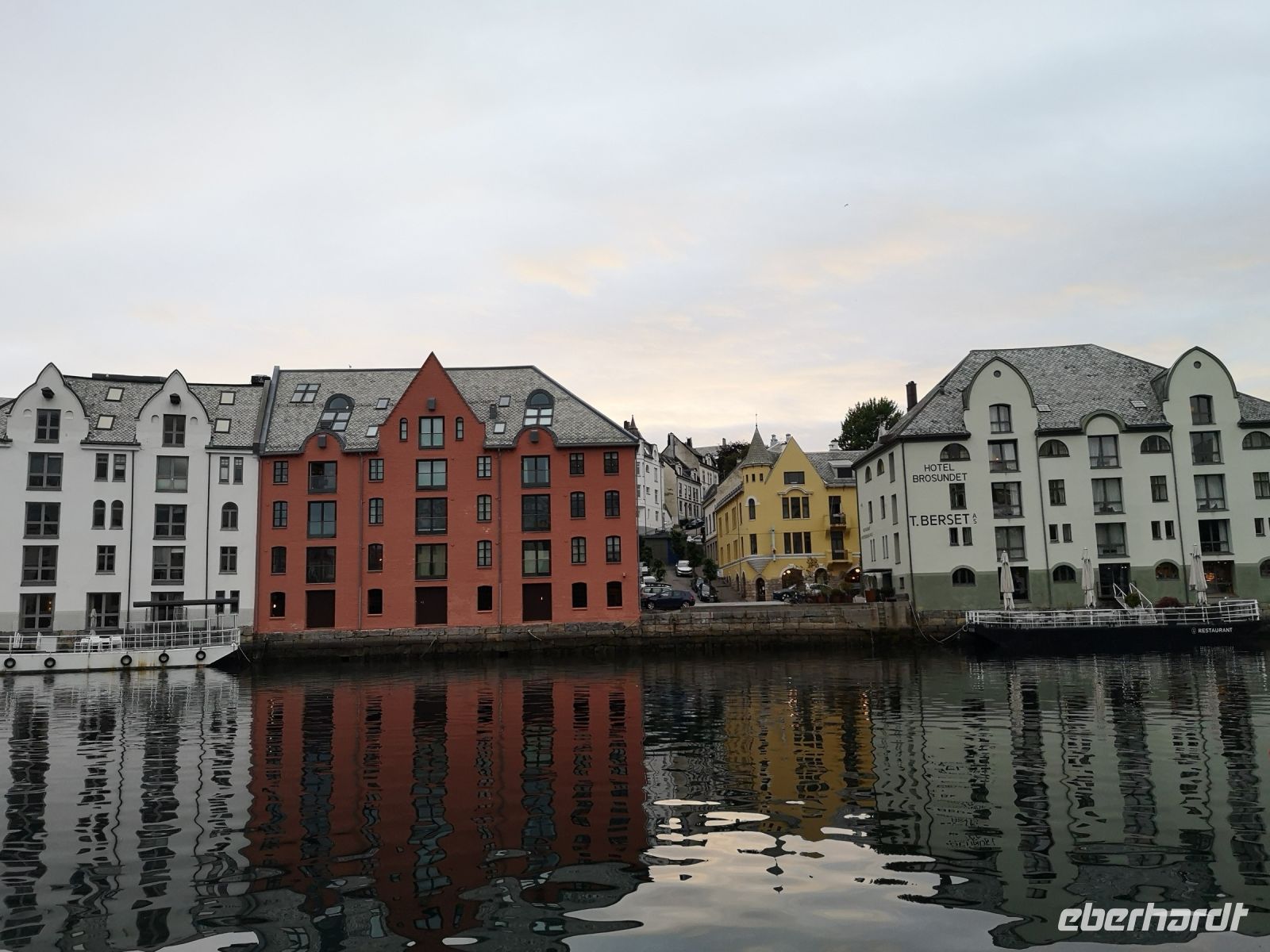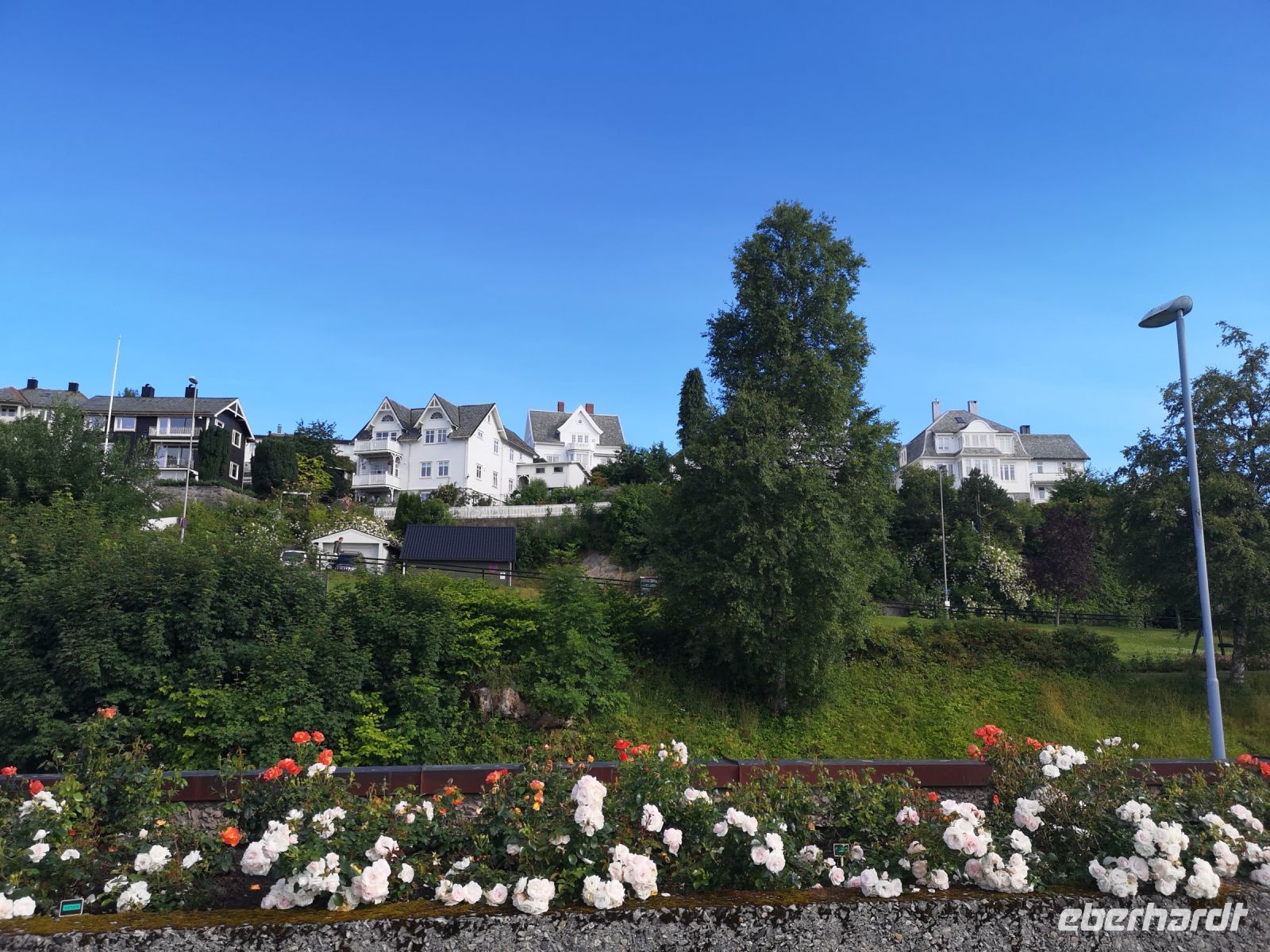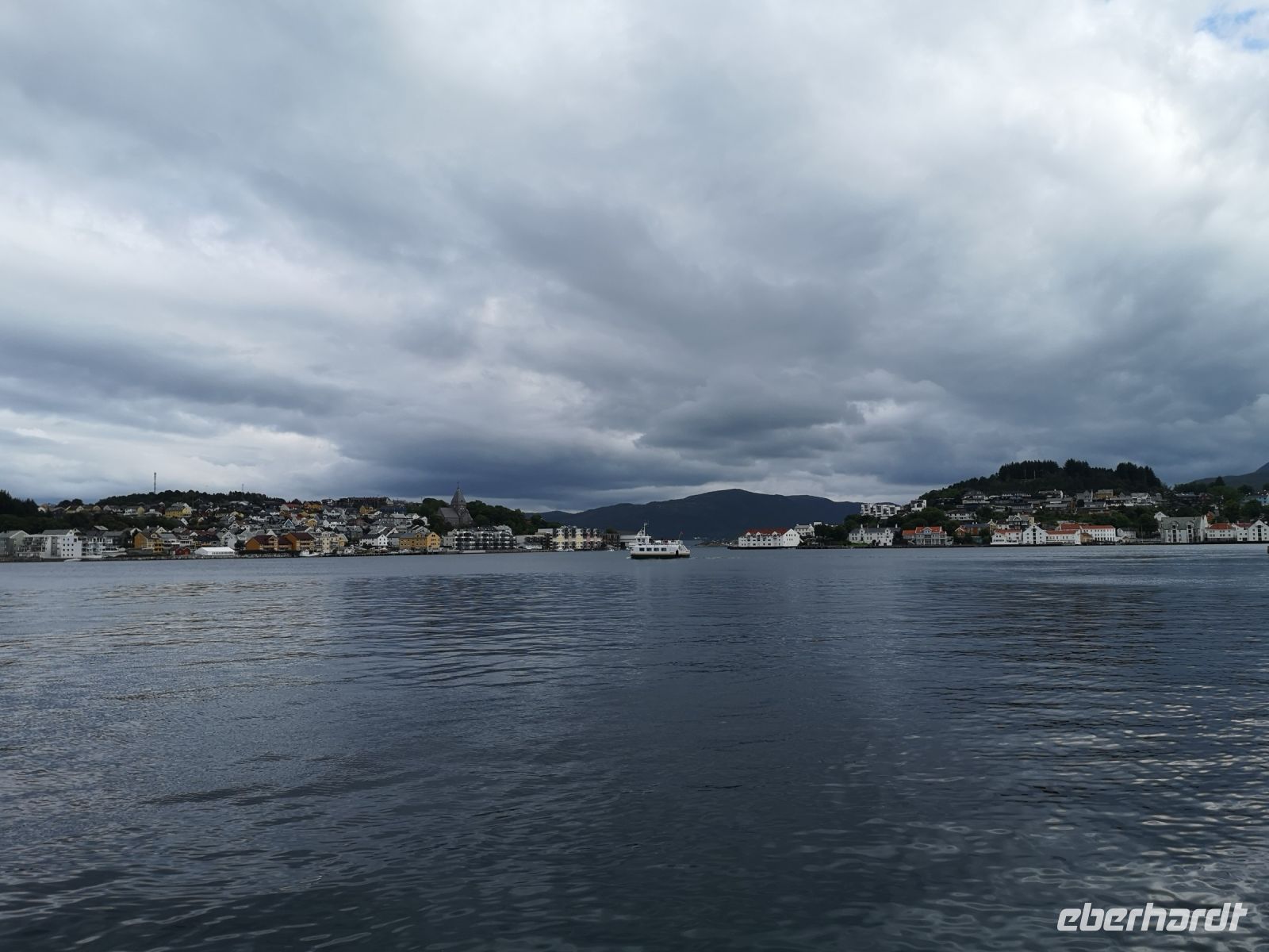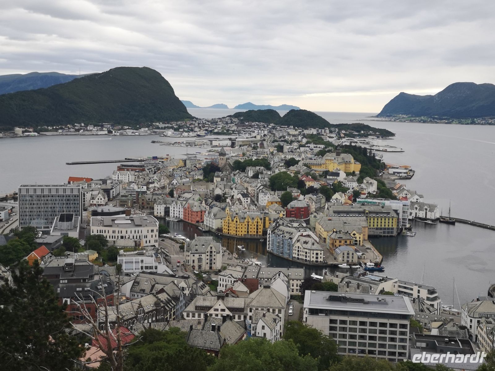 Molde stand an diesem Morgen da wie ein Mädchen, gehüllt in Rosen, Rosenduft und Sonnenschein. Zwar nicht für lange Zeit aber lange genug um einen wunderschönen Blick vom Varden auf die Stadt und den umliegenden Bergkranz genießen zu konnten. Dafür hüllte sich einige Stunden später der Trollstigen in die Regenwolken und herabkommende Nässe. Nix da, wir sind schon regengeprüft und die gute Stimmung im Bus konnte dadurch nicht gestört sein. Paar Hupfer über Gudbrandsjuvet (na ja, man nutzte doch die Brücken…:-)), ein Stopp in Valldal – schließlich ist Erdbeerzeit und man muss doch testen, was so hochgepriesen ist – und mit einer Fjordüberquerung kamen wir nach Alesund, genau gesagt fuhren wir direkt auf Aksla. Berühmtes Postkartenmotiv bot sich uns allemal. Und wenn man abends zu Fuß durch die Stadt mit einer so reichen Geschichte wie Alesund schlendert, findet man viele erstaunliche Dinge und es geht kein Weg vorbei, um sich in diese Stadt zu verlieben. Und wenn der liebe Leser von diesem Bericht, die/der Alesund noch nicht kennt, jetzt fragt: „Ja, was kann man denn da sehen?“ dann sage ich: „Komm und entdecke es selbst, du wirst es nicht bereuen.“