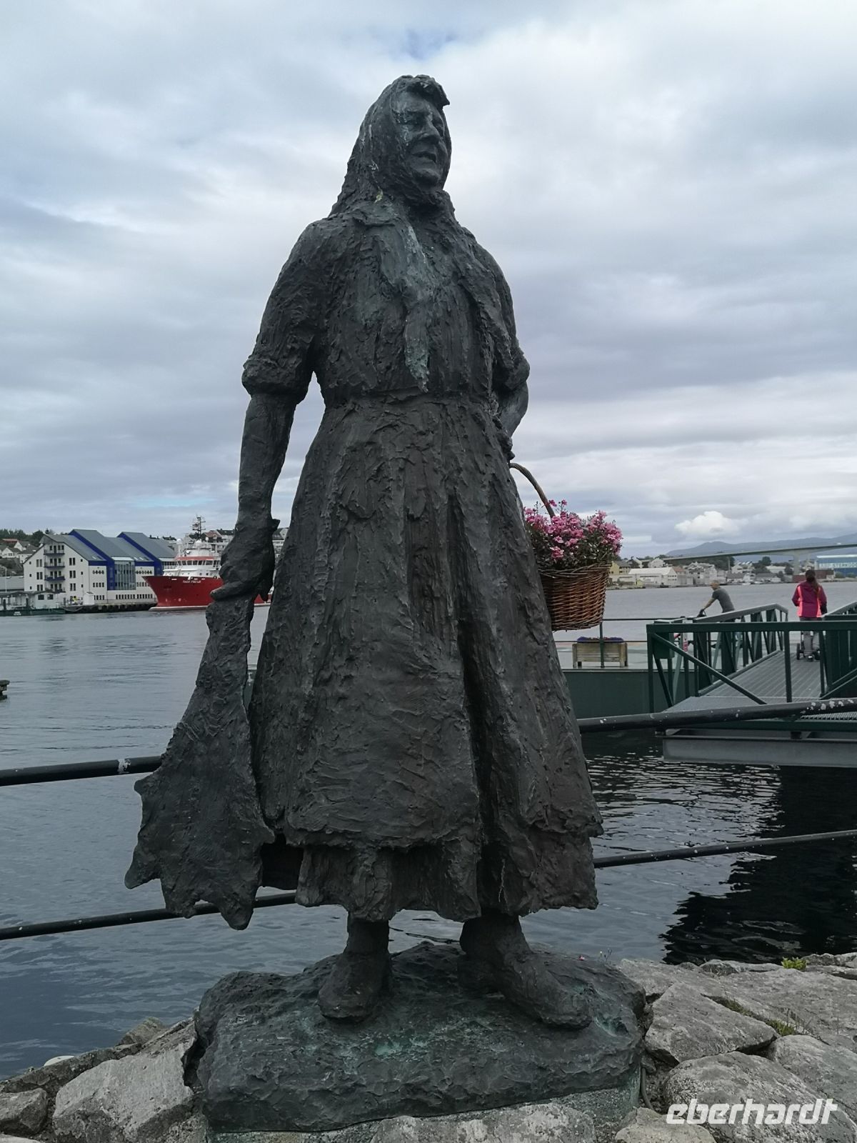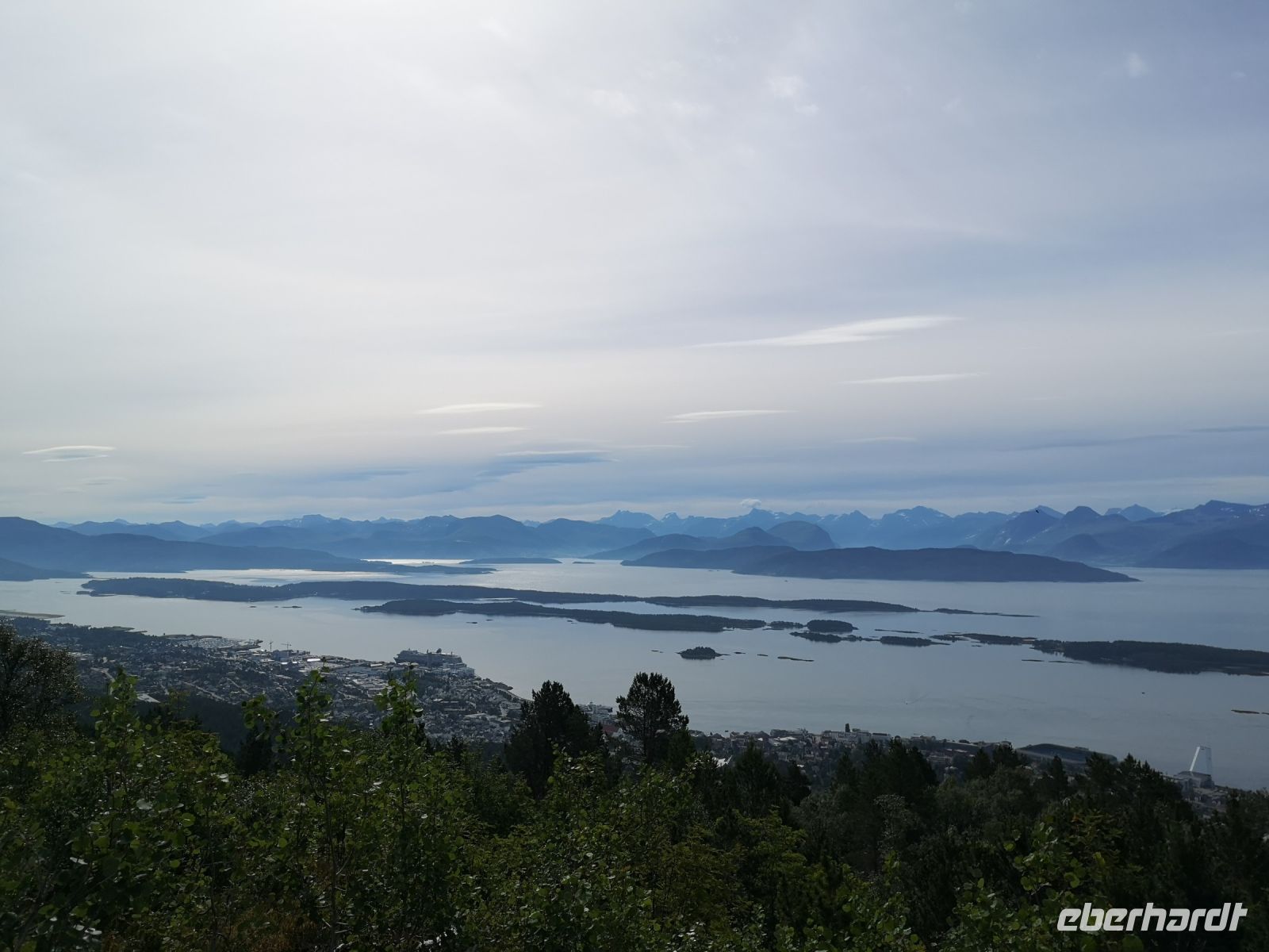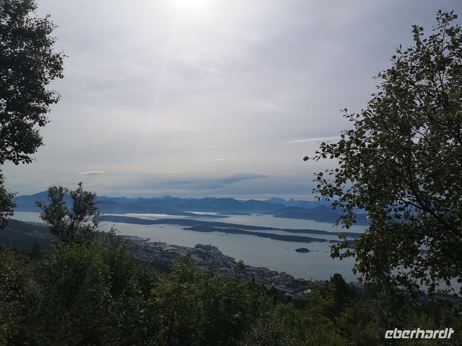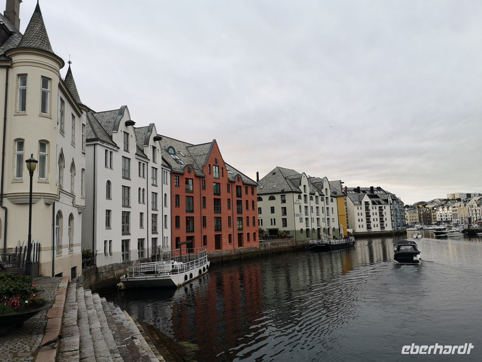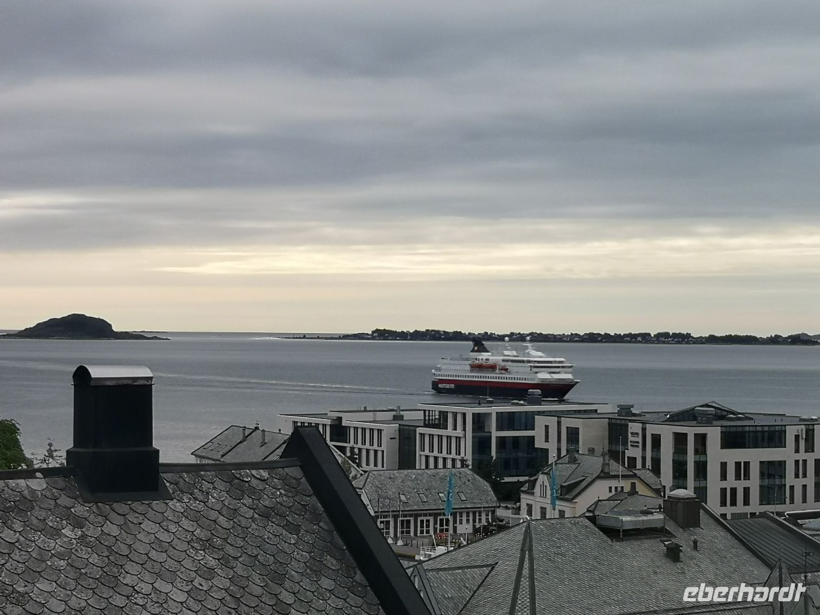 Molde stand an diesem Morgen da wie ein Mädchen, gehüllt in Rosen, Rosenduft und Sonnenschein. Zwar nicht für lange Zeit aber lange genug um einen wunderschönen Blick vom Varden auf die Stadt und den umliegenden Bergkranz genießen zu konnten. Dafür hüllte sich einige Stunden später der Trollstigen in die Regenwolken und herabkommende Nässe. Nix da, wir sind schon regengeprüft und die gute Stimmung im Bus konnte dadurch nicht gestört sein. Paar Hupfer über Gudbrandsjuvet (na ja, man nutzte doch die Brücken…:-)), ein Stopp in Valldal – schließlich ist Erdbeerzeit und man muss doch testen, was so hochgepriesen ist – und mit einer Fjordüberquerung kamen wir nach Alesund, genau gesagt fuhren wir direkt auf Aksla. Berühmtes Postkartenmotiv bot sich uns allemal. Und wenn man abends zu Fuß durch die Stadt mit einer so reichen Geschichte wie Alesund schlendert, findet man viele erstaunliche Dinge und es geht kein Weg vorbei, um sich in diese Stadt zu verlieben. Und wenn der liebe Leser von diesem Bericht, die/der Alesund noch nicht kennt, jetzt fragt: „Ja, was kann man denn da sehen?“ dann sage ich: „Komm und entdecke es selbst, du wirst es nicht bereuen.“
